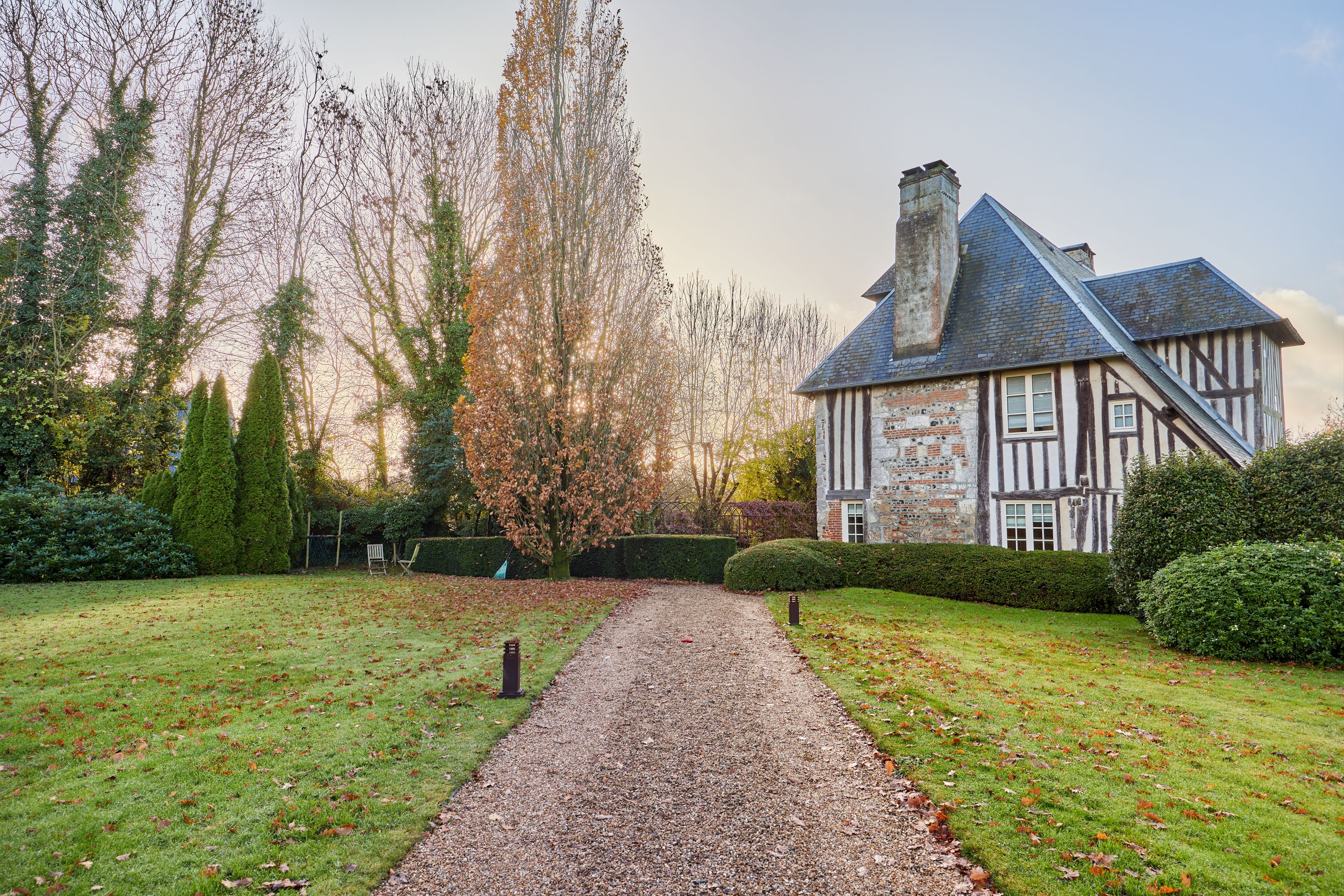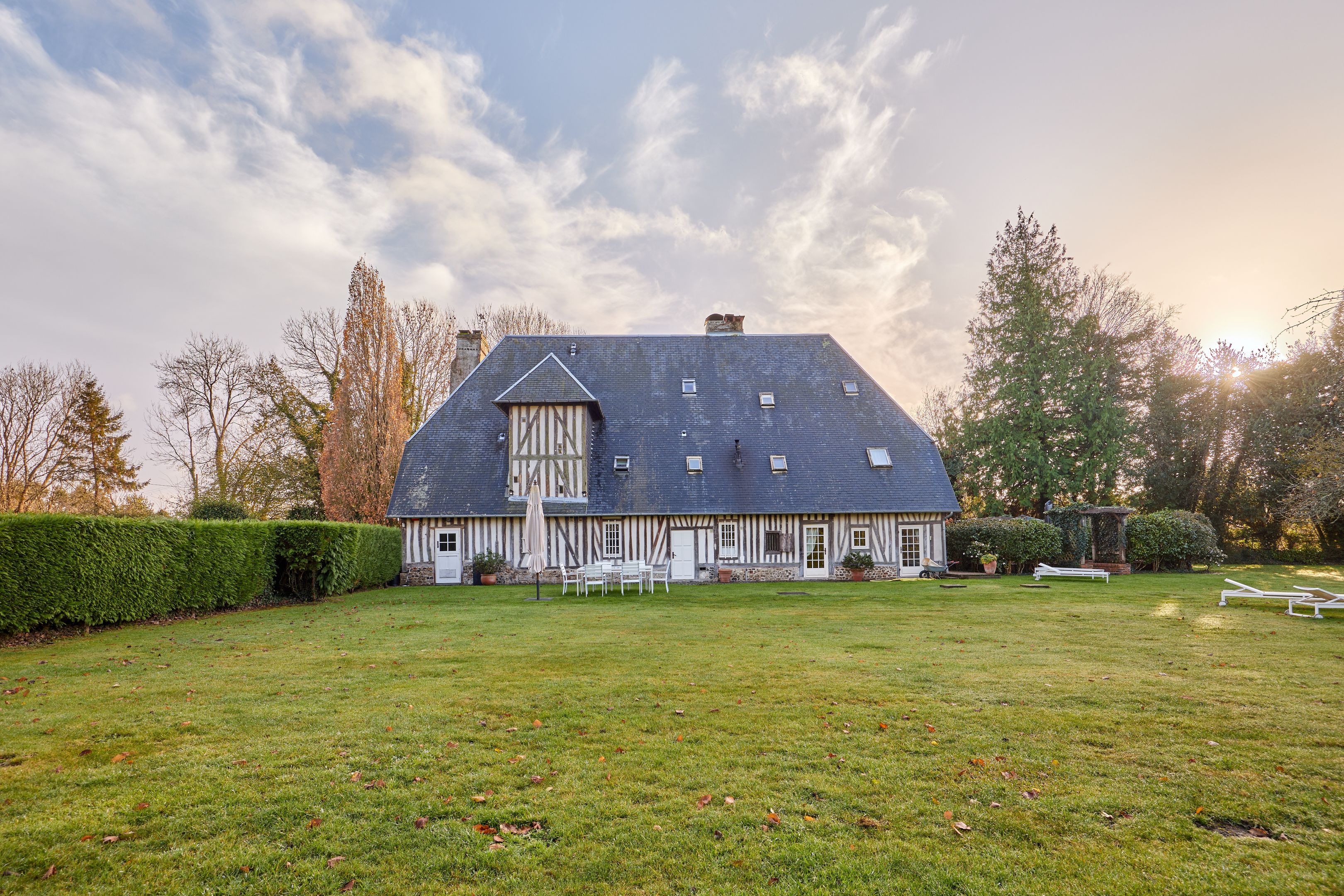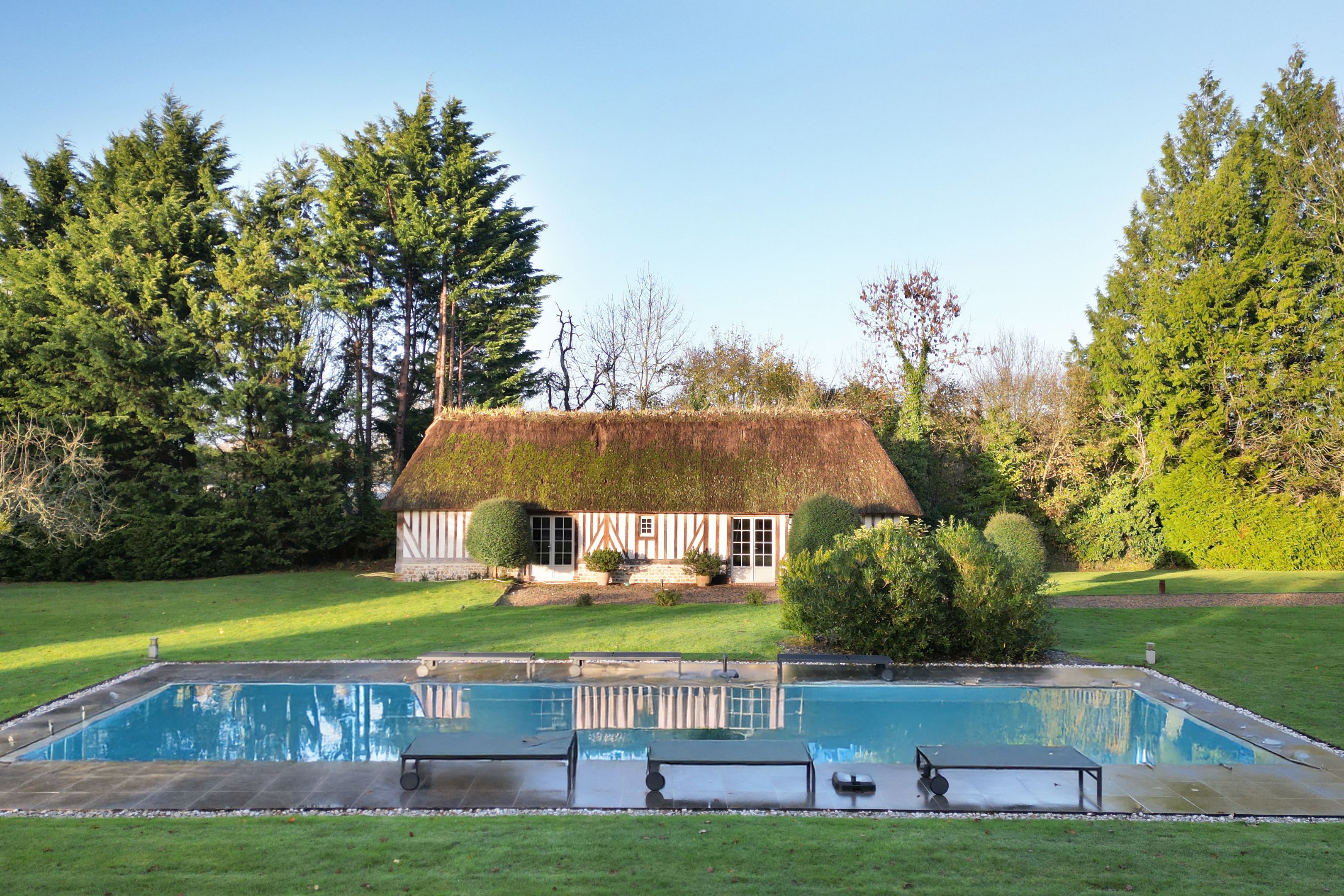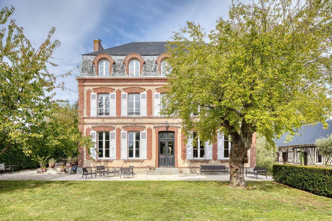 10 min from Honfleur, beautiful family property built in the 15th century on over 1.7 ha of fully enclosed grounds. Main manor house 320 m² on 3 levels in very good condition, comprising entrance hall, independent fitted kitchen with fireplace, scullery, two lounges each with period fireplace, dining area, laundry room, 5 bedrooms spread over the floors, each with bathroom and toilet, study, dressing room and linen room. Outbuildings: 51 m² guest house with two bedrooms, bathroom and toilet; double garage with first floor converted into office; former wine press of approx. 200 m² on 2 levels, suitable for conversion. On the wooded grounds: magnificent 15 x 4 m swimming pool in the center of the estate, pétanque court and 7,000 m² of pasture.