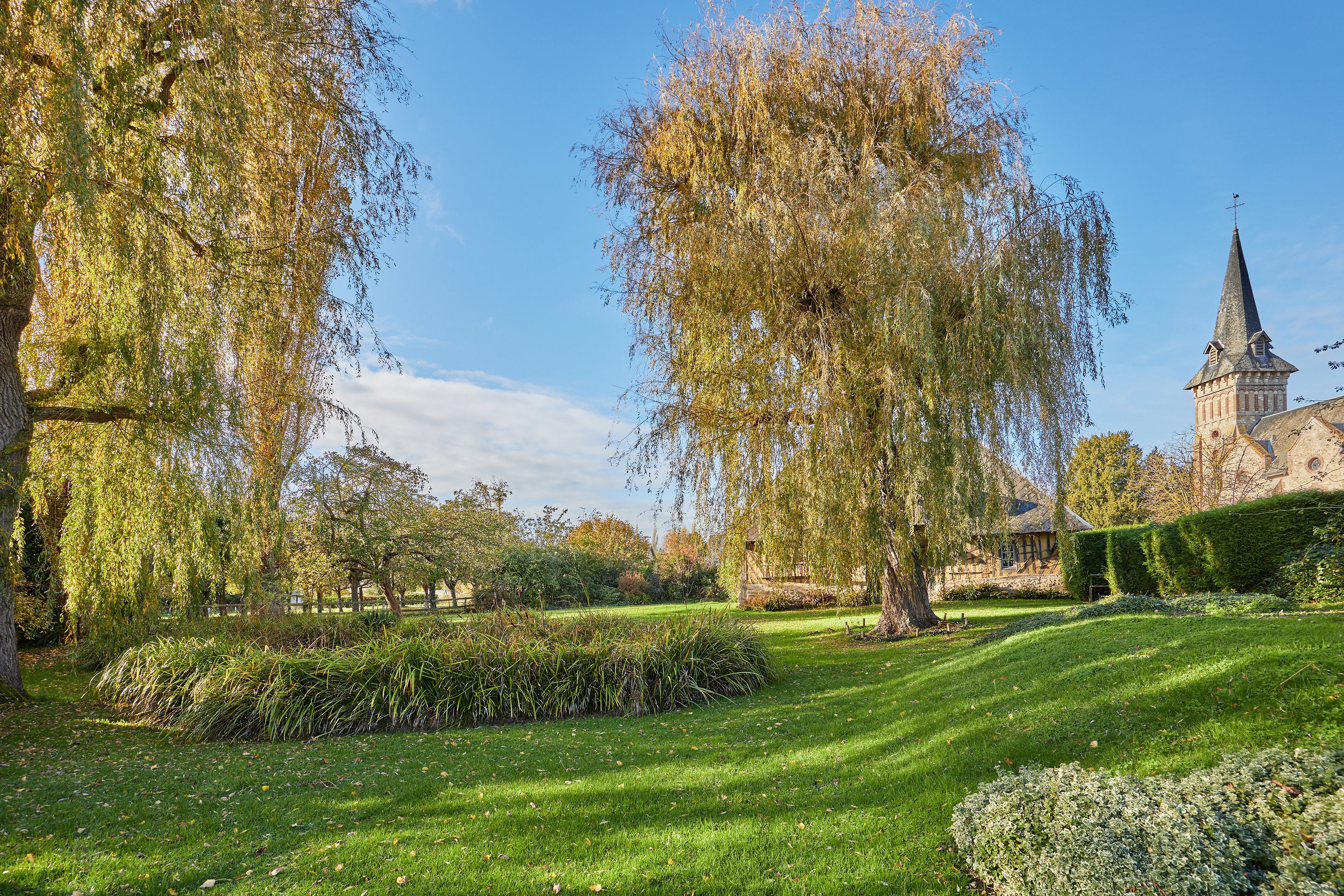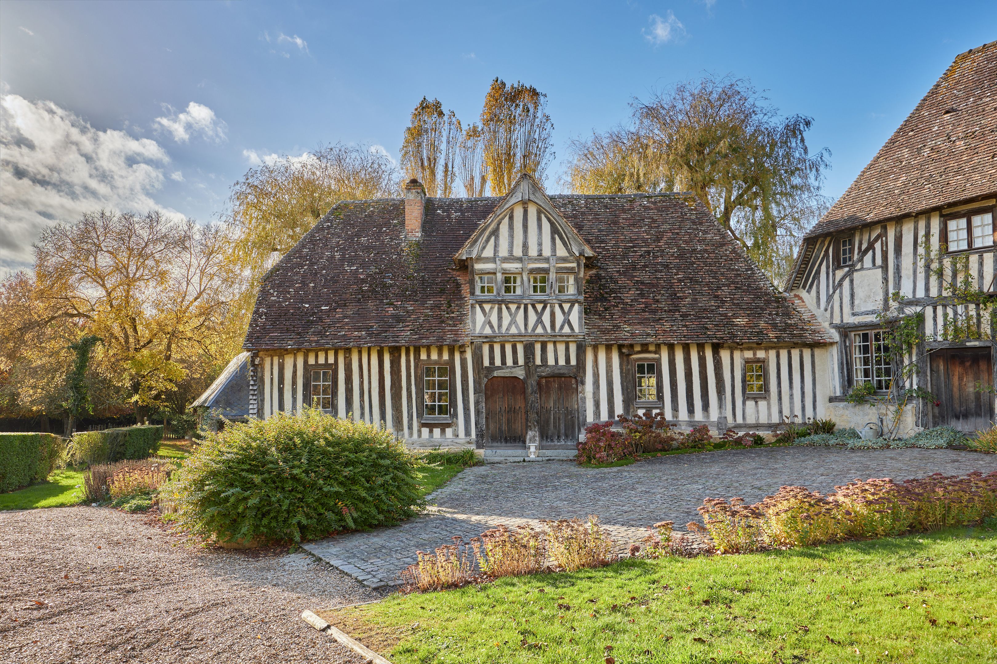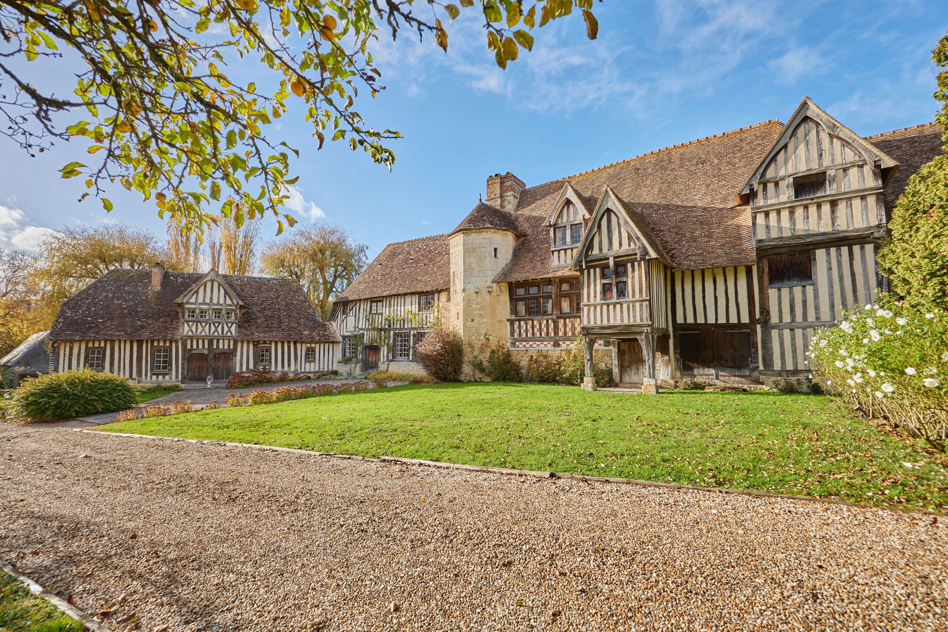 Less than 10 min from Deauville, listed historic monument, beautiful 15th-century property set in wooded grounds. Main manor house of approx. 200 m² on 3 levels with 7 bedrooms, complemented by a former farm building housing a 17th-century cider press. Outbuildings include a small 2-storey manor house with 4 bedrooms, orangery and two sheepfolds. The Manoir des Évêques is one of the oldest manor houses in the Pays d'Auge, with its emblematic Auge architecture of stone foundations and half-timbering.