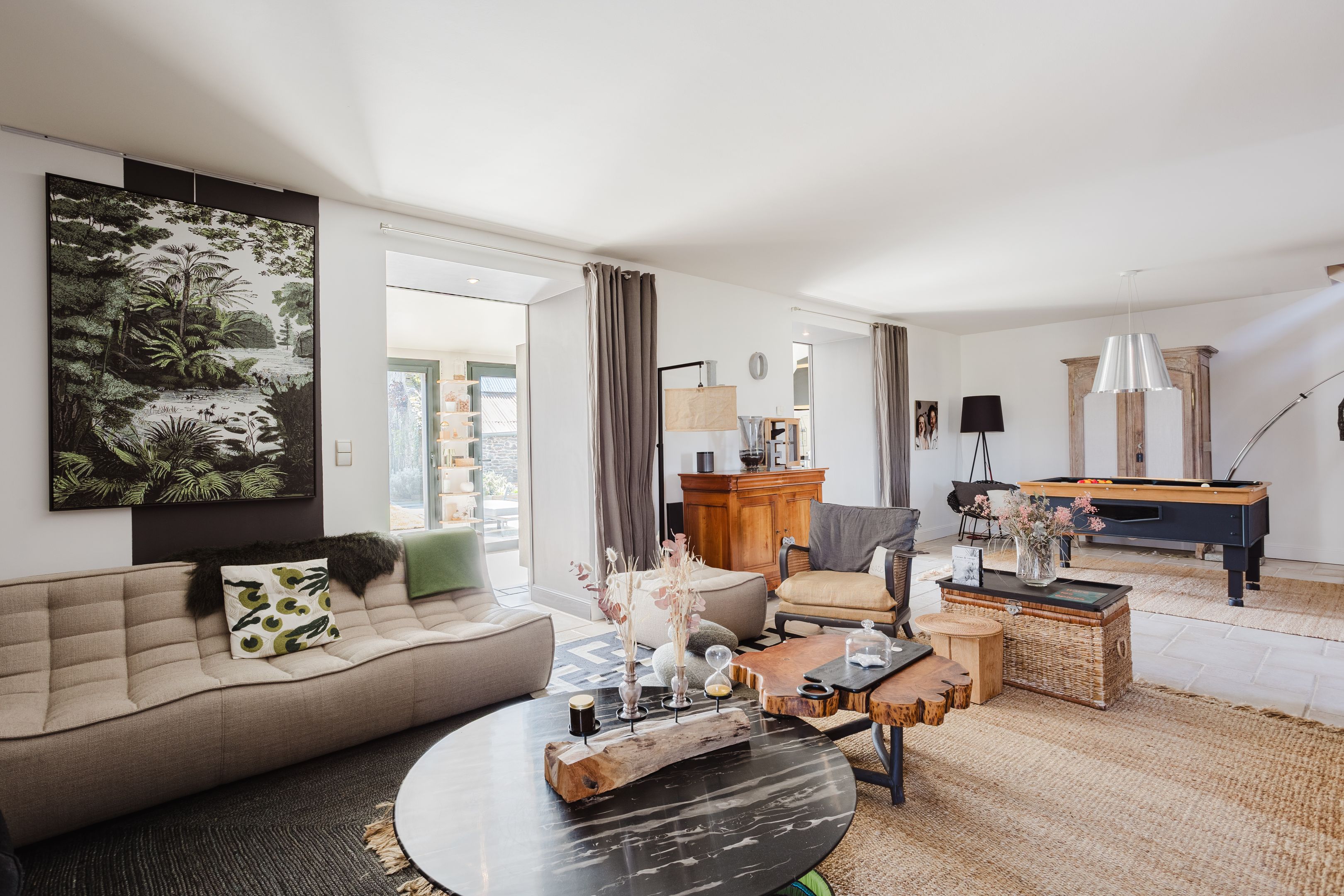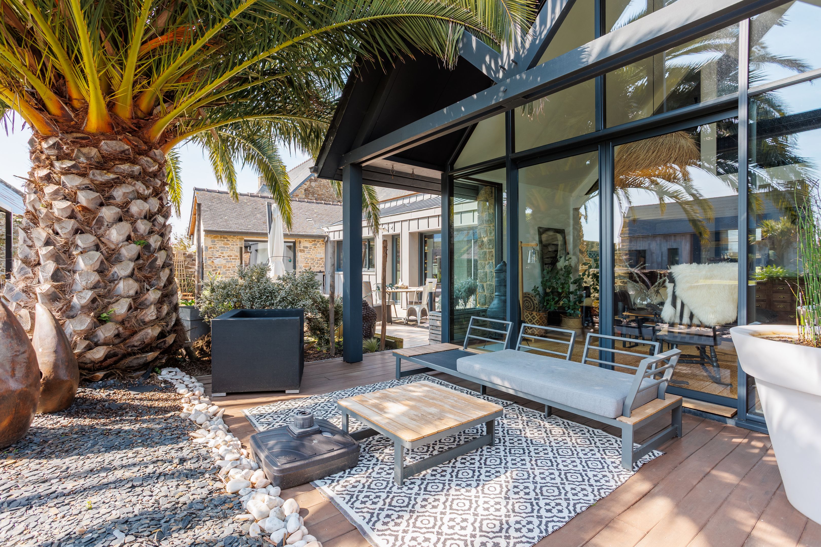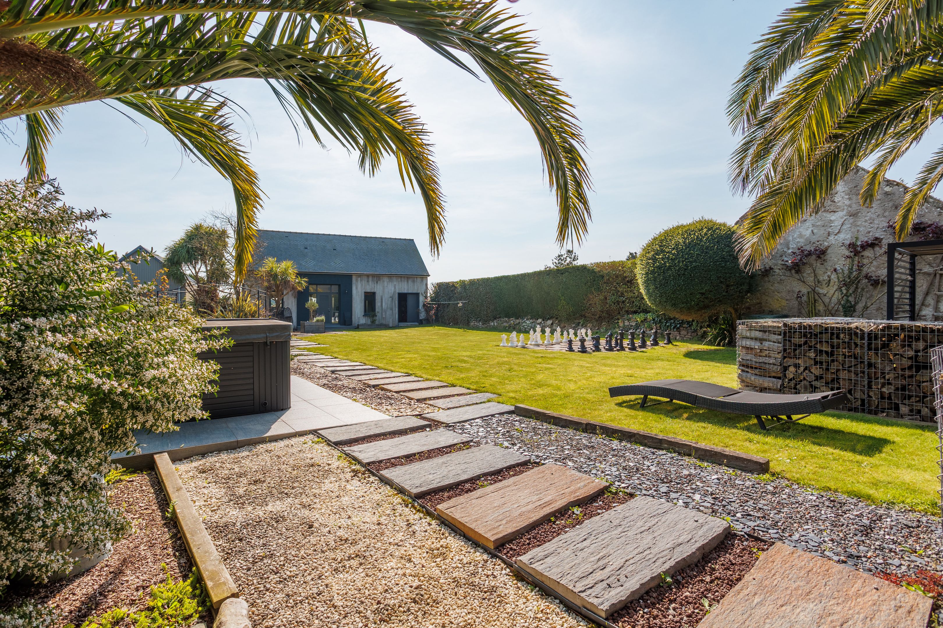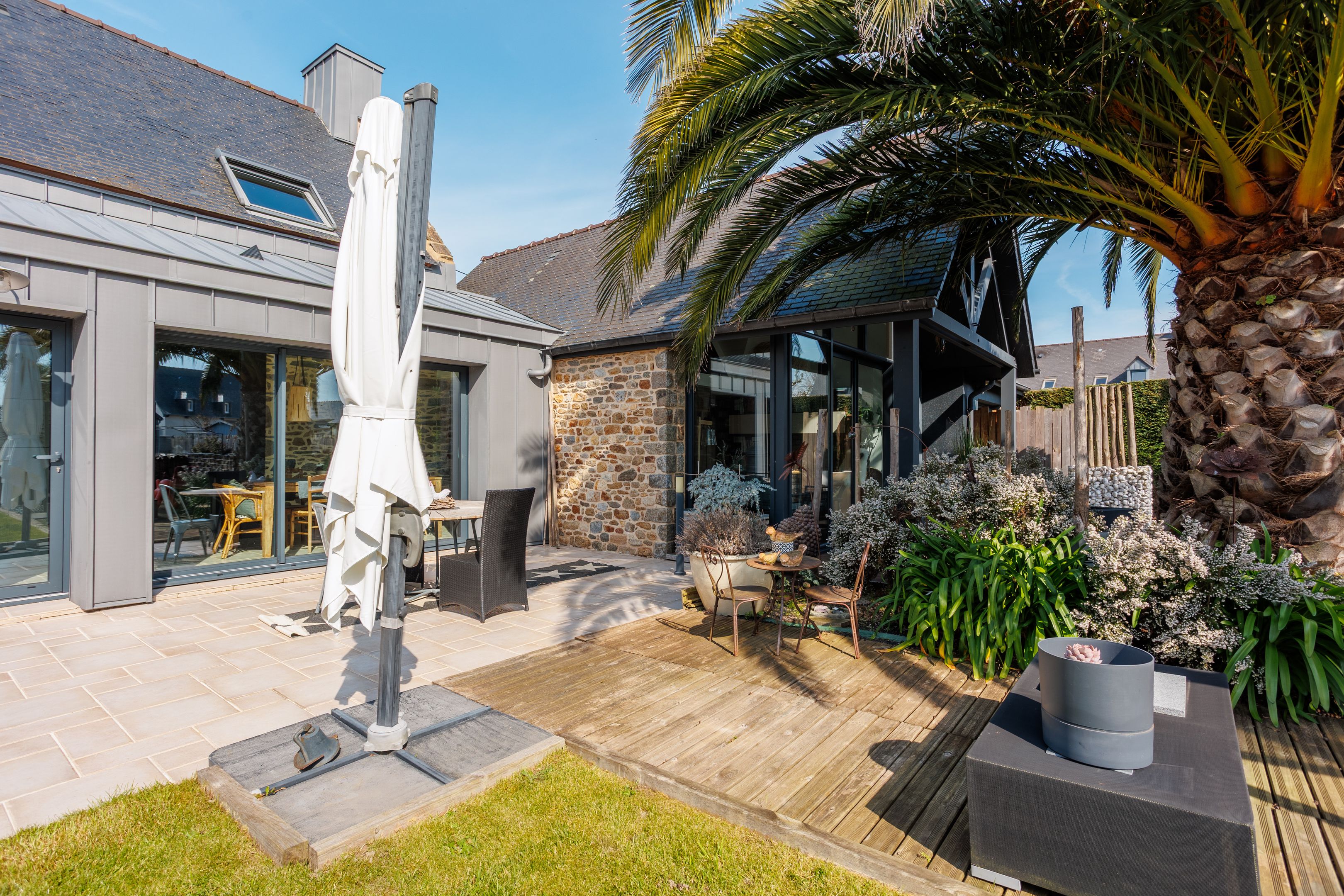 In a quiet, leafy setting, close to the beaches of Cancale. Beautiful, fully renovated 213m² property benefiting from an excellent floor plan, top-quality renovation and a charming south-facing garden. Spacious, warm living room with lounge, fitted and equipped kitchen opening onto dining room, second lounge with mezzanine. Bedroom with shower room. Upstairs: master suite with bathroom, two bedrooms and shower room. The second 74m² detached house comprises a living room with kitchen and two suites with bathrooms (possible rental project). Small adjoining workshop. Pleasant enclosed garden with trees, terrace and jacuzzi. Garage.