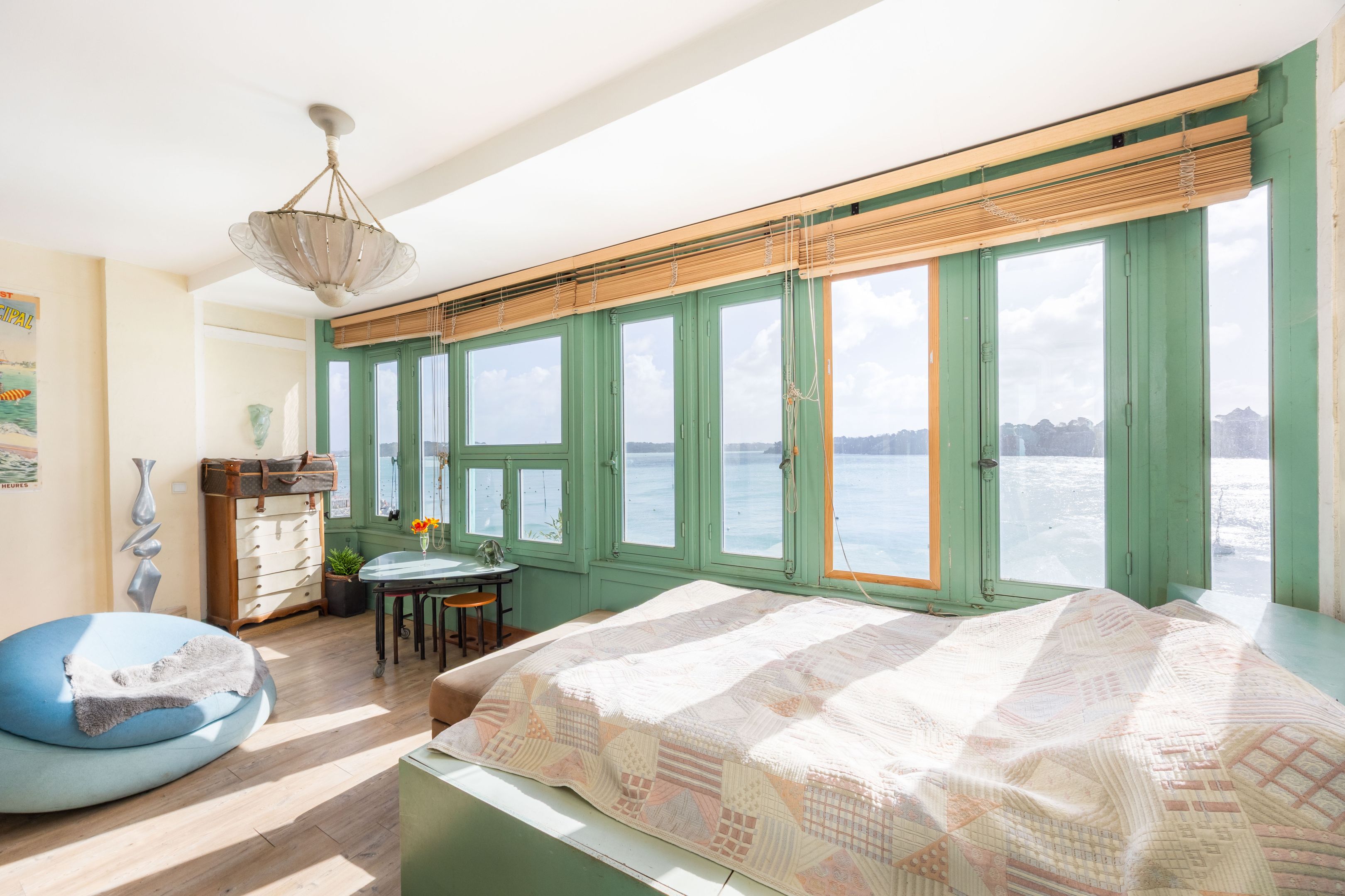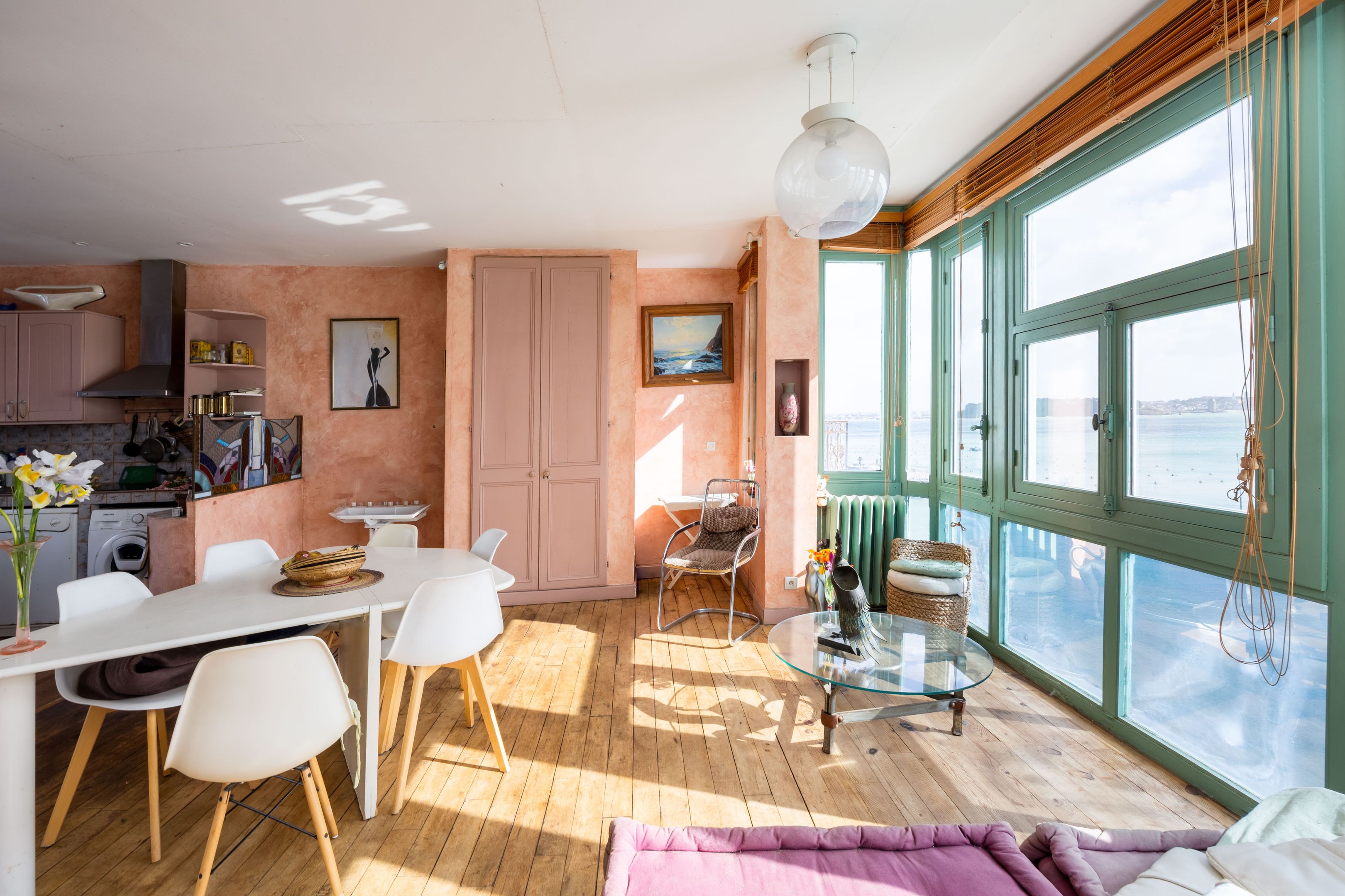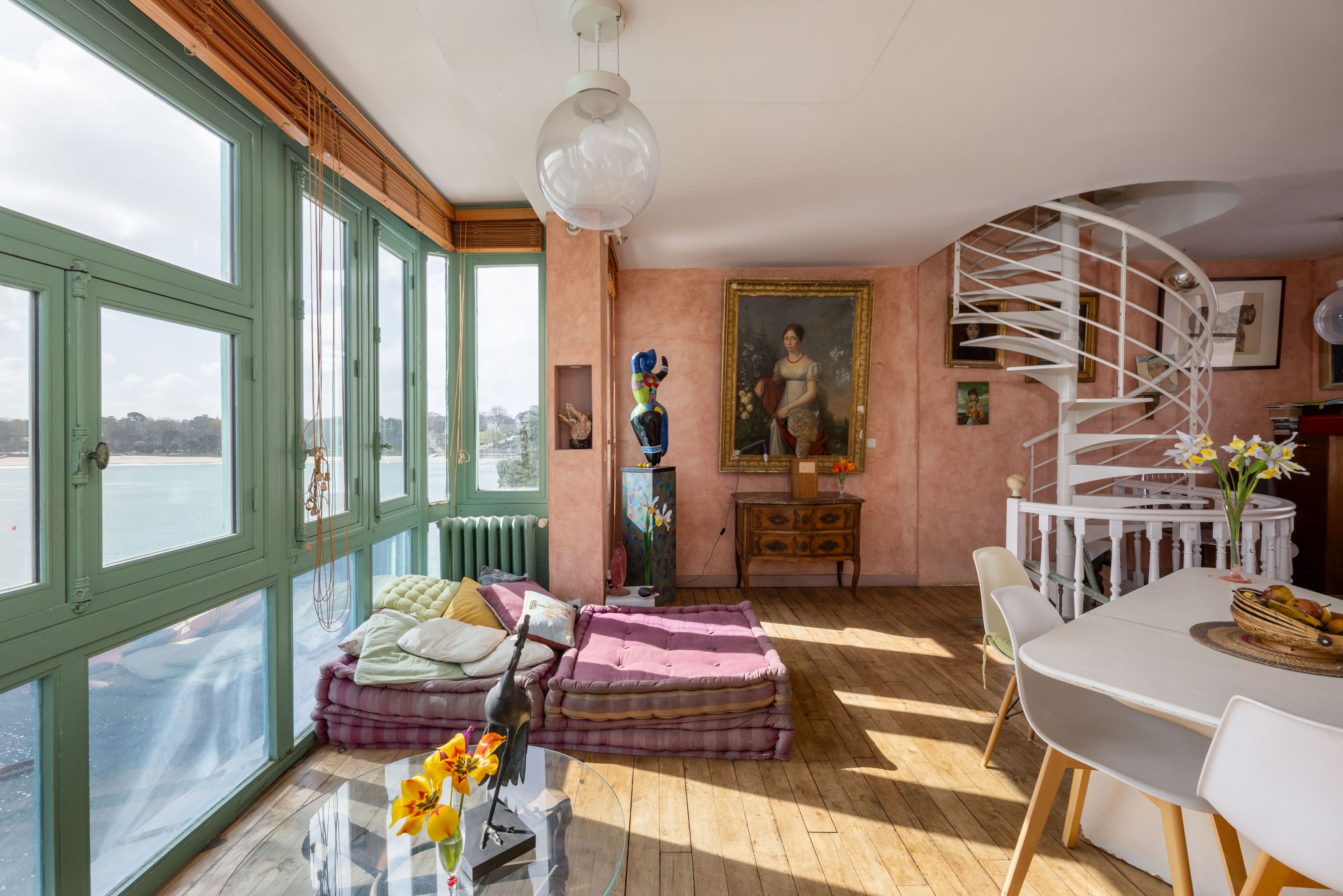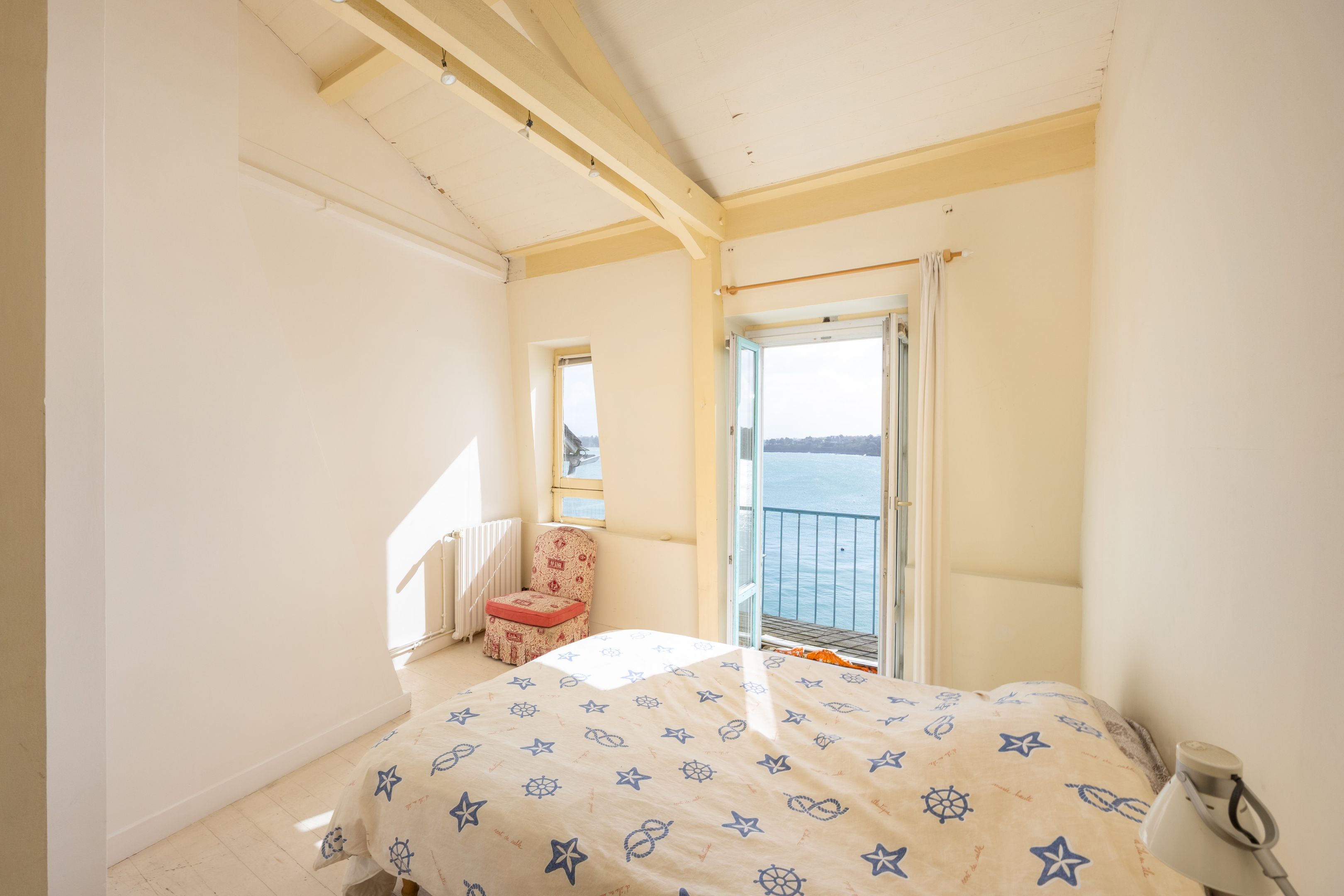 Close to the marina, downtown shops and beaches, overlooking the Clair de Lune promenade. Rare 1890 Dinard seafront villa boasting a privileged location, superb views over the Baie du Prieuré and pleasant exteriors. The 144 m² living space is divided over 5 levels (3 with elevator access): entrance hall, light-filled east-west through living room with bow window, open kitchen, 4 or 5 bedrooms, some with extended balconies, study, 3 bathrooms, one with bathtub, study, summer kitchen. Exceptional sunny terrace of approx. 35 m² offering extraordinary views and peace and quiet.