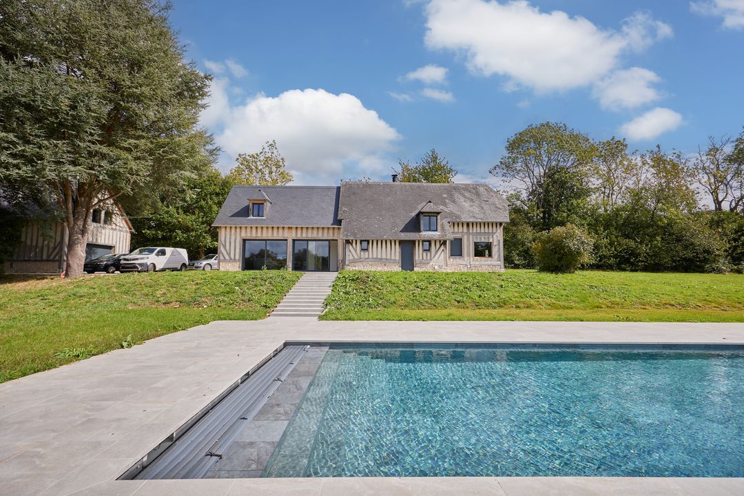 12km from Caen and 4km from Merville-Franceville, charming property built in 1983 and extended in 1995 on 1.8 hectares of flat land. First floor: entrance hall, separate kitchen, large living room with fireplace, dining room with central fireplace, study, separate toilet, double garage. 1st floor: mezzanine, 5 bedrooms including a master suite with bathroom and dressing room, and one with shower room, shower room, separate toilet. Partial 2nd floor with large office area (possible 6th bedroom). Full basement of 250m2. Outbuildings: 2-storey guest house (T2) and 3 horse stalls. Needs updating.