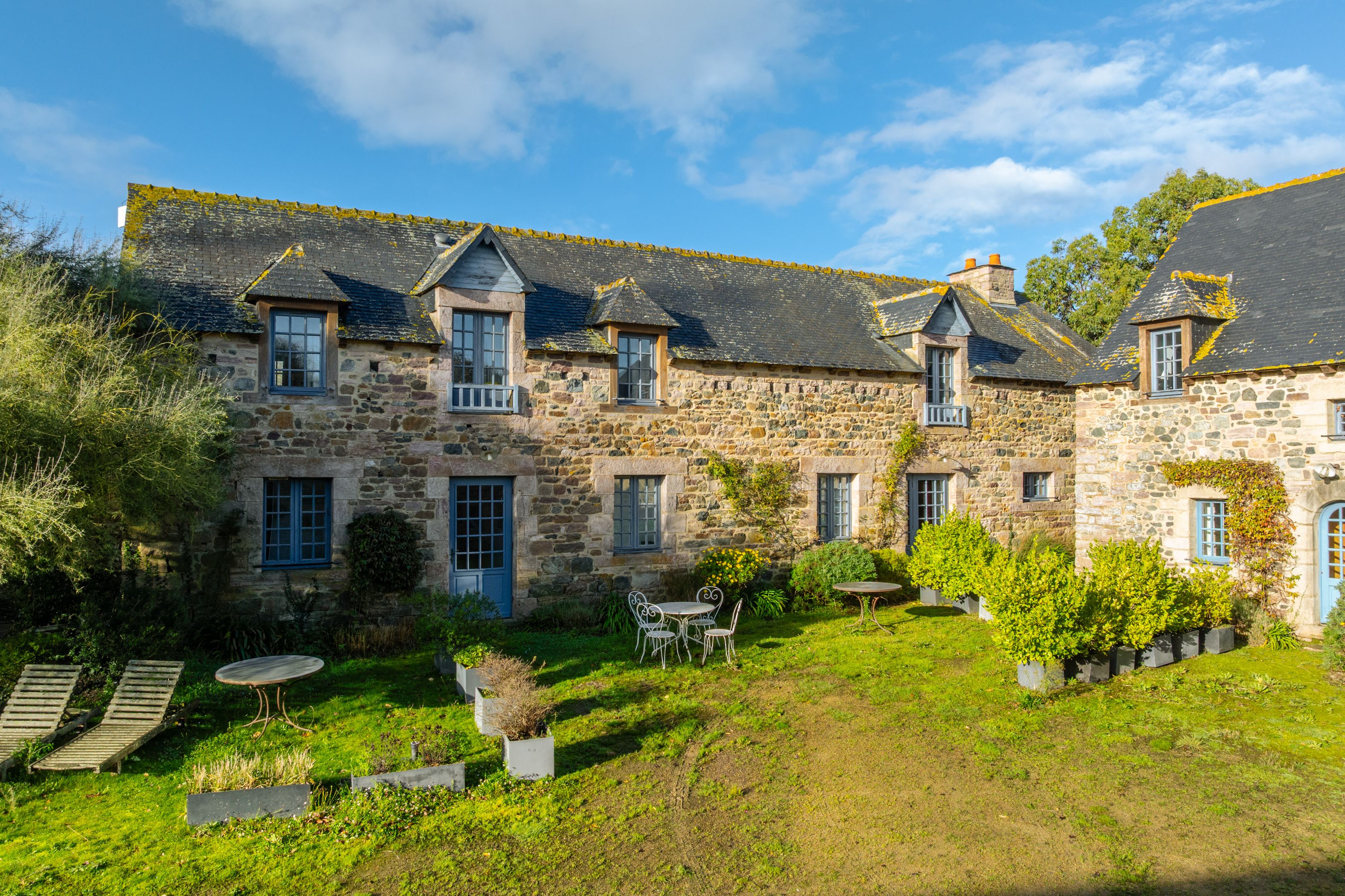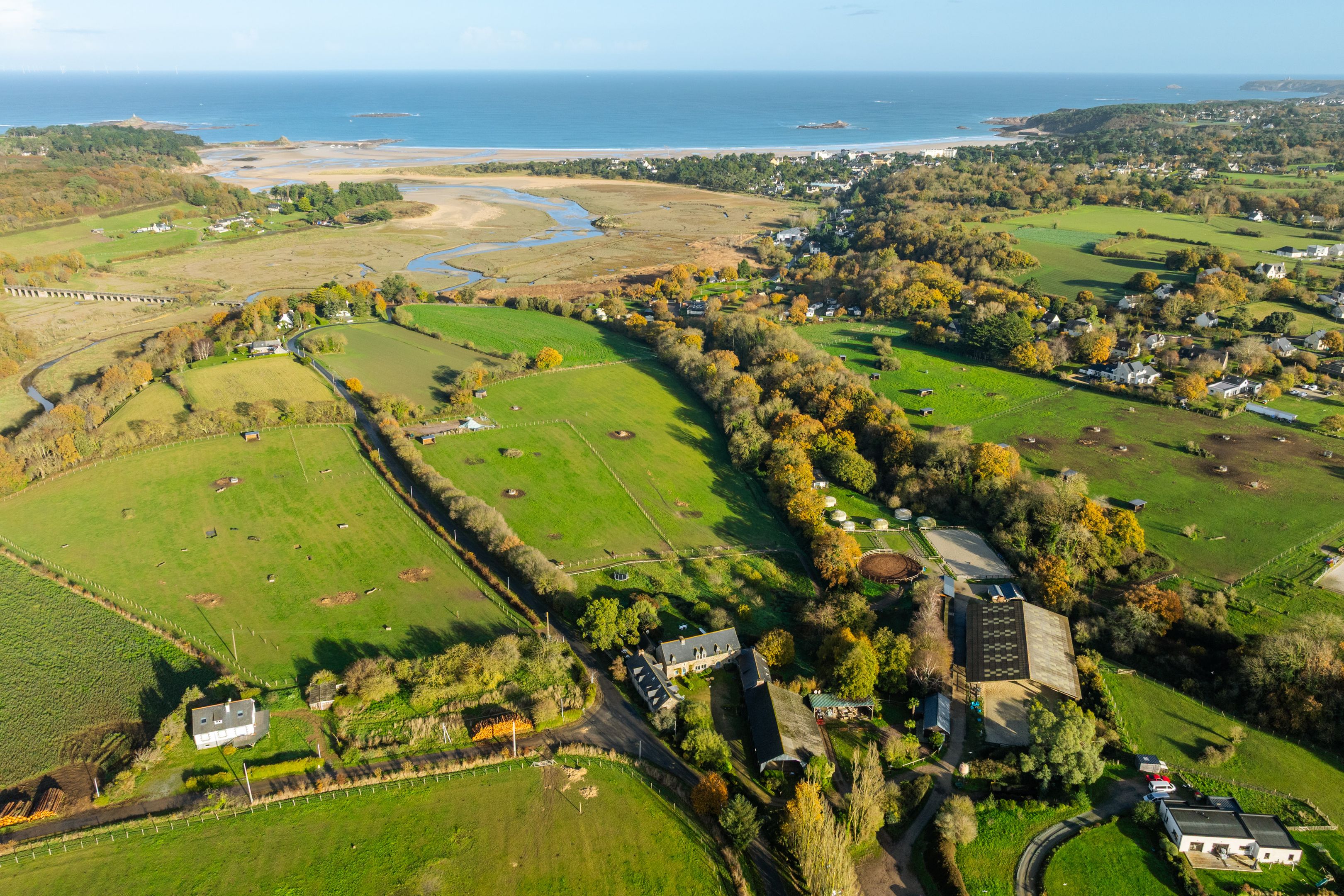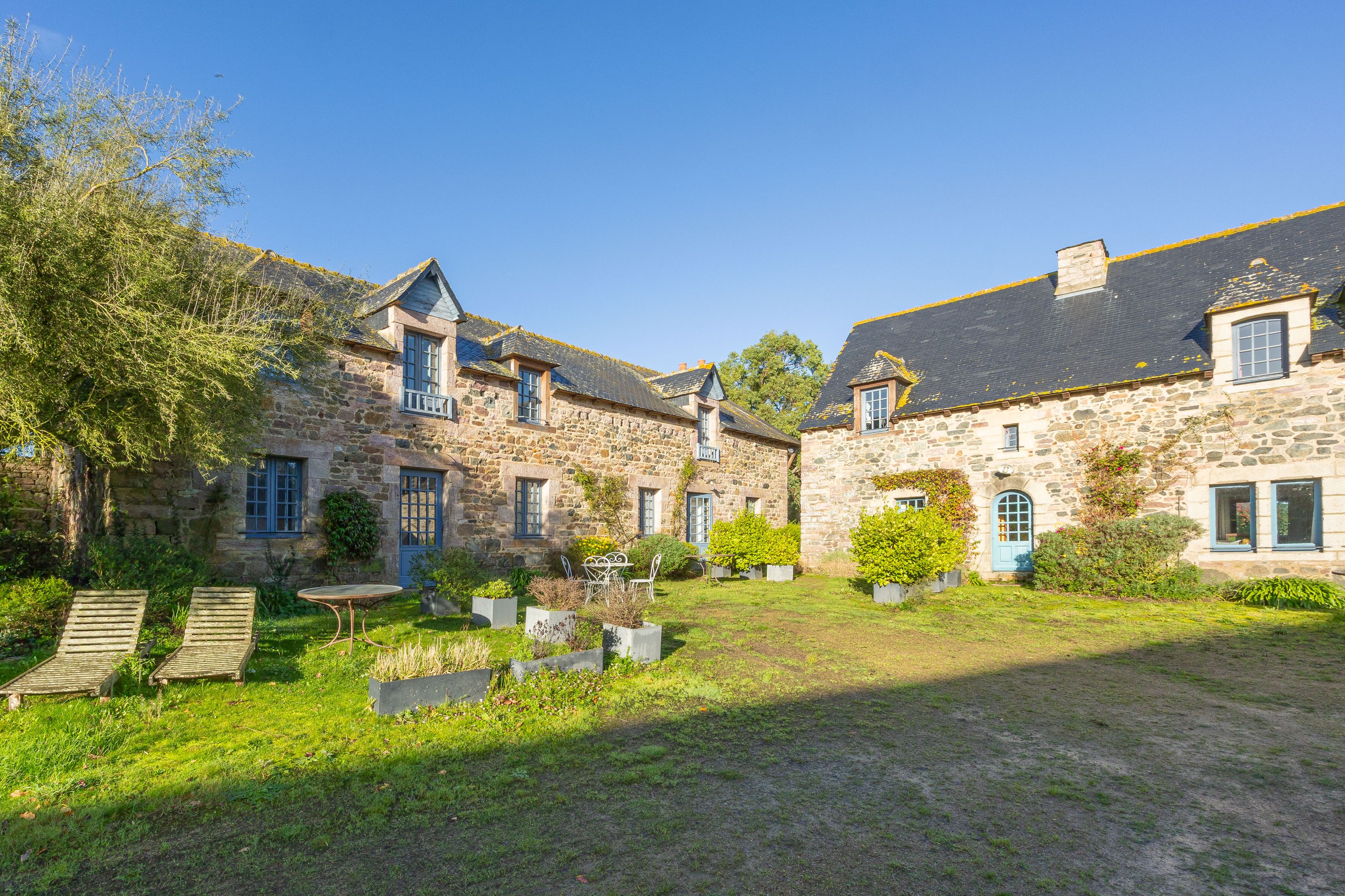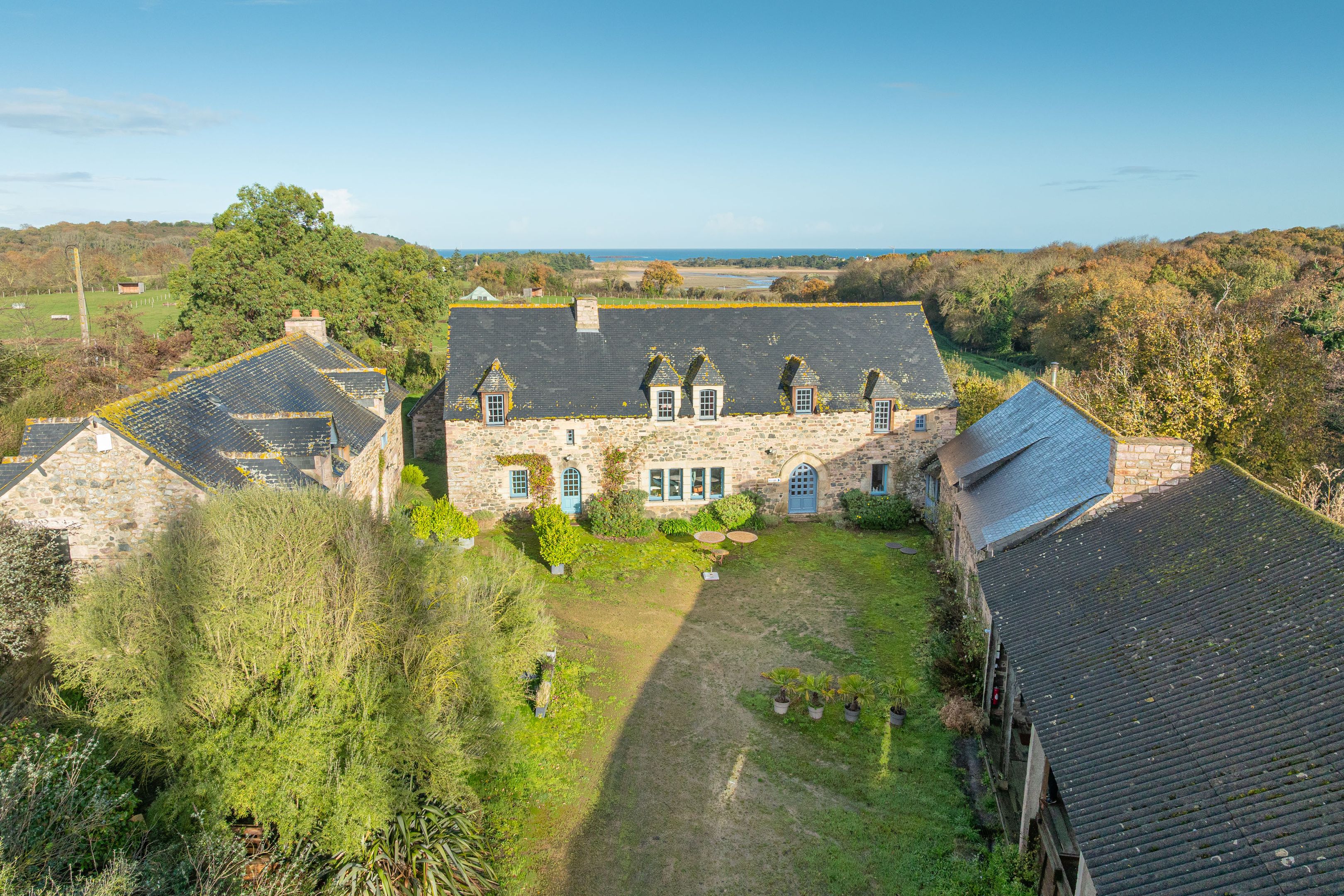 Sables-d'Or-les-Pins, in the heart of an environment between land and sea, 800m from the beach. Spacious, typically Breton family property of approx. 600m², dating from the 16th century and benefiting from a privileged location, a large reception capacity and excellent general amenities. The main house offers 215m²: living room with fireplace and sea view, fitted kitchen, 5 bedrooms, 4 bathrooms. Two adjoining longères, comprising 6 charming gîtes, offer a total of 12 bedrooms and 9 additional shower rooms. Large sunny courtyard and sea-view garden surrounded by vast meadows. Outbuildings.