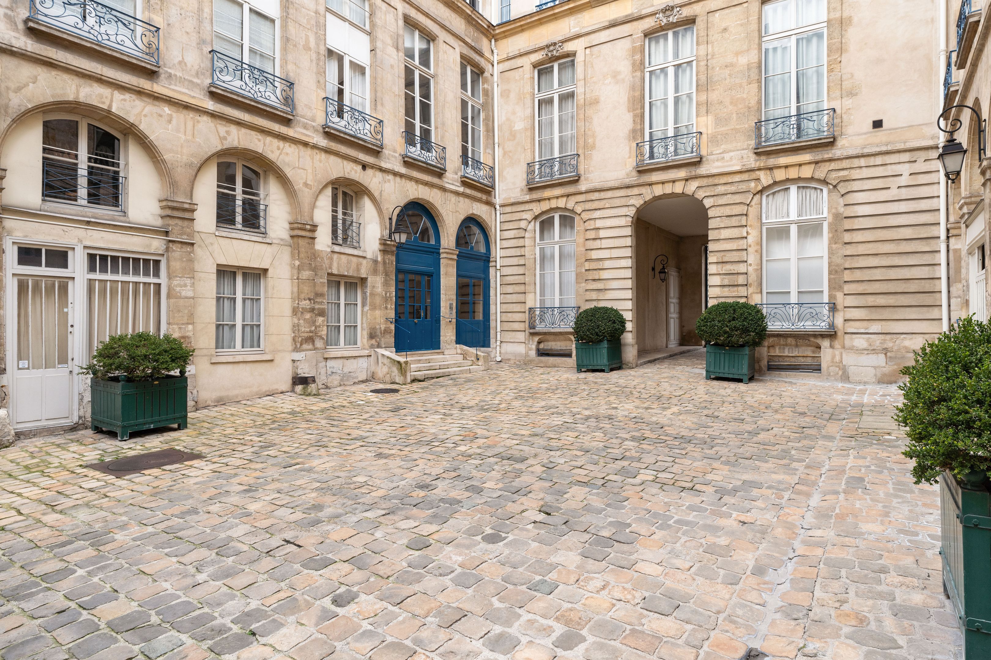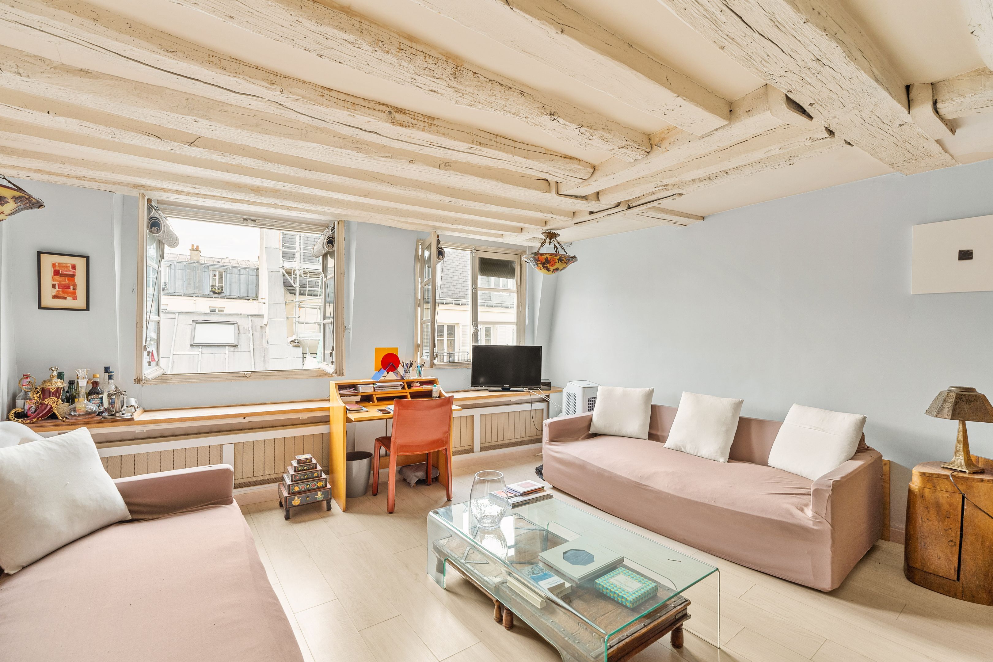 In the heart of a late 19th century private mansion, a "coup de cœur" apartment on the 4th floor with elevator, luminous, through-planning, 41.98 m2 loi Carrez, with the iconic charm of the historic Marais and unobstructed views of the street and courtyard. Entrance hall, living room, open-plan fitted kitchen, bathroom with WC.
