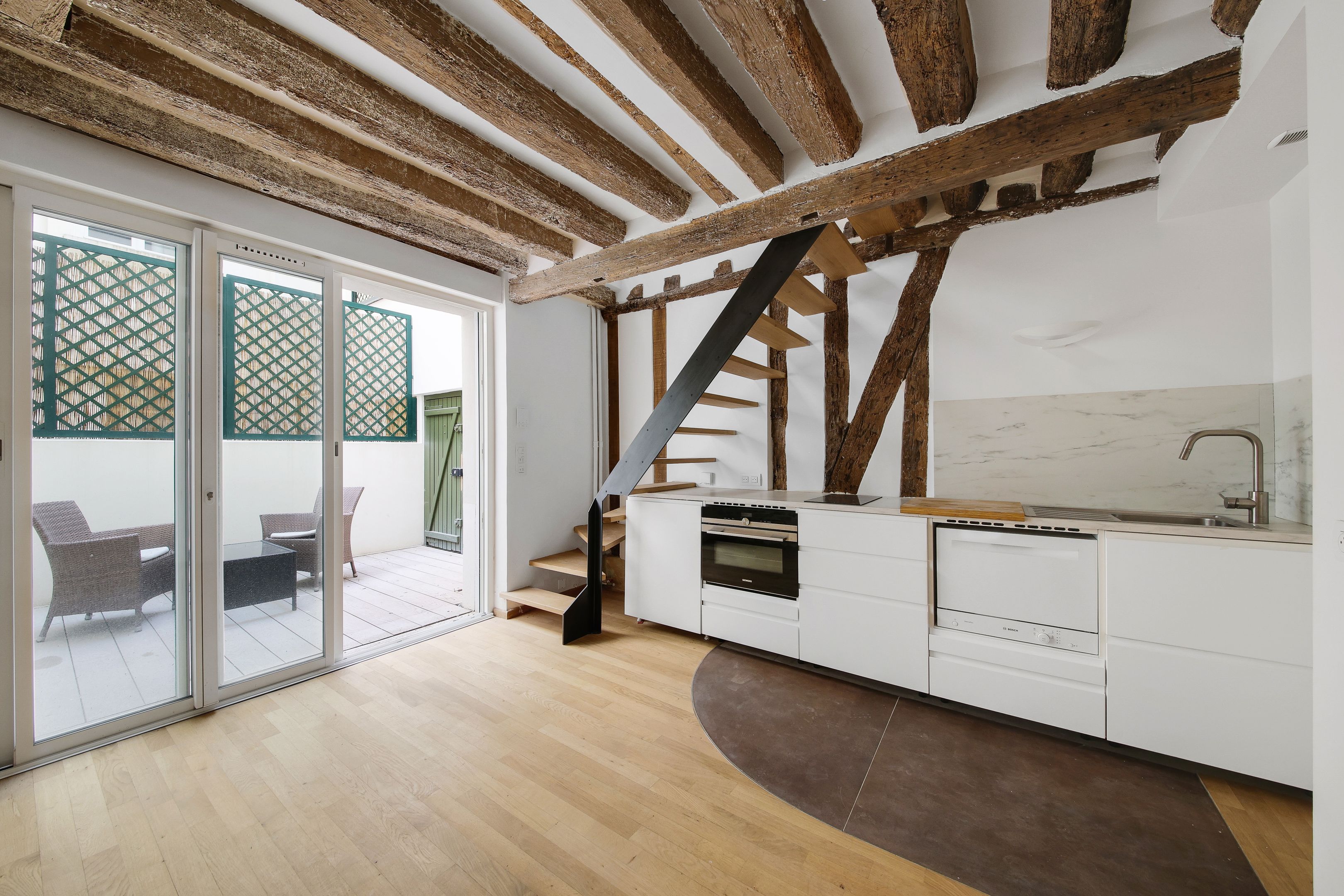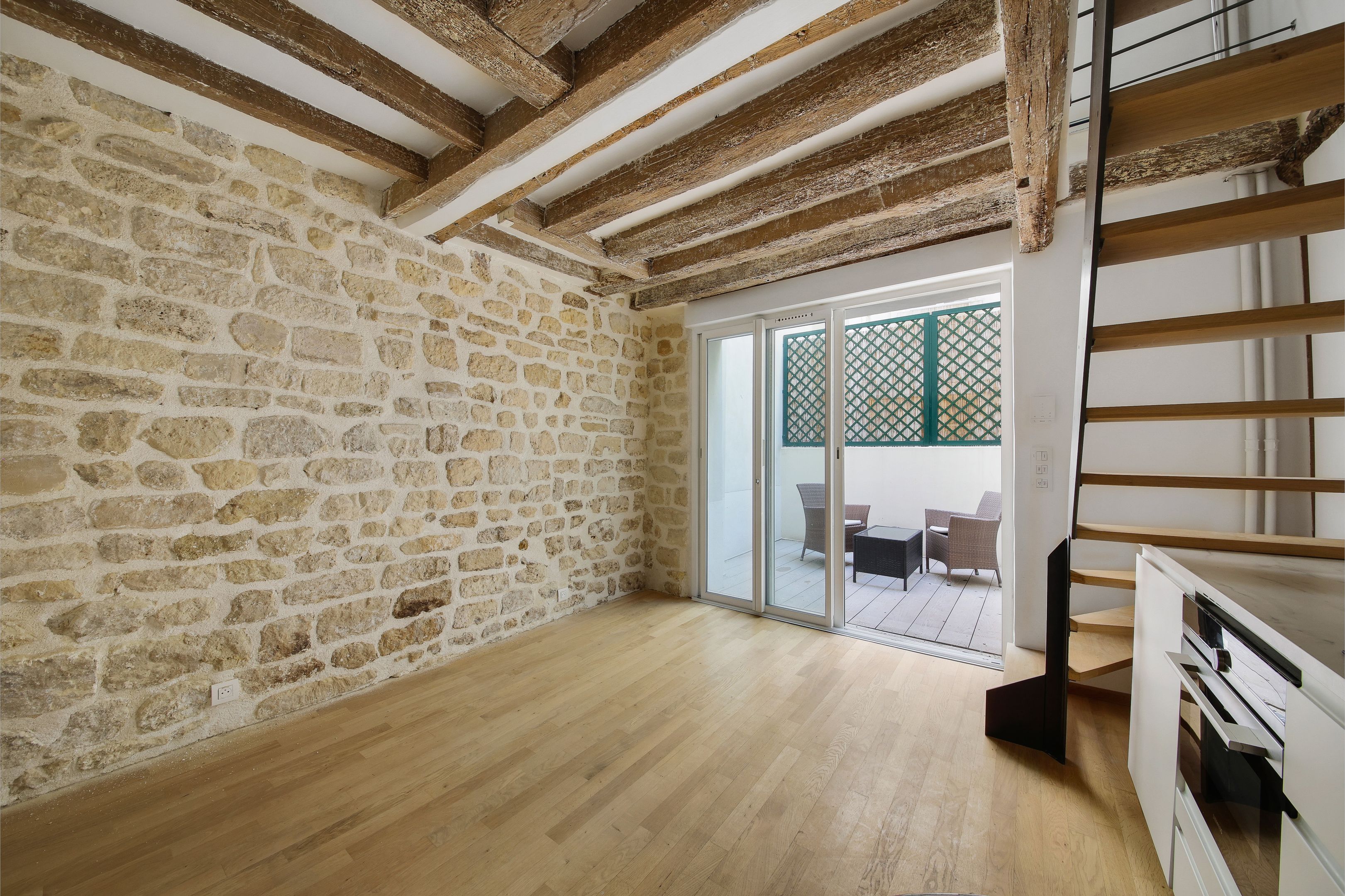 Ideally located close to the Bon Marché, in a beautiful condominium with well-maintained common areas. Pleasant two-room apartment of 22.77 m² Loi Carrez, benefiting from a 10 m² terrace on the living room, entirely renovated and having kept the charm of the old. Living room with open-plan, fully-equipped kitchen opening onto the south-west-facing terrace, upstairs bedroom, bathroom with toilet, laundry and storage space. Cellar.
