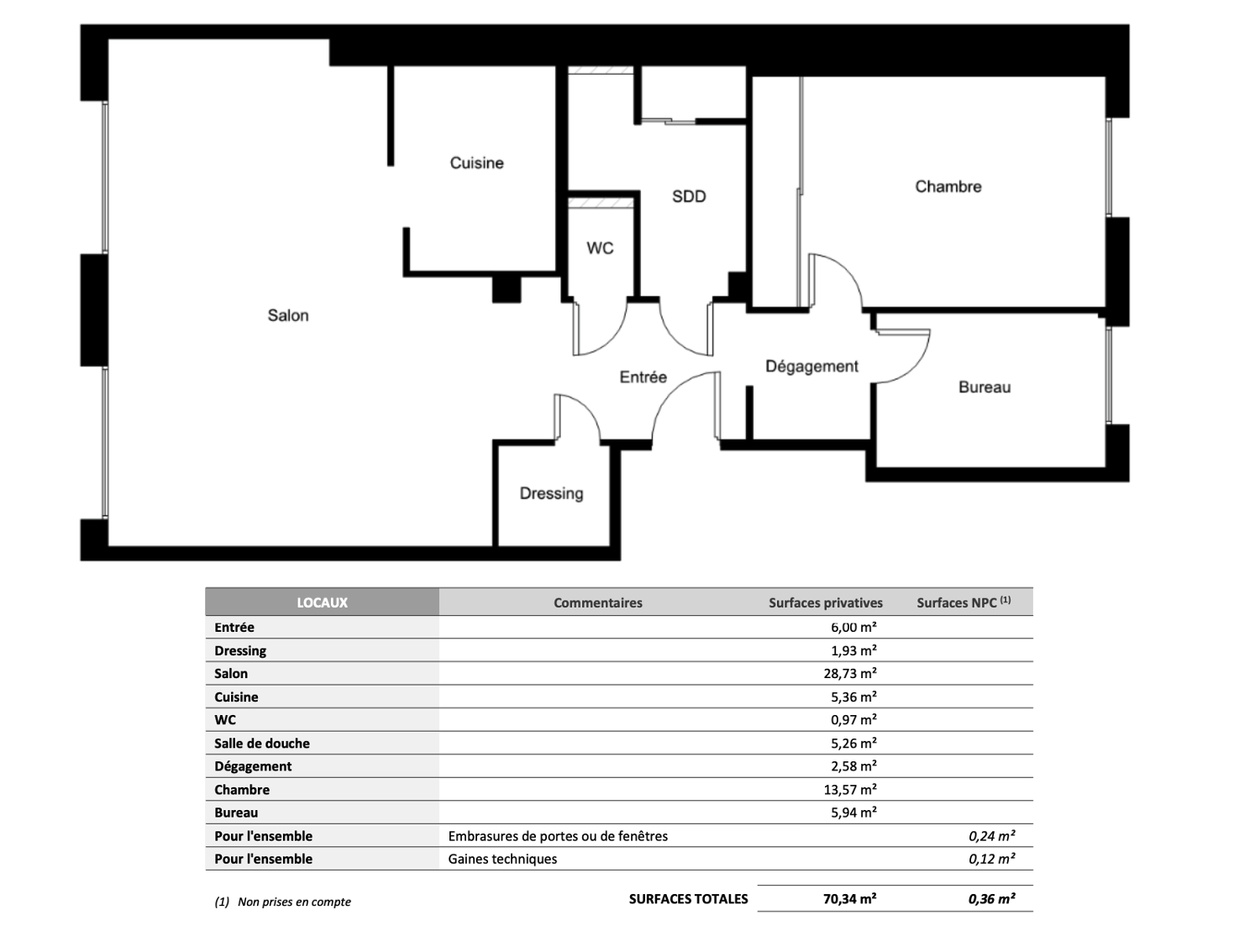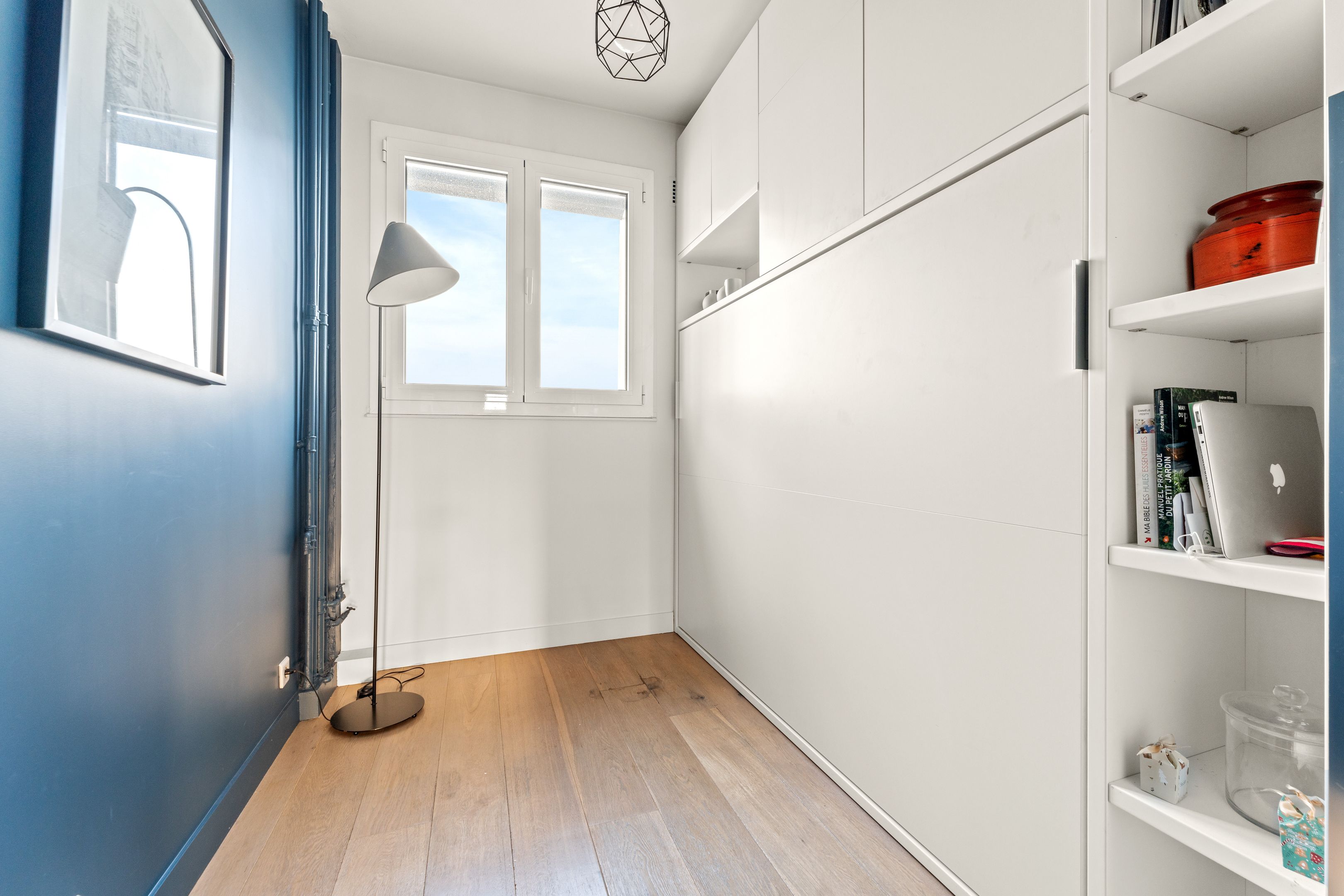 The layout includes an entrance hall, a spacious and sunny living room with an open-plan kitchen, one bedroom and an office (or guest bedroom), a shower room with laundry area, separate toilet, and extensive custom-built storage and wardrobes.