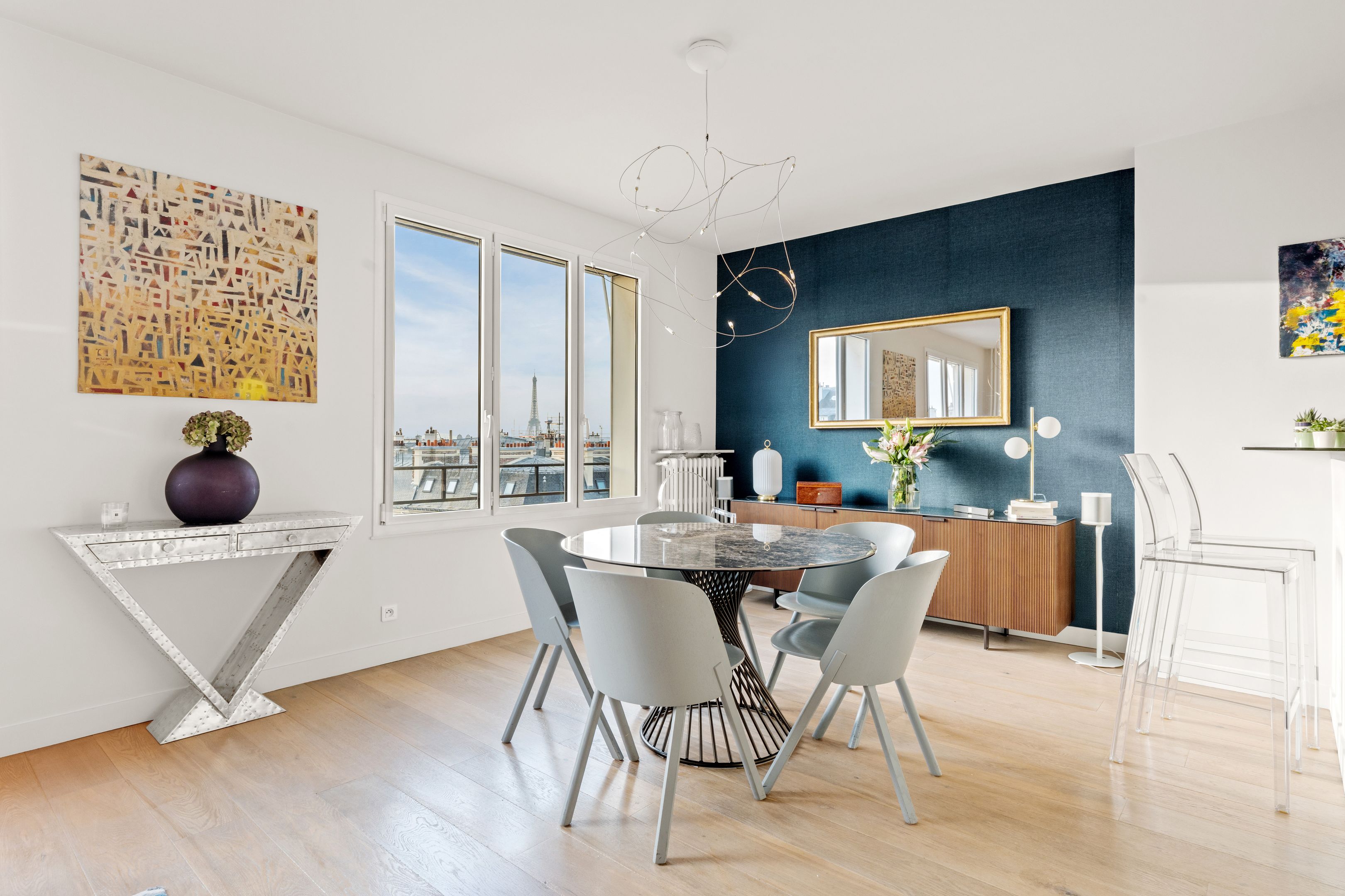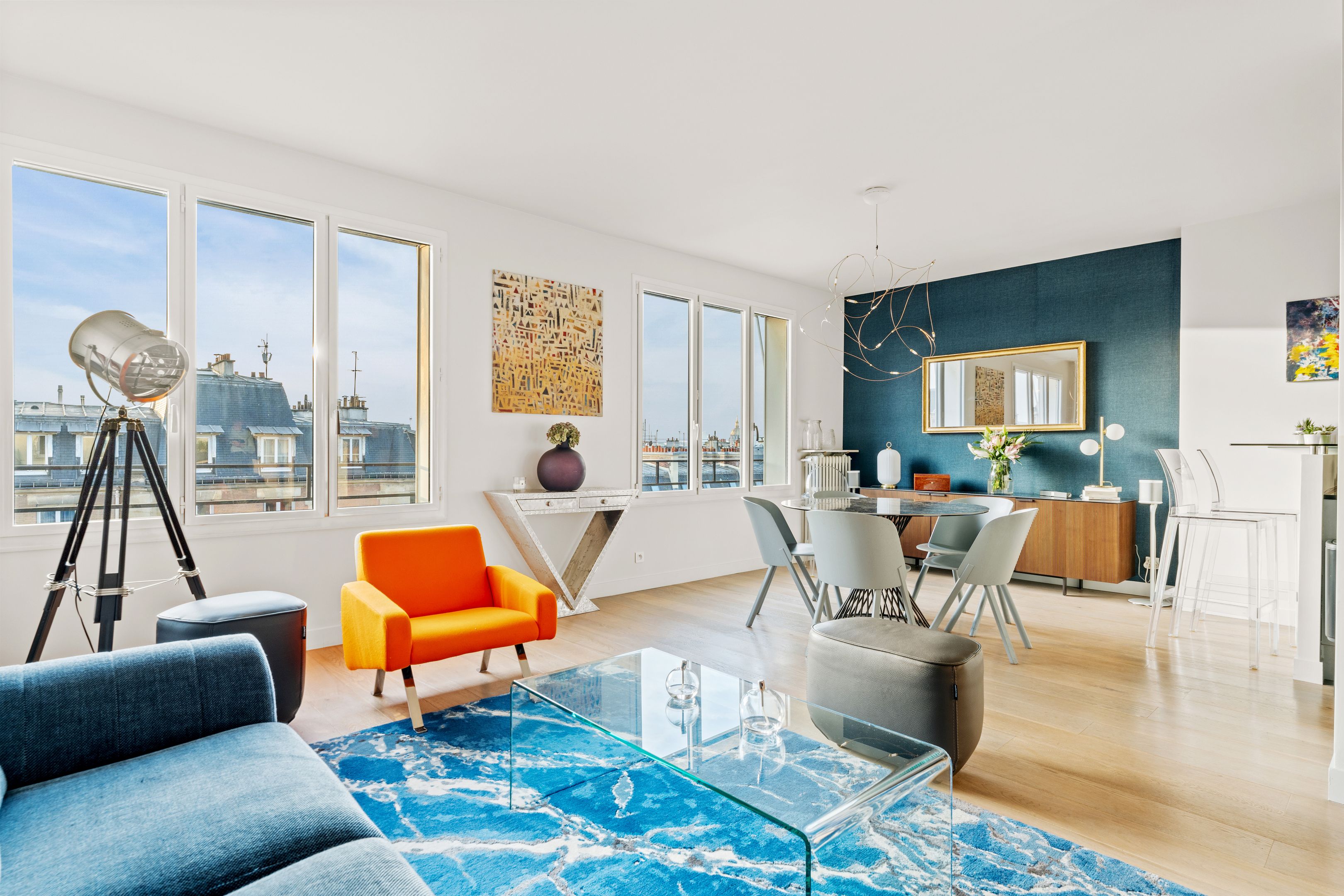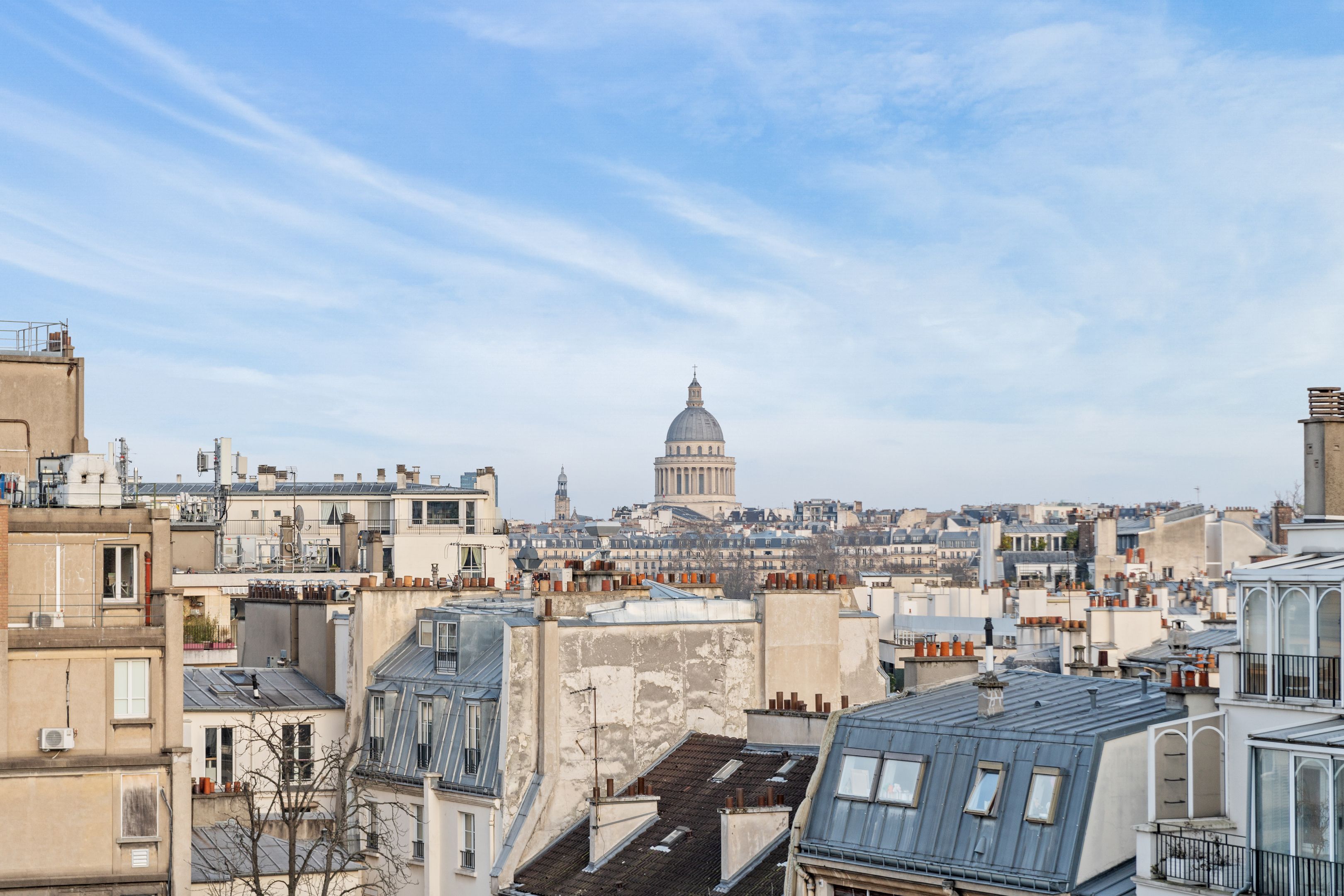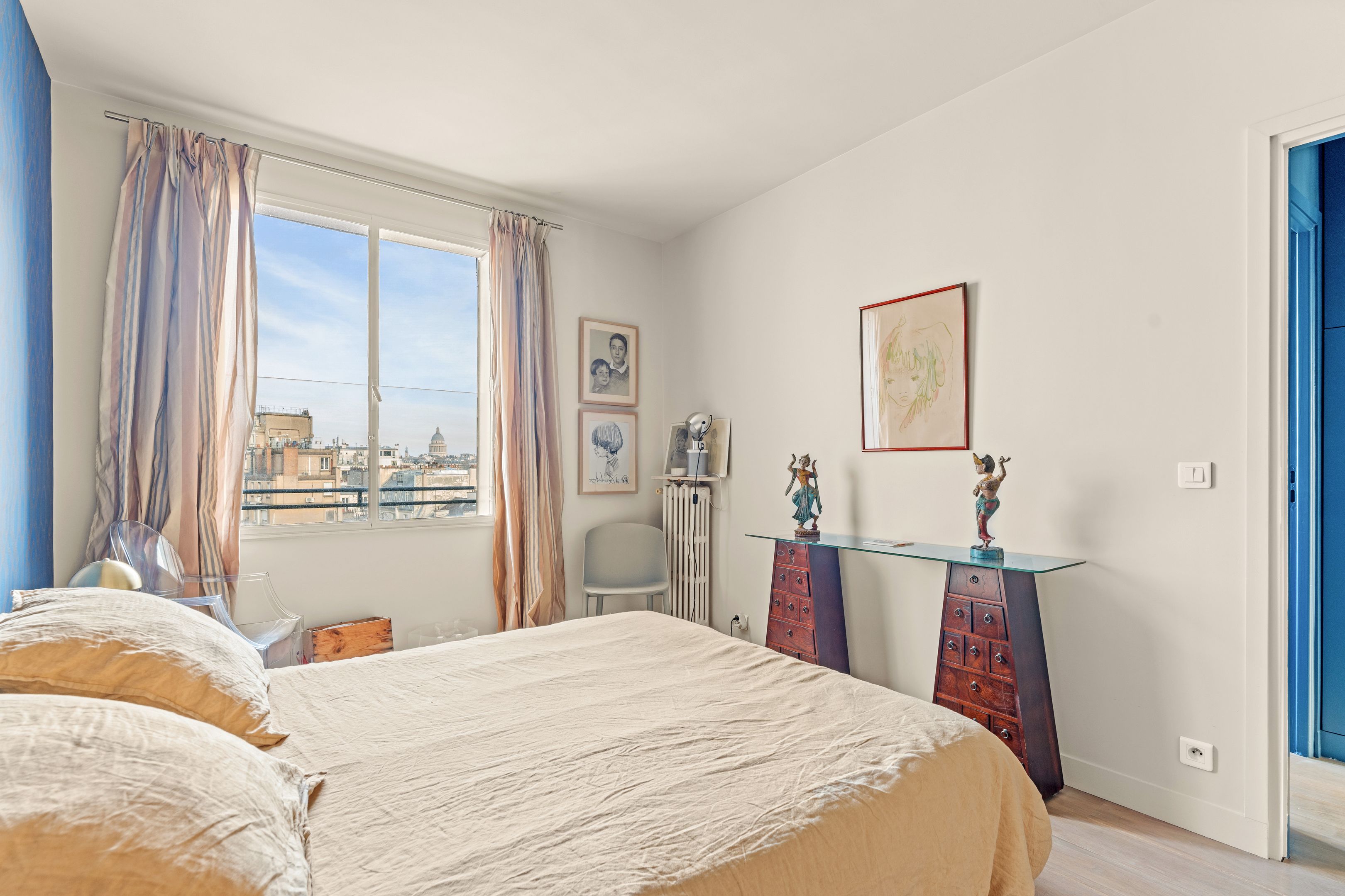 Located on the 7th floor with elevator access, this recently renovated apartment offers breathtaking views of the Dome of Les Invalides and the Eiffel Tower from the west-facing living room, as well as views of the Panthéon from both bedrooms.