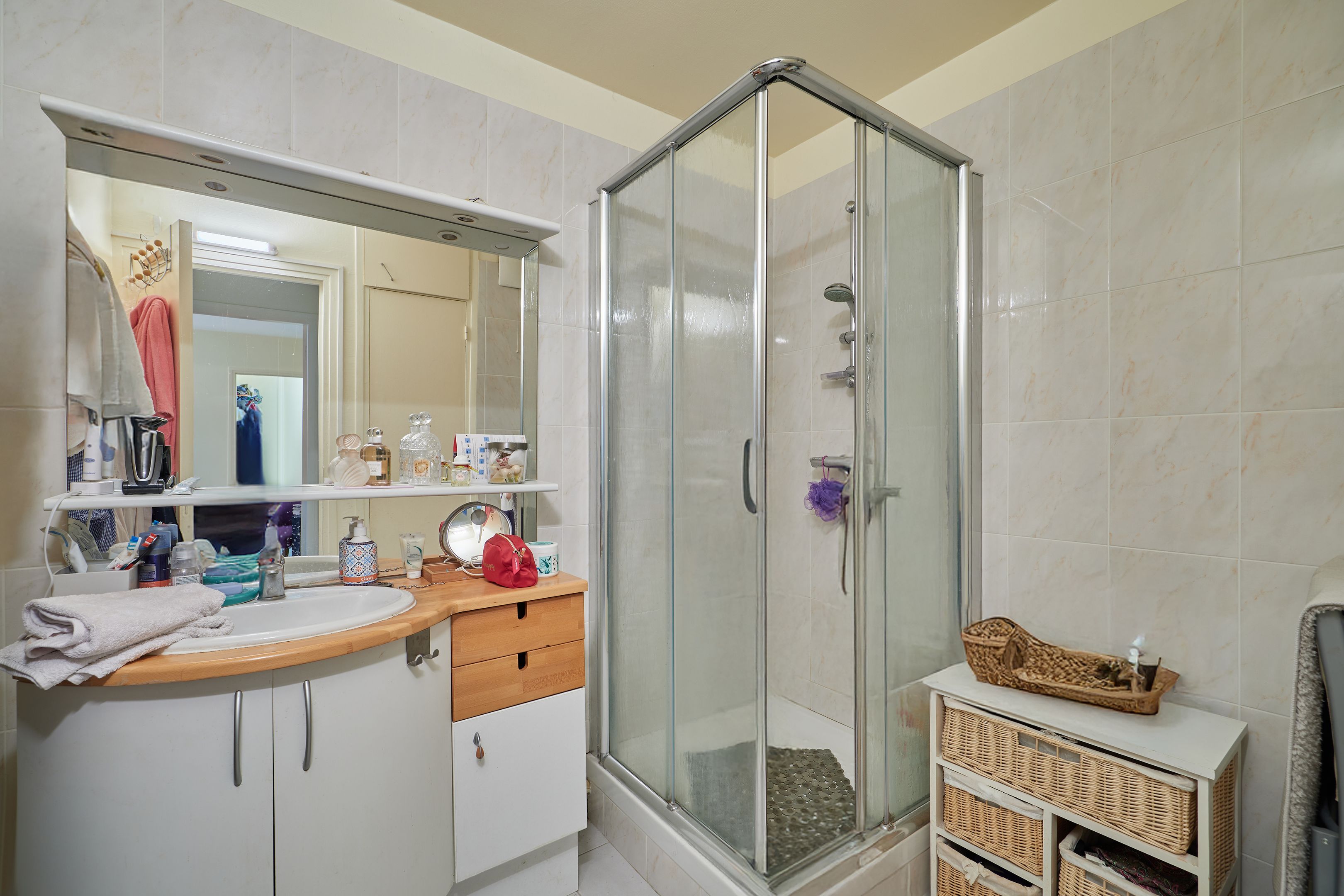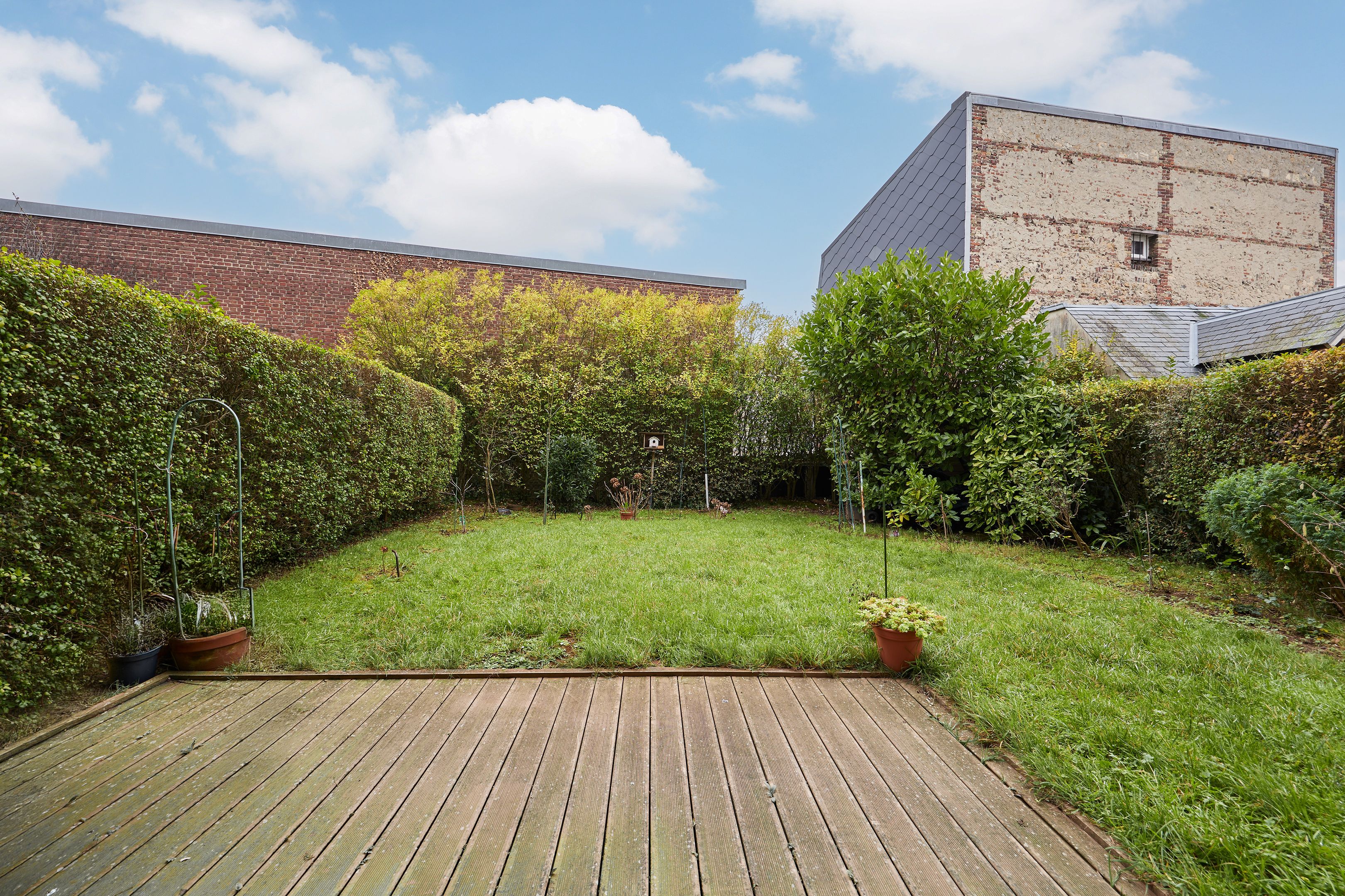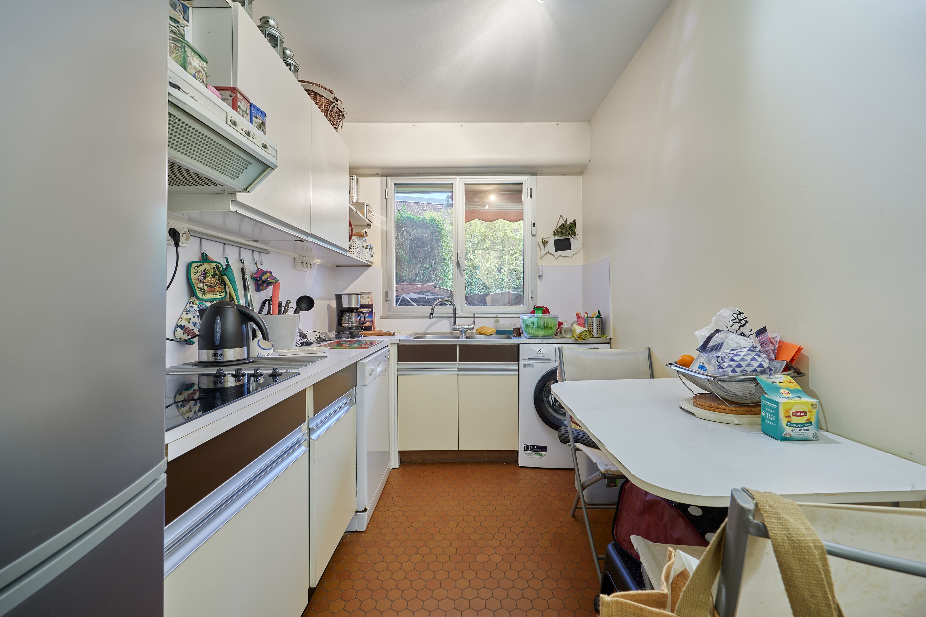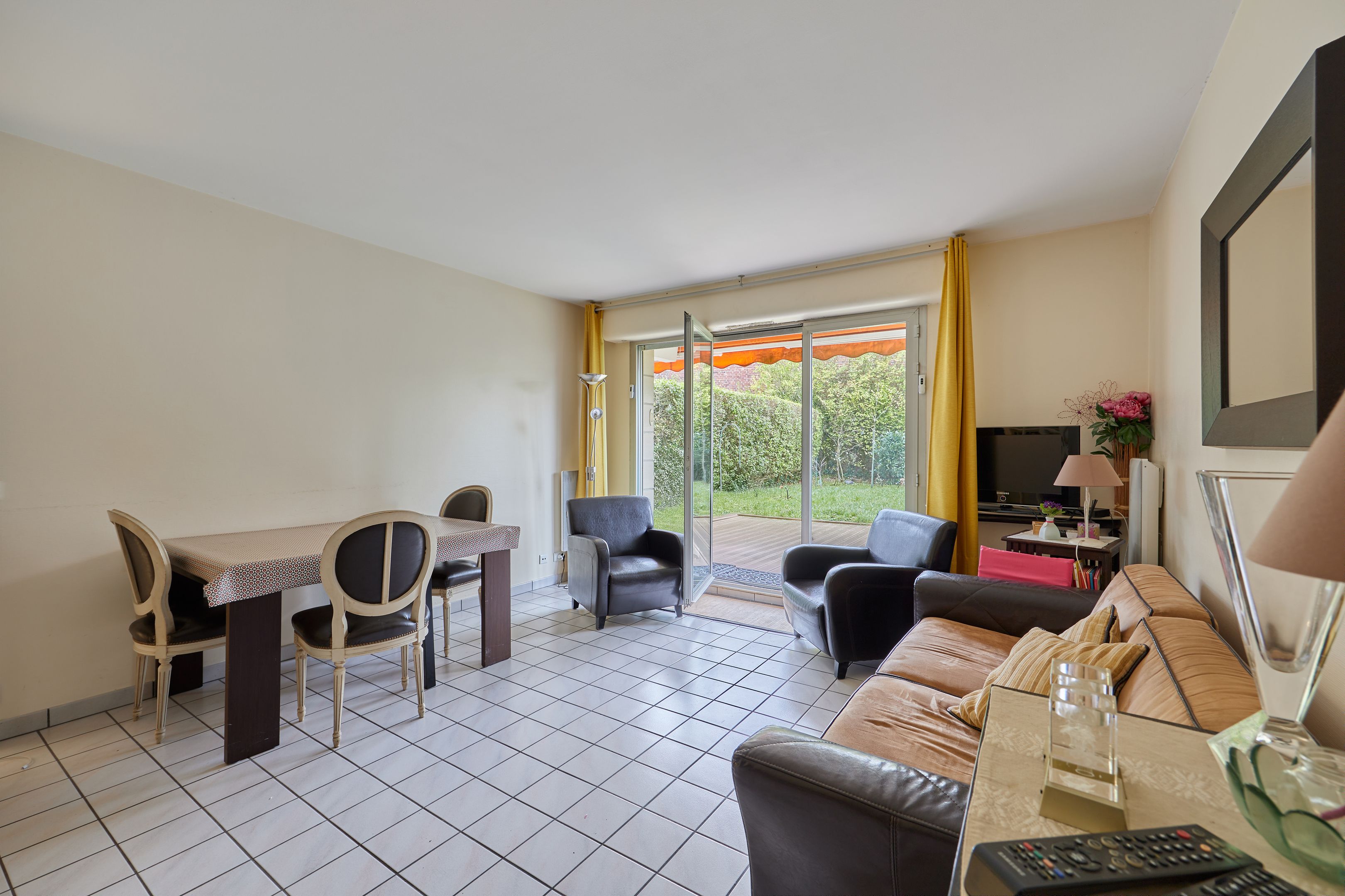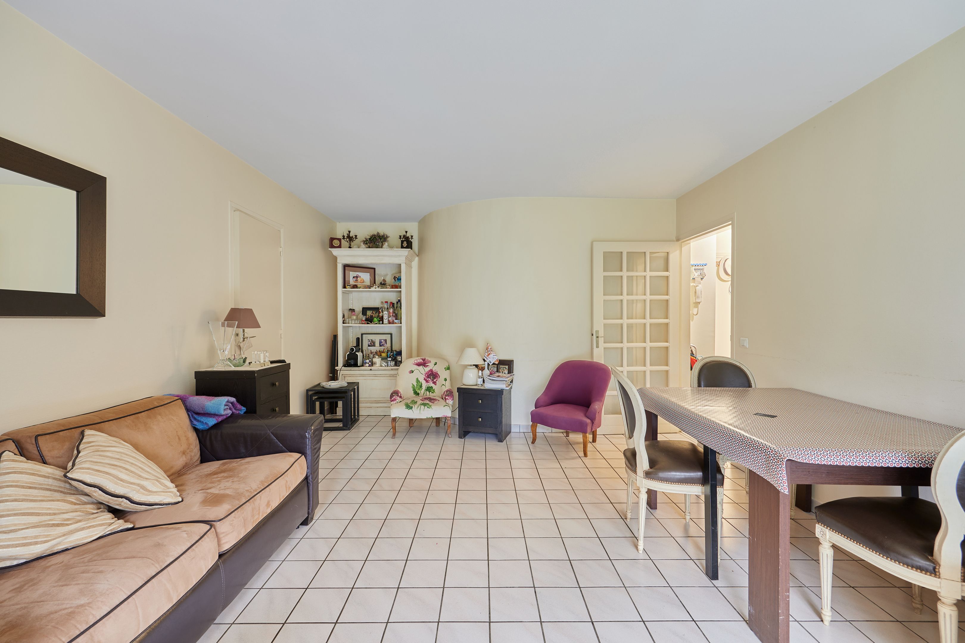 Between Place Morny and the station, on the garden level of a secure residence with janitor, attractive 50.33m2 2-room apartment. Entrance with cupboards, living room opening onto the south-west facing private garden of approx. 80m2, separate kitchen, bedroom, shower room, separate toilet. Basement: cellar, two adjoining parking spaces, one of which is closed and used for storage. Renovation work to be carried out.