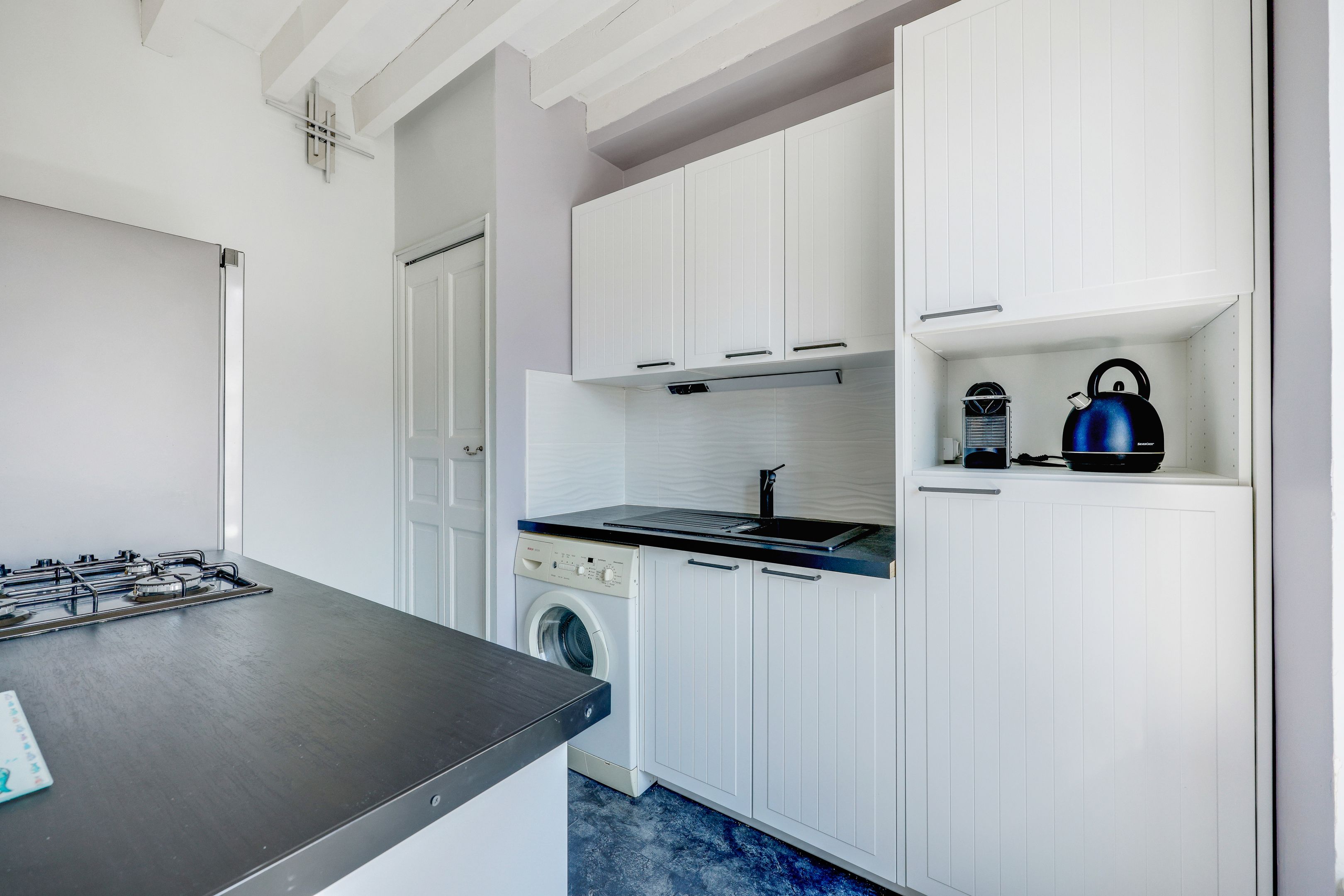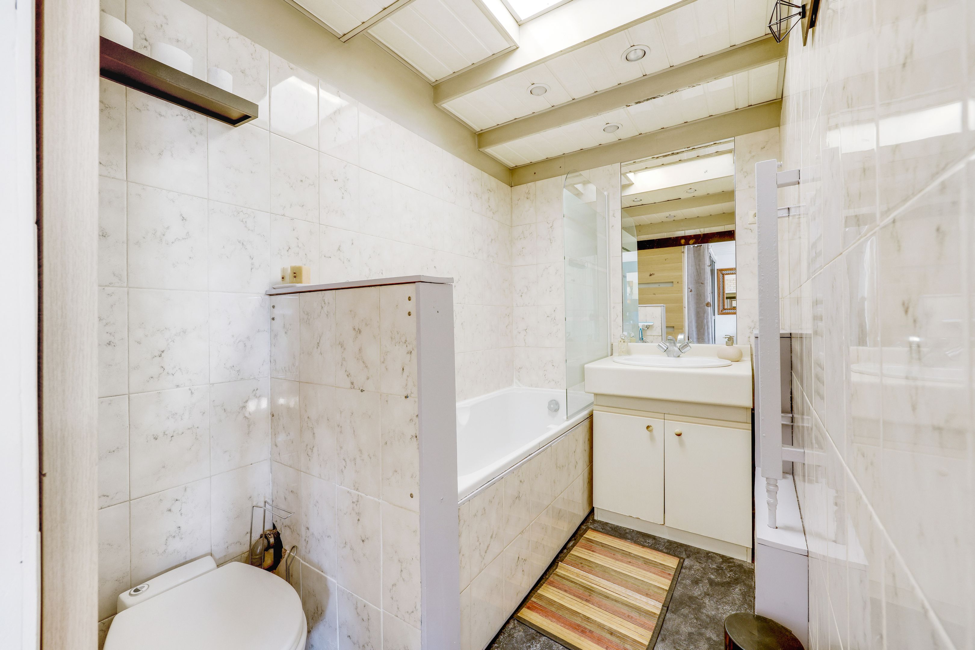 Two-bedroom apartment, 4th and top floor. Small, well-kept condominium in perfect condition. Large living room, open kitchen, bedroom with skylight, dressing room, bathroom with toilet. Cellar