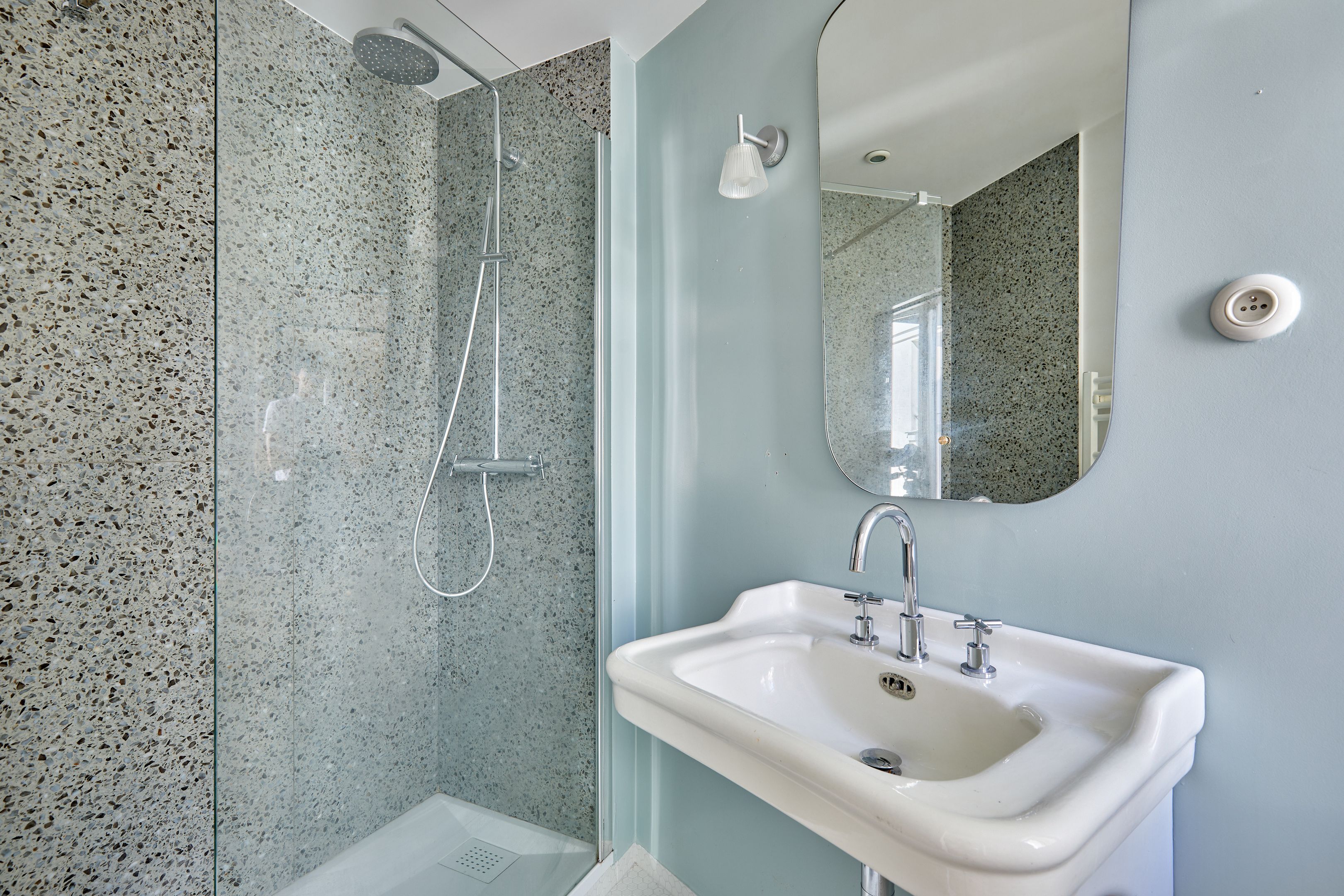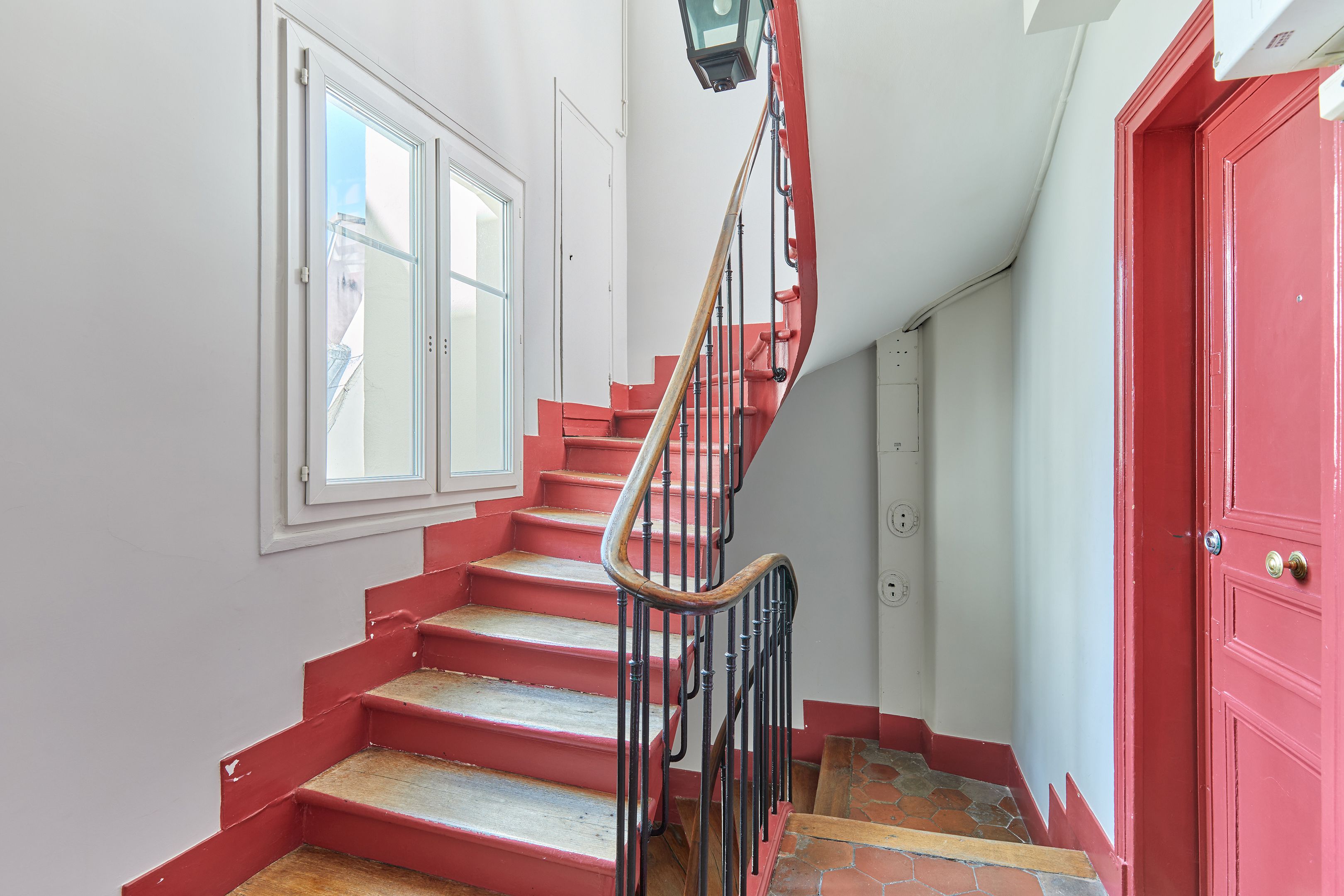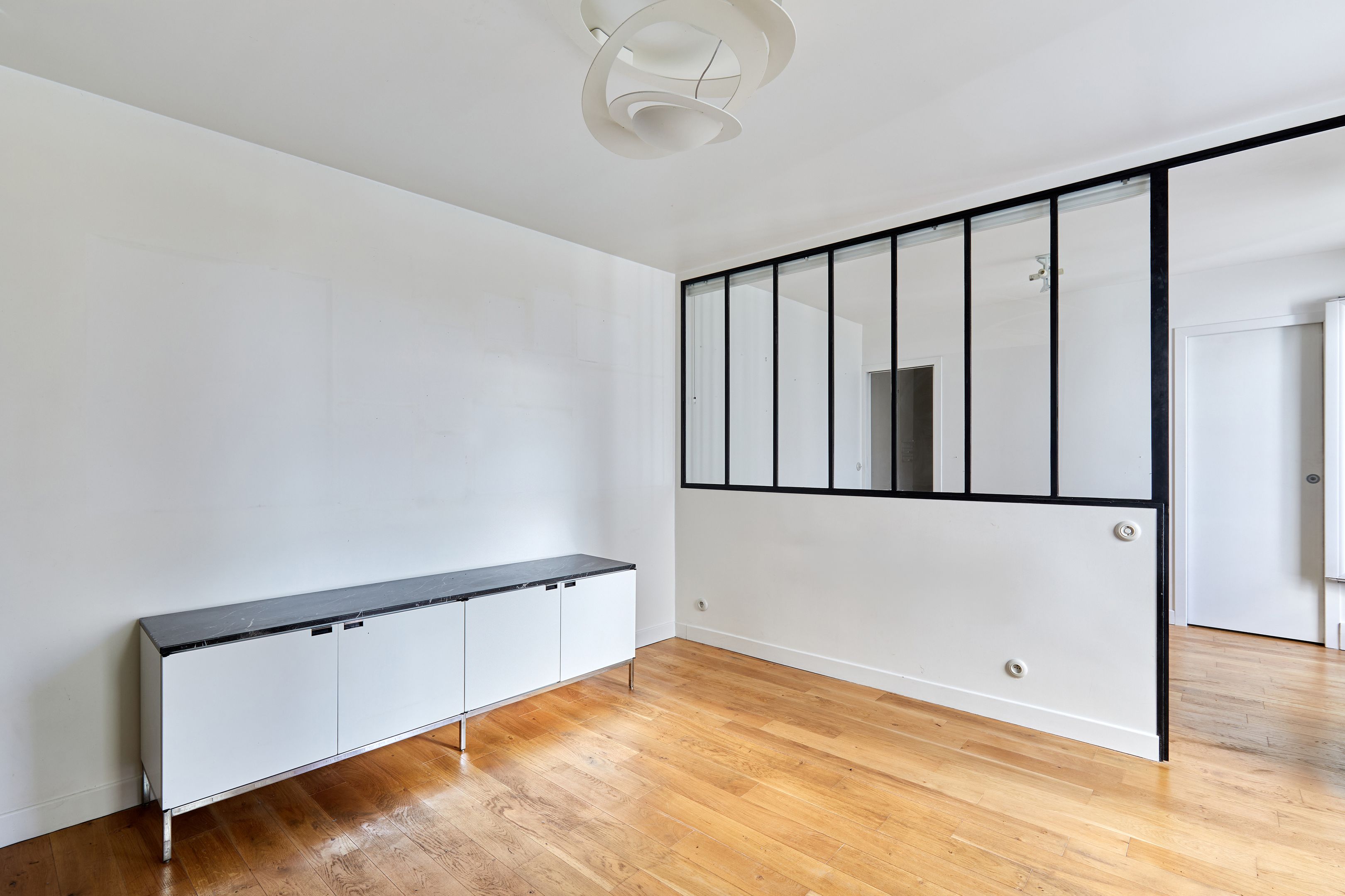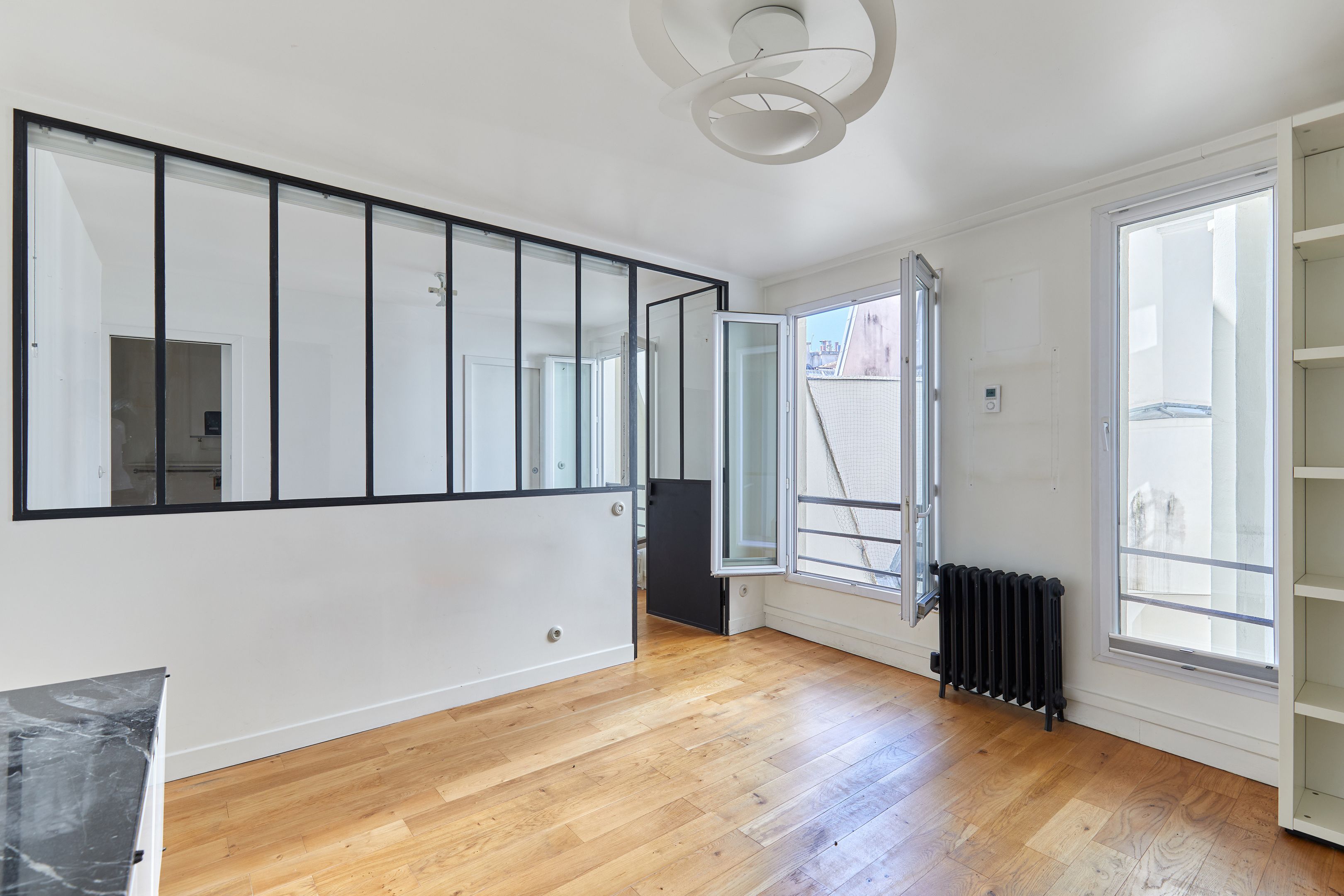 Well-maintained old building, on the 5th floor served by staircase, two-room apartment in good condition, 34.02m² loi Carrez. Entrance hall, west-facing living room with two large windows, semi-open fully-equipped kitchen, bedroom with workshop glass roof and adjoining dressing room, shower room and separate toilet. Cellar and storage room on landing. Elevator possible.