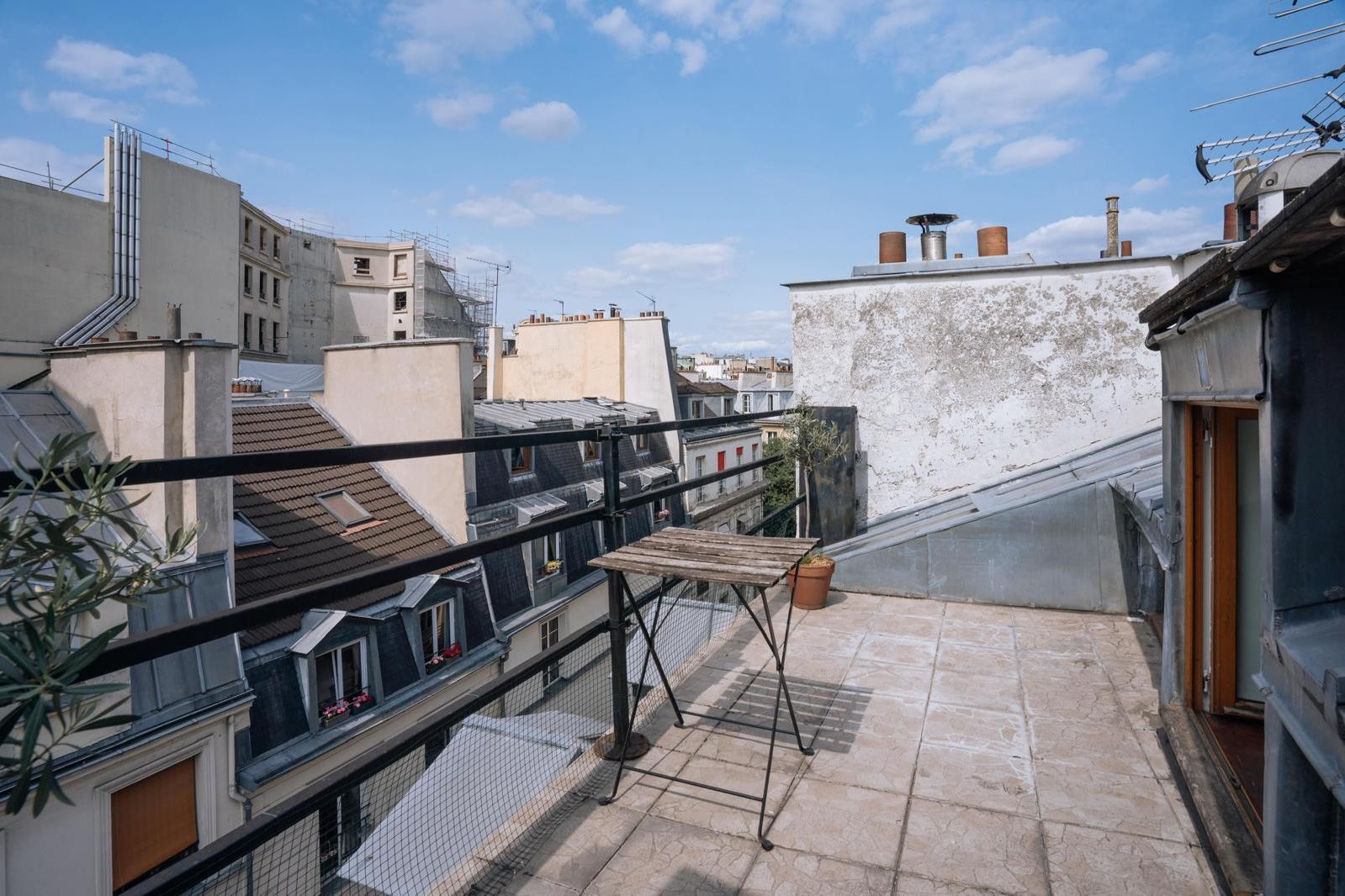 39.75m² duplex apartment, 27.46m² Carrez floor area. First level: living room with open-plan kitchen. Second level: bedroom, shower room with toilet, access to 7m² terrace.