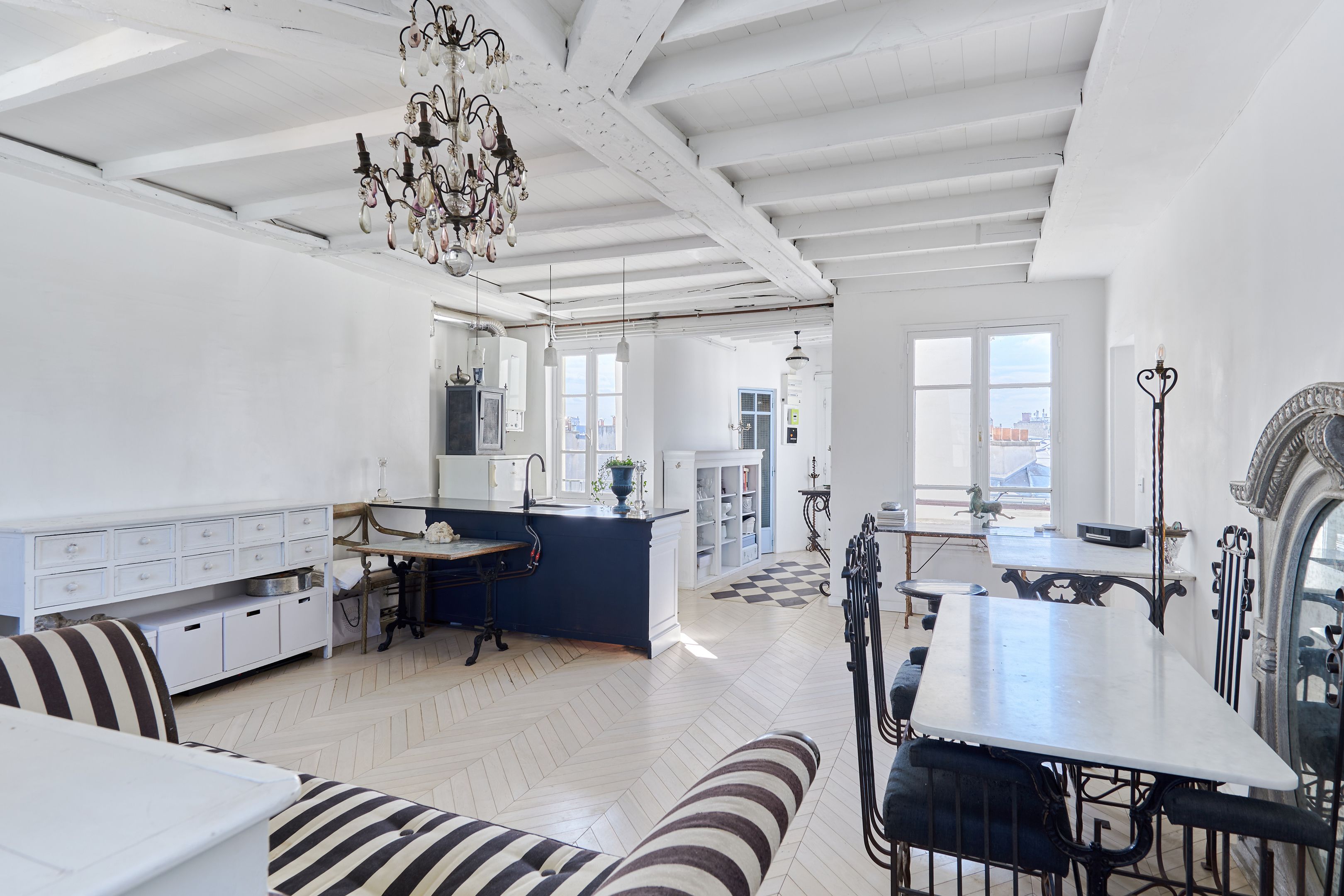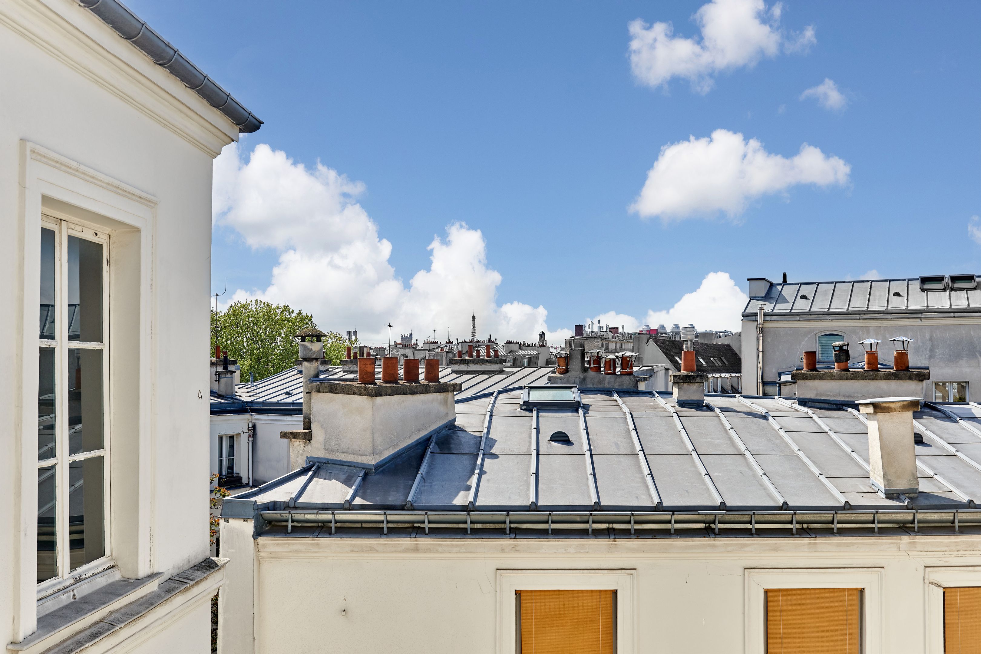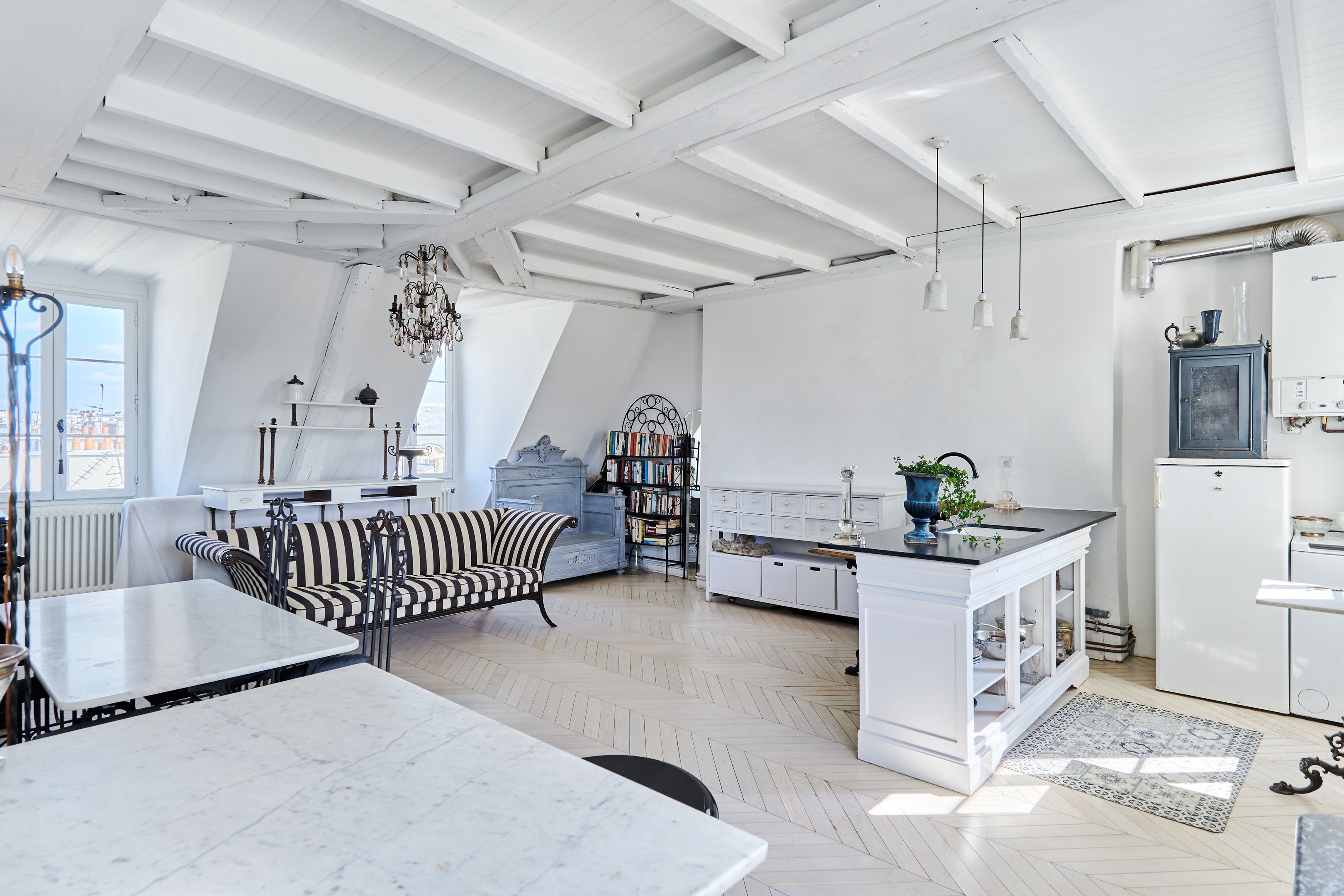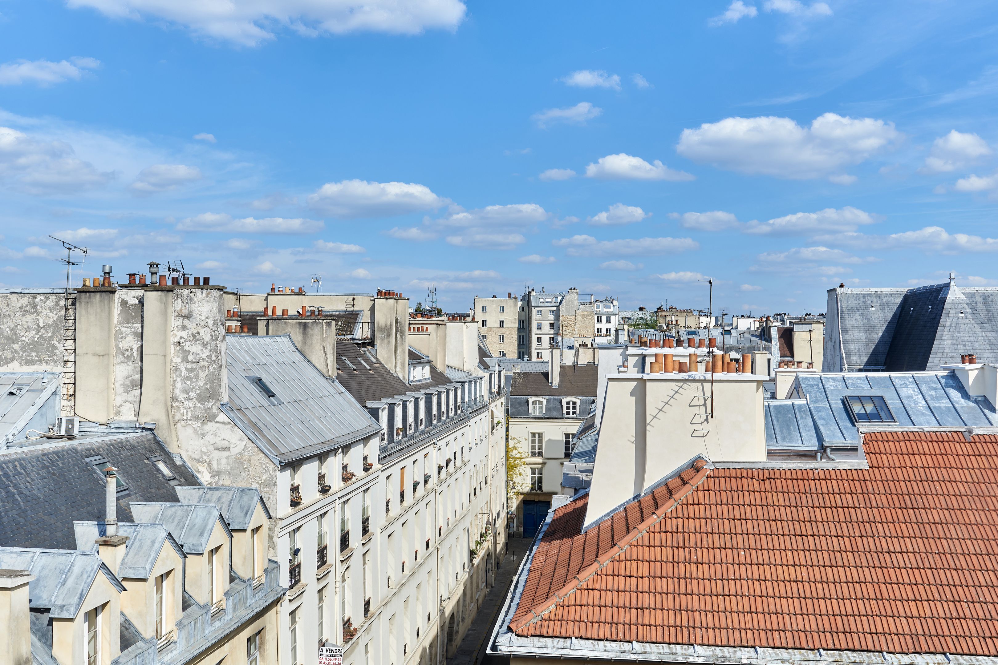 In a 19th-century building, on the 5th and top floor by staircase, through EAST/WEST apartment offering unobstructed views of Paris monuments from each of its 7 windows. Tastefully restored with noble materials, the property has preserved the charm of the Marais: herringbone parquet flooring, exposed beams. It comprises an entrance hall, a spacious living room with open-plan kitchen, a bedroom and a shower room with toilet. Cellar