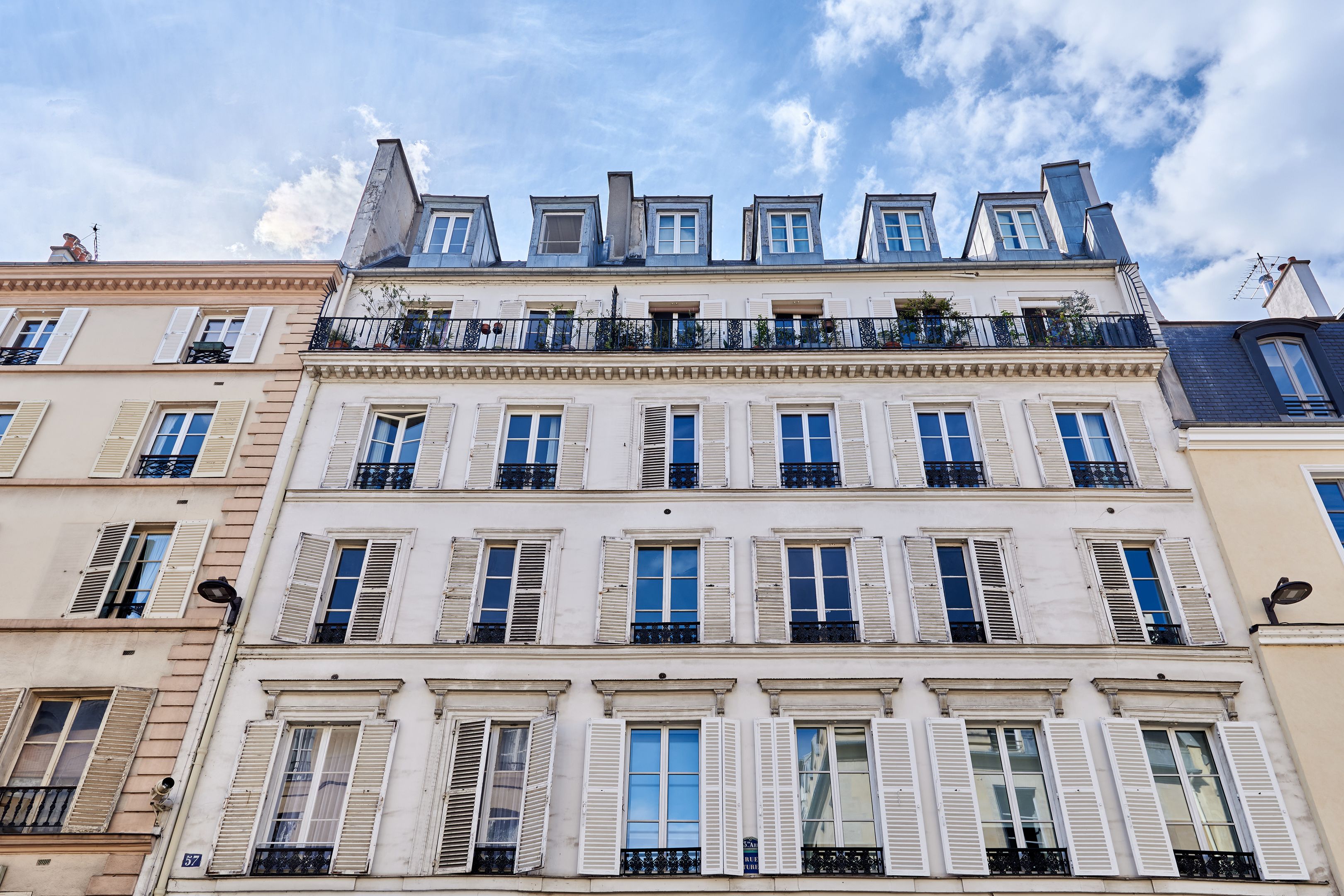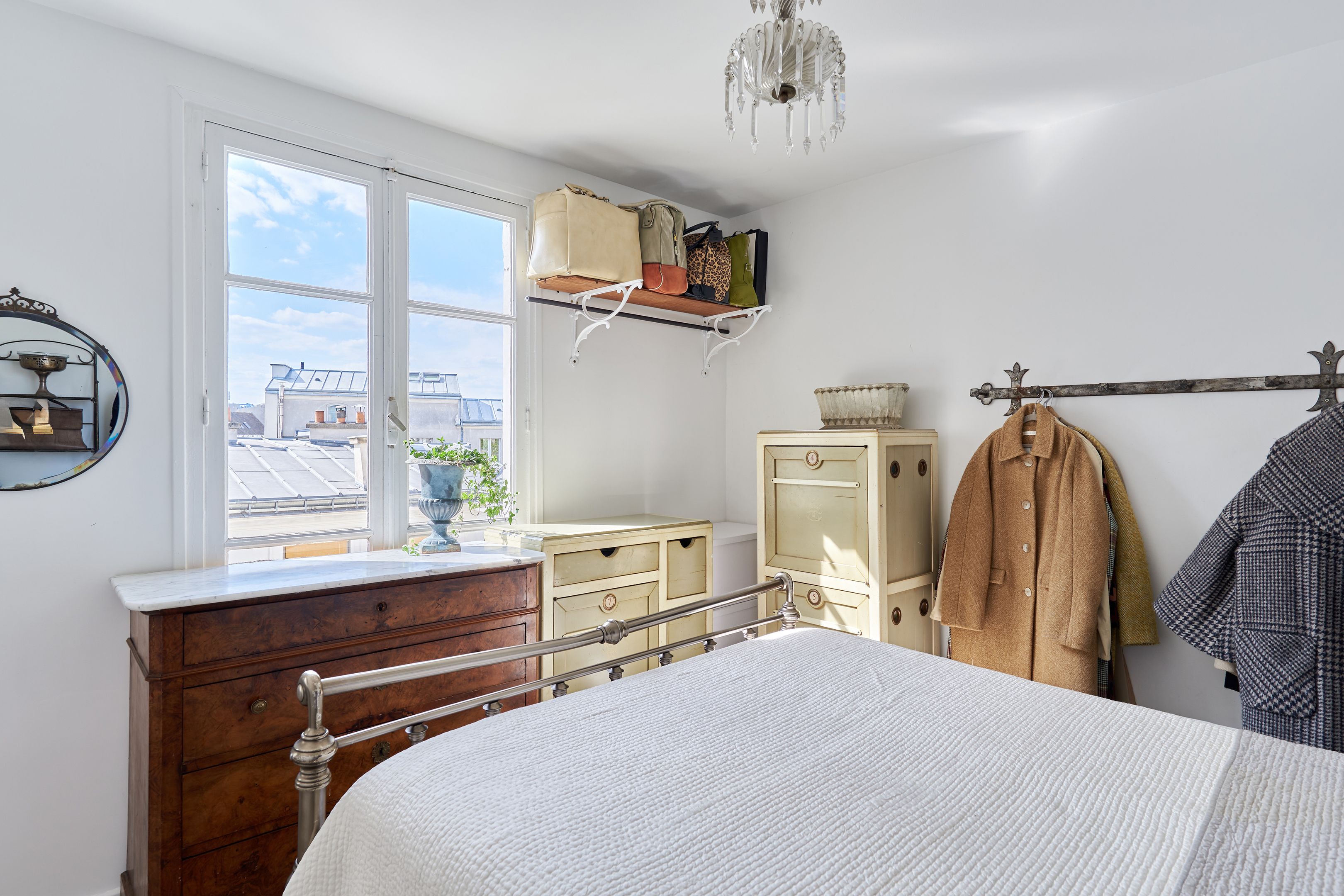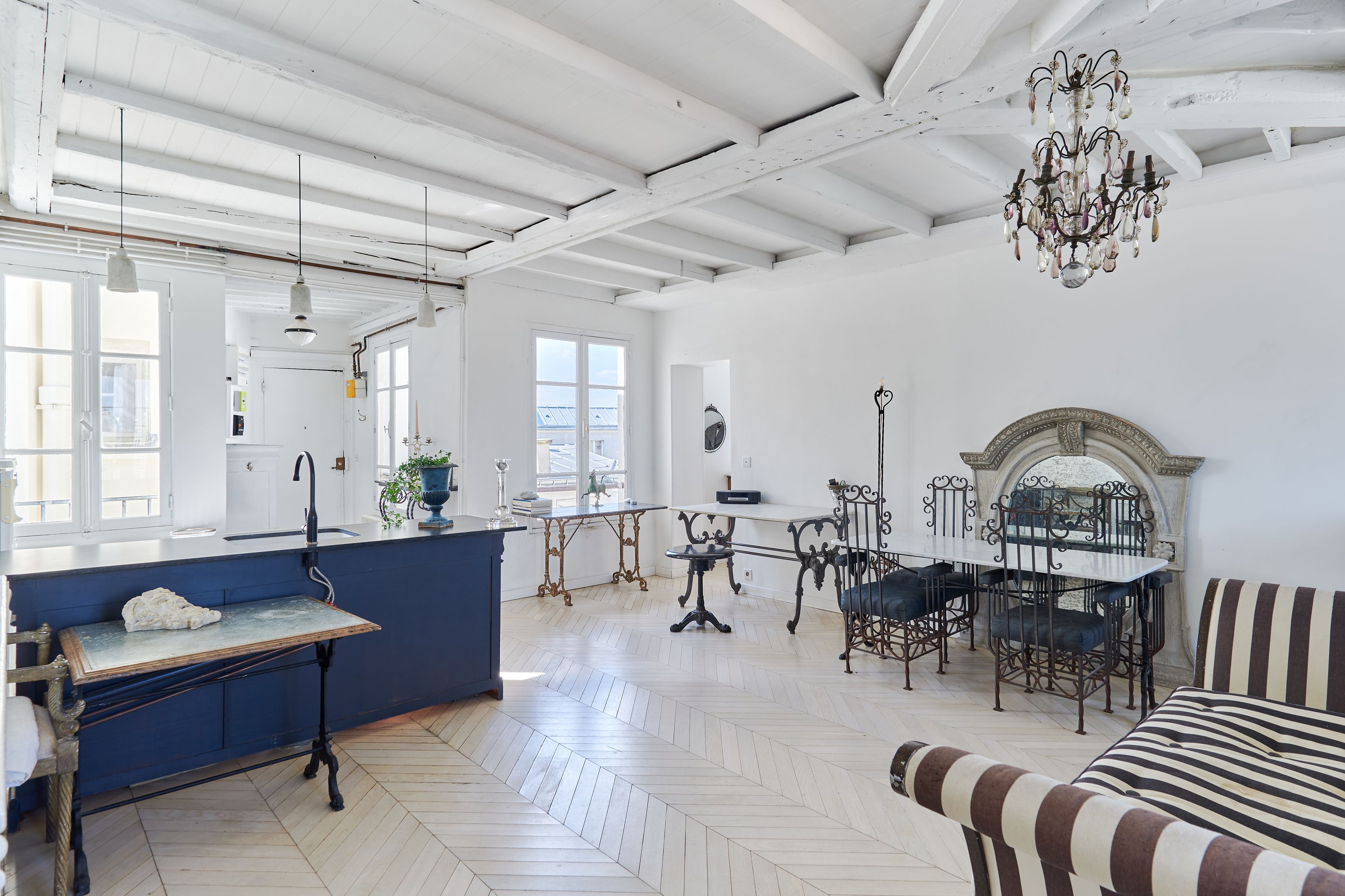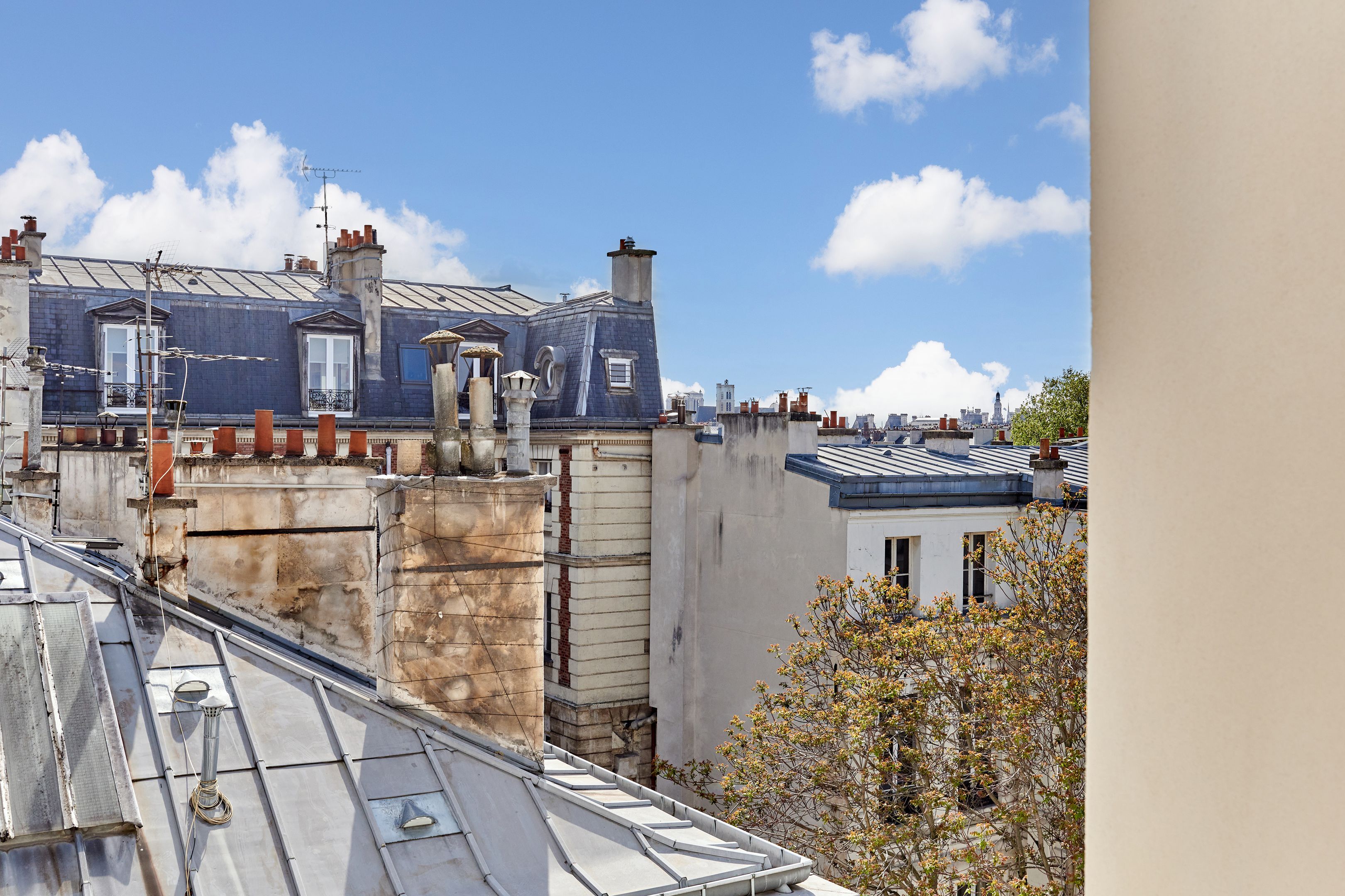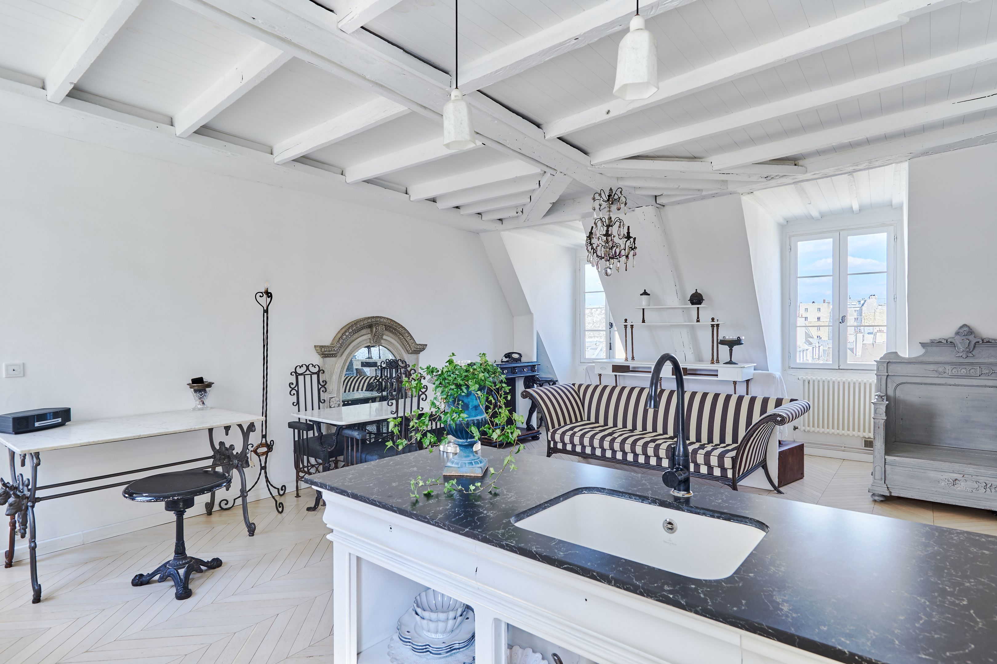 In a 19th-century building, on the 5th and top floor by staircase, through EAST/WEST apartment offering unobstructed views of Paris monuments from each of its 7 windows. Tastefully restored with noble materials, the property has preserved the charm of the Marais: herringbone parquet flooring, exposed beams. It comprises an entrance hall, a spacious living room with open-plan kitchen, a bedroom and a shower room with toilet. Cellar