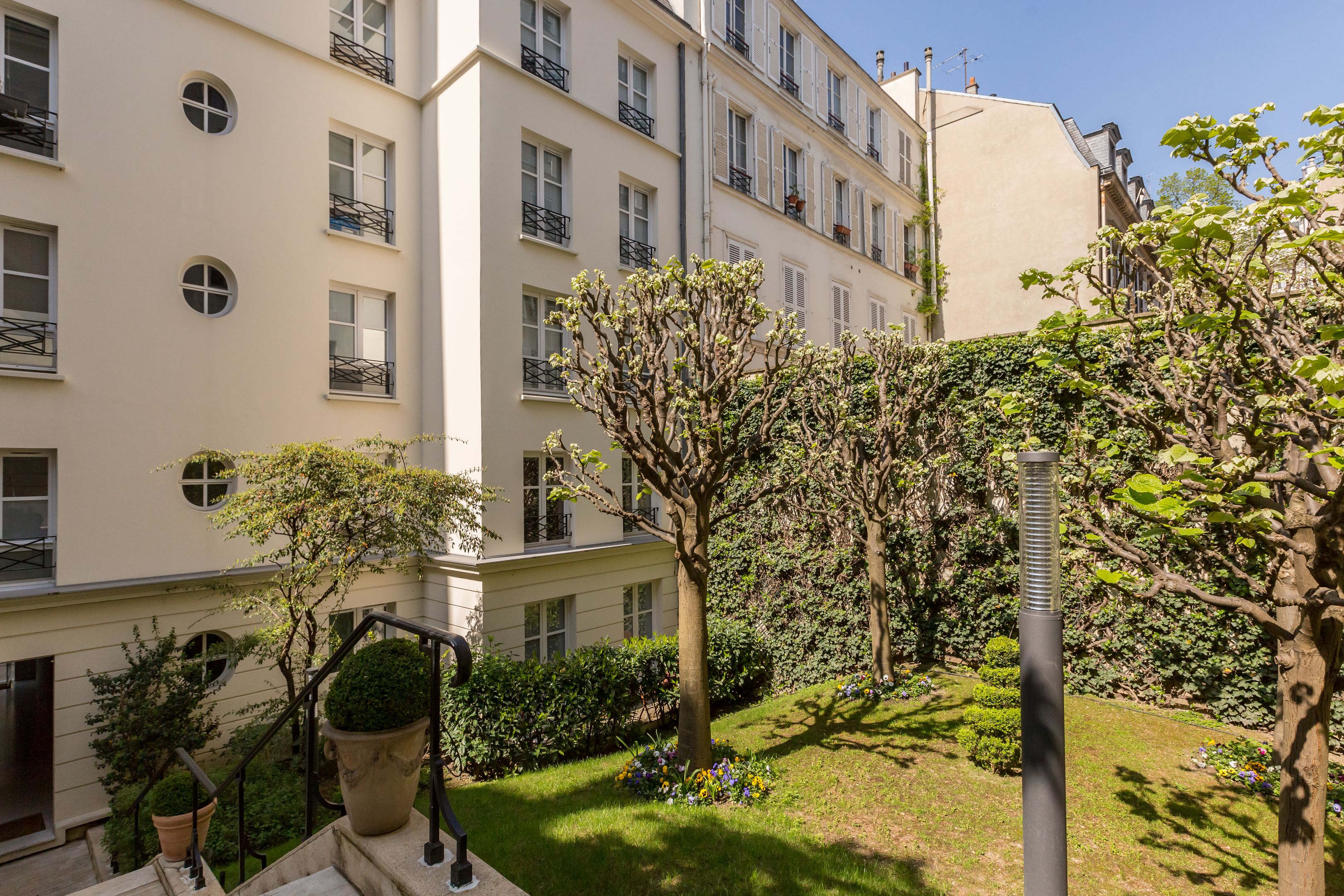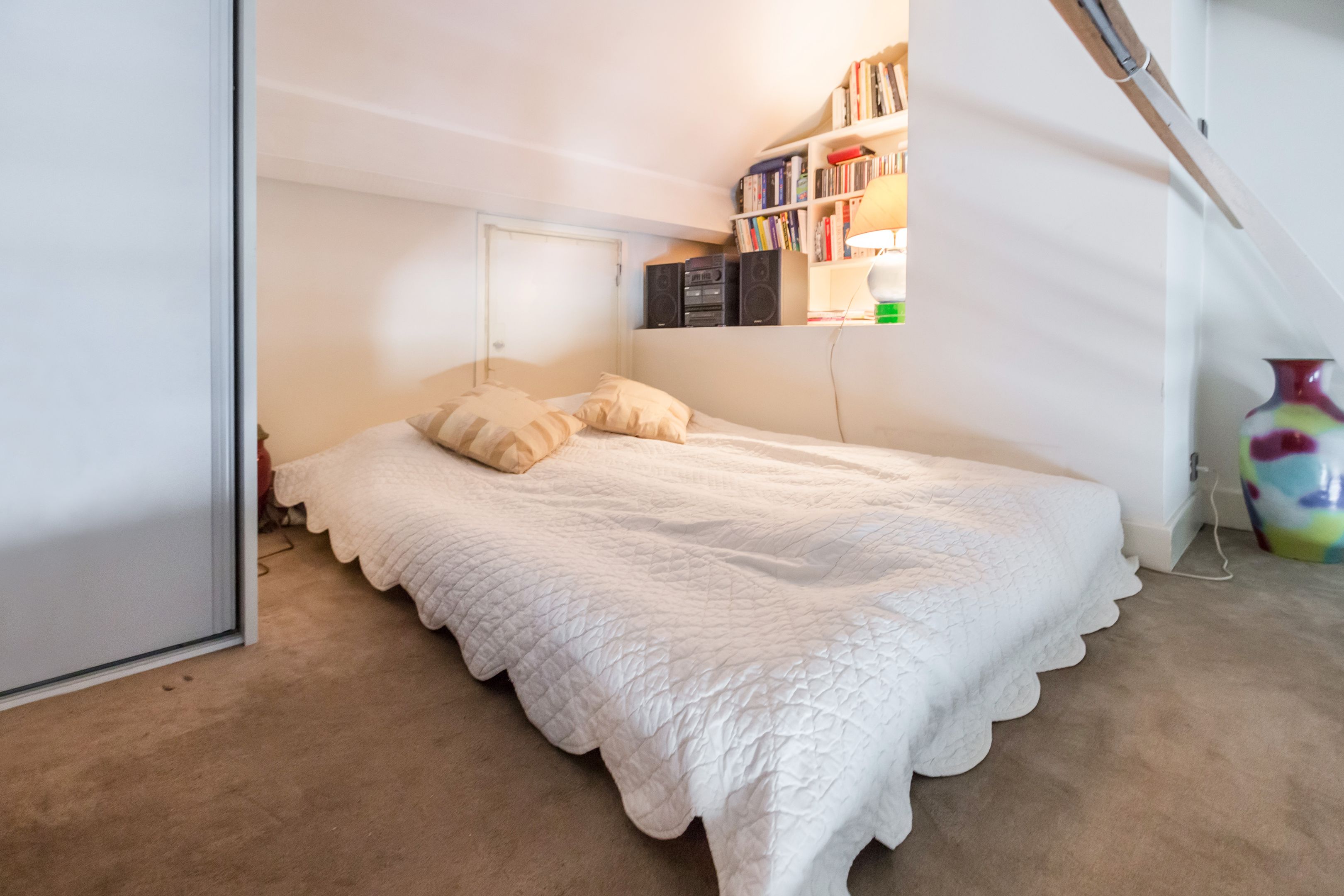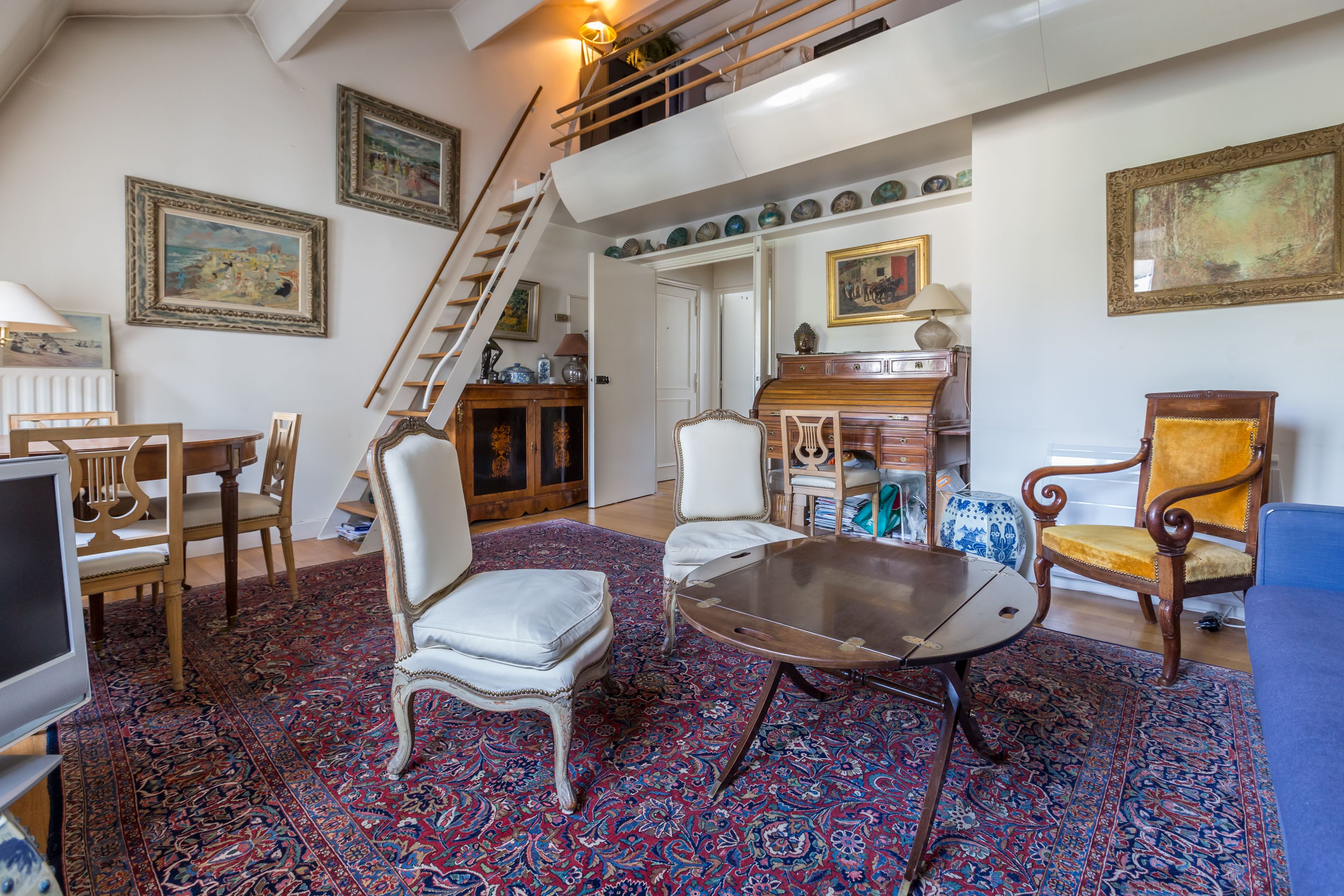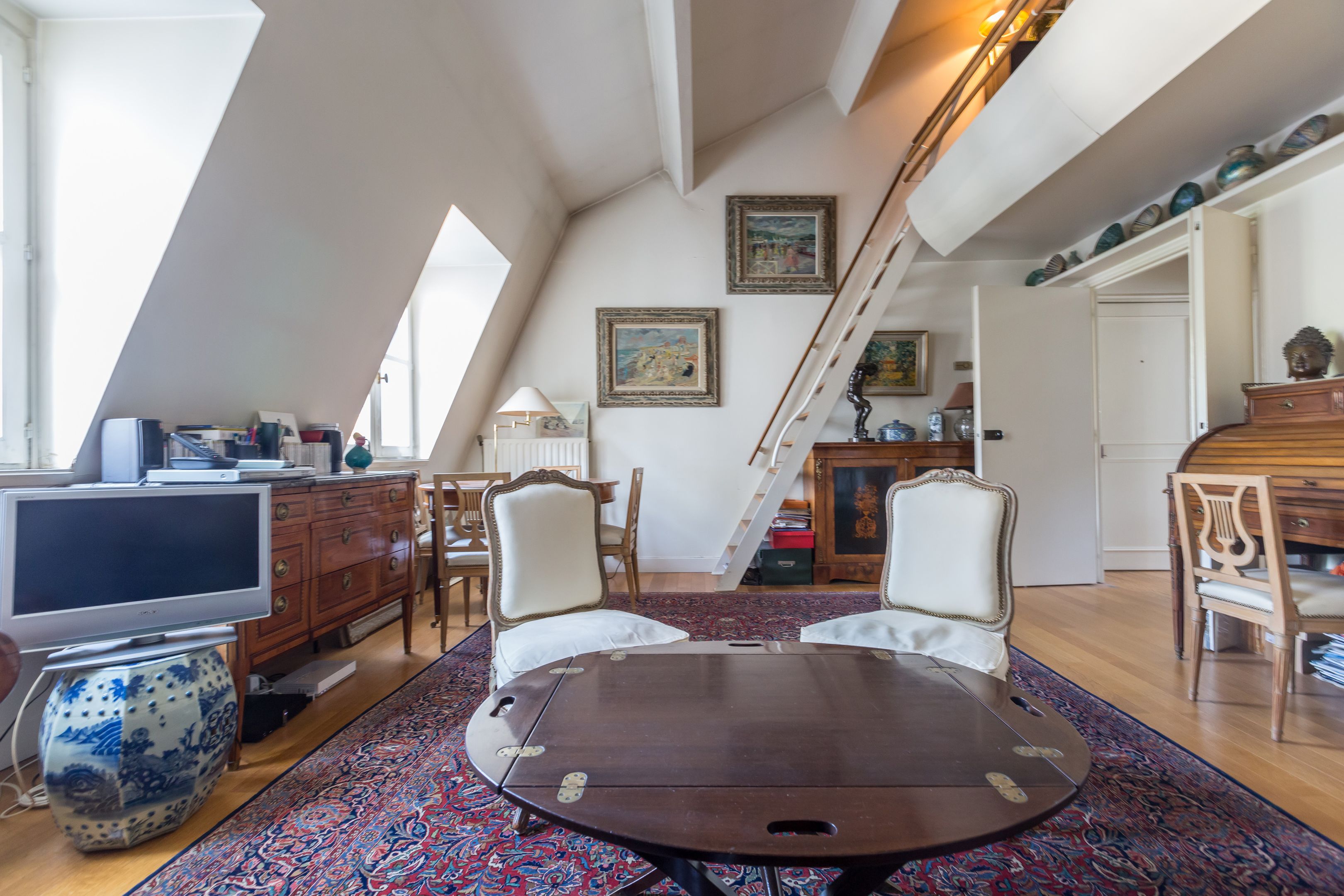At the foot of the Catherine-Labouré garden, in a perfectly maintained middle-class building, luxury 57.72 m² (41.71 m² Loi Carrez) apartment on the 5th and top floor, served by elevator, with views over the roofs of Paris, unoverlooked and enjoying absolute calm. Entrance hall, living room, mezzanine office, separate kitchen, bedroom, shower room, storage space, toilet. Cellar. Parking space in 1st basement in addition to sale price.