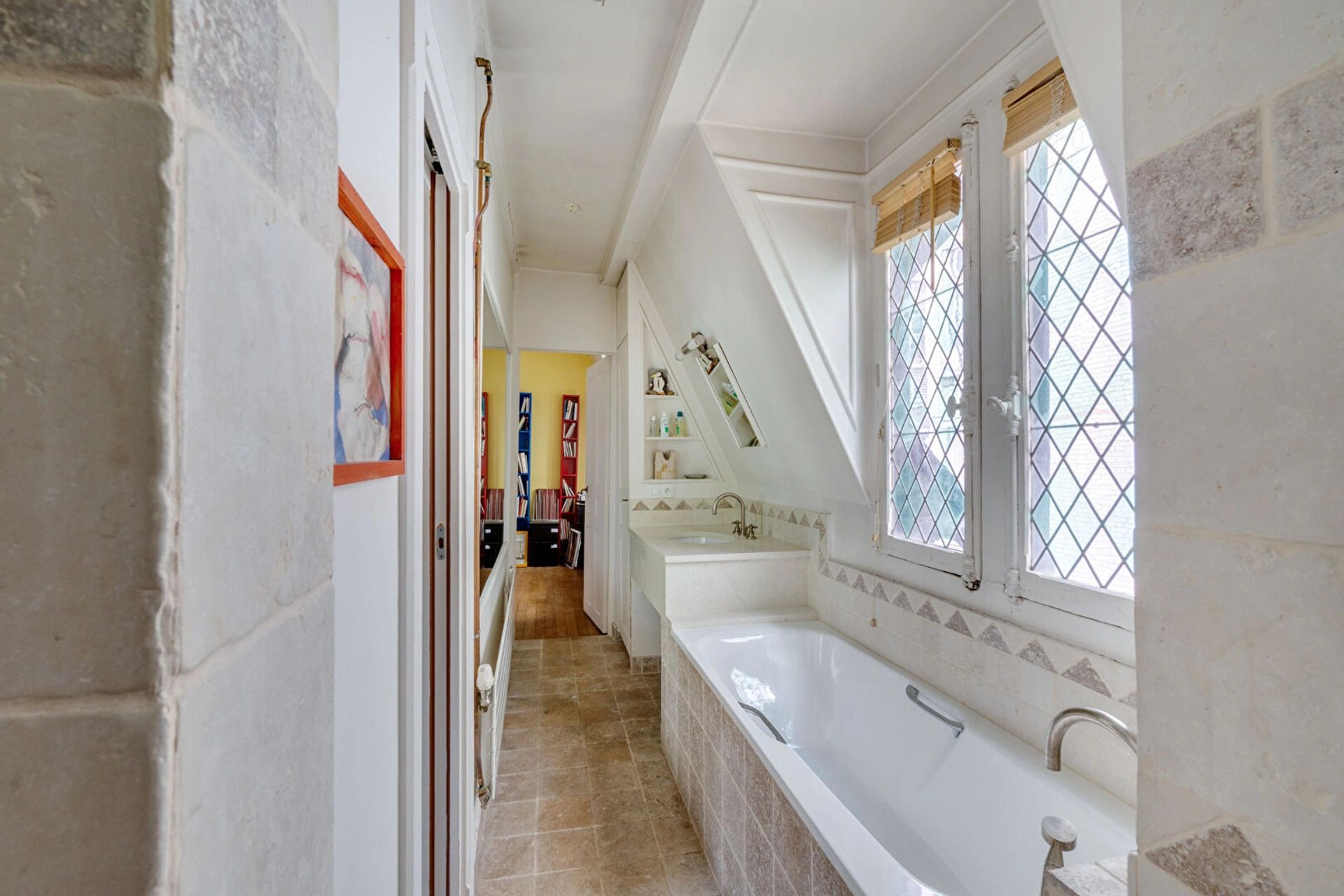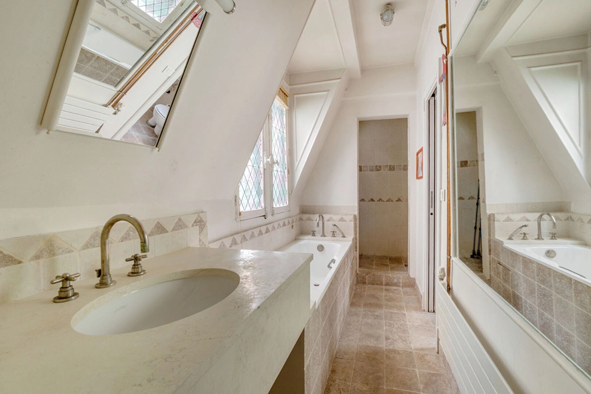 The first floor features a cathedral lounge with a glass roof bathed in light. Upstairs, the dining room overlooks the living room, semi-open kitchen with two velux windows, study (second bedroom possible), suite with dressing room and bathroom with walk-in shower and bath area, toilet. Cellar.