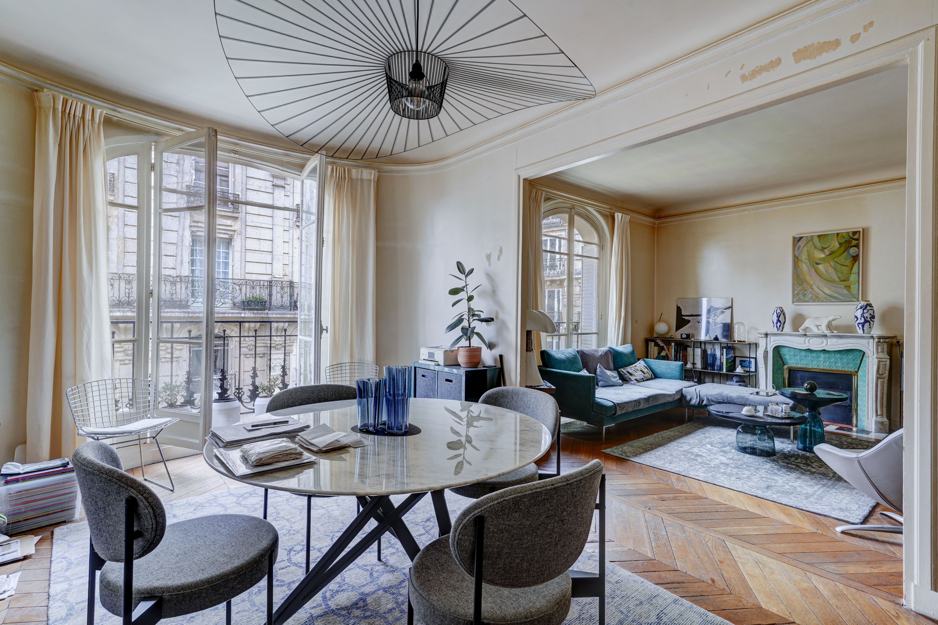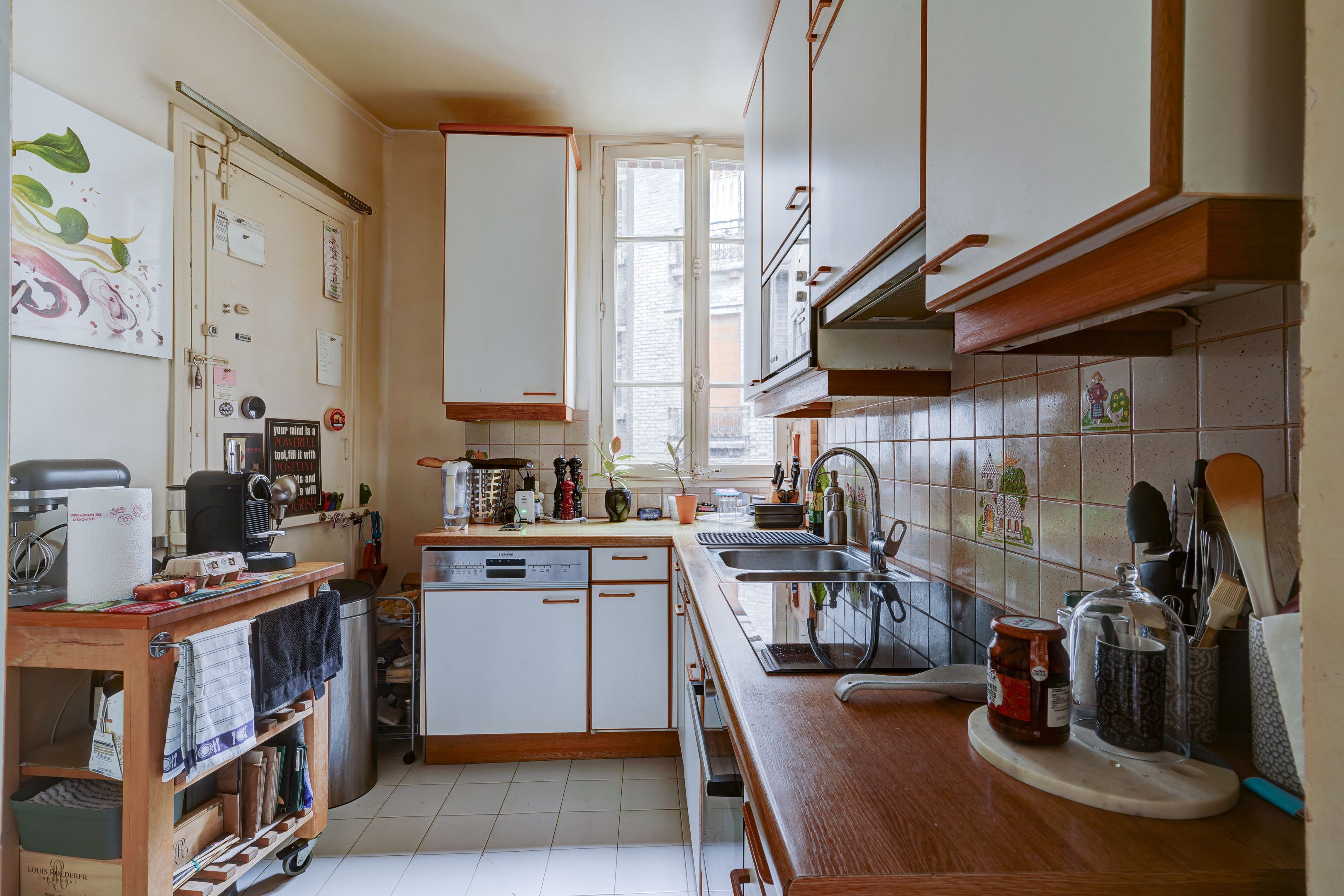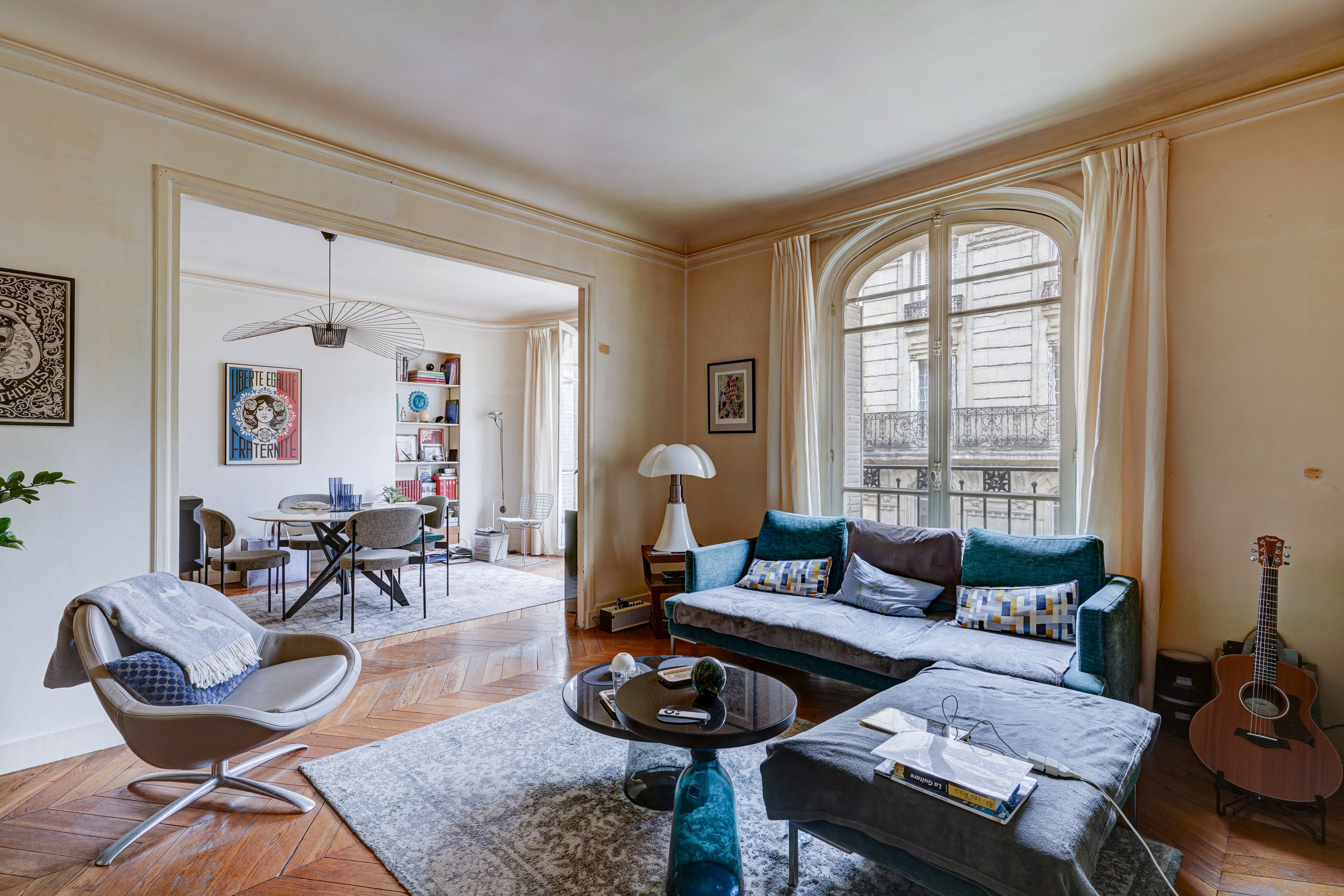 Lamarck district, on the fourth floor of a beautiful Haussmann building dating from 1900, served by elevator. Family apartment with 89.46 m² floor area (88.82 m² Loi Carrez) sold and rented. Entrance hall, double living room, separate kitchen, two bedrooms, dressing room, bathroom, separate toilet. Parquet flooring, moldings and functional fireplace. Possibility of acquiring a spare 10.17 m² utility room. Cellar.