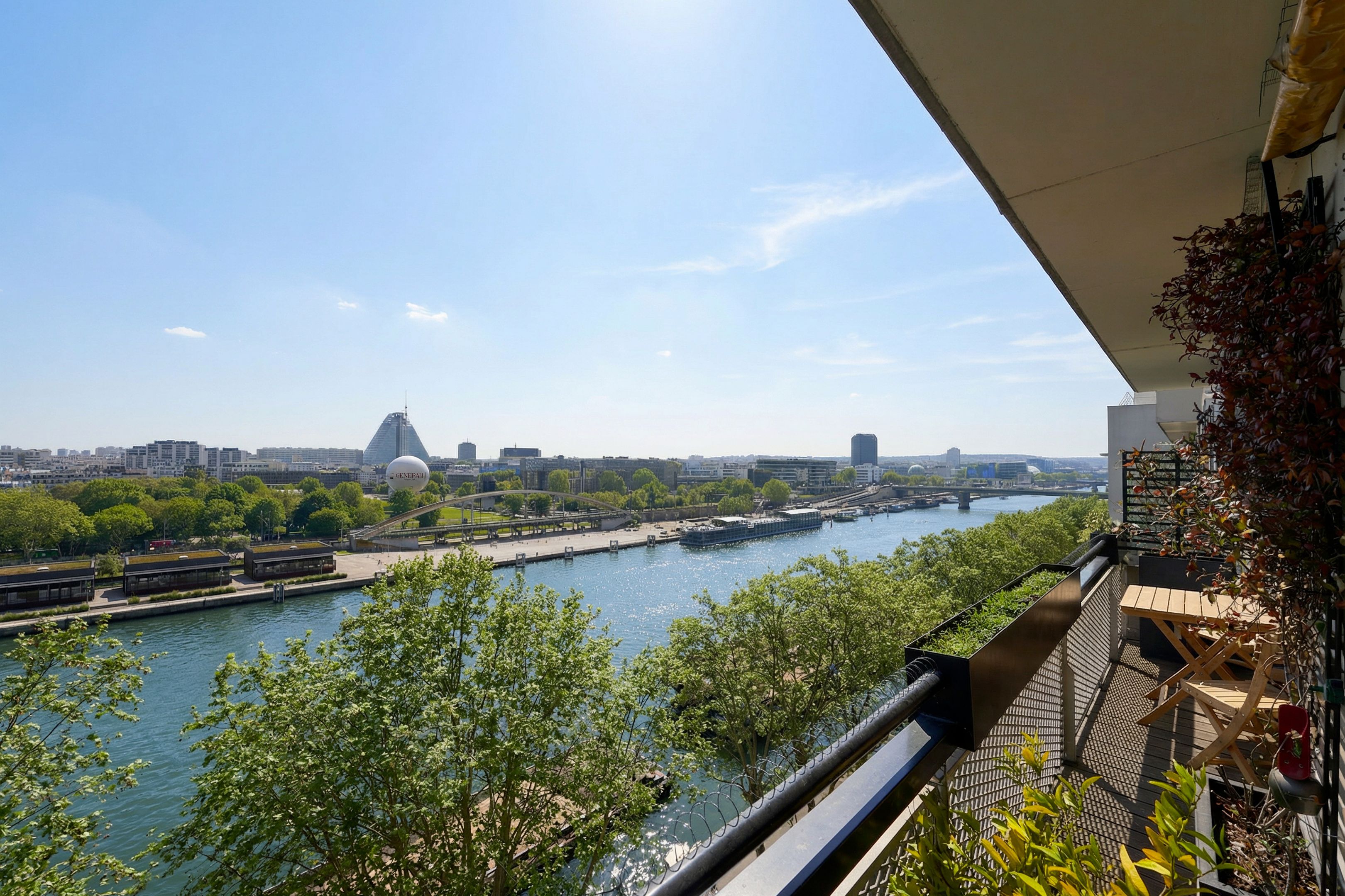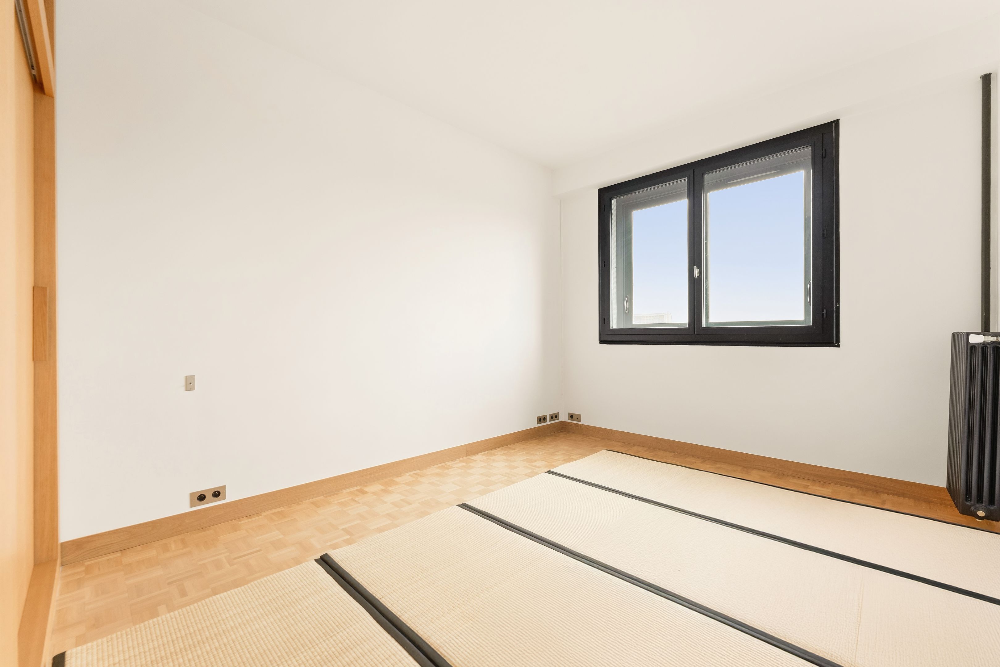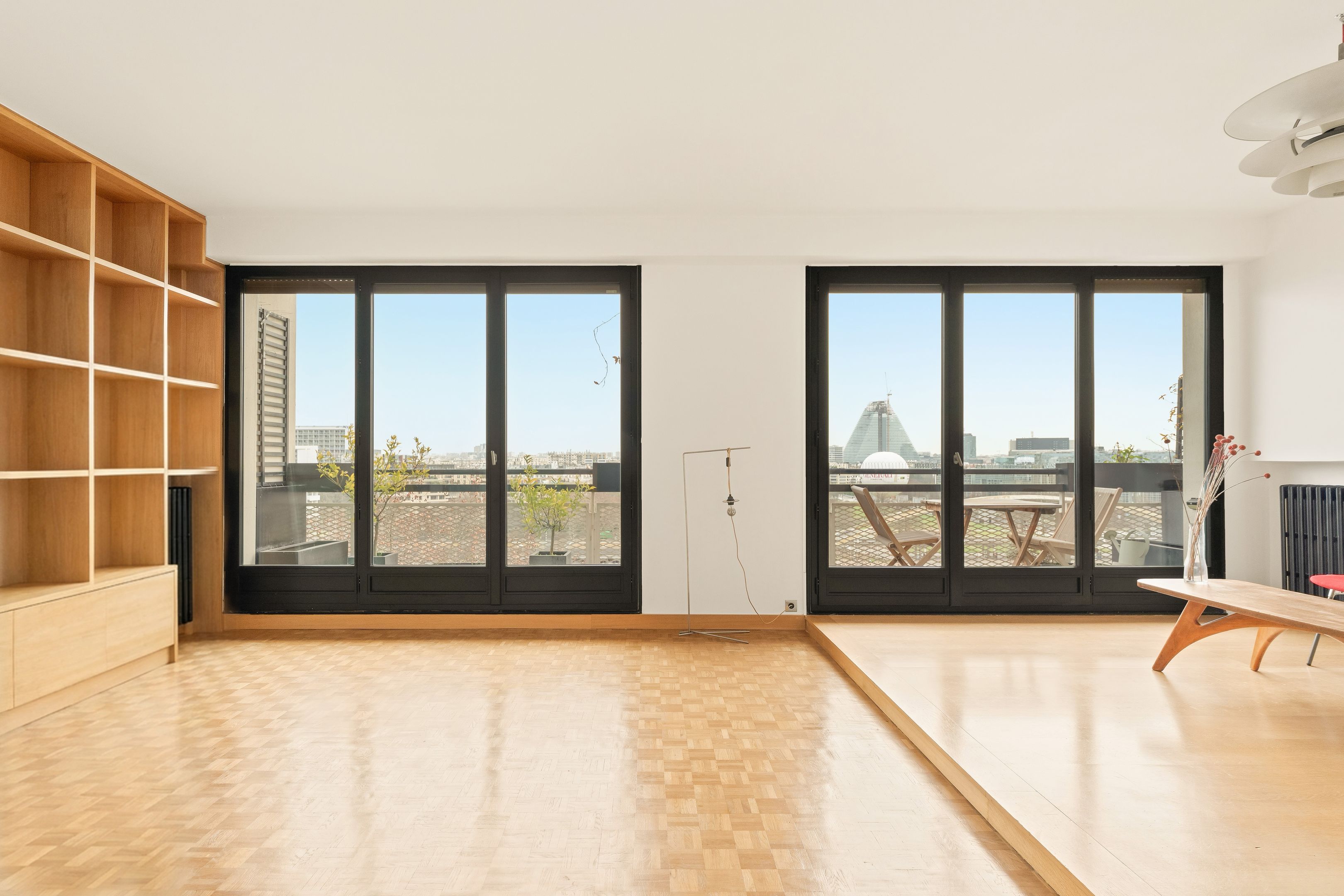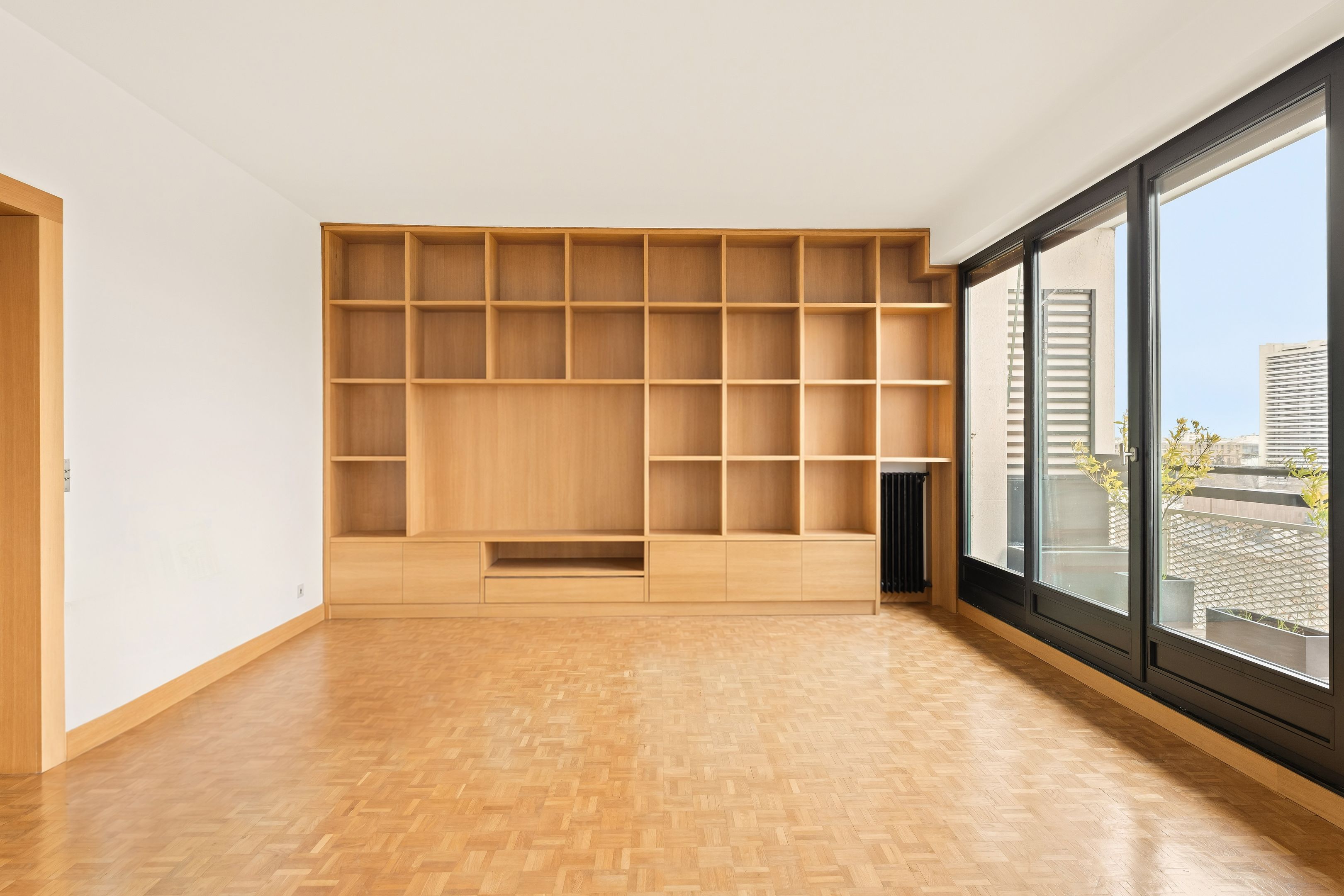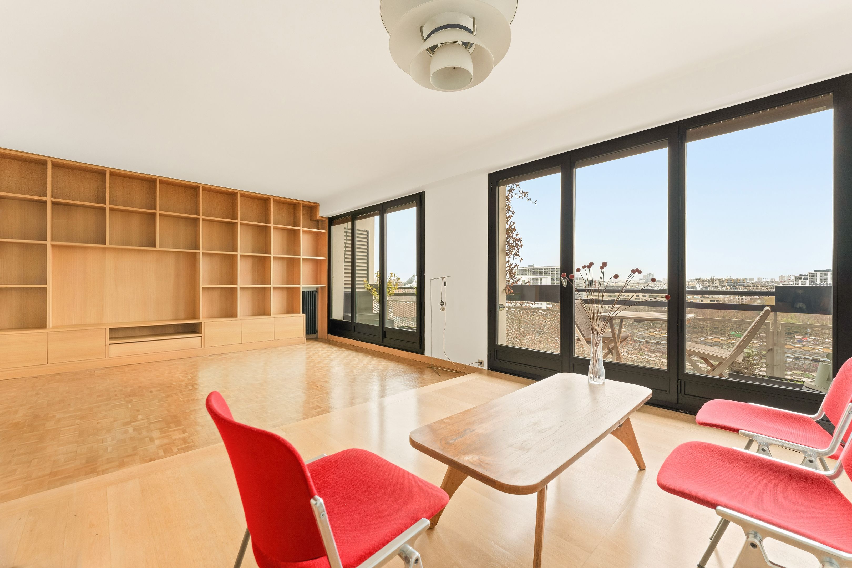 In a prestigious semi-recent building dating from 1953, a few steps from all amenities and renowned schools, beautiful 94 m² through-apartment on the 8th floor with elevator. A large entrance gallery leads to a bright, south-east-facing double living room opening onto a balcony with views over the Seine and Paris, a separate, fully-equipped kitchen, plenty of custom-made storage space, a corridor with storage space leading to two symmetrical bedrooms, a shower room with toilet and a bathroom also with toilet. The property has been renovated in a mid-century style, with a strong presence of varnished wood and quality materials. Cellar and parking space outside.