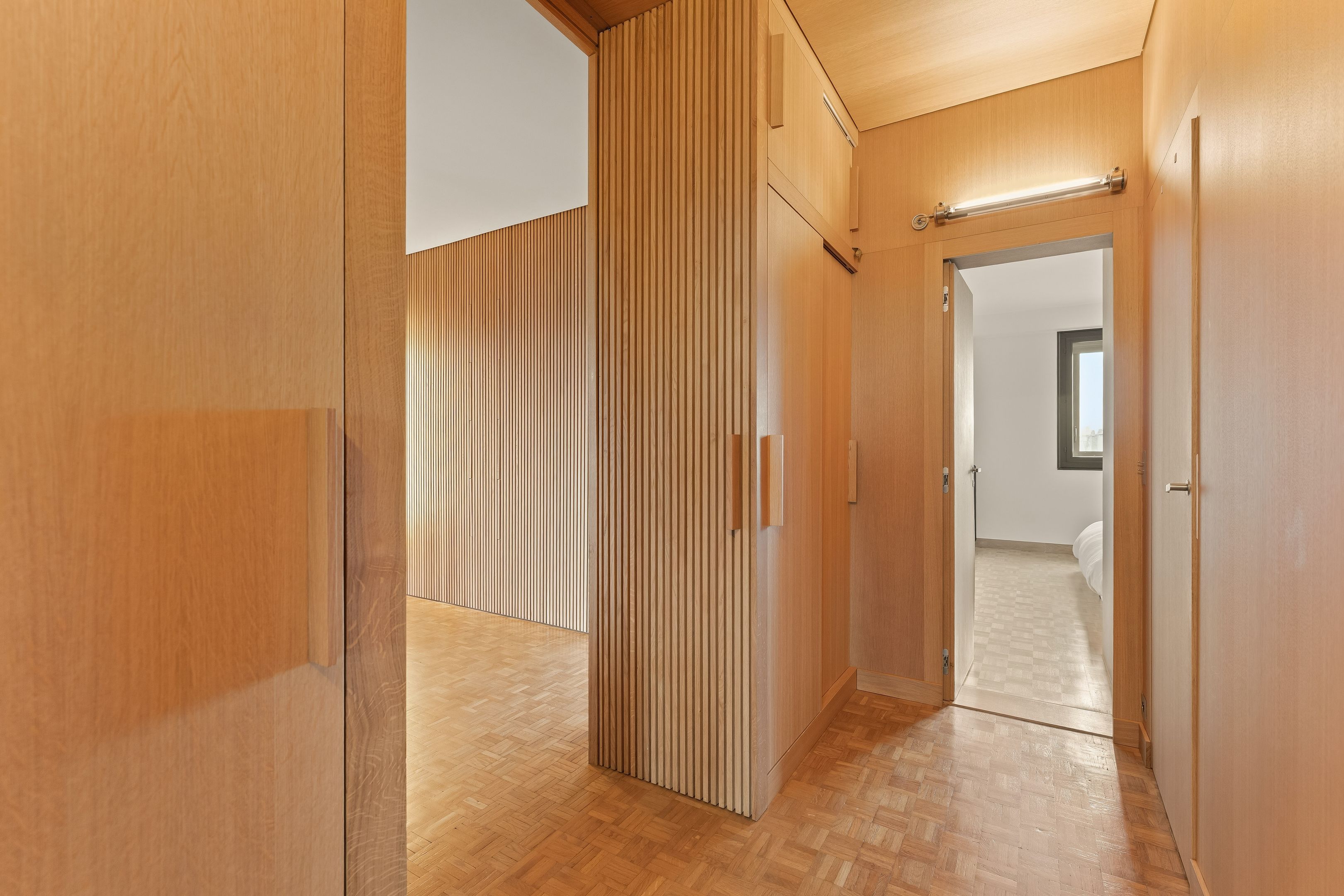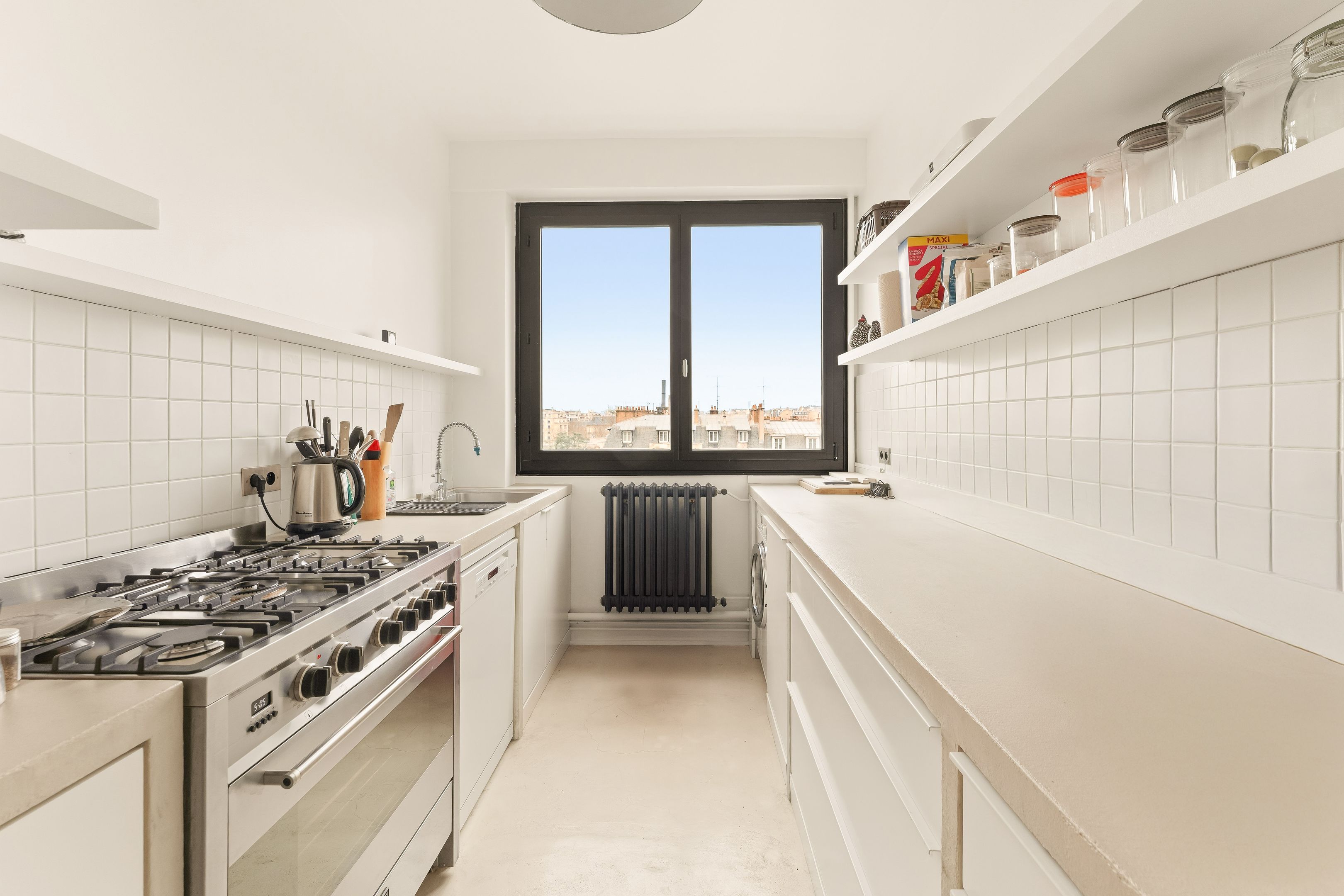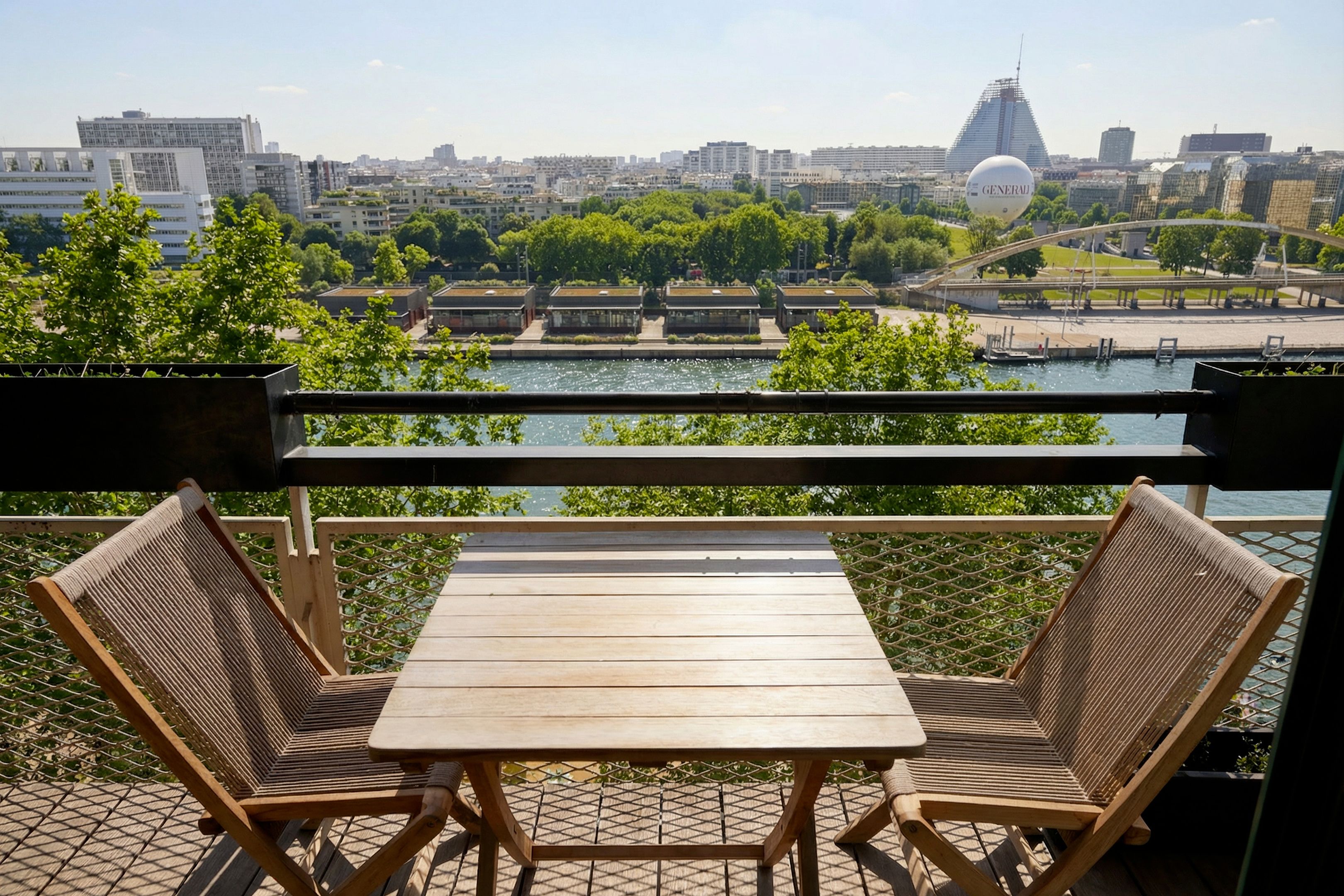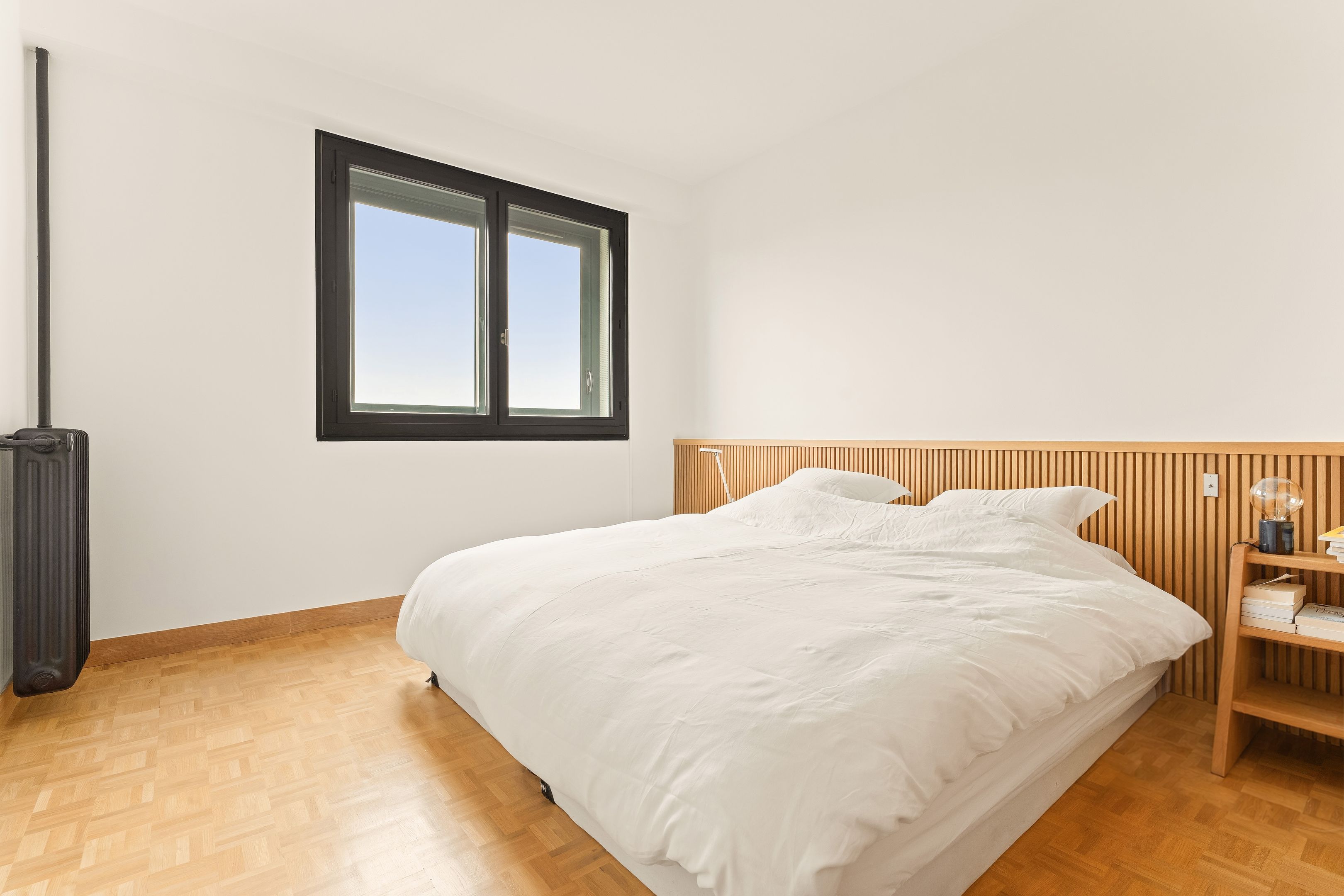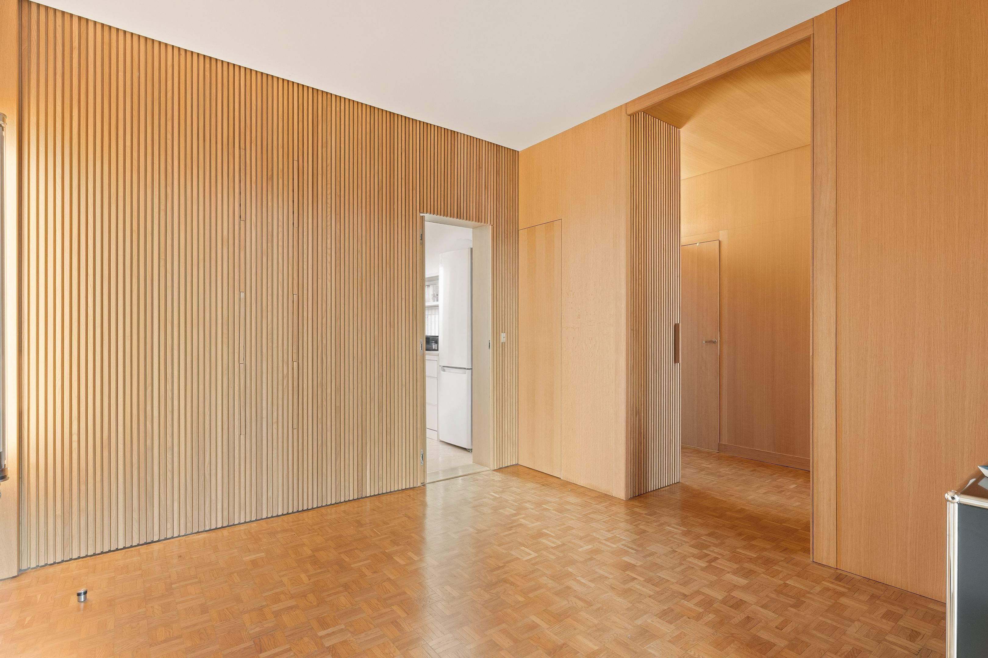 In a prestigious semi-recent building dating from 1953, a few steps from all amenities and renowned schools, beautiful 94 m² through-apartment on the 8th floor with elevator. A large entrance gallery leads to a bright, south-east-facing double living room opening onto a balcony with views over the Seine and Paris, a separate, fully-equipped kitchen, plenty of custom-made storage space, a corridor with storage space leading to two symmetrical bedrooms, a shower room with toilet and a bathroom also with toilet. The property has been renovated in a mid-century style, with a strong presence of varnished wood and quality materials. Cellar and parking space outside.