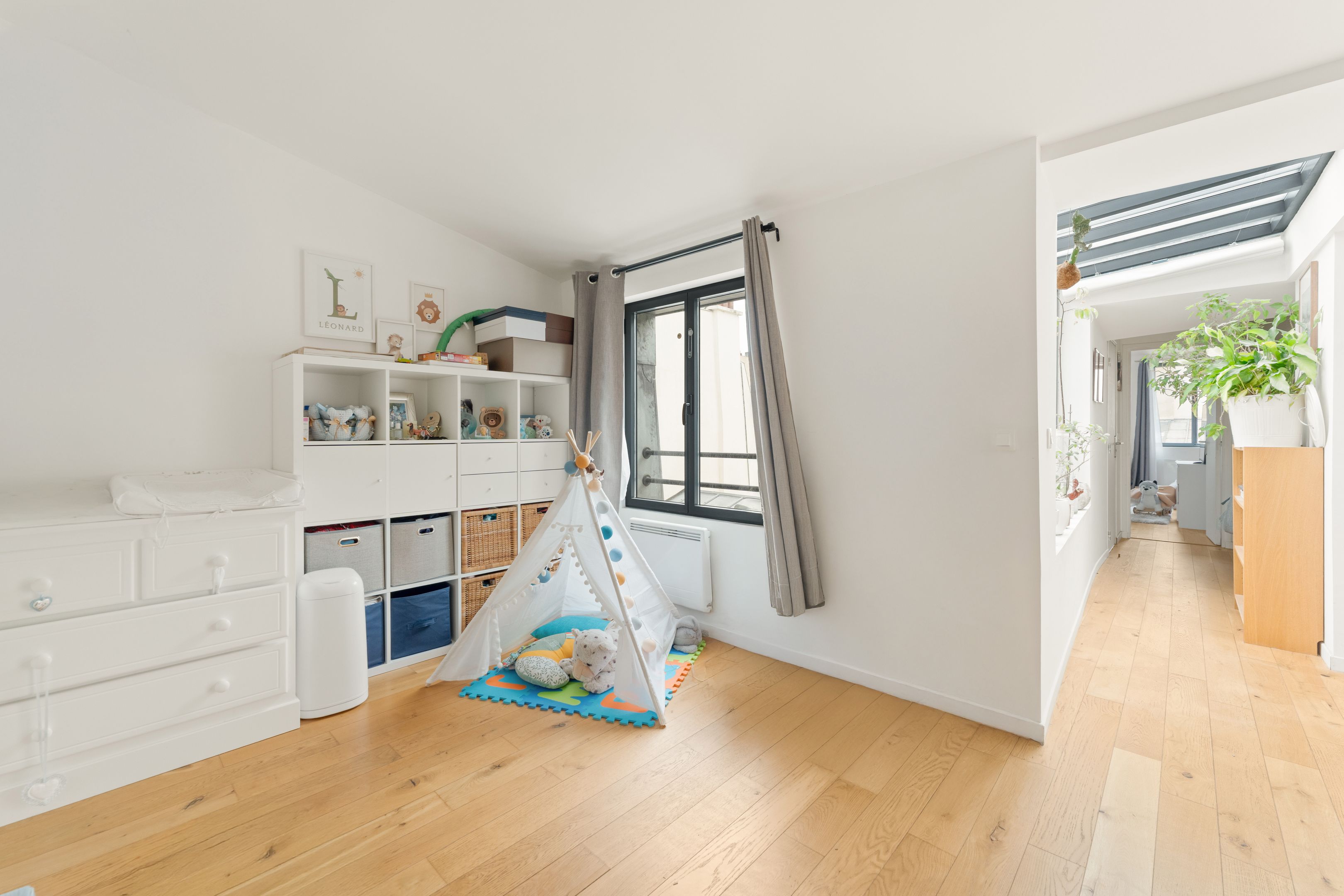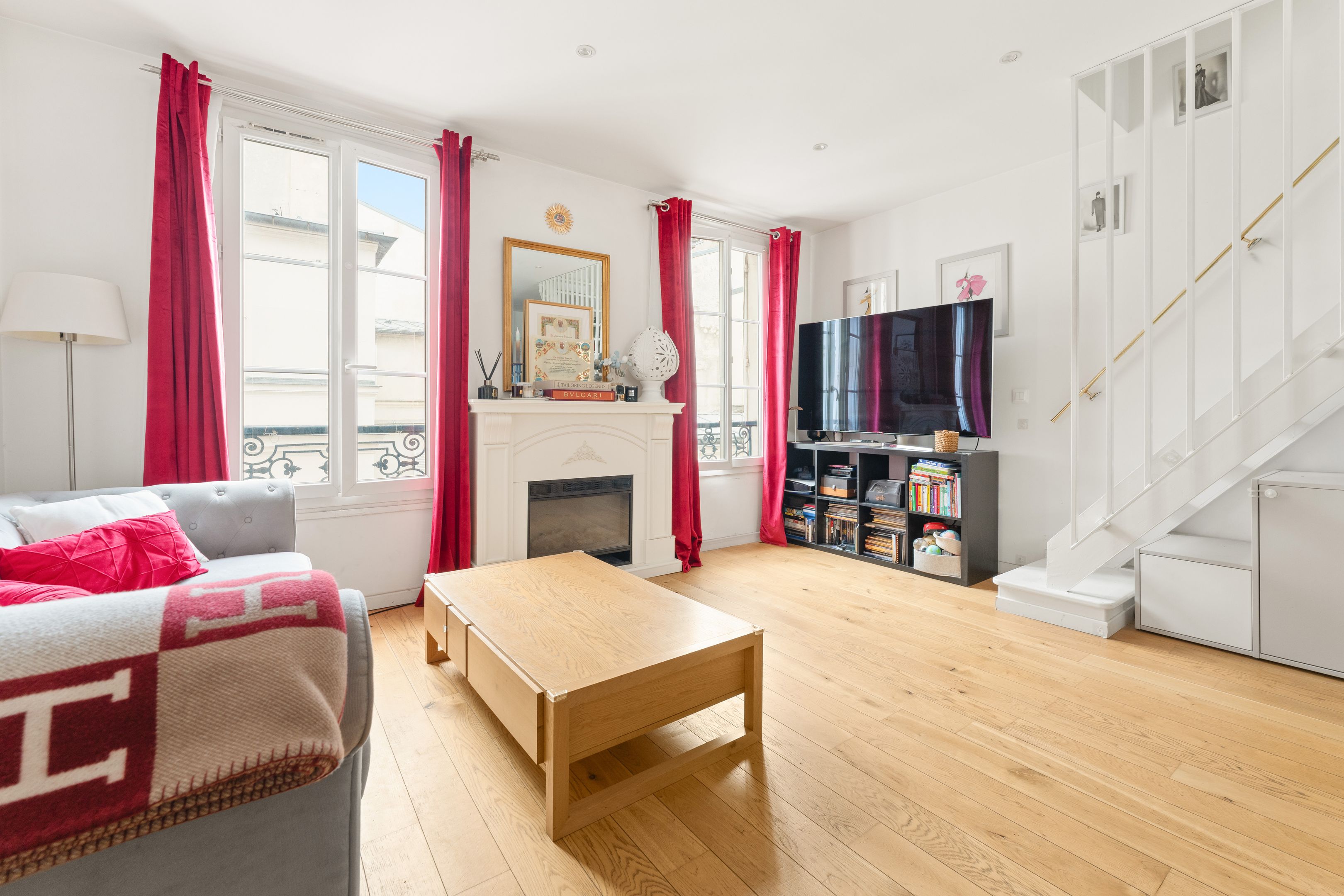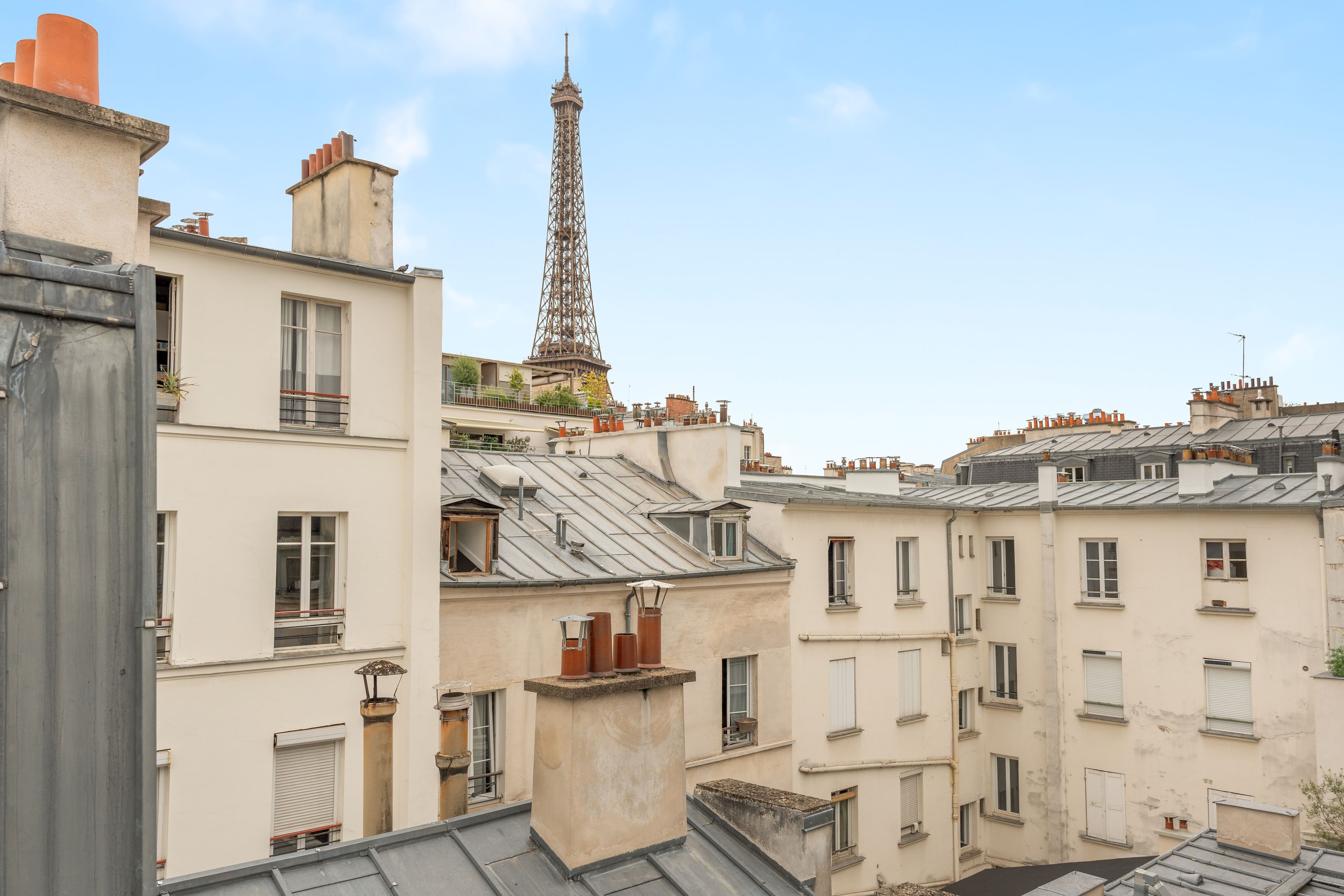 In the heart of the Gros Caillou district, in a perfectly quiet, old building with well-kept communal areas, duplex apartment, like a "house on the roofs", on the 3rd and last floor served by a staircase, in perfect condition, with excellent fittings, particularly bright and with an excellent floor plan. Second floor: entrance hall, large living room with open-plan kitchen. Second level: 2 good-sized bedrooms with remarkable volumes, bathroom with toilet, space under glass roof overlooking the Eiffel Tower. Cellar.