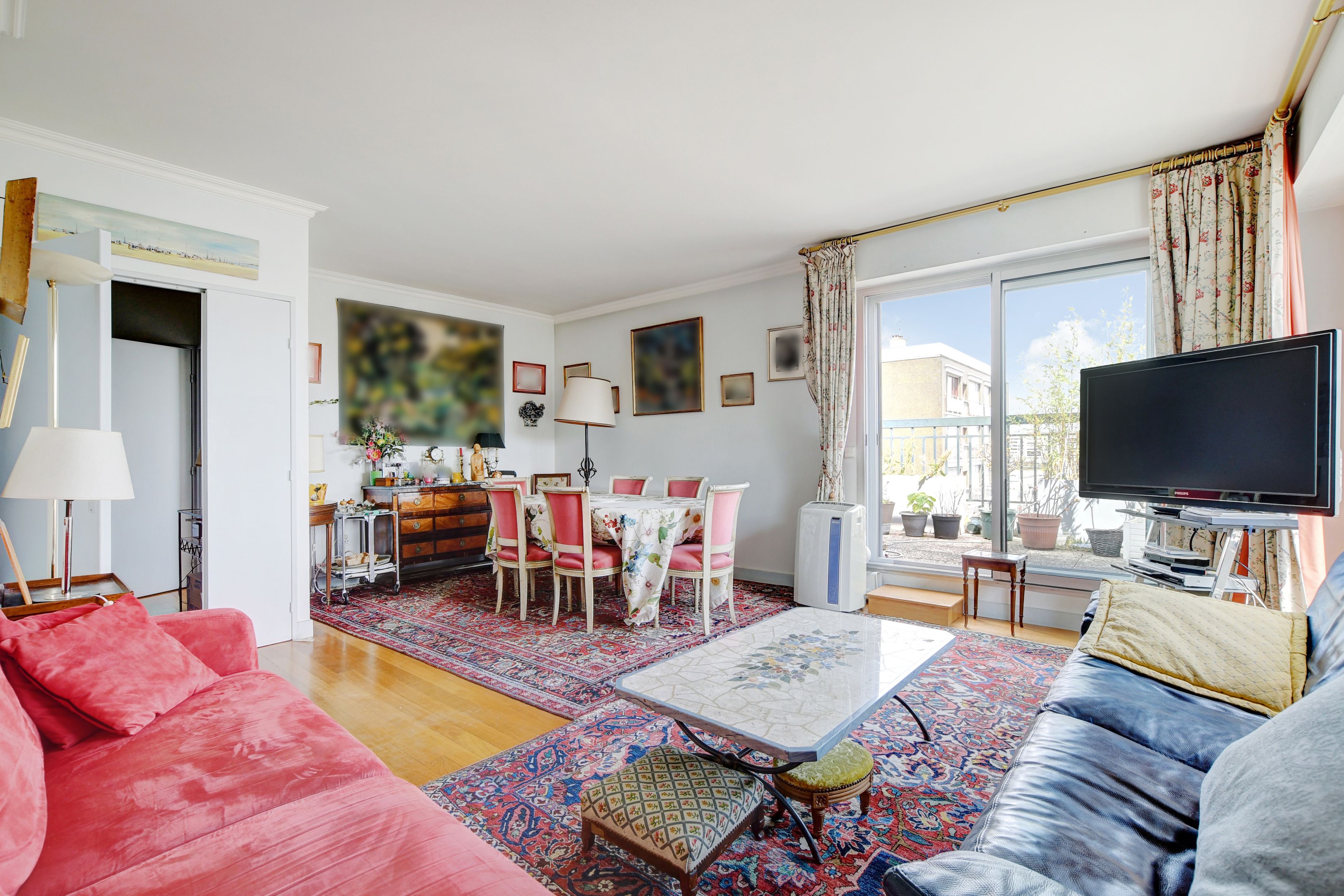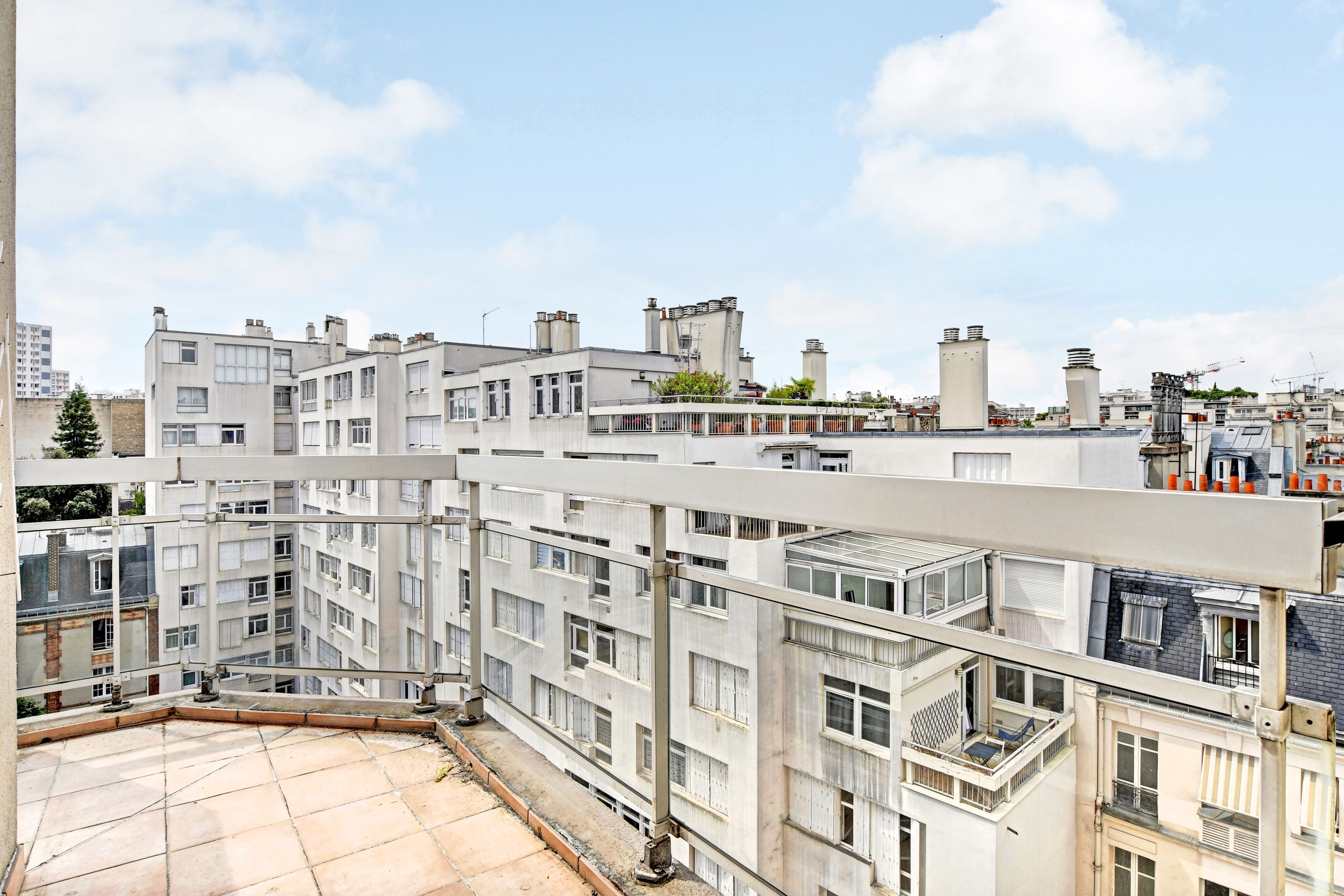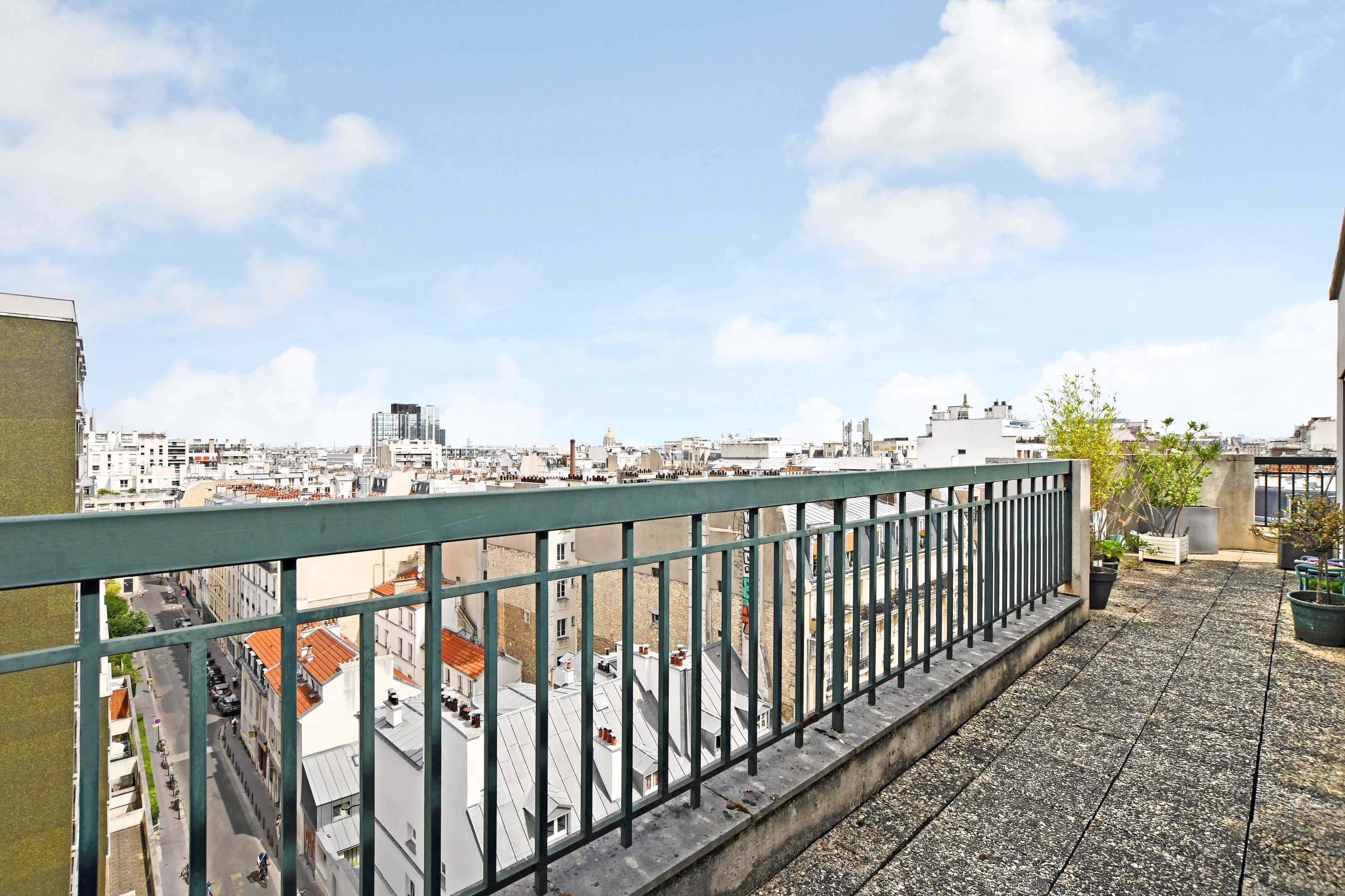 In a secure service residence (Hespérides), M° Volontaires, beautiful apartment on the 9th and top floor, with a 19m² terrace, a 4m² balcony and a panoramic view of Paris and its monuments. Entrance hall, sizeable corner living room, separate kitchen, 2 bedrooms (one on the street and opening onto the terrace, the other on the garden and opening onto the balcony), shower room, separate toilet, laundry room and storage space. Optional double boxed parking space (+40,000€).