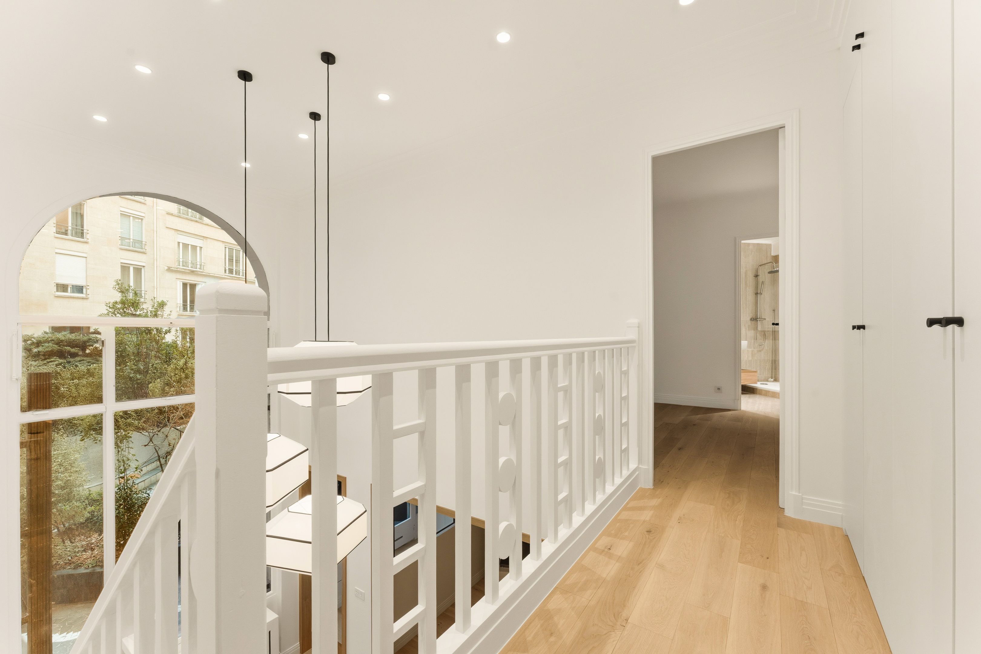 Mairie du XVIème. In a private lane in a sought-after, guarded condominium, bright, renovated 88 m² Carrez artist's studio. In a beautiful, quiet building dating from the 1930s, on the first floor overlooking greenery, it features an entrance hall, a southwest-facing double living room with cathedral ceilings (5.70 m high), a kitchen, a toilet and, upstairs, a bedroom and a full bathroom. Plenty of storage space. The apartment has been carefully and elegantly renovated. Storage room. Self-employed.
