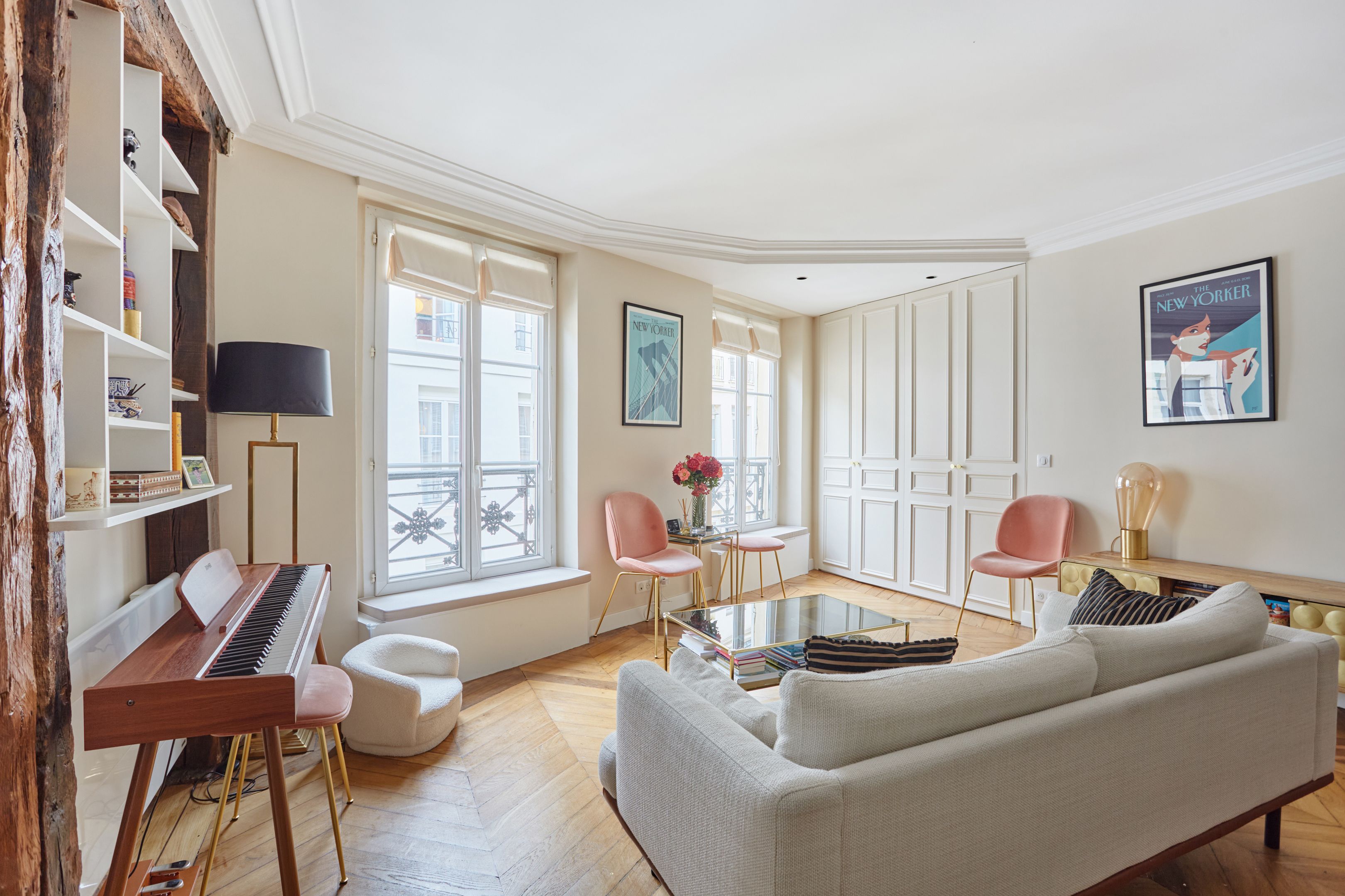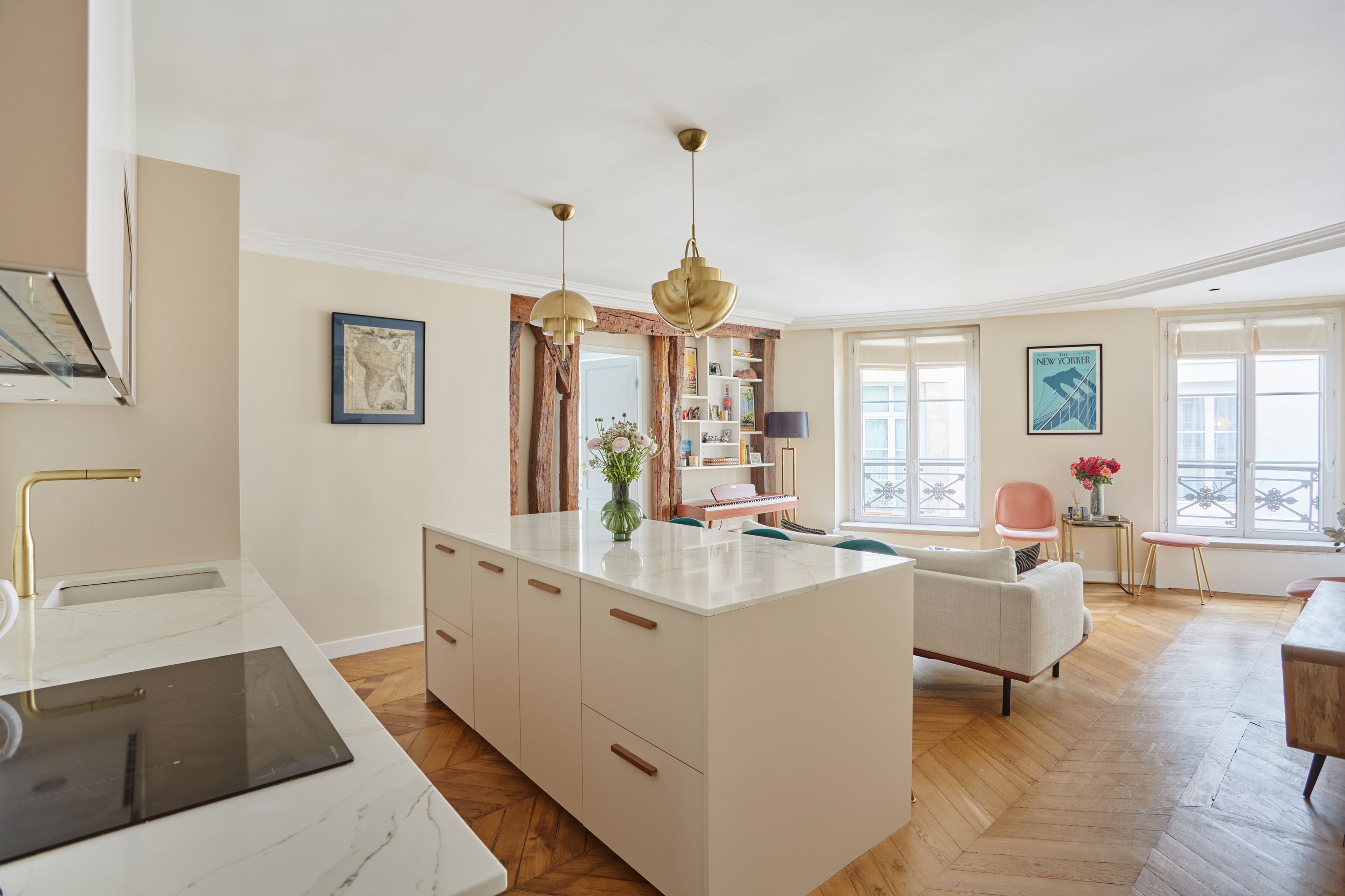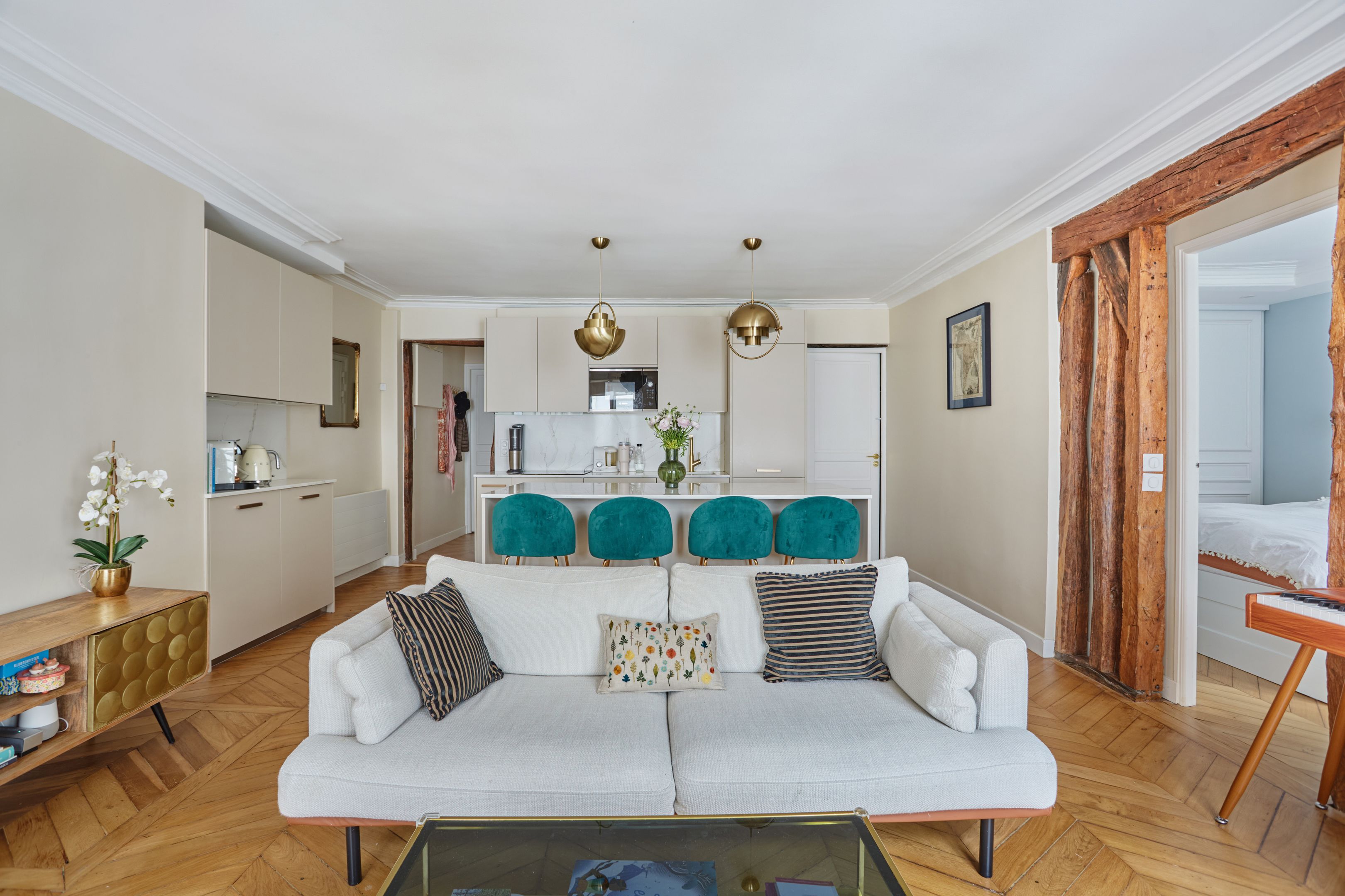 In the Monnaie district, in a beautiful, secure, early 18th-century building, bright and quiet 65 m² apartment, refurbished, on the 3rd floor with access by staircase, retaining the charm of the past (herringbone parquet flooring and exposed beams) and benefiting from an optimal layout. Entrance hall, large living room with open-plan fitted and equipped kitchen, master bedroom with storage space, children's bedroom opening onto courtyard, large shower room, separate toilet. Cellar.