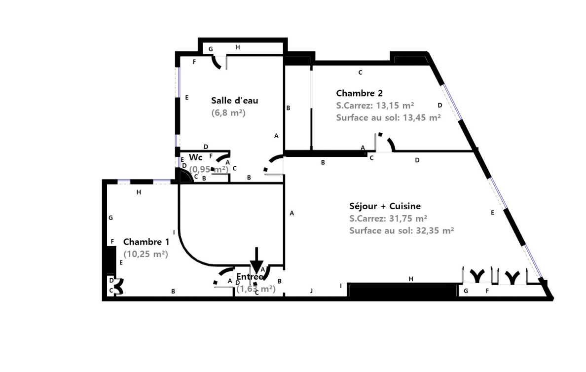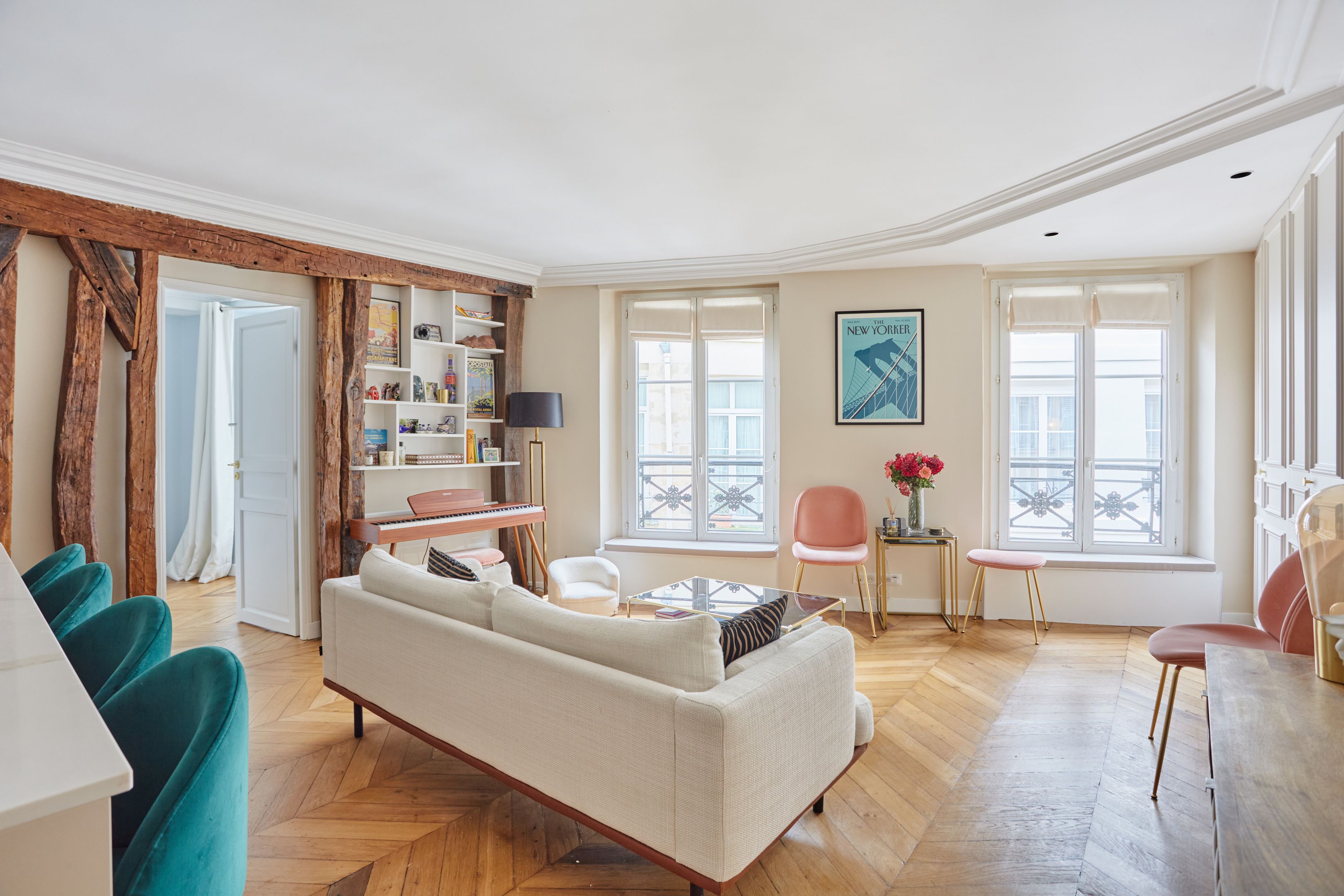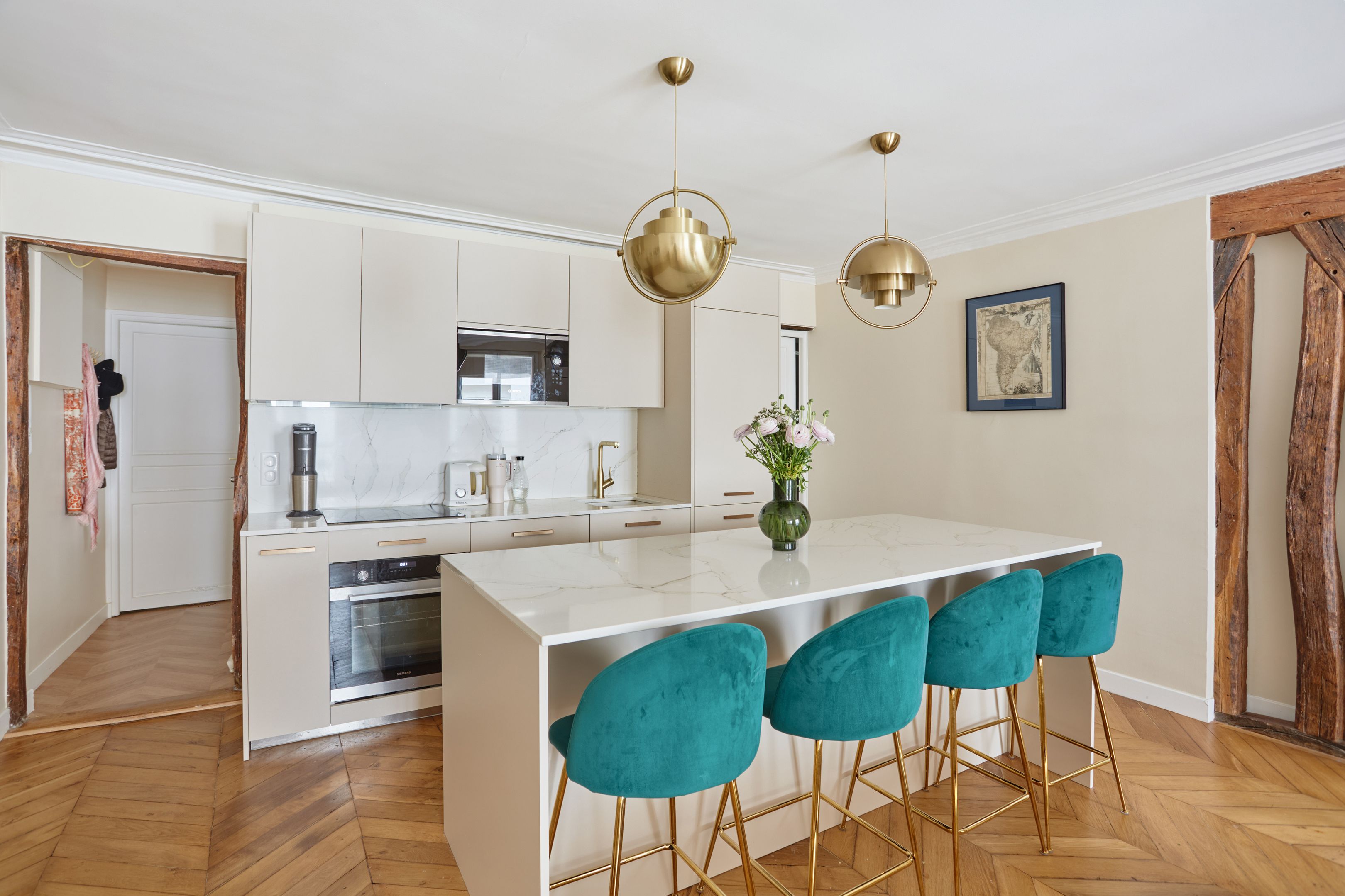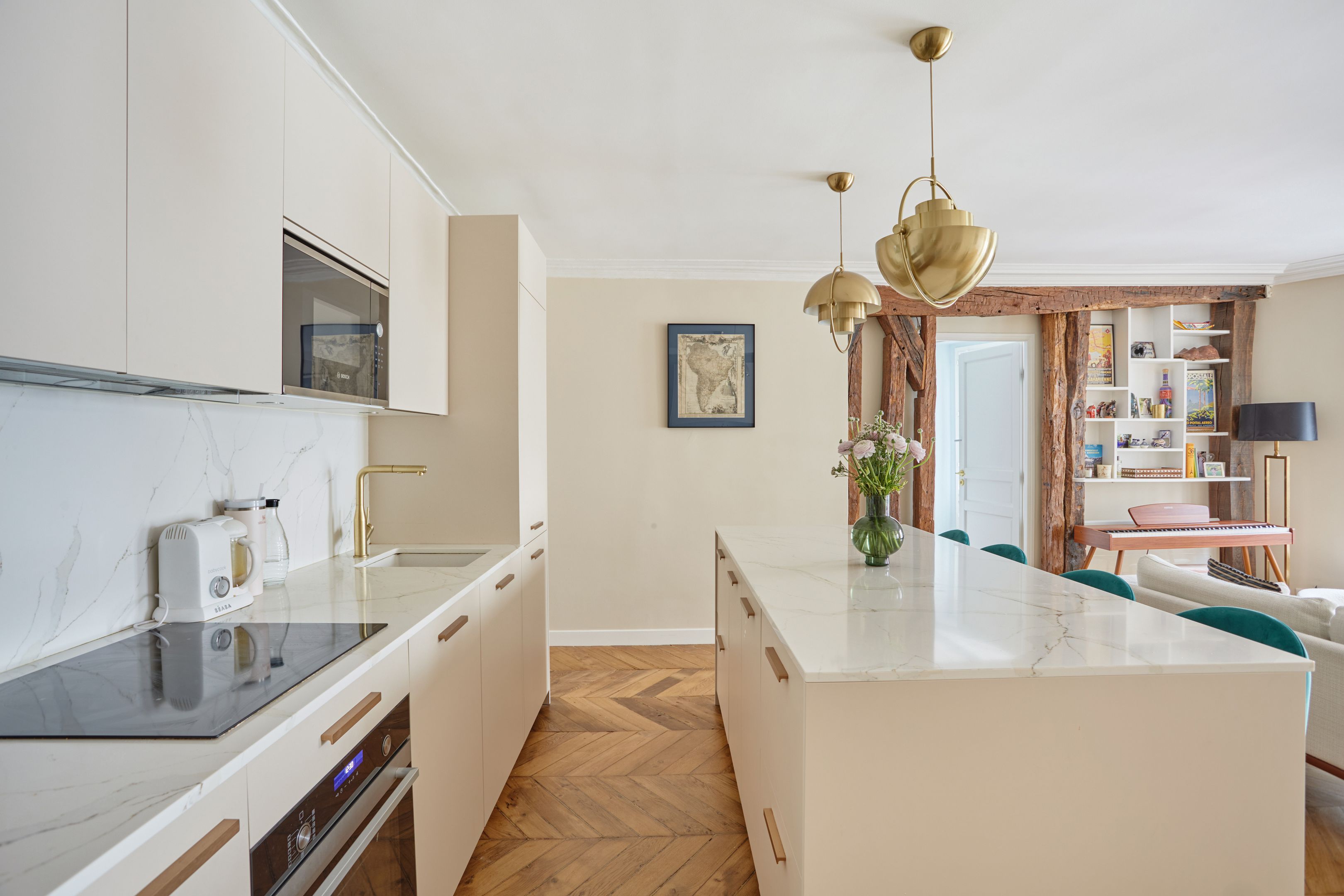 In the Monnaie district, in a beautiful, secure, early 18th-century building, bright and quiet 65 m² apartment, refurbished, on the 3rd floor with access by staircase, retaining the charm of the past (herringbone parquet flooring and exposed beams) and benefiting from an optimal layout. Entrance hall, large living room with open-plan fitted and equipped kitchen, master bedroom with storage space, children's bedroom opening onto courtyard, large shower room, separate toilet. Cellar.