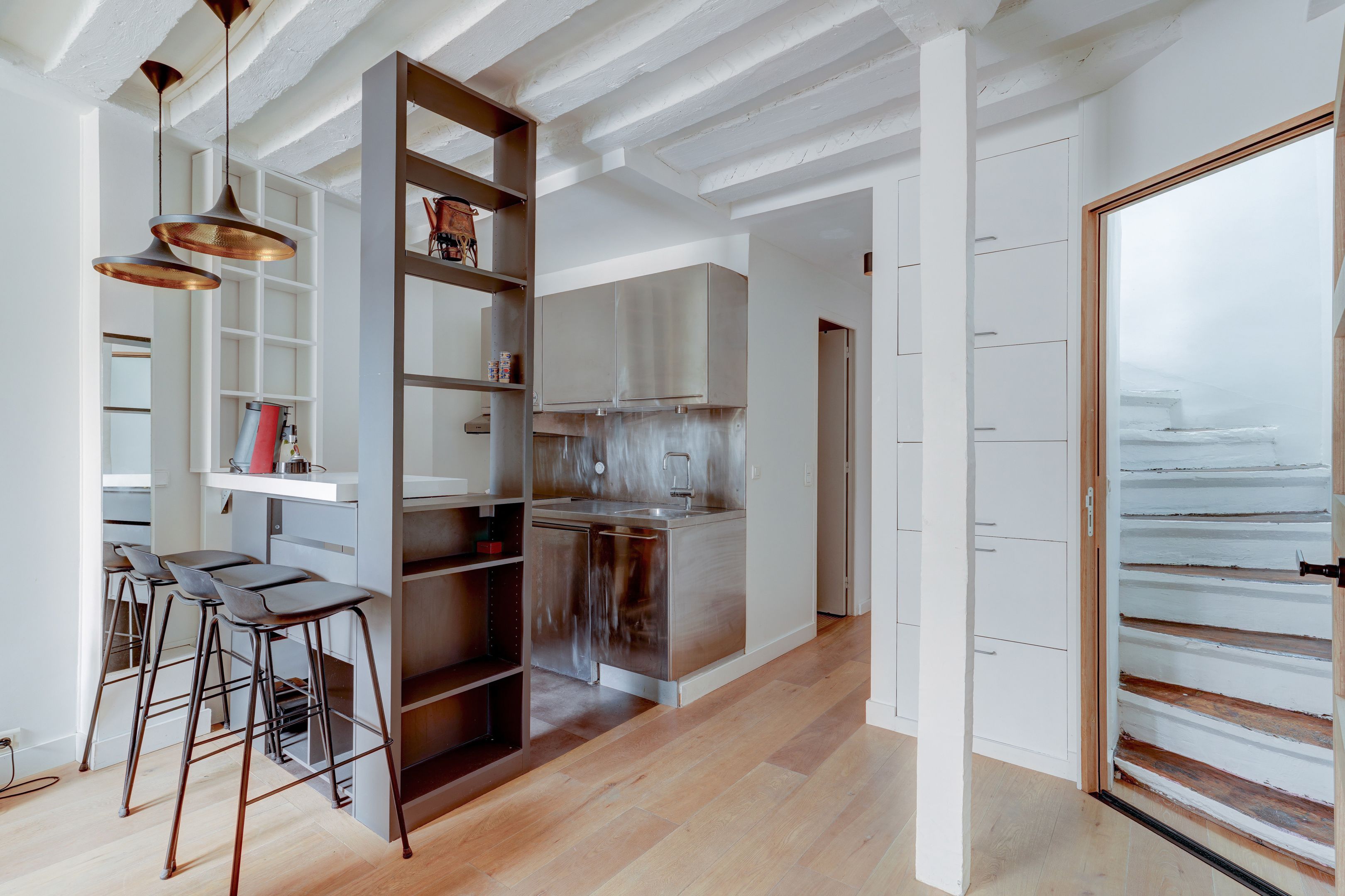 In the heart of Paris, next to Notre Dame and close to the Sorbonne, in a quiet courtyard, in a well-maintained old building, on the top two floors served by staircase, a pleasant recently renovated apartment of 50.41 m² (42.15 m² Carrez law), crossing and bright. It benefits from an optimized layout with two real bedrooms. Living room with open-plan kitchen, bedroom, shower room and a second bedroom upstairs with water point. It is also sectorized to Collège Henri-IV.