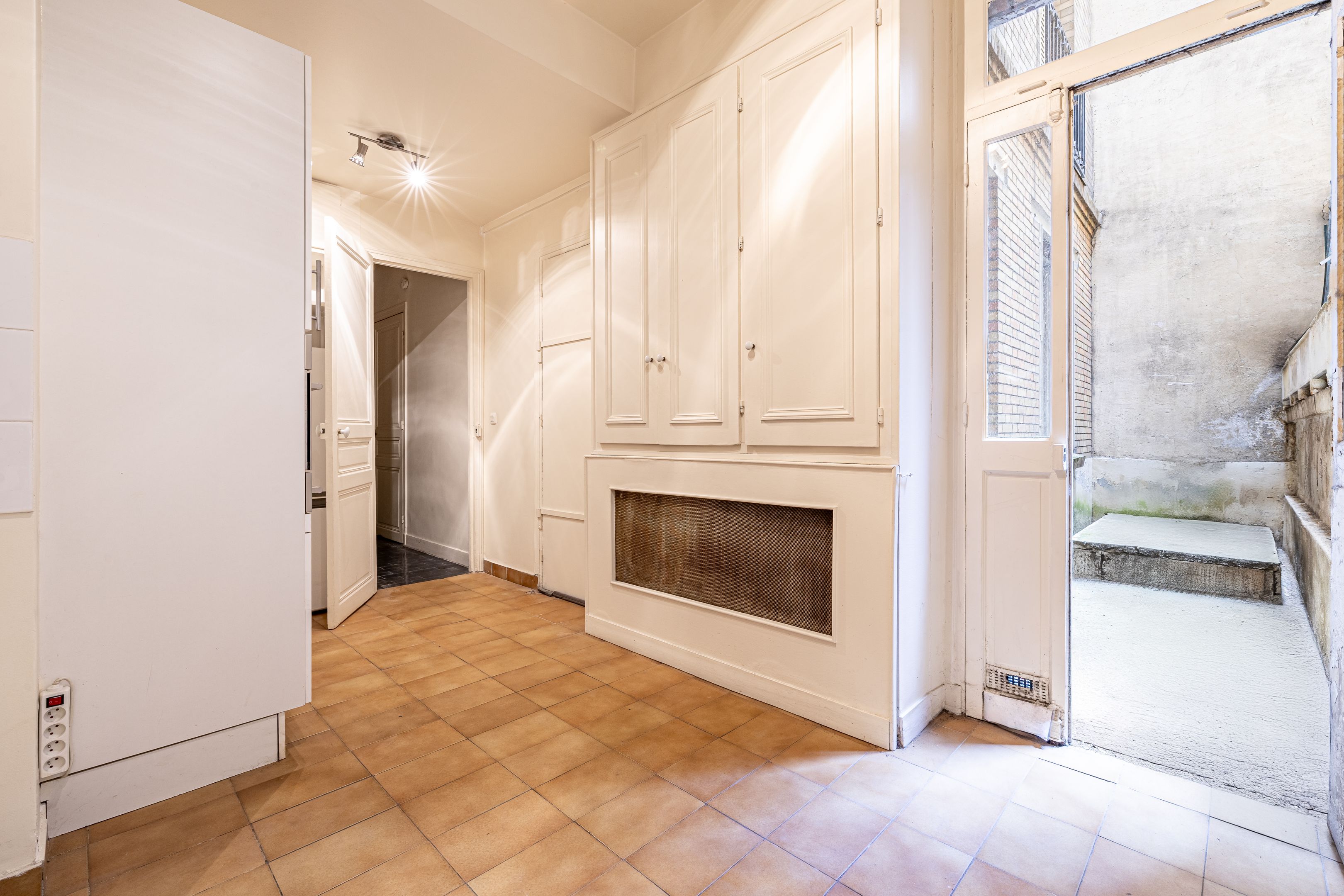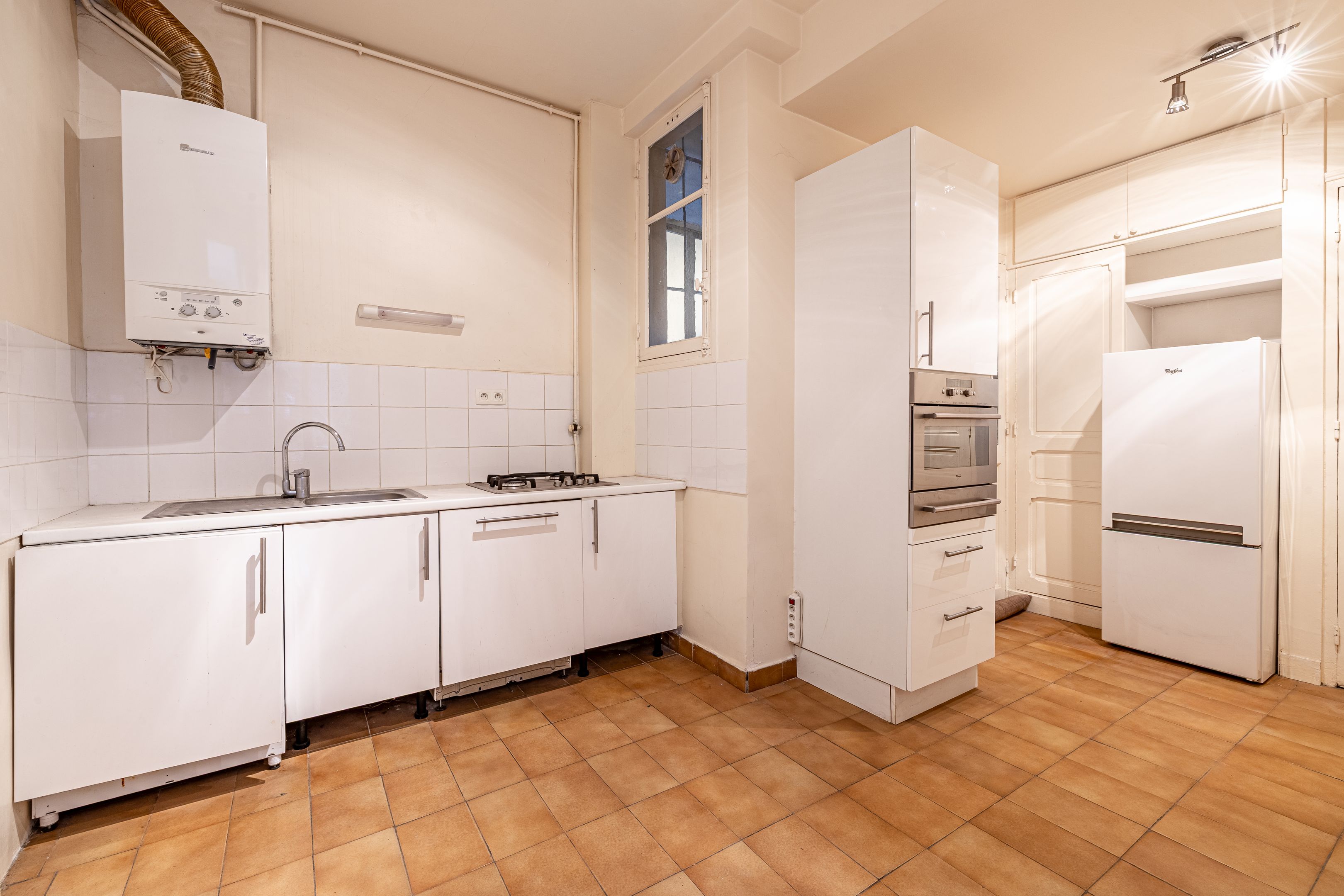 LIBERAL PROFESSION POSSIBLE. In the heart of shops, transport and schools. On the first floor of a very attractive and secure old stone building, beautiful apartment of 79.44m² loi Carrez (80.89m² on the ground) with old-world charm and generous volumes, benefiting from a functional and optimized layout. Entrance gallery, reception room, two bedrooms, one with a water point, the second giving access to a bathroom, separate kitchen opening onto two terraces/courts, separate toilet, hallway, plenty of storage space. Independent storeroom. Cellar. Exclusive to BRETEUIL.