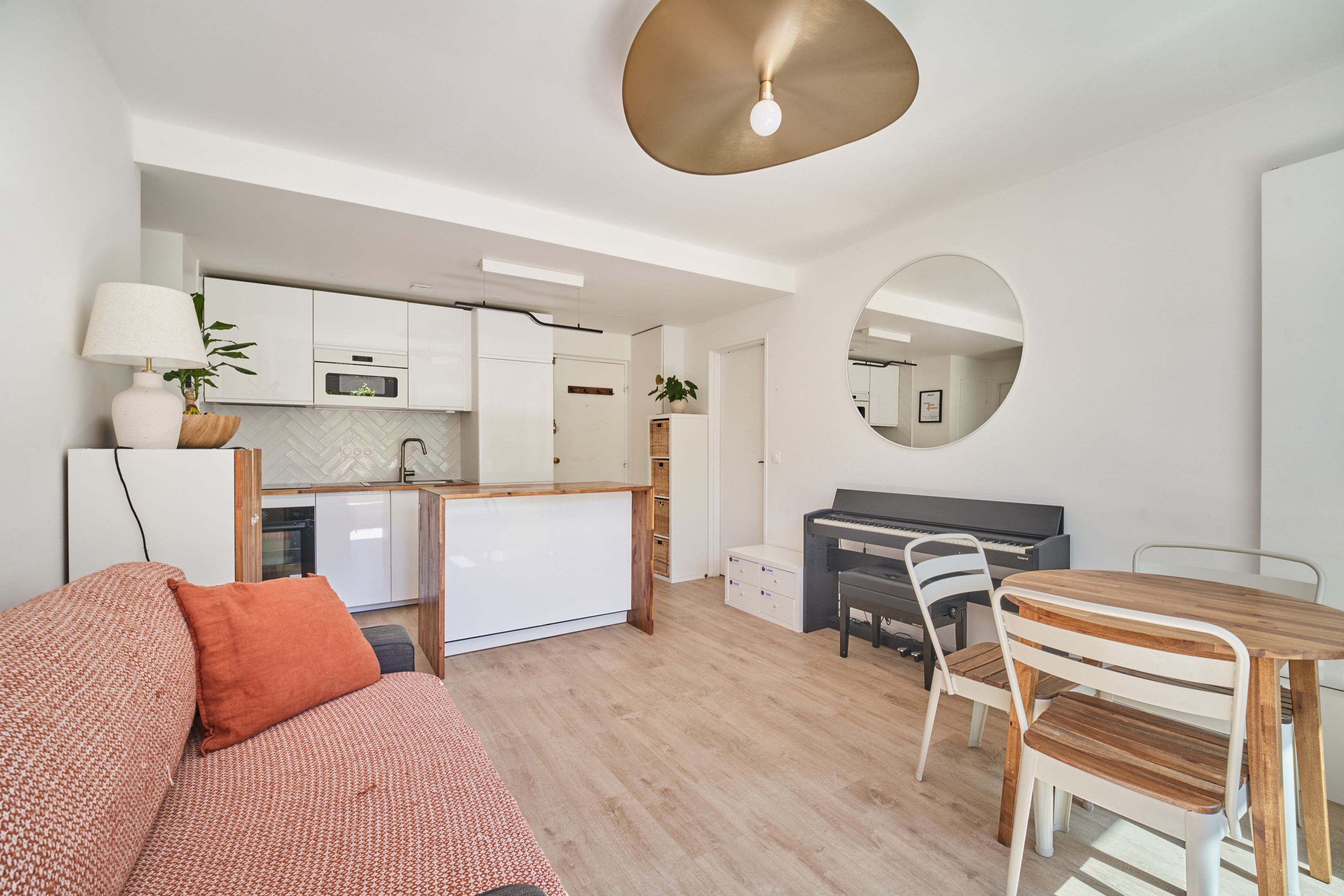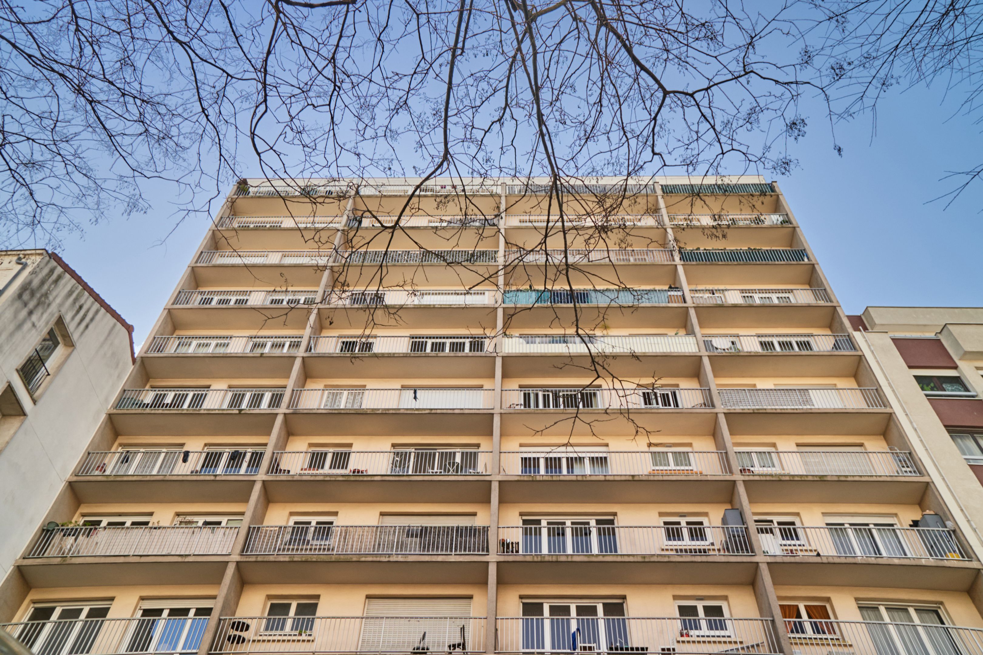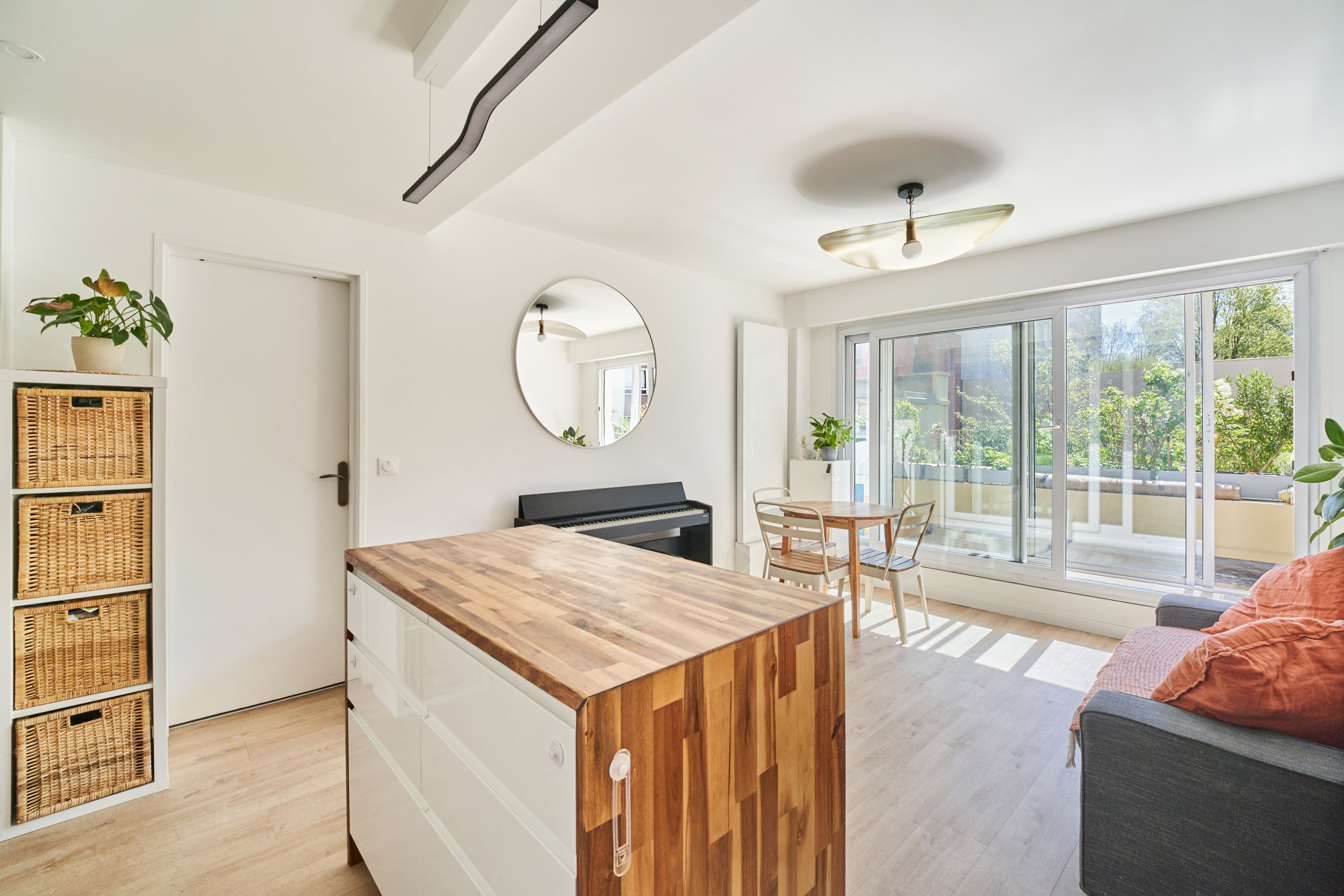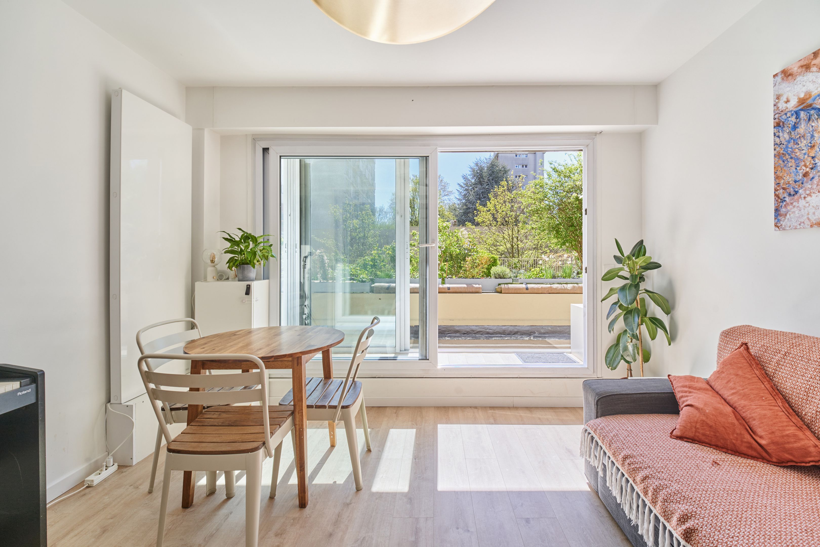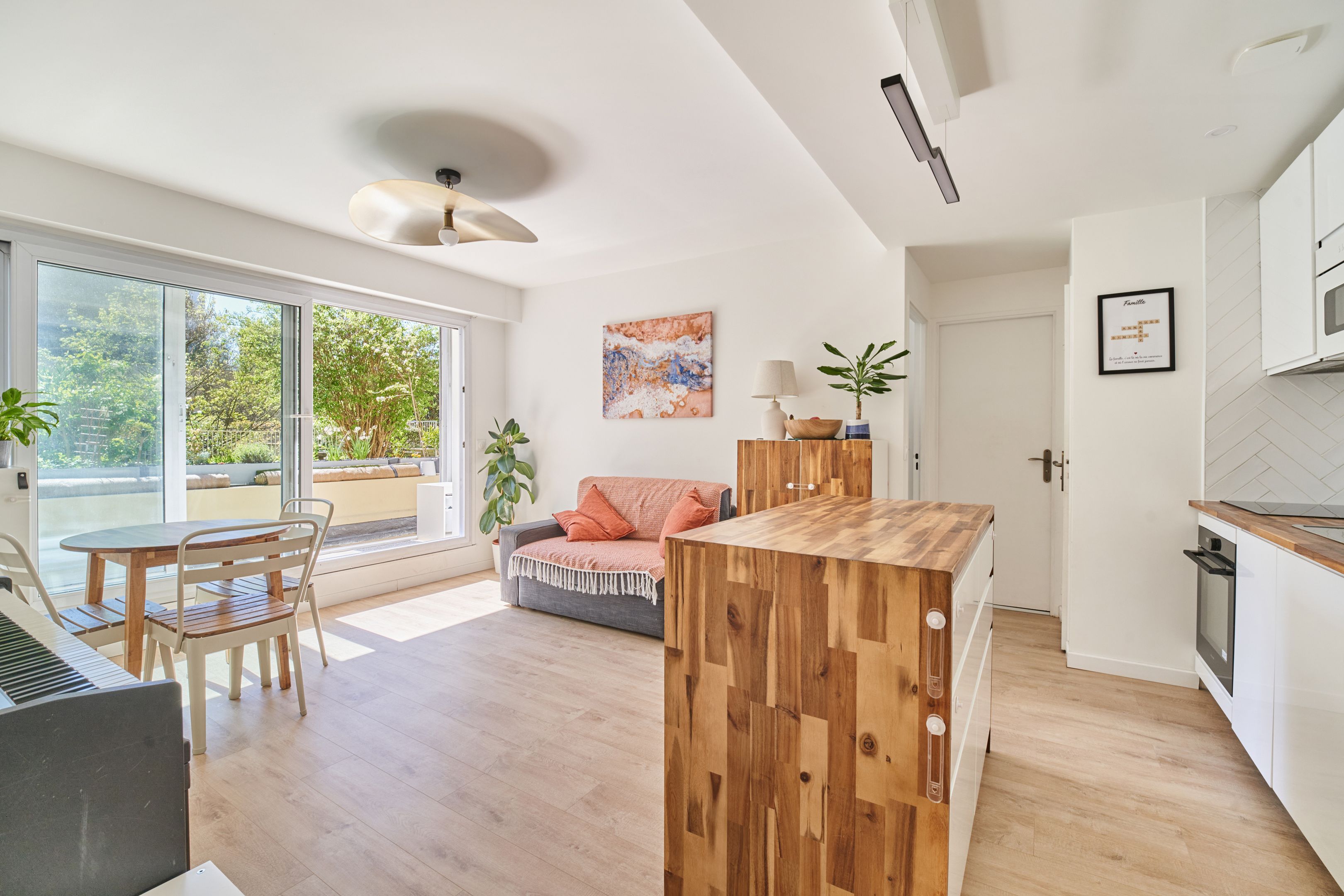 1972 building near Télégraphe. Well-optimized 44.14 m² three-room apartment on 1st floor served by elevator. Entrance hall, south-facing living room on garden level, 8 m² loggia opening onto 20 m² terrace, open-plan fitted and equipped kitchen, two bedrooms with dressing rooms, shower room, separate toilet, plenty of storage space. Cellar. Parking space. Janitor.