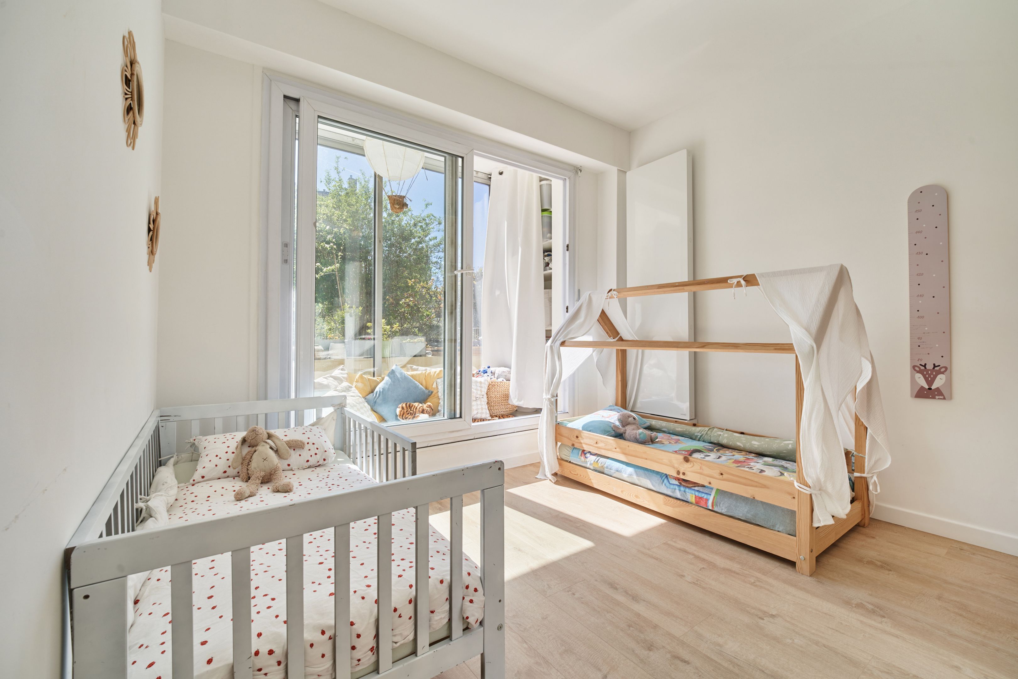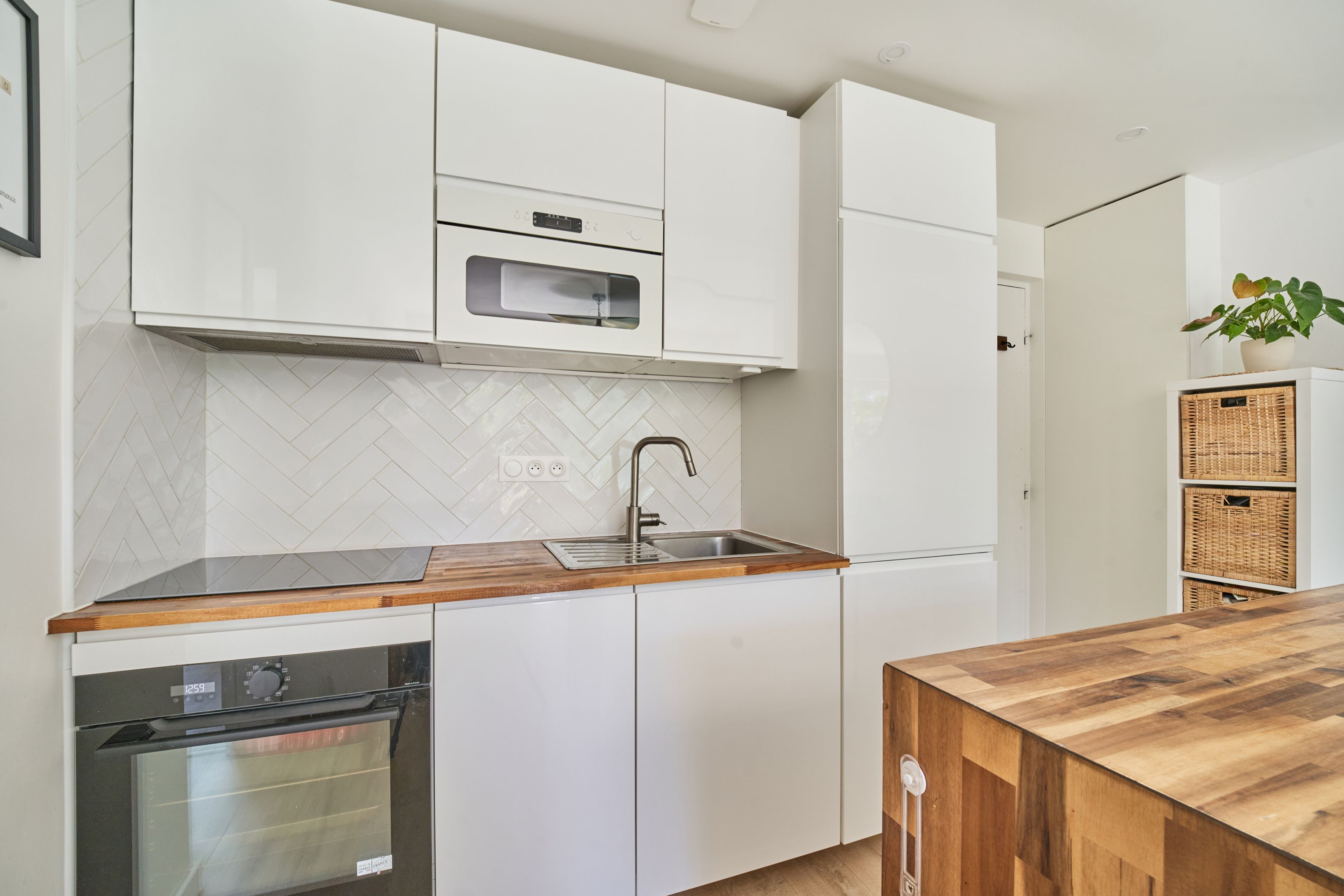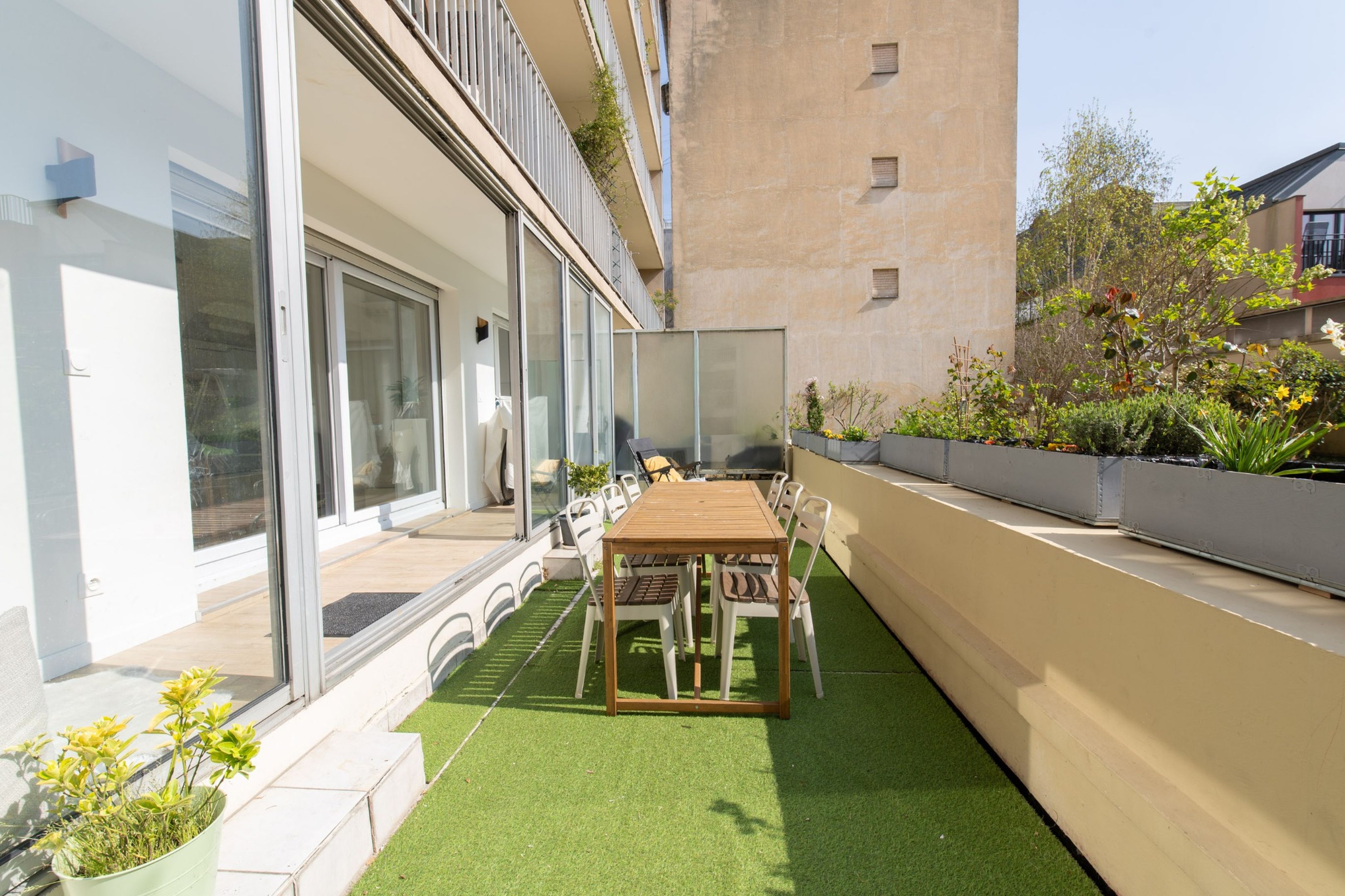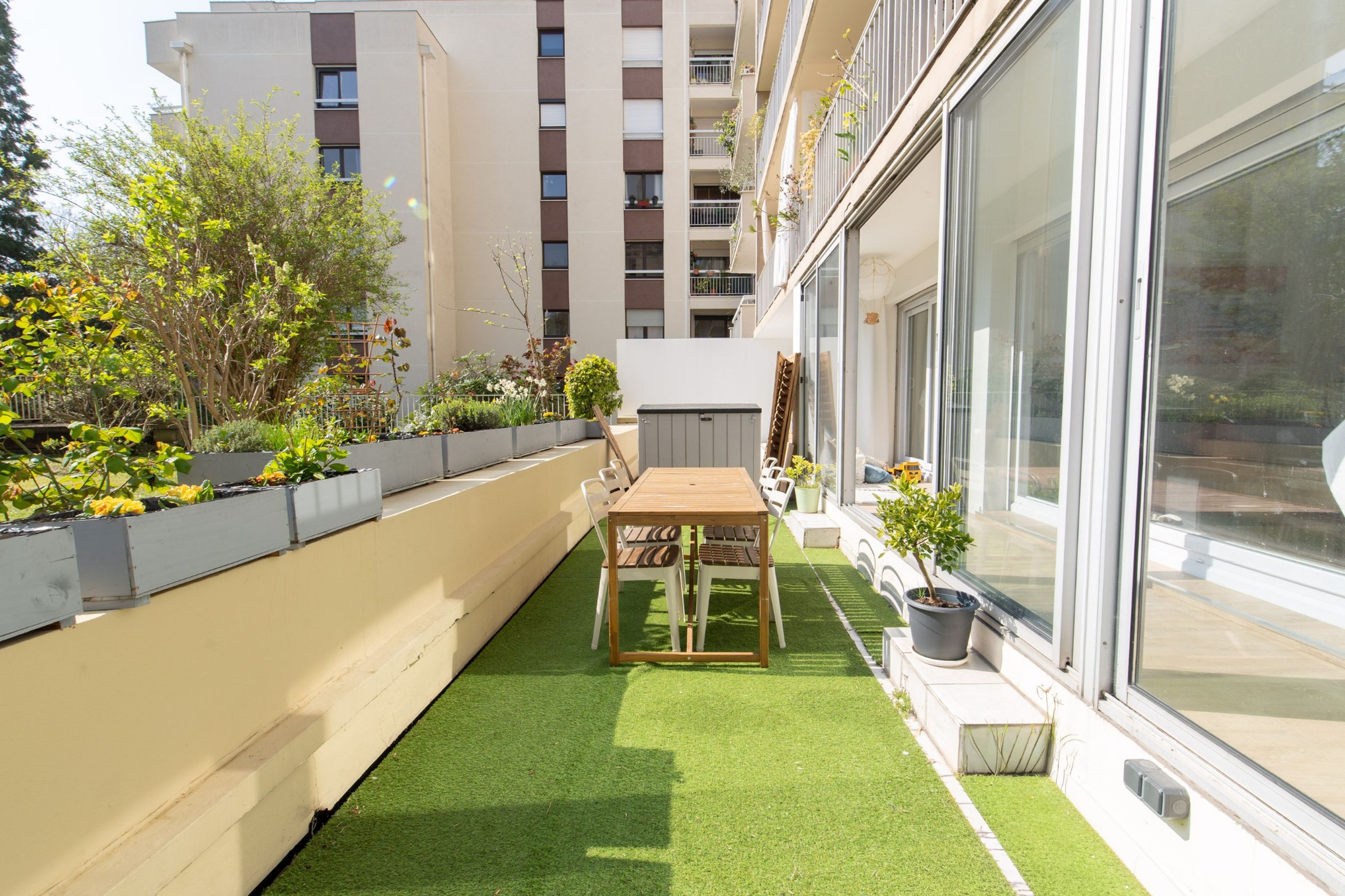 1972 building near Télégraphe. Well-optimized 44.14 m² three-room apartment on 1st floor served by elevator. Entrance hall, south-facing living room on garden level, 8 m² loggia opening onto 20 m² terrace, open-plan fitted and equipped kitchen, two bedrooms with dressing rooms, shower room, separate toilet, plenty of storage space. Cellar. Parking space. Janitor.