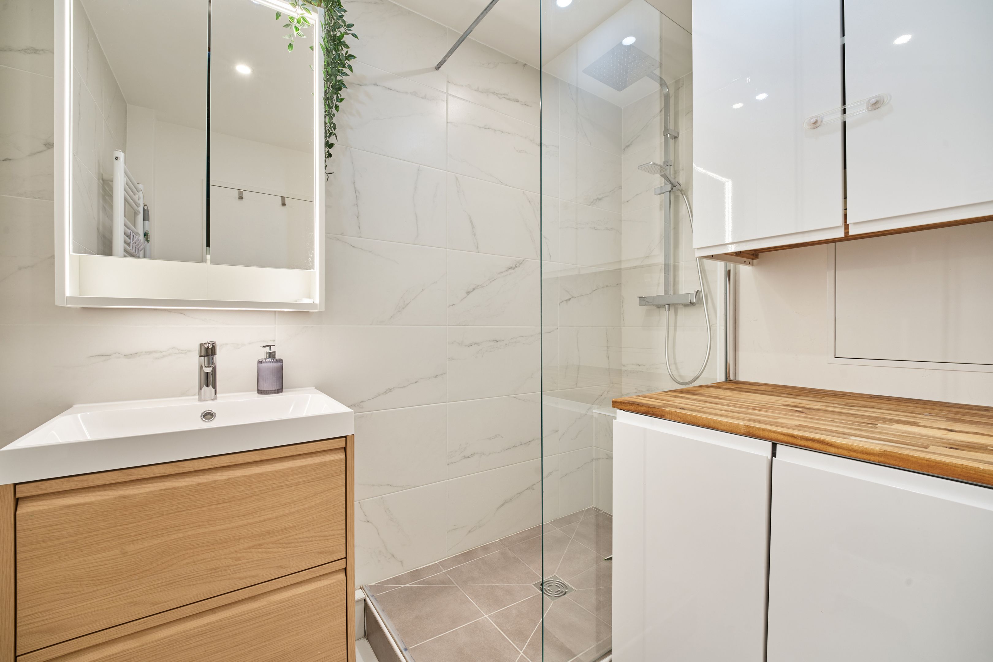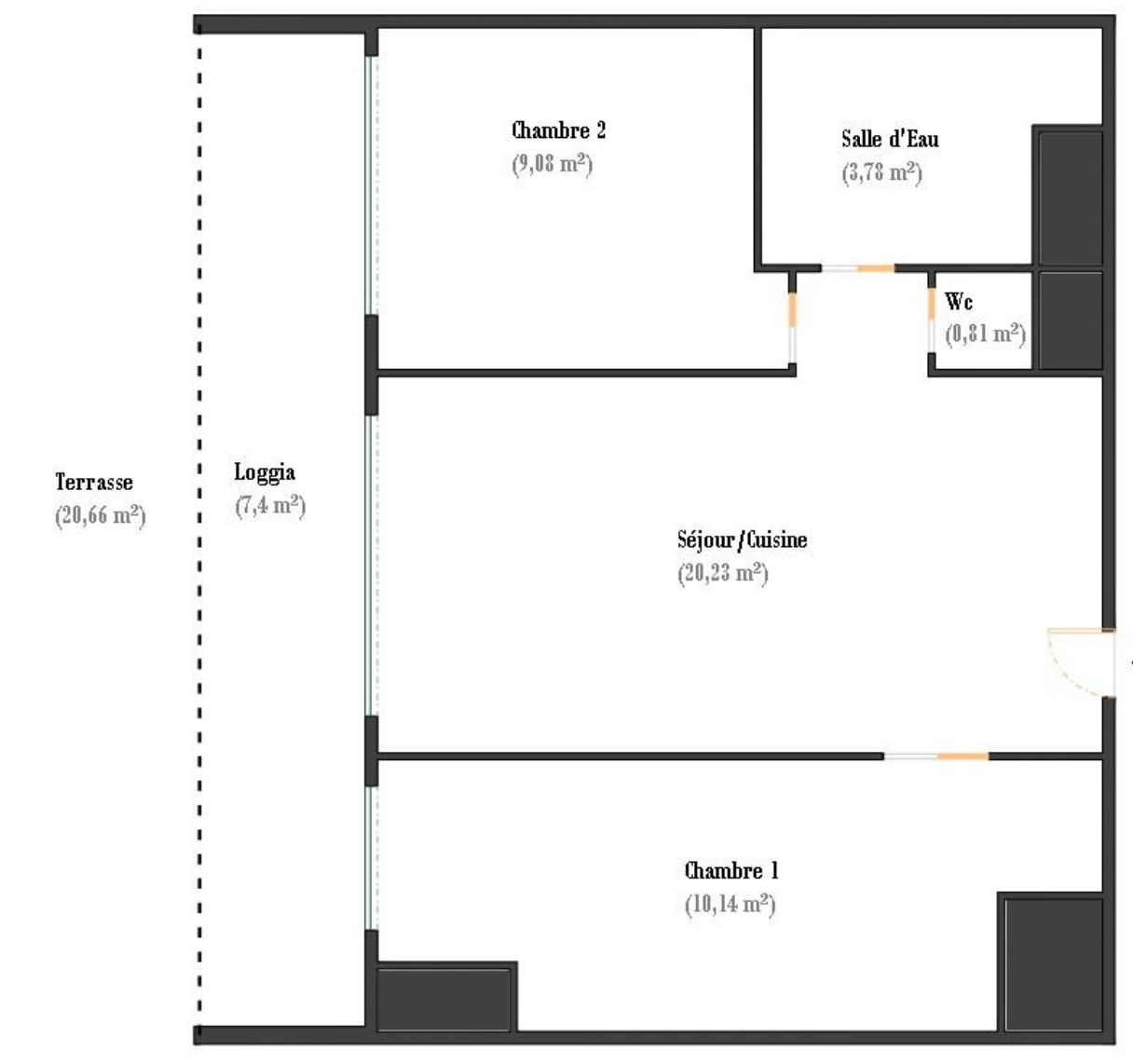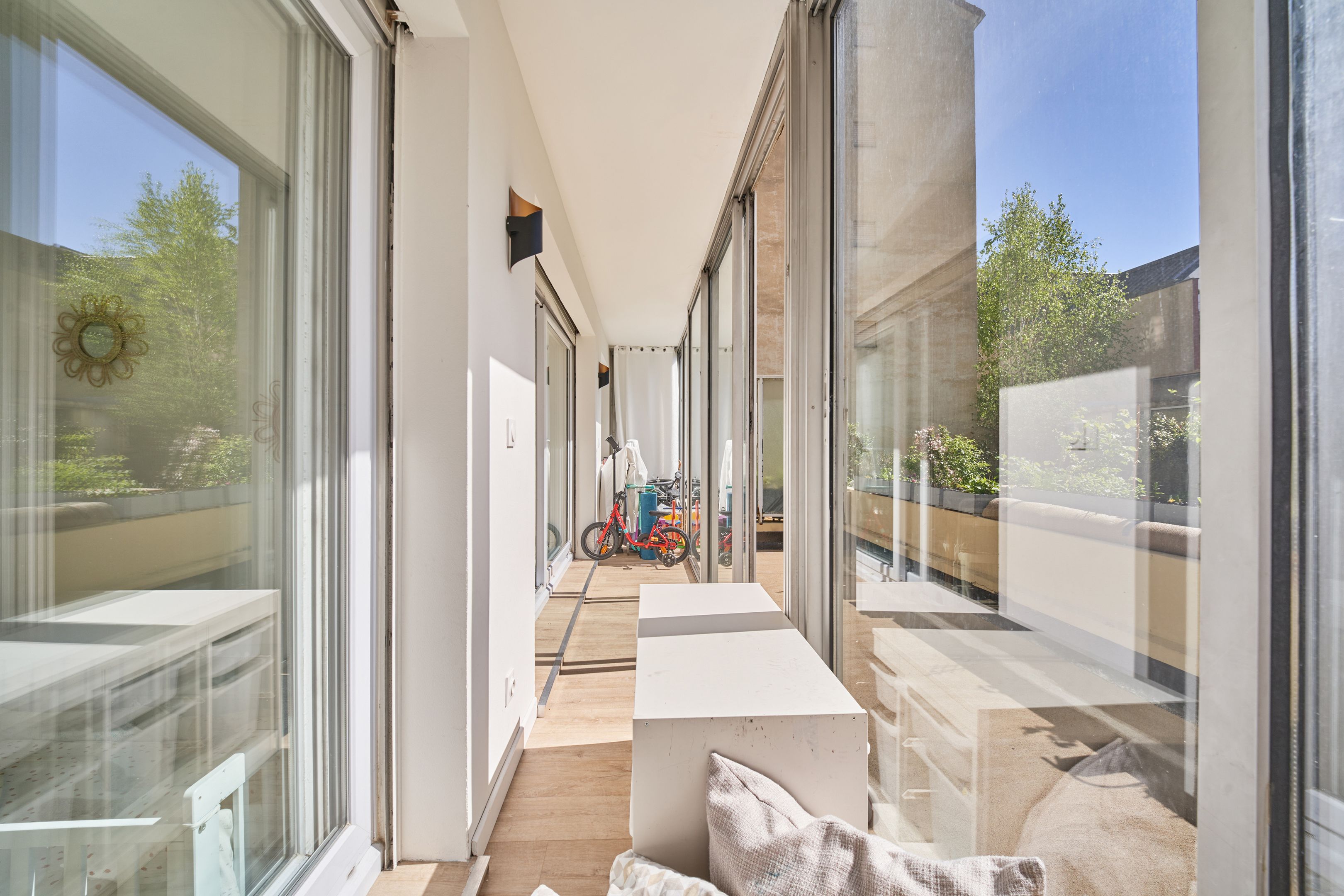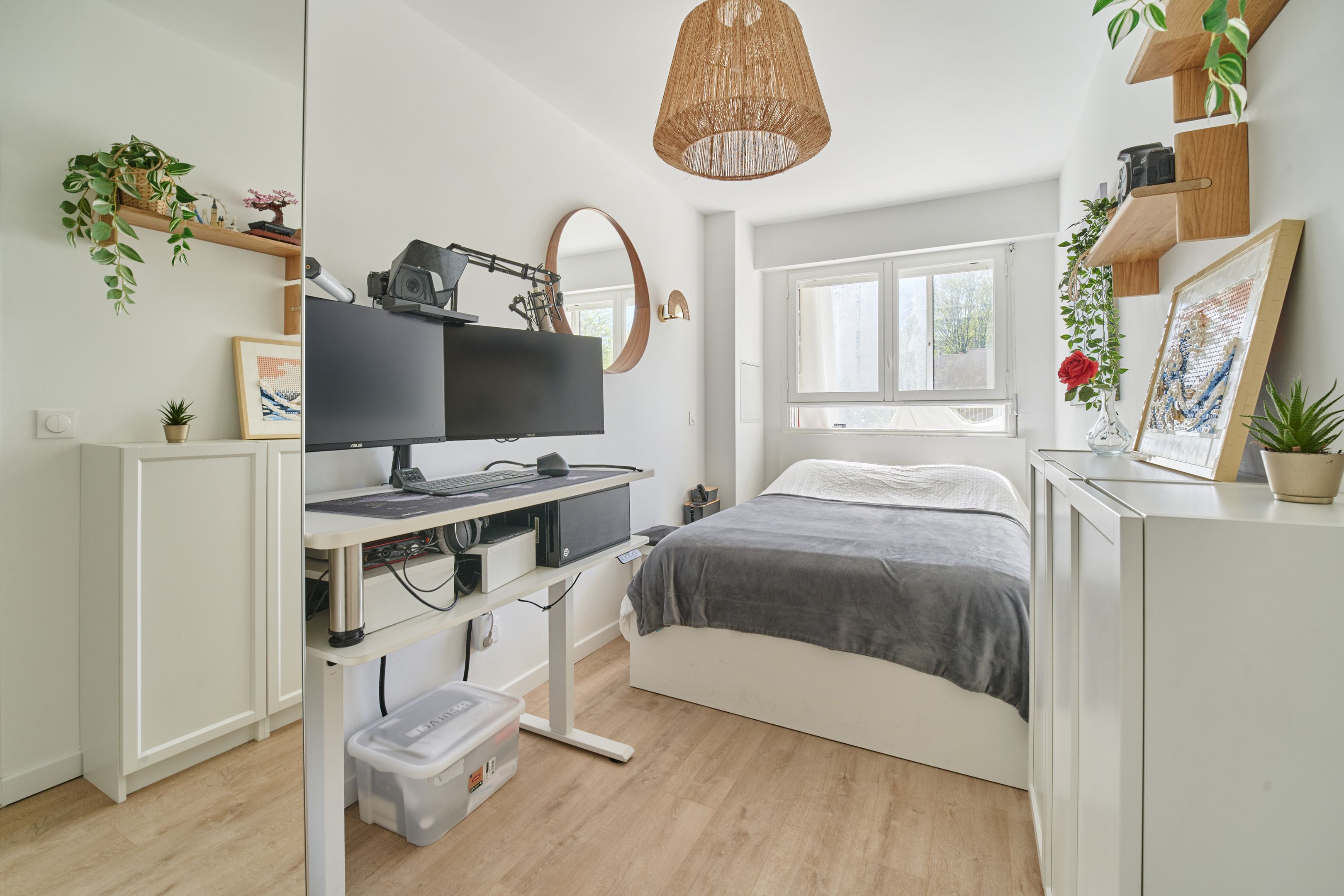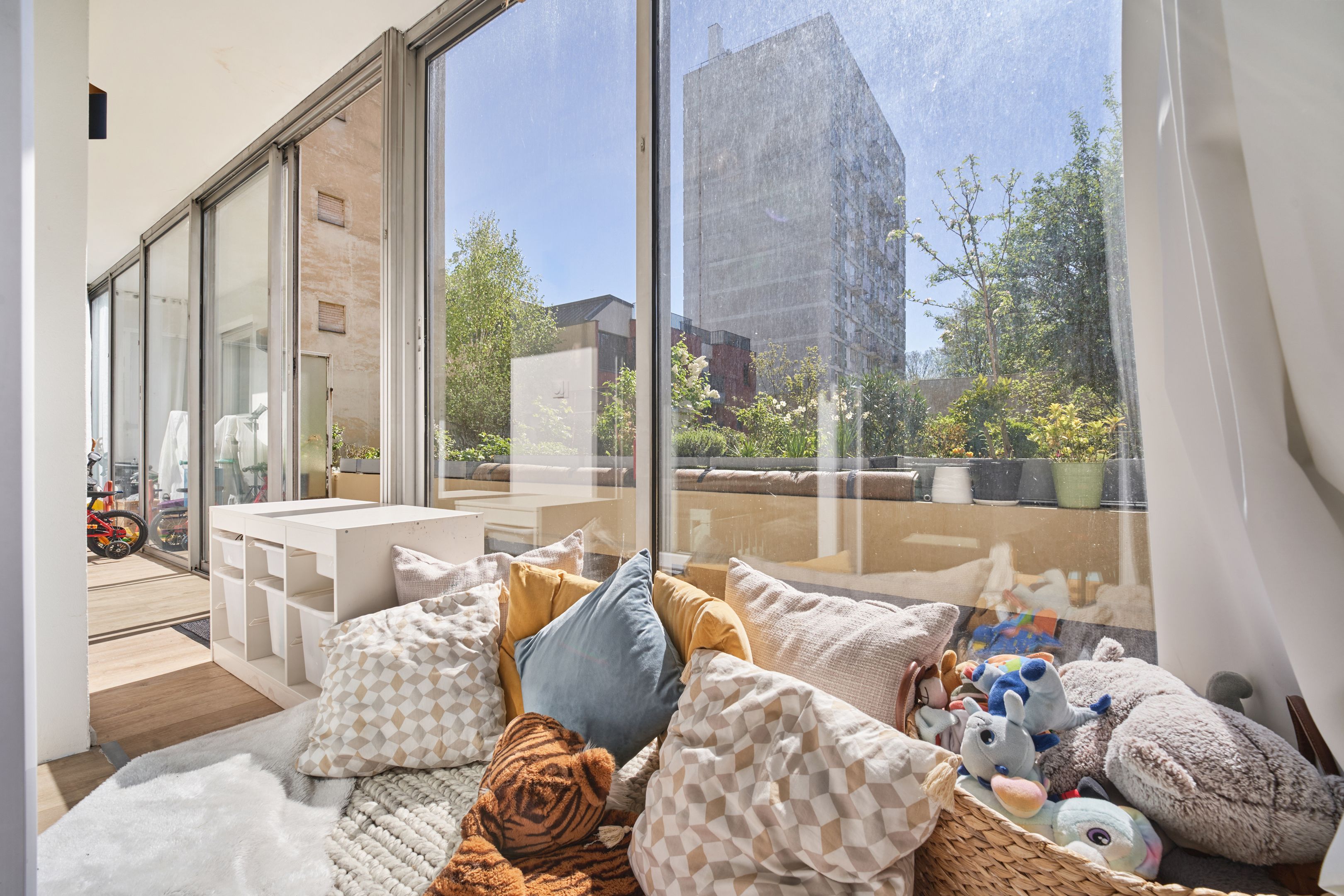 1972 building near Télégraphe. Well-optimized 44.14 m² three-room apartment on 1st floor served by elevator. Entrance hall, south-facing living room on garden level, 8 m² loggia opening onto 20 m² terrace, open-plan fitted and equipped kitchen, two bedrooms with dressing rooms, shower room, separate toilet, plenty of storage space. Cellar. Parking space. Janitor.