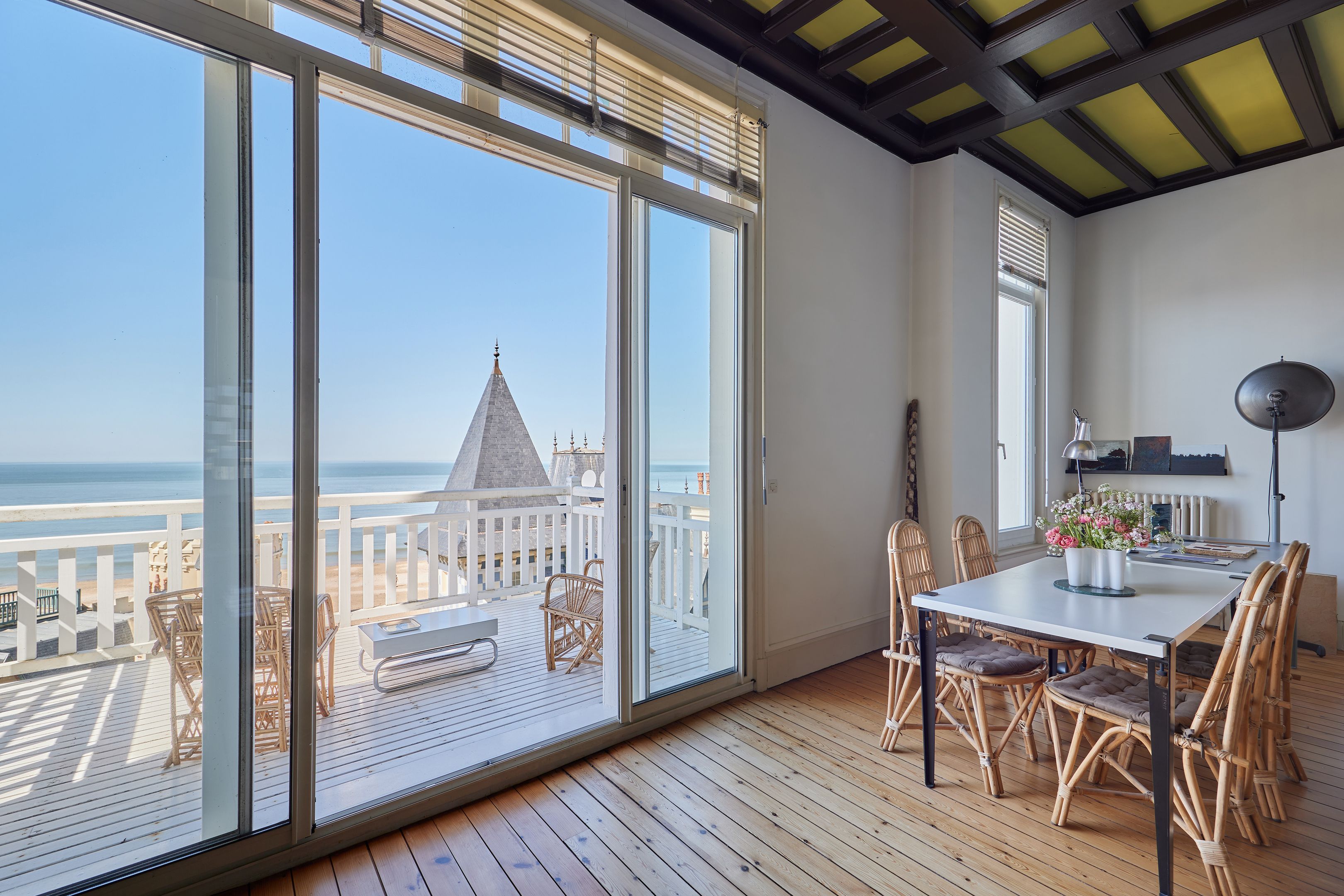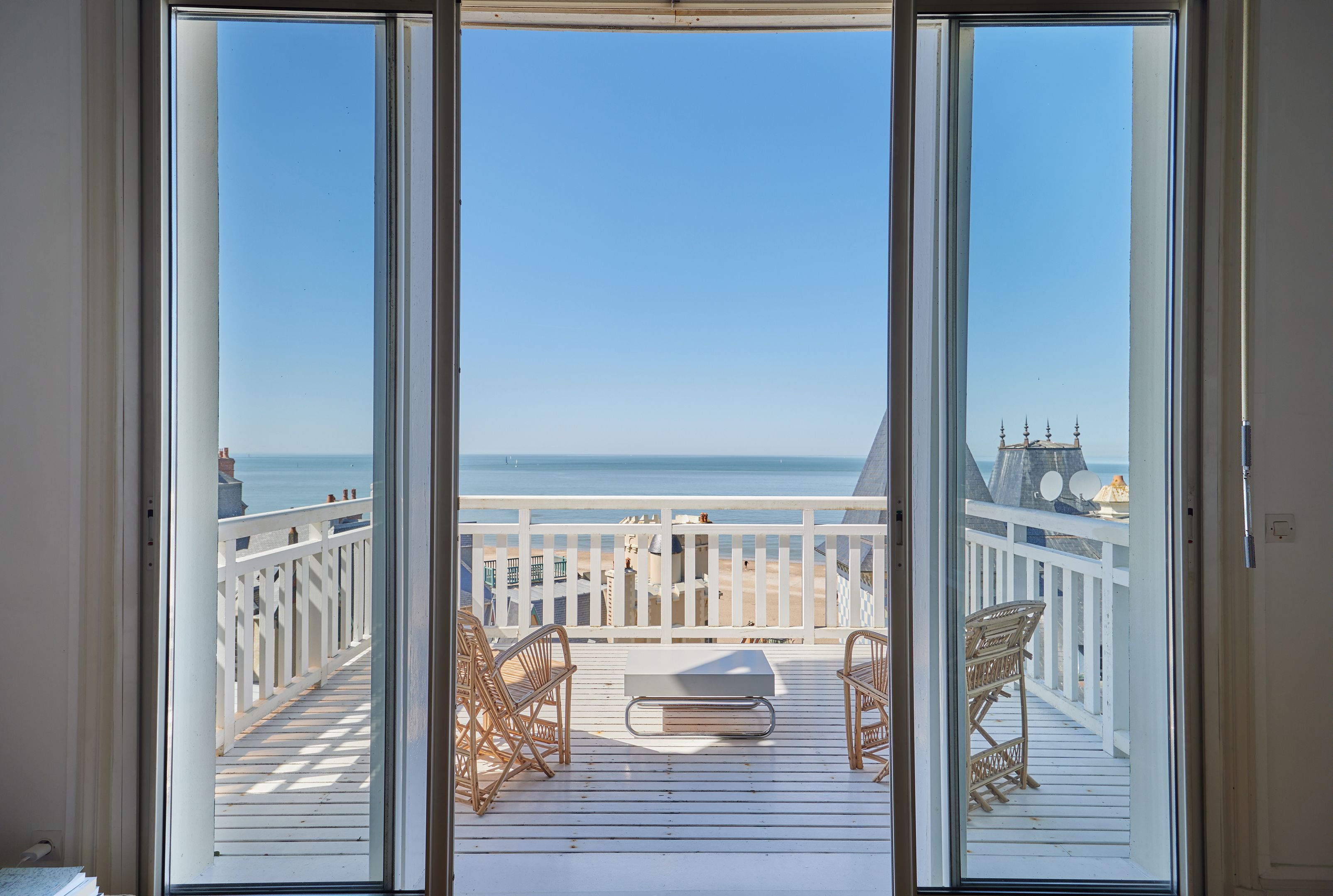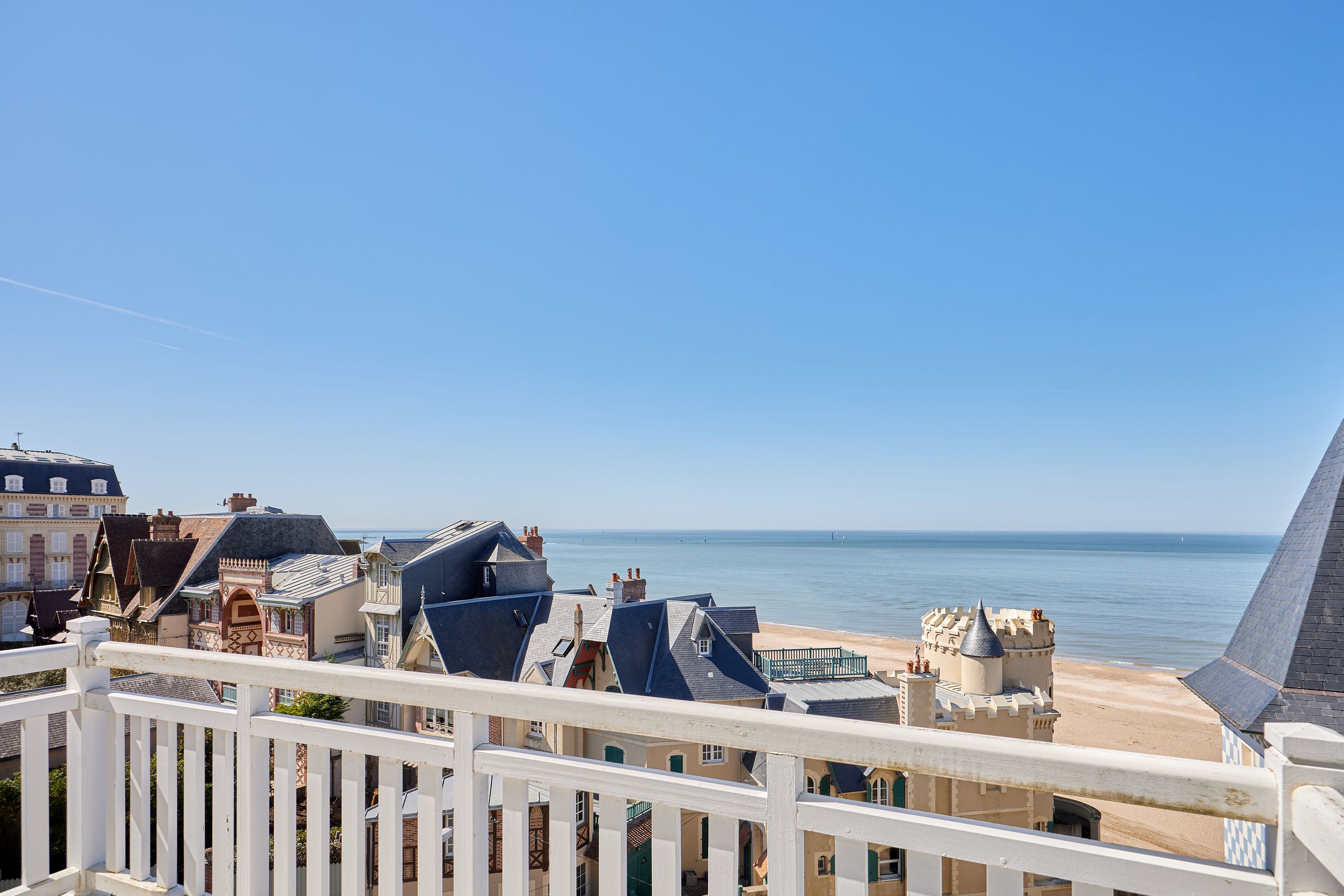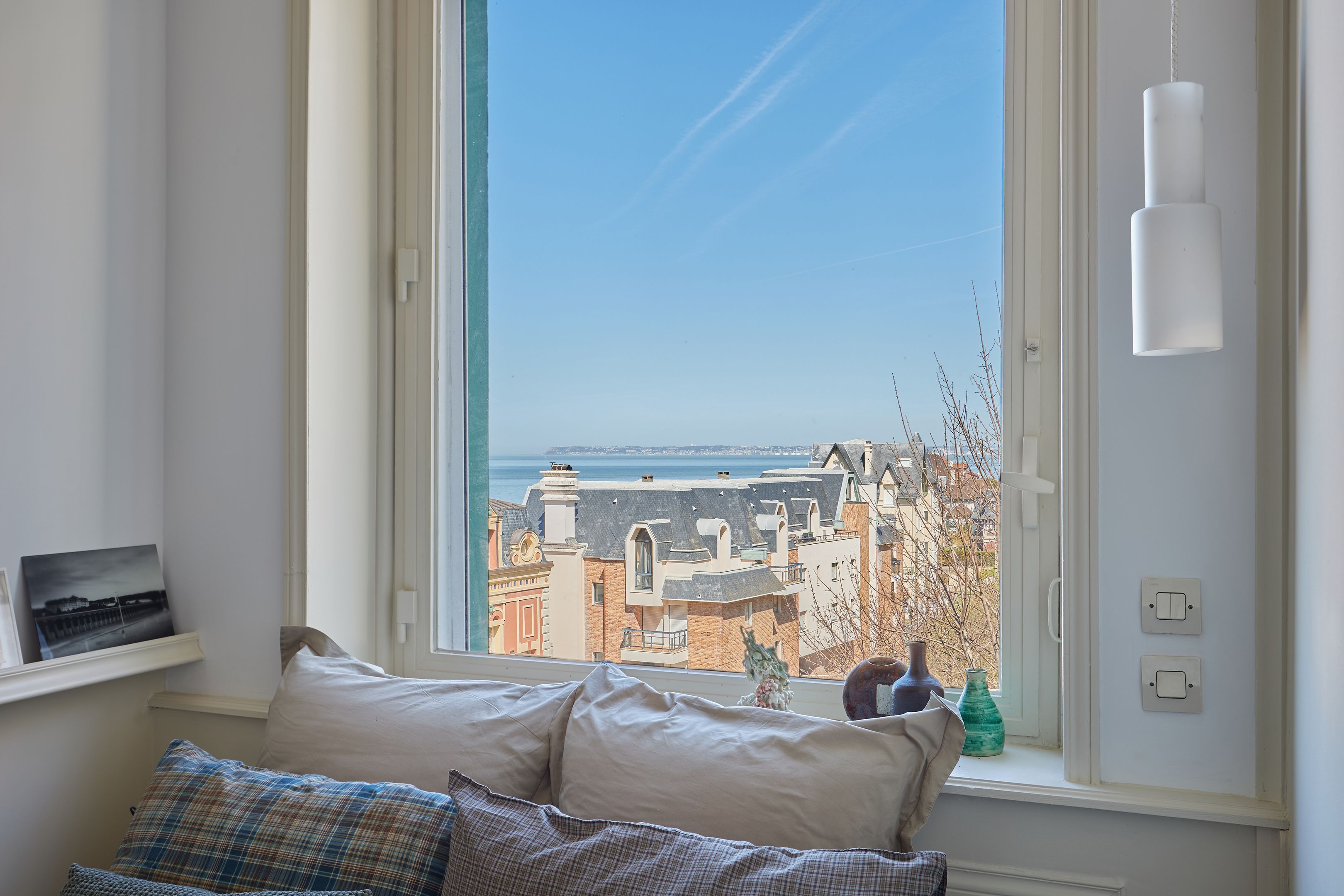 Exclusive Breteuil - Ideally located in the Roches Noires district, on the first floor of an old Norman villa dating from the late 19th century, this magnificent 100 m² apartment boasts generous volumes and high ceilings. Entrance hall, fitted kitchen, living room with period fireplace opening onto a west-facing terrace offering exceptional views of the sea, the Malakoff tower and Trouville's historic villas, alcove offering a large sleeping area facing the sea, spacious bedroom offering panoramic views as far as Le Havre, shower room with toilet benefiting from an independent entrance onto a courtyard, shower room, guest toilet. Possibility of acquiring a garage in addition to the sale price. Hot/cold water and heating included in utilities.