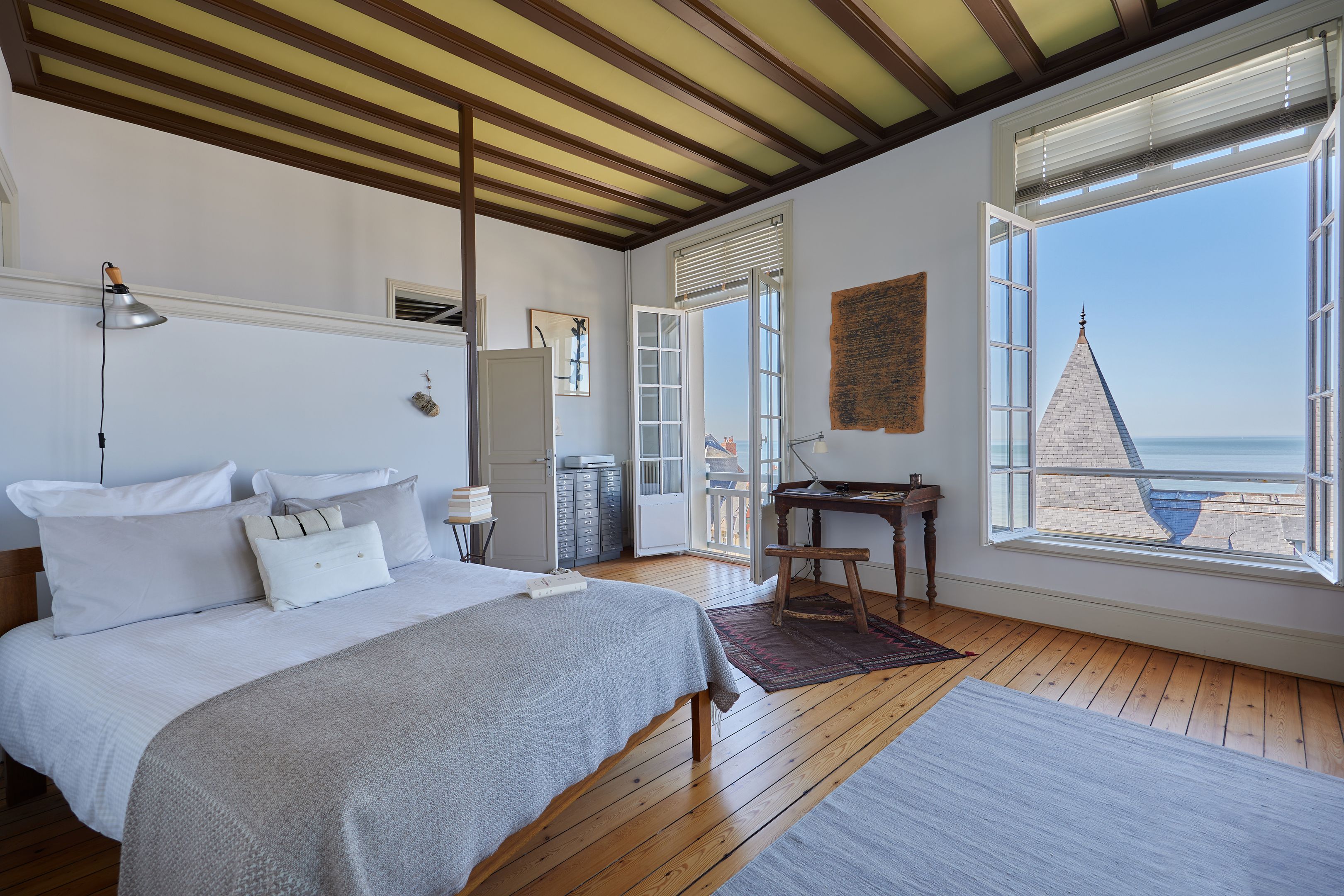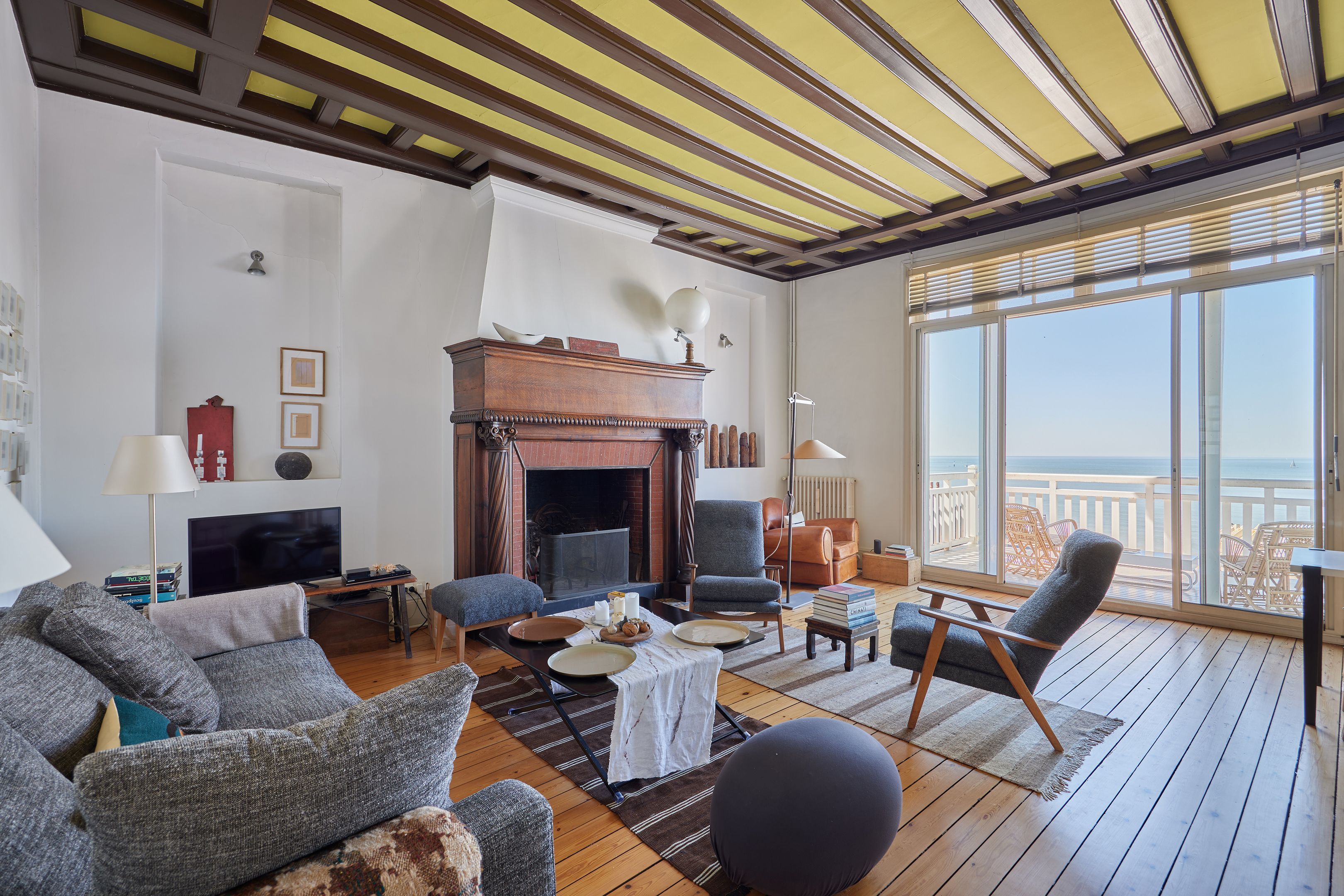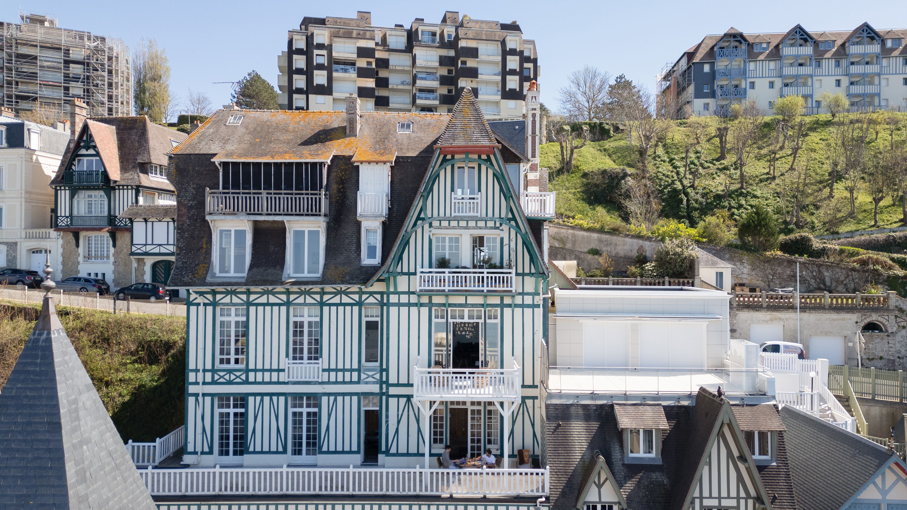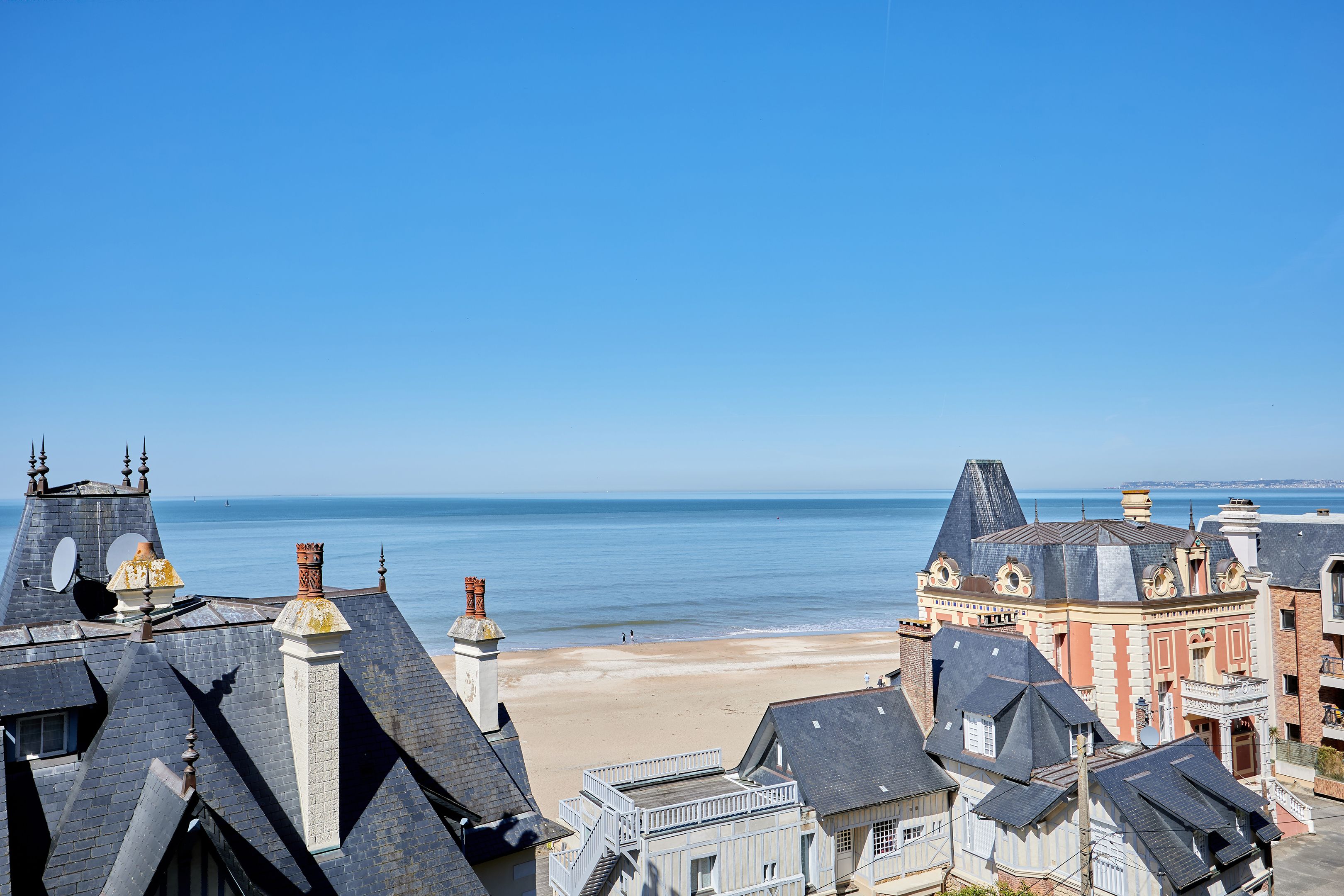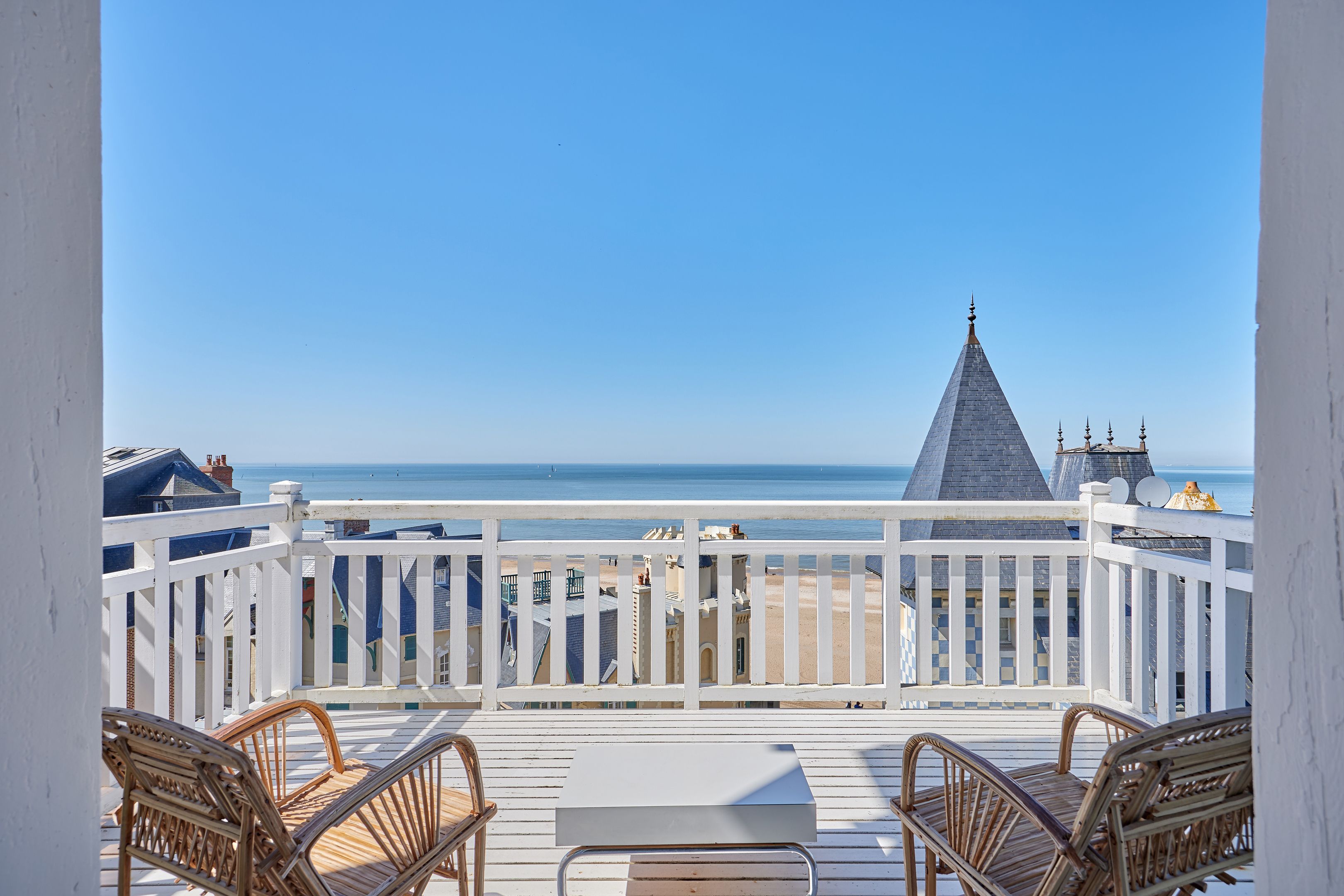 Exclusive Breteuil - Ideally located in the Roches Noires district, on the first floor of an old Norman villa dating from the late 19th century, this magnificent 100 m² apartment boasts generous volumes and high ceilings. Entrance hall, fitted kitchen, living room with period fireplace opening onto a west-facing terrace offering exceptional views of the sea, the Malakoff tower and Trouville's historic villas, alcove offering a large sleeping area facing the sea, spacious bedroom offering panoramic views as far as Le Havre, shower room with toilet benefiting from an independent entrance onto a courtyard, shower room, guest toilet. Possibility of acquiring a garage in addition to the sale price. Hot/cold water and heating included in utilities.