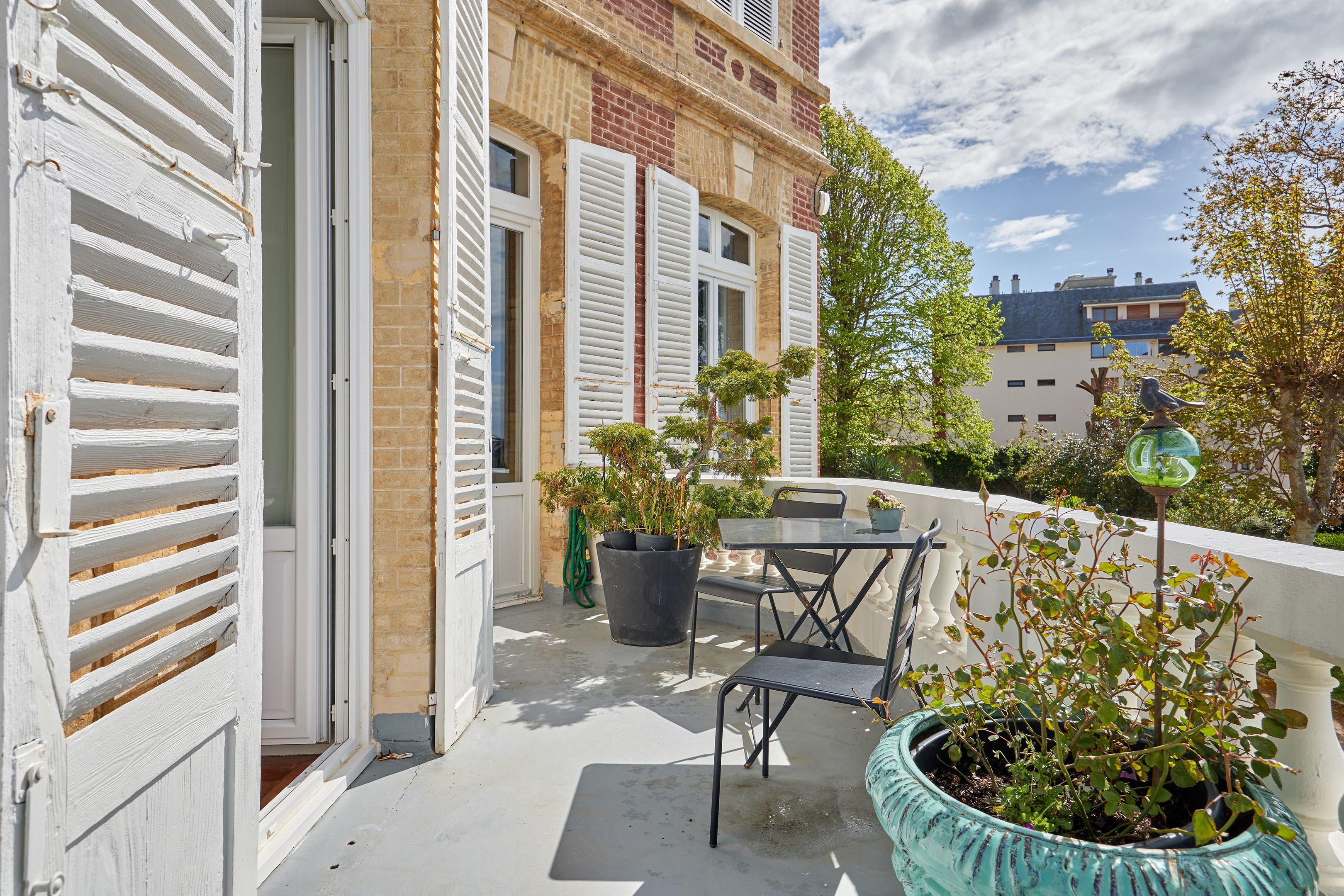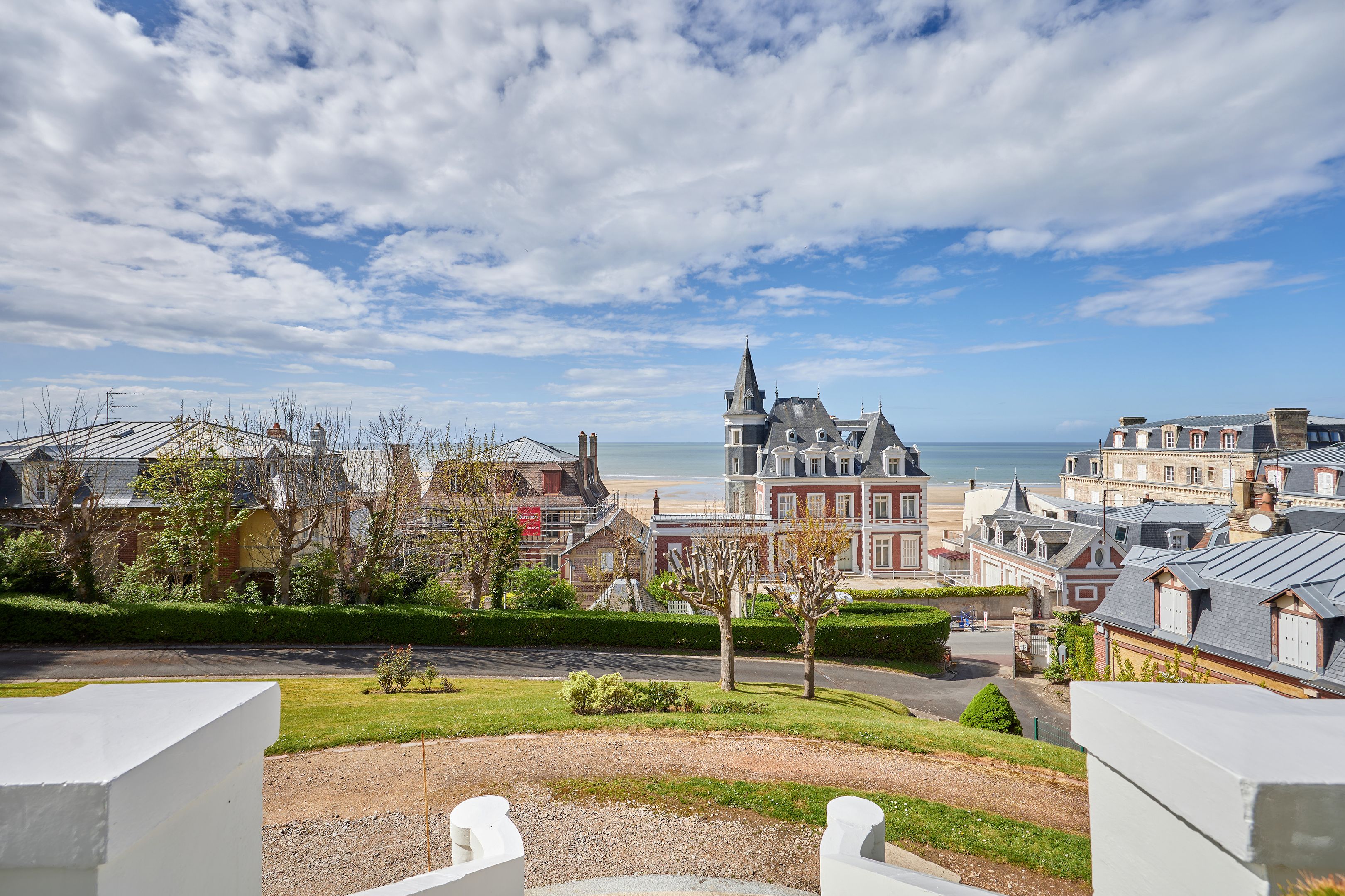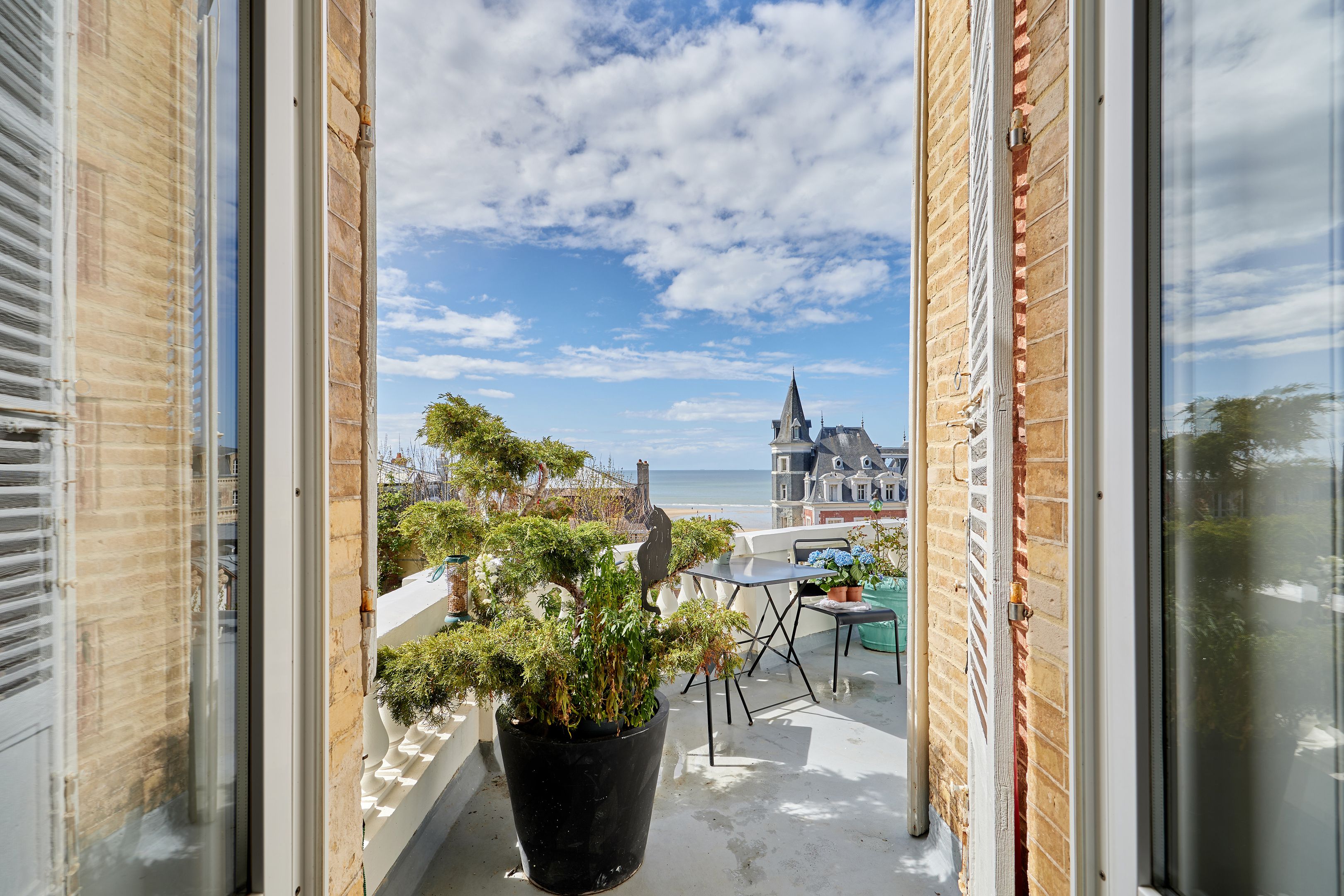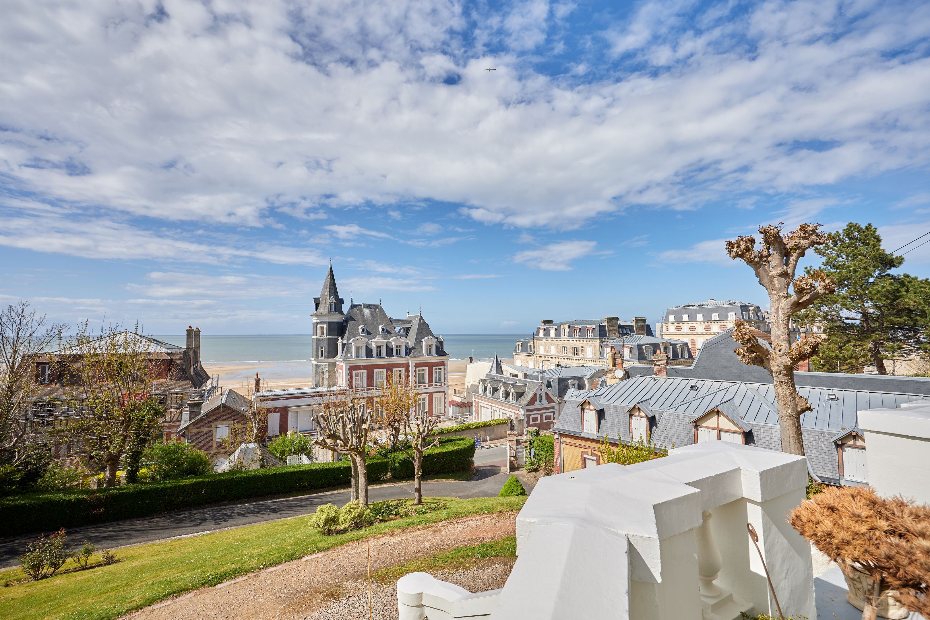 Less than 500 m from rue des Bains, on the 2nd line of the seafront, magnificent 88 m² fully renovated apartment on the raised first floor of an elegant character villa dating from 1880. Entrance hall, living room opening onto the terrace with views of the sea and the Villas trouvillaises, independent fitted kitchen, two bedrooms, one with bath, shower room. The apartment benefits from high ceilings (3.6 m) and has been renovated to a very high standard. Cellar and two parking spaces.