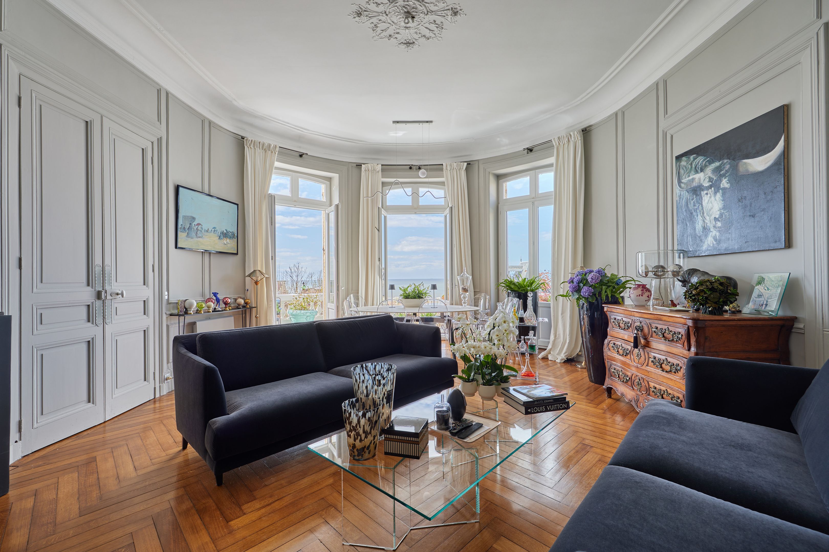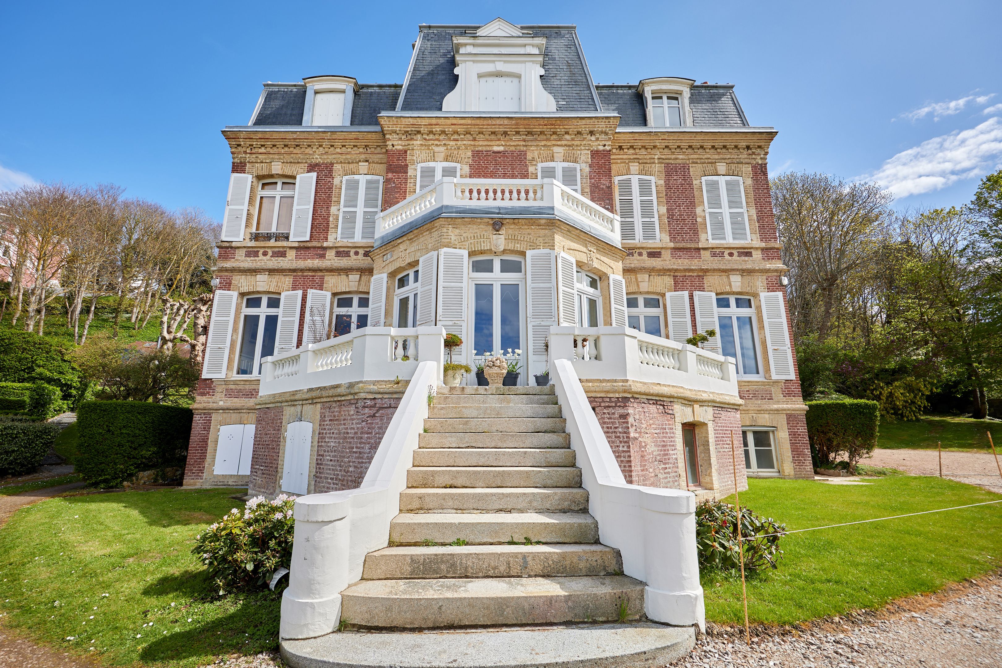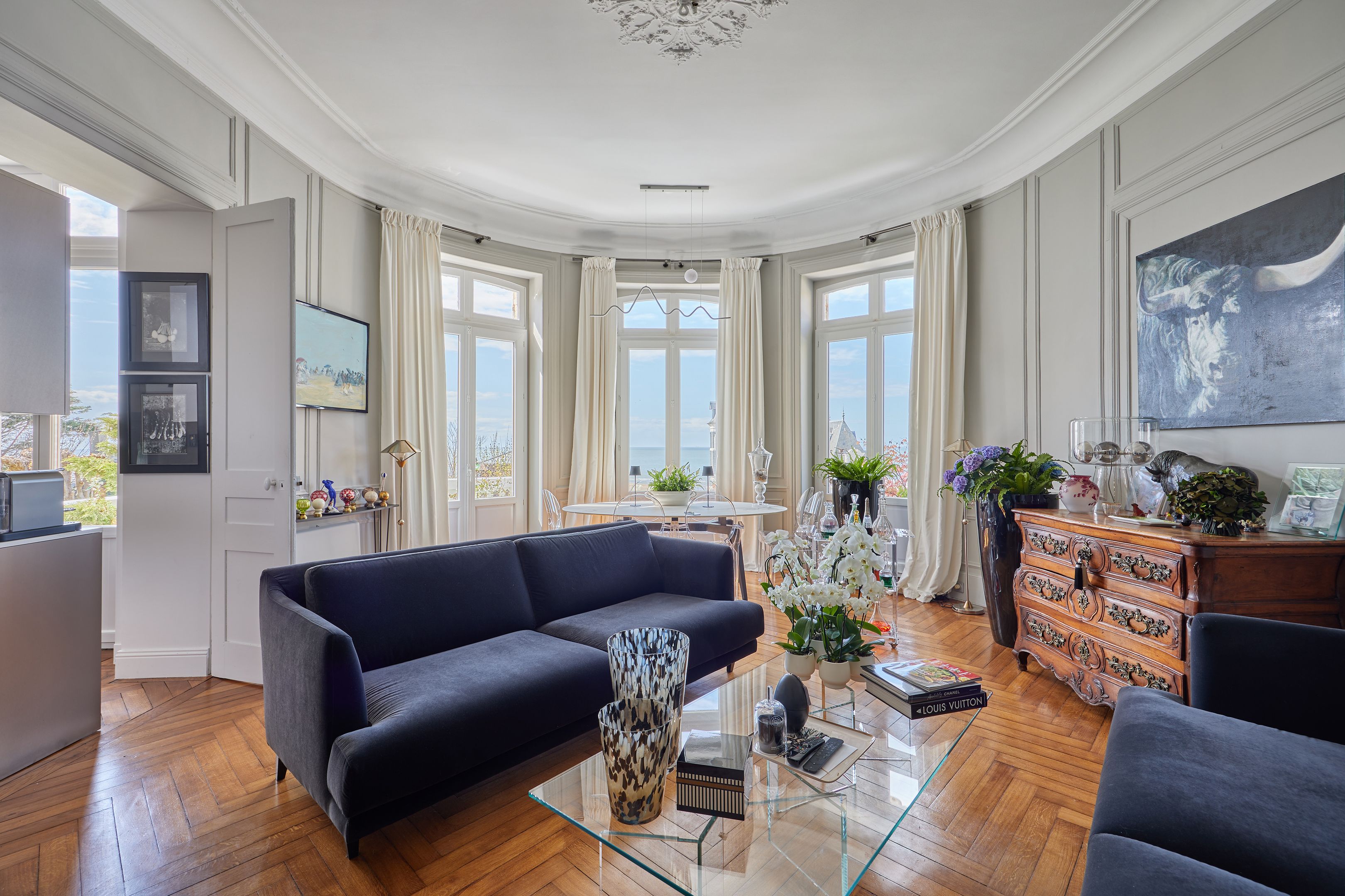 Less than 500 m from rue des Bains, on the 2nd line of the seafront, magnificent 88 m² fully renovated apartment on the raised first floor of an elegant character villa dating from 1880. Entrance hall, living room opening onto the terrace with views of the sea and the Villas trouvillaises, independent fitted kitchen, two bedrooms, one with bath, shower room. The apartment benefits from high ceilings (3.6 m) and has been renovated to a very high standard. Cellar and two parking spaces.