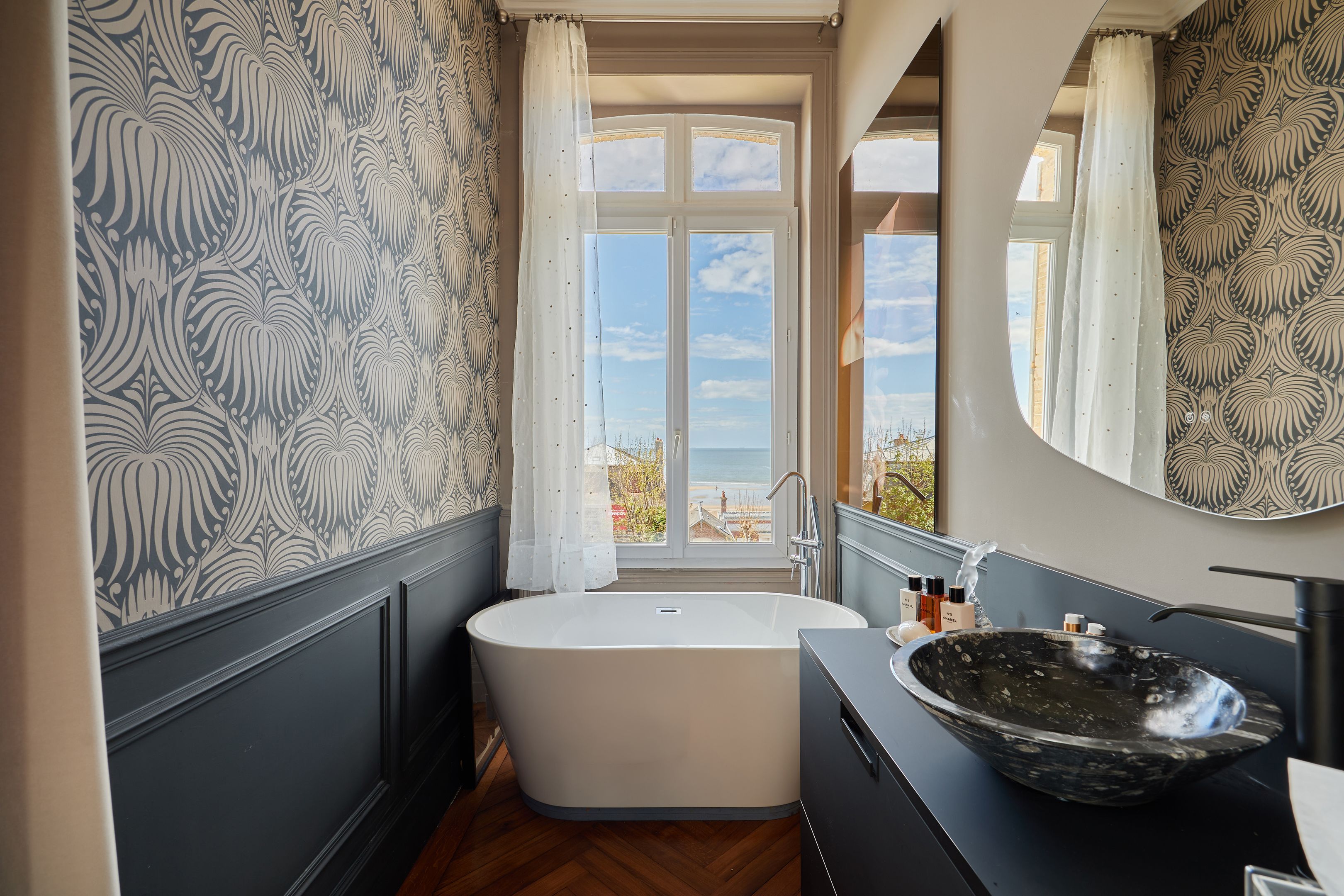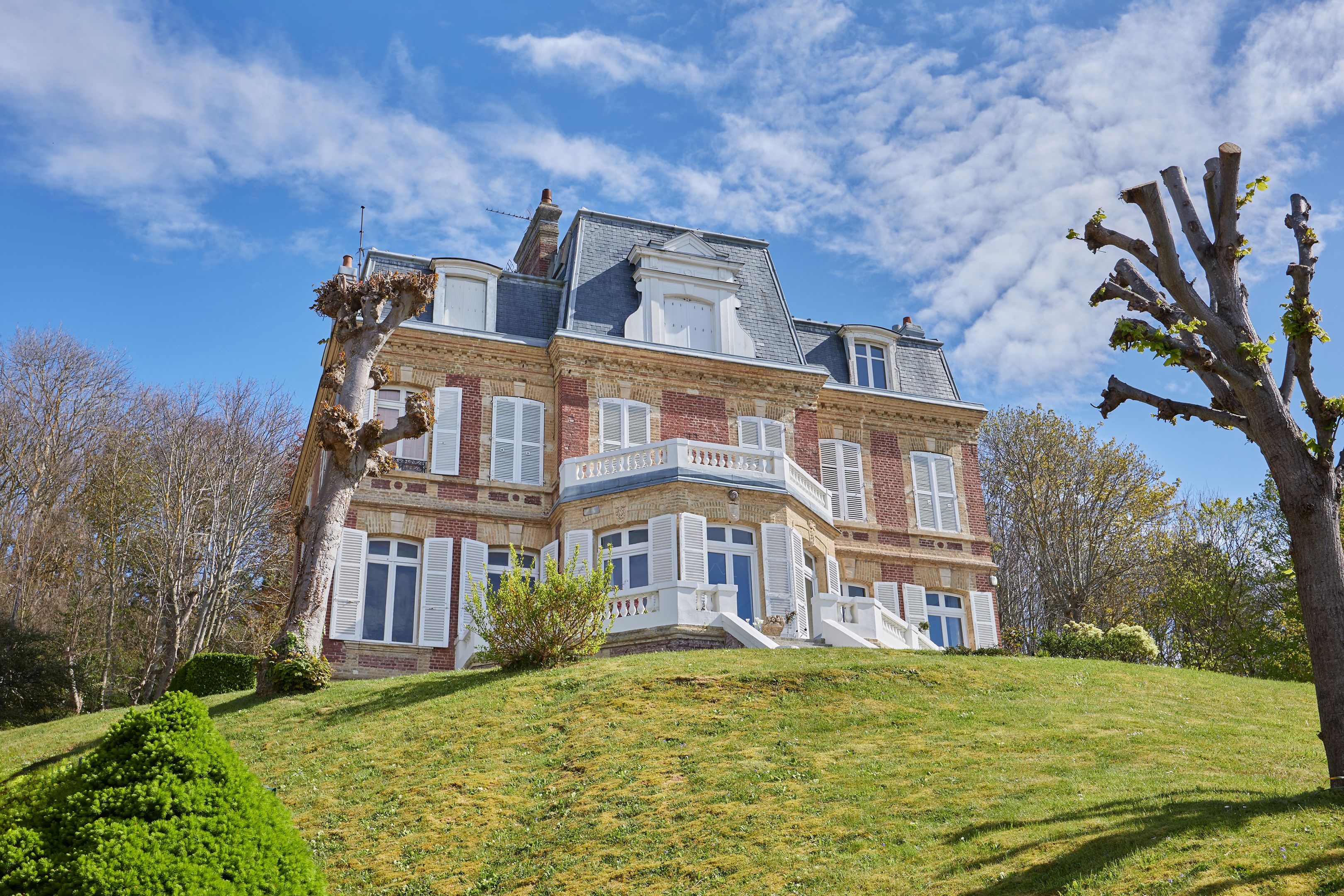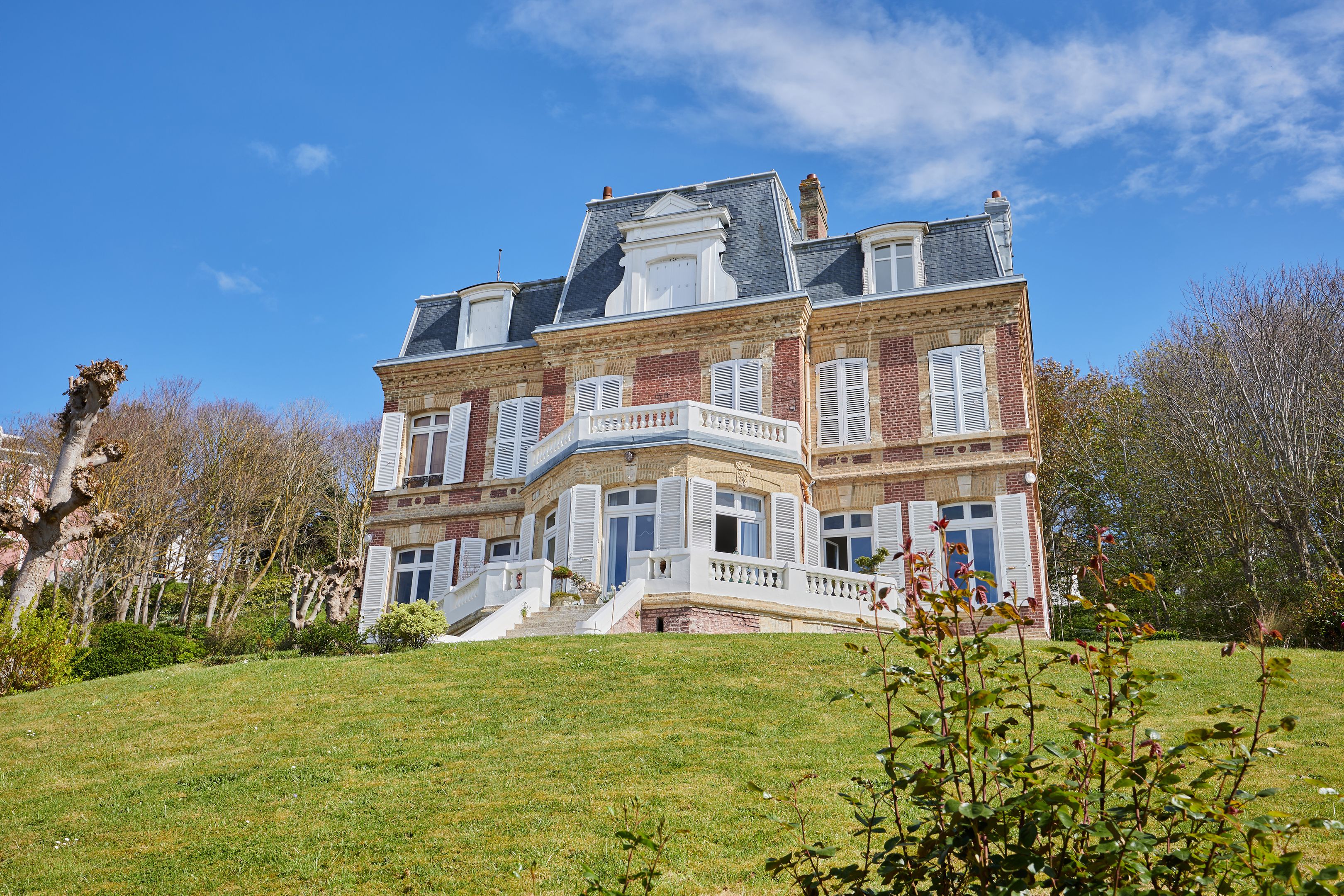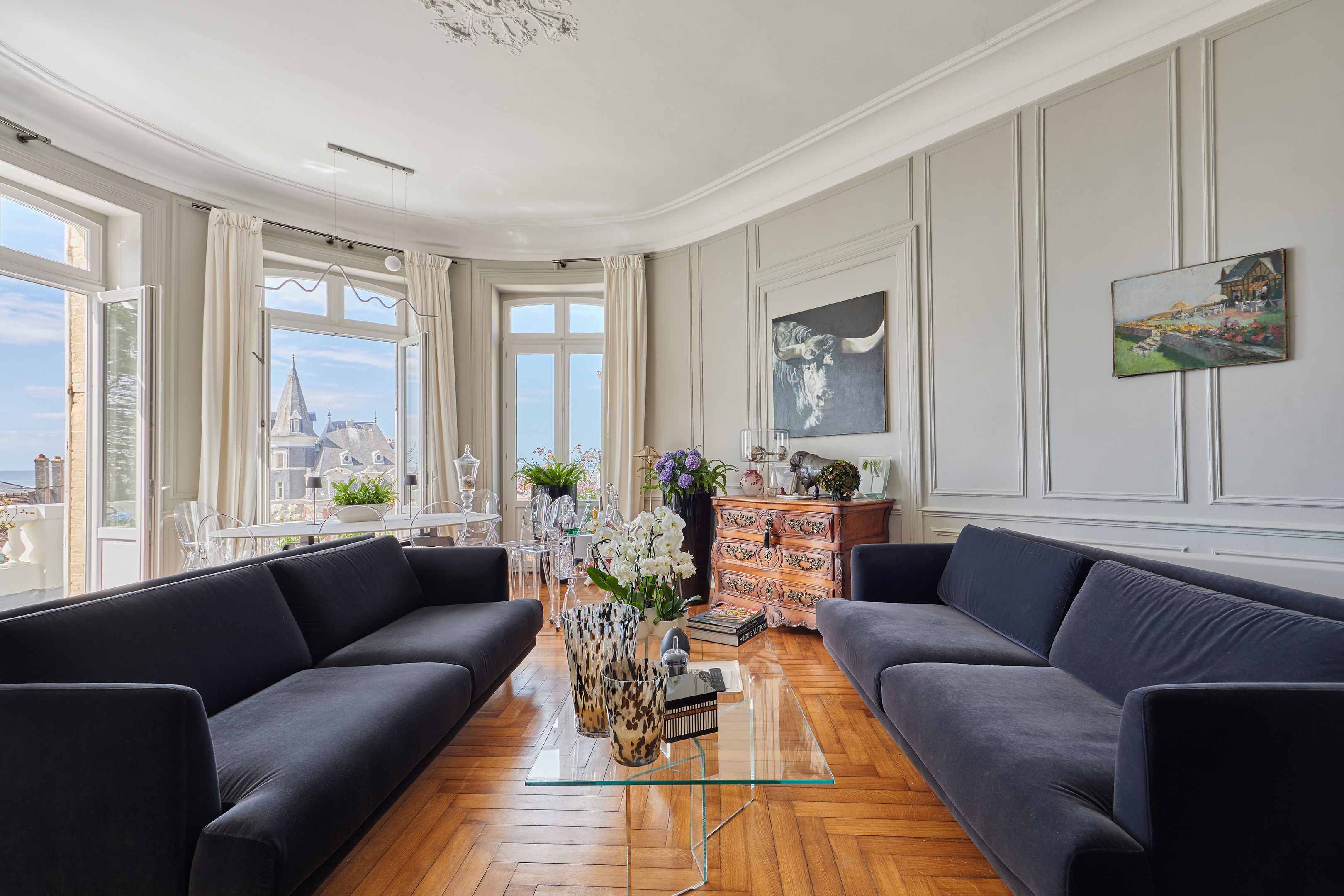 Less than 500 m from rue des Bains, on the 2nd line of the seafront, magnificent 88 m² fully renovated apartment on the raised first floor of an elegant character villa dating from 1880. Entrance hall, living room opening onto the terrace with views of the sea and the Villas trouvillaises, independent fitted kitchen, two bedrooms, one with bath, shower room. The apartment benefits from high ceilings (3.6 m) and has been renovated to a very high standard. Cellar and two parking spaces.