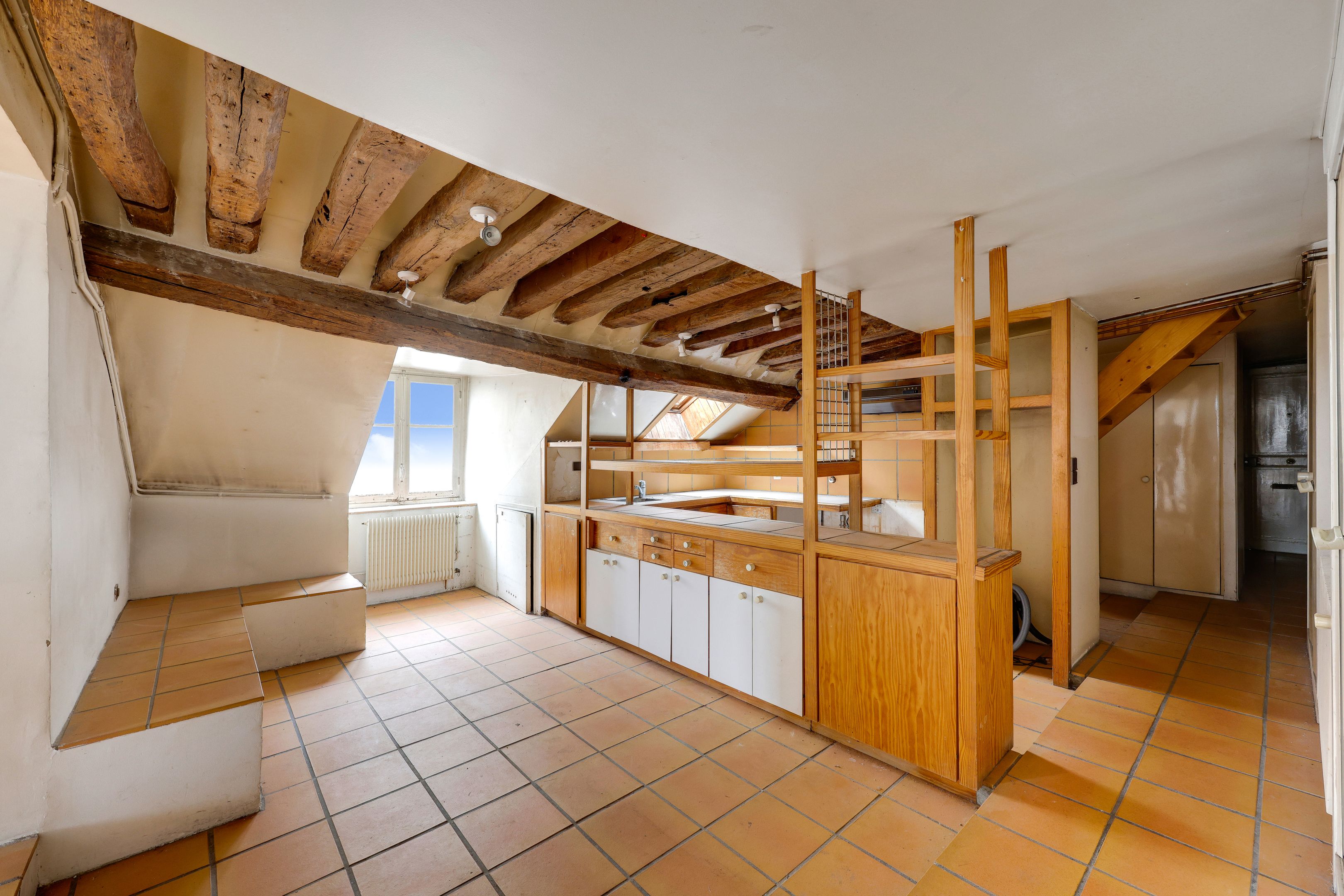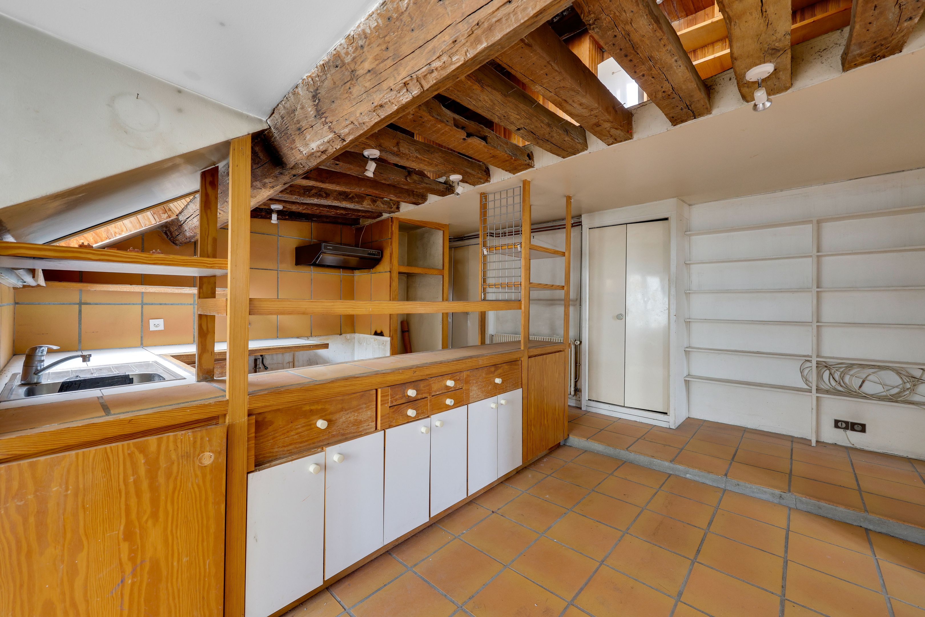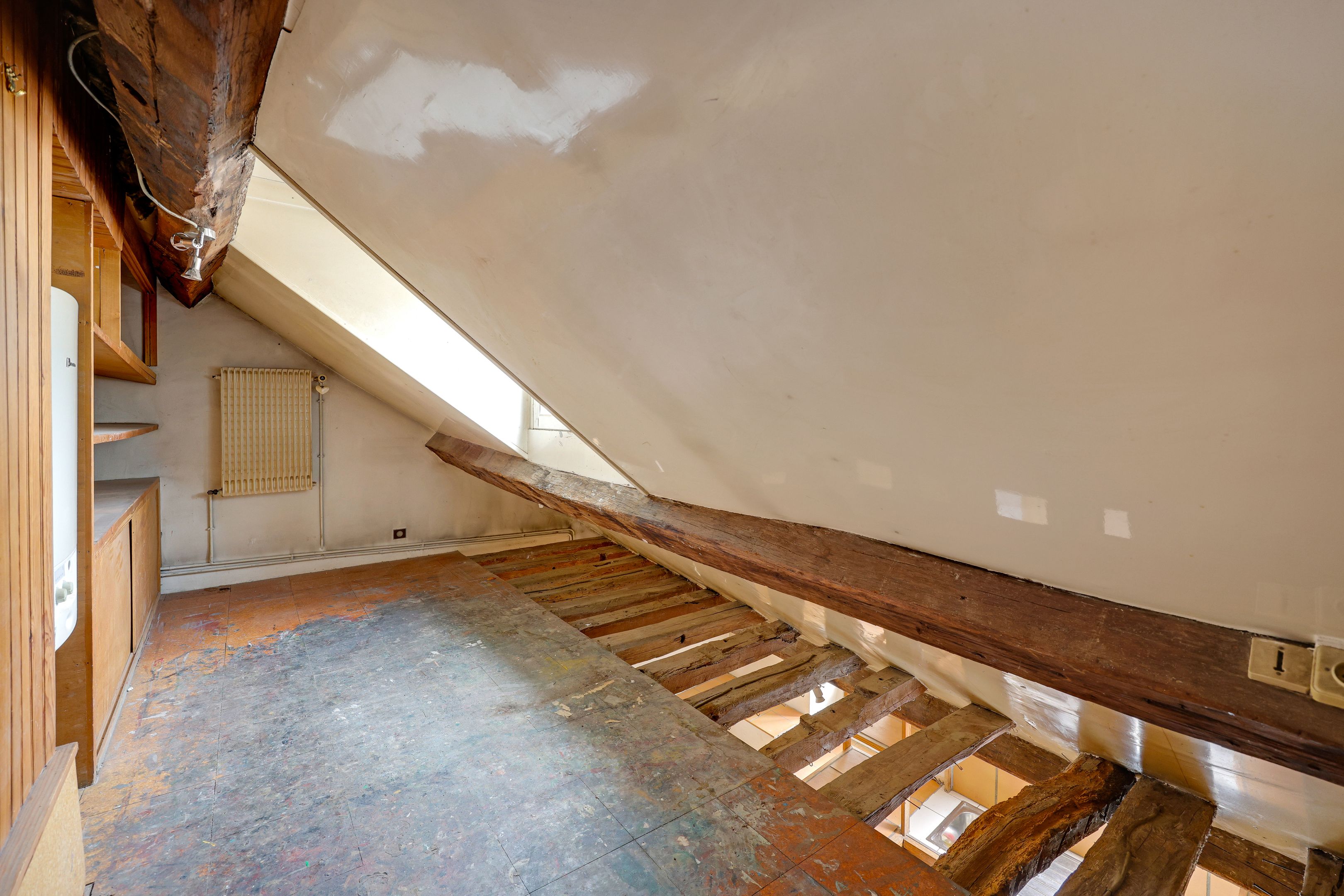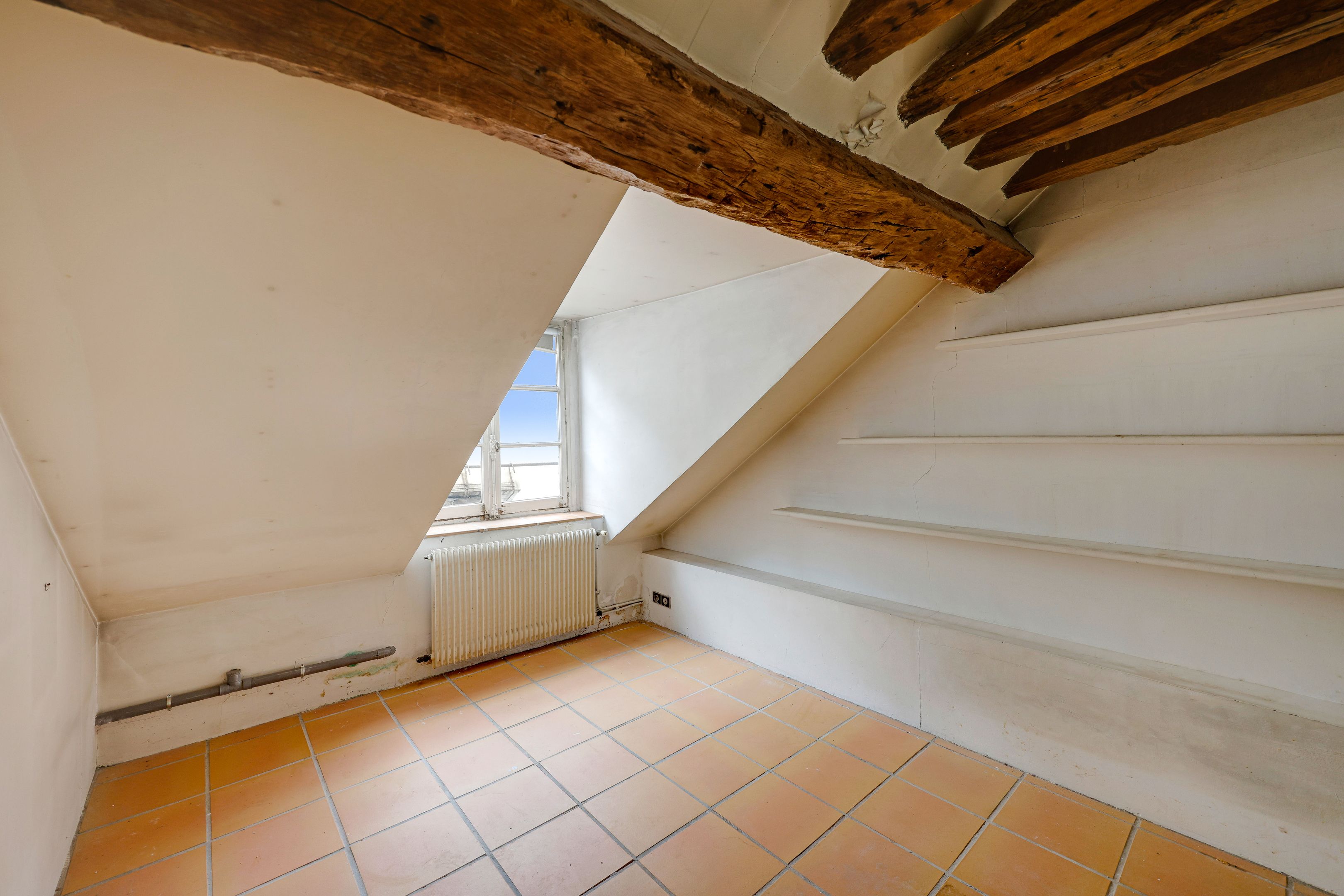 Between Carreau du Temple and rue de Turenne, in an exceptional setting and in the heart of a former 18th-century town house opening onto a garden, duplex 75m2 sq. ft. apartment to be completely renovated, on the 4th and top floor by staircase. Double-exposed living room with cathedral ceiling, semi-open kitchen, attic bedroom and storage space. In the attic, accessible via a private staircase, bathroom, shower and toilet. Cellar.