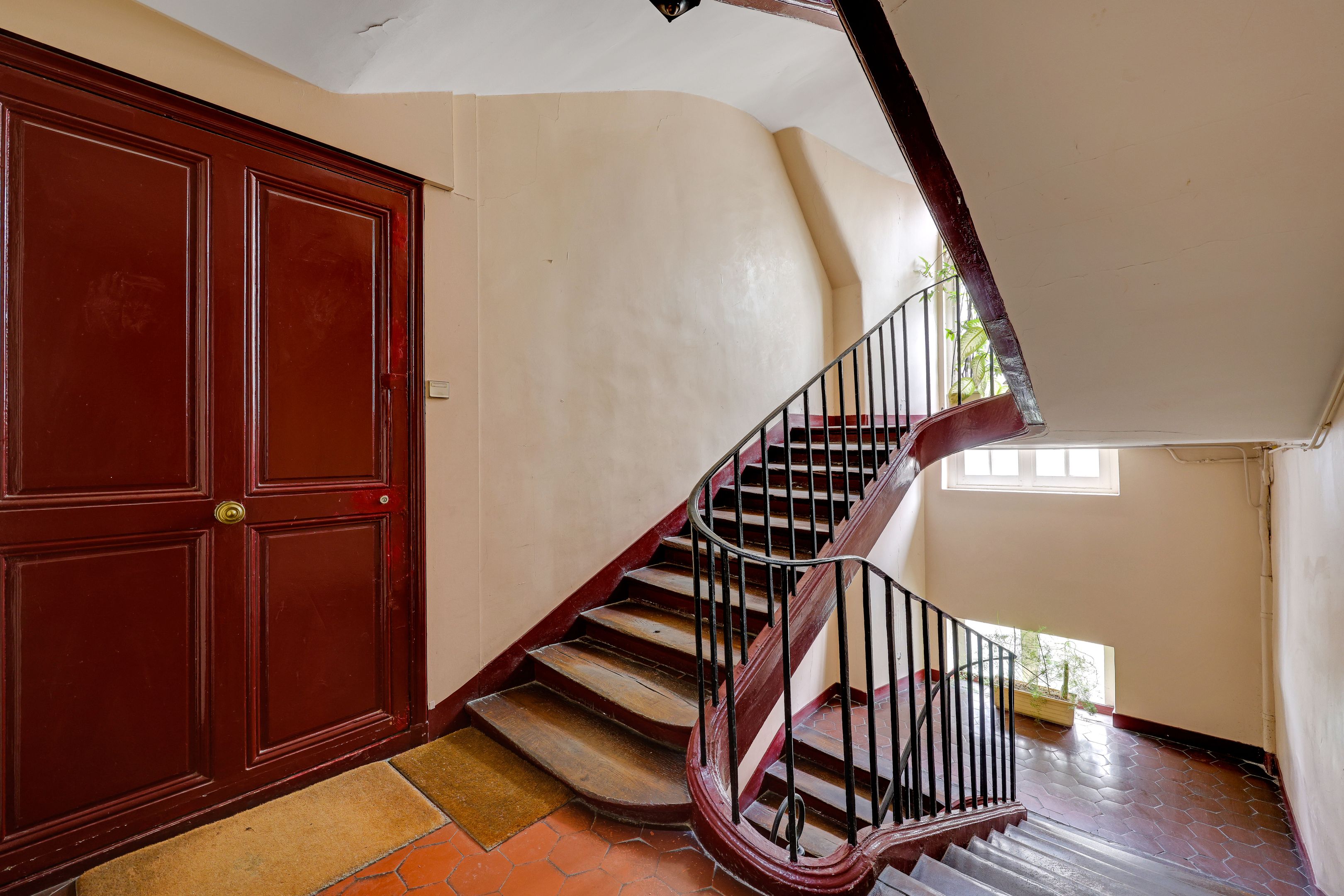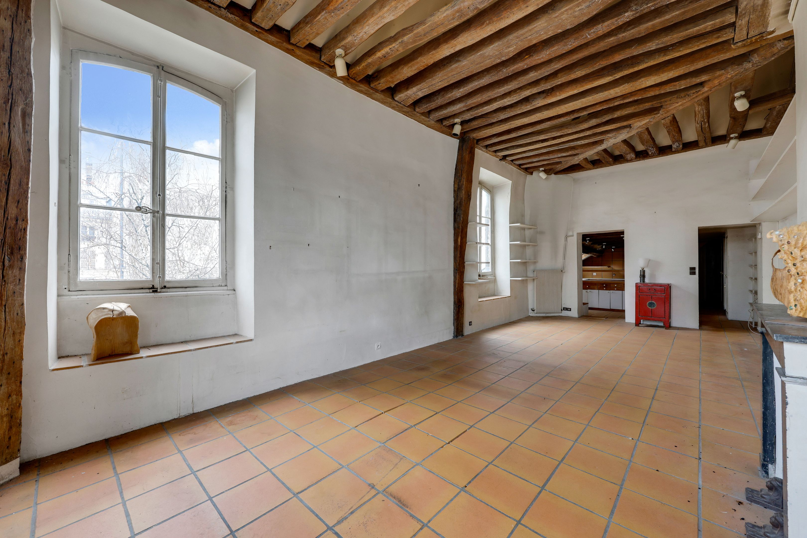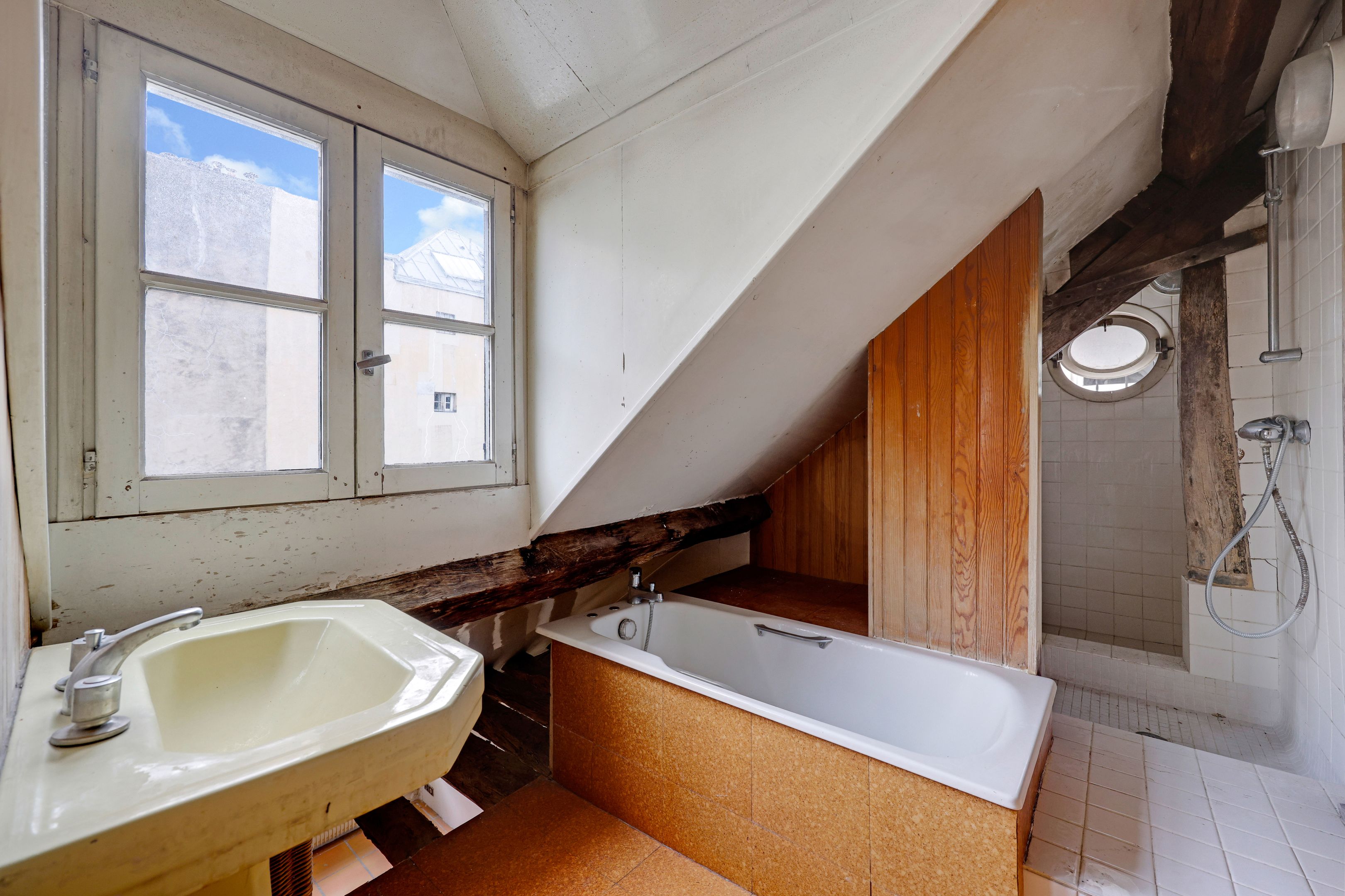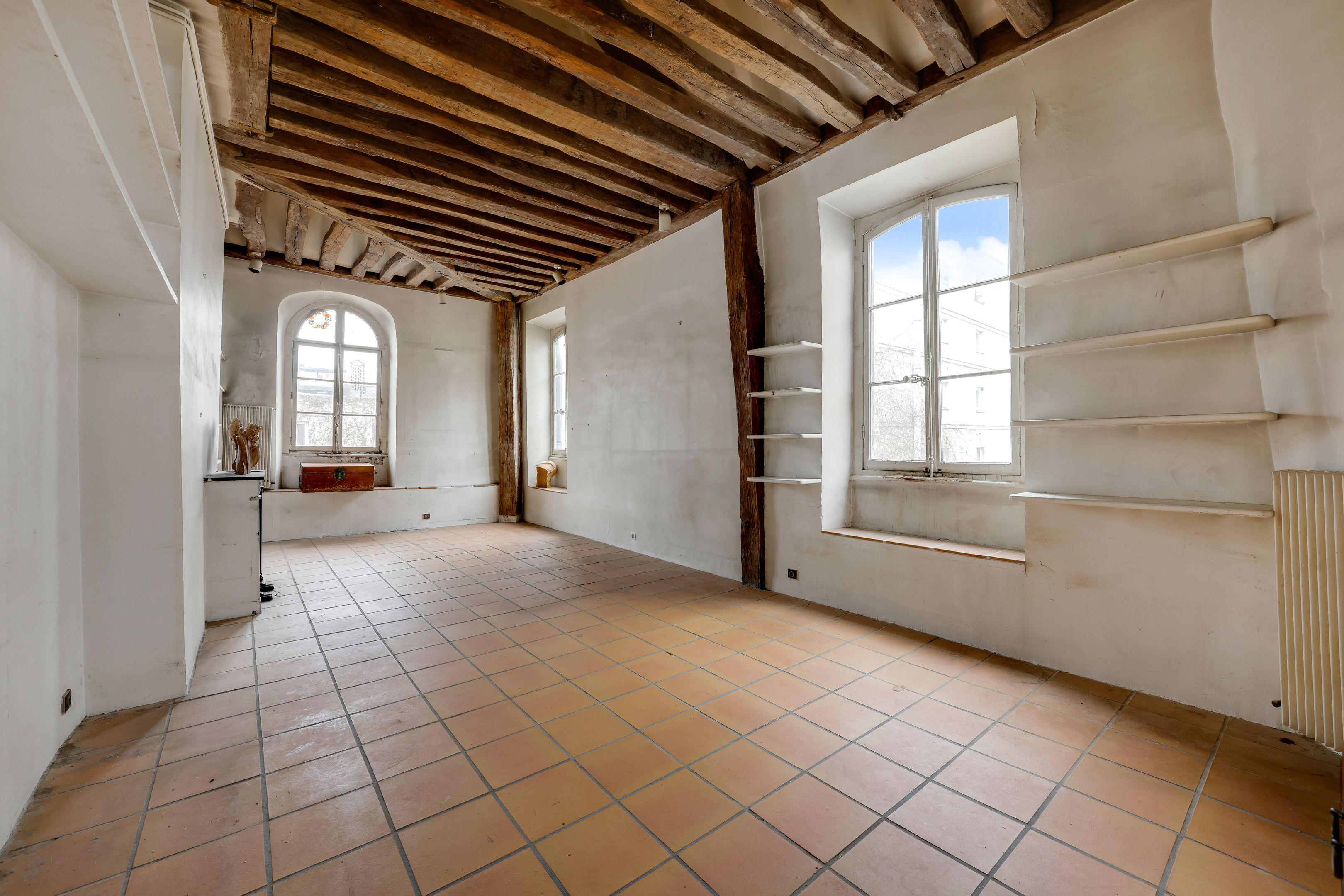 Between Carreau du Temple and rue de Turenne, in an exceptional setting and in the heart of a former 18th-century town house opening onto a garden, duplex 75m2 sq. ft. apartment to be completely renovated, on the 4th and top floor by staircase. Double-exposed living room with cathedral ceiling, semi-open kitchen, attic bedroom and storage space. In the attic, accessible via a private staircase, bathroom, shower and toilet. Cellar.