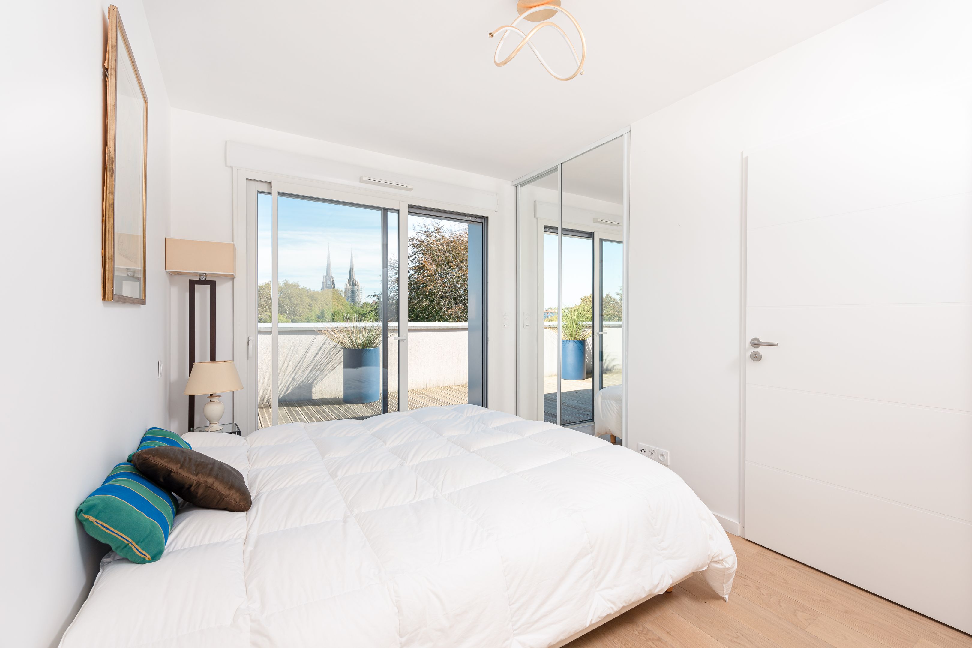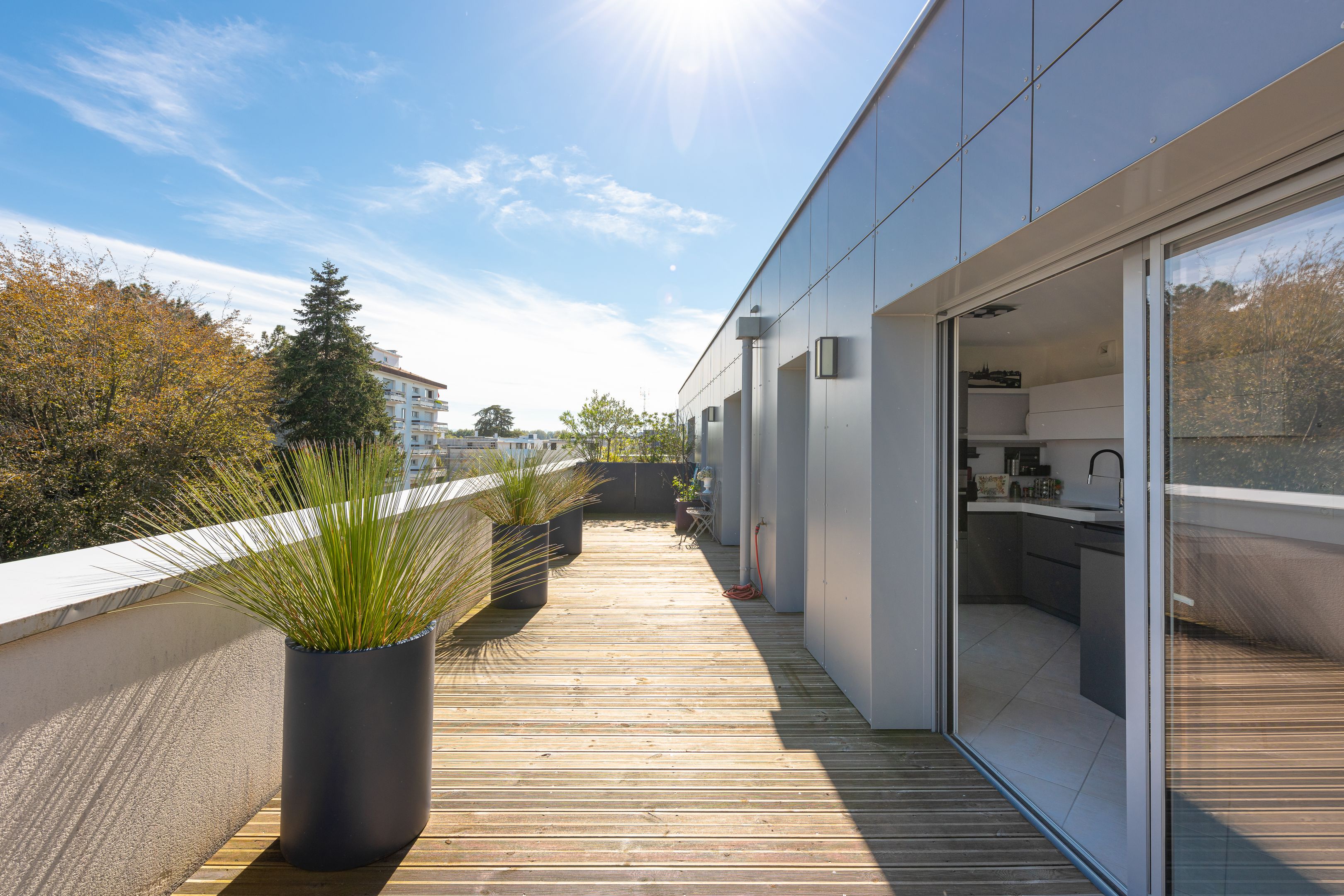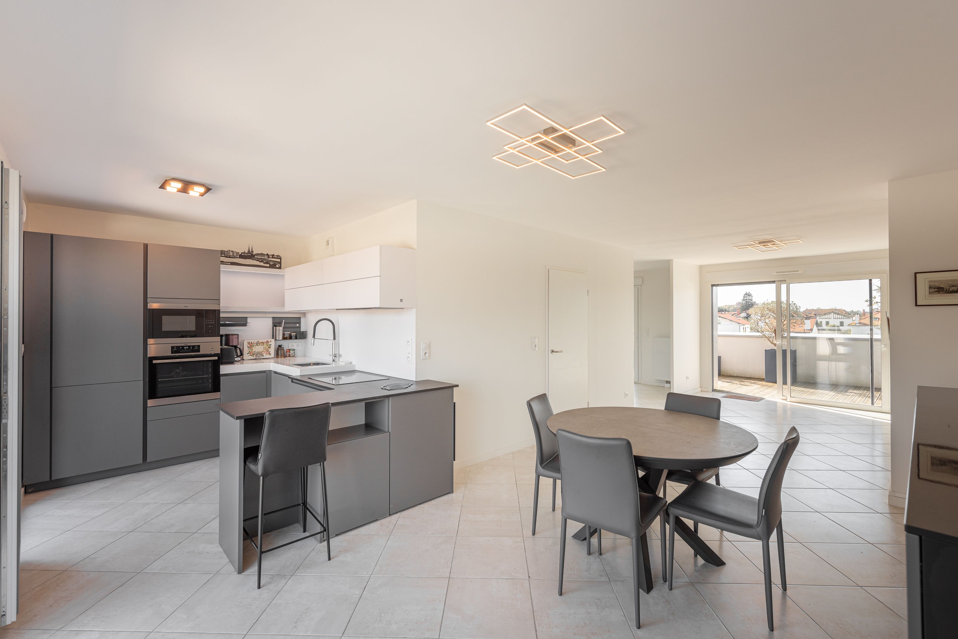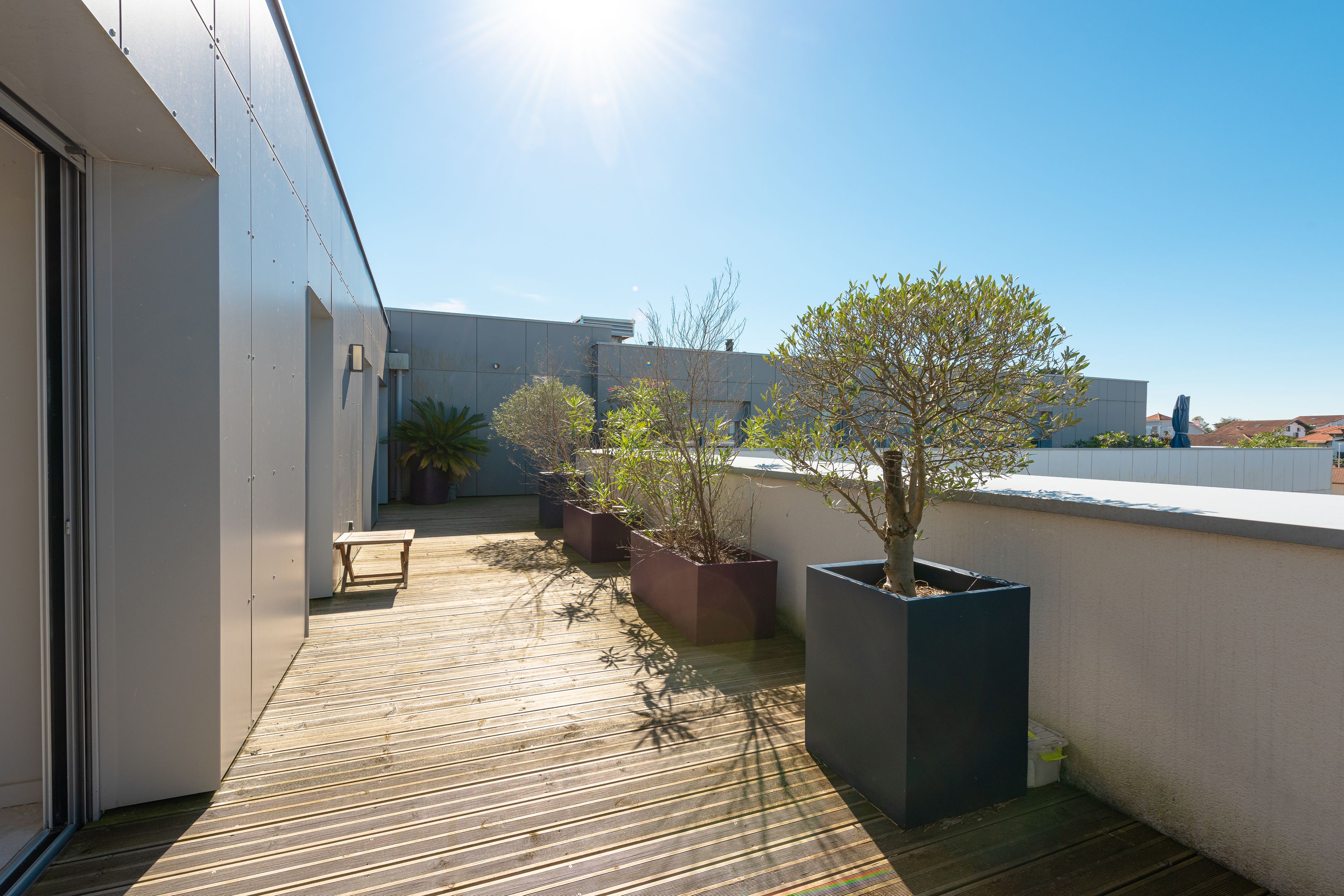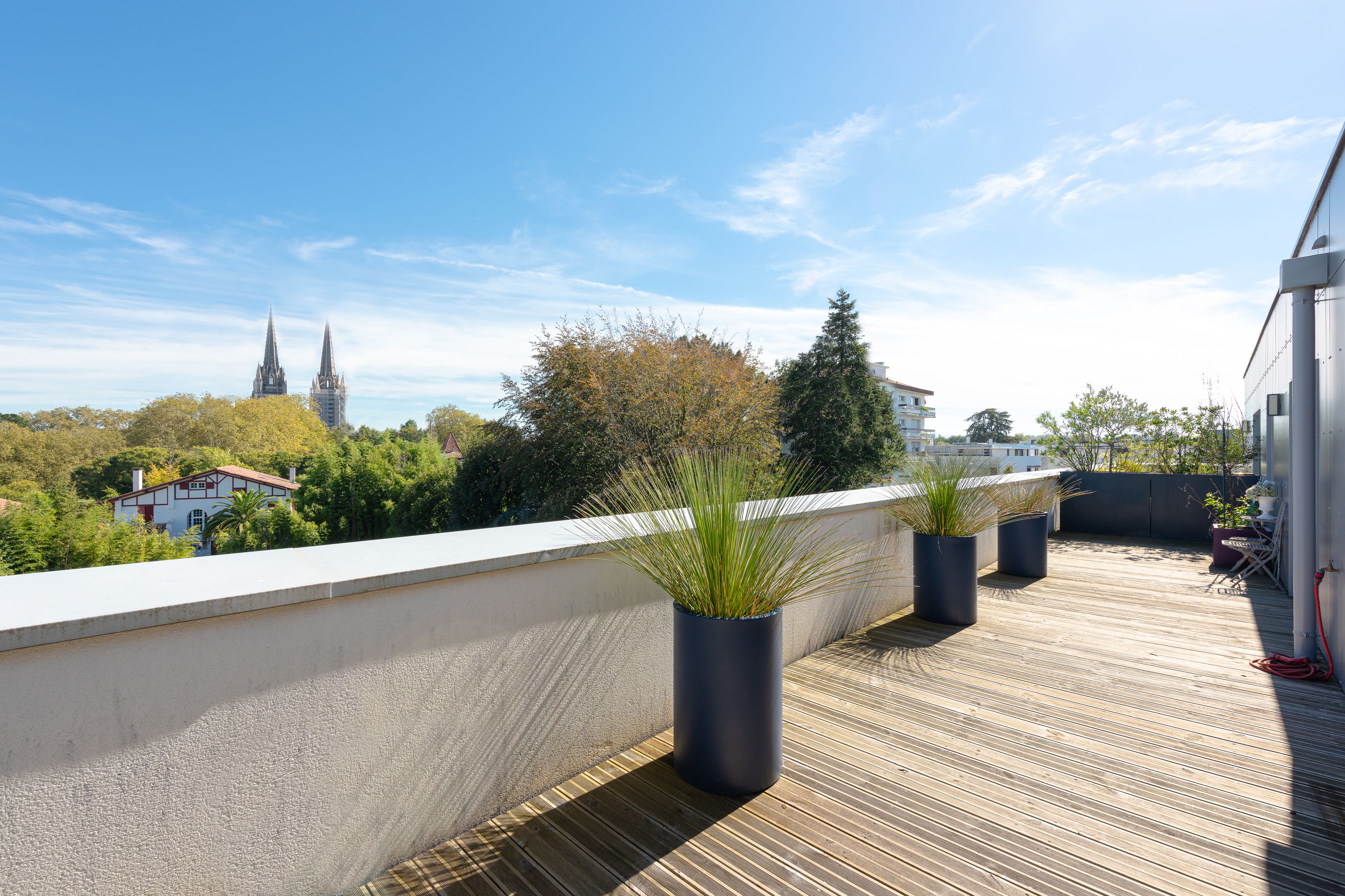 In the heart of Bayonne's sought-after "Arènes" district, recent luxury residence. Located on the 4th and top floor, served by elevator, bright 112m² east-west facing apartment with 2 beautiful terraces of 35 m² each, offering unobstructed views. Entrance hall, double living room with open-plan kitchen, three bedrooms with fitted closets, 3 shower rooms. 2 private underground parking spaces.