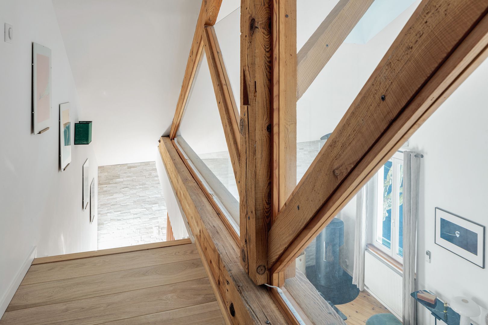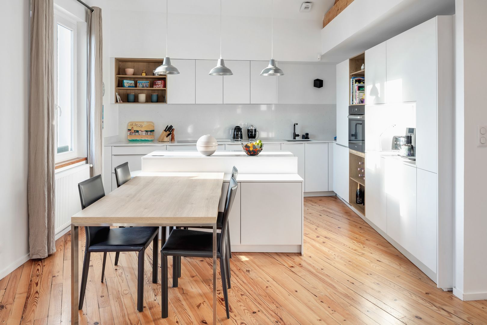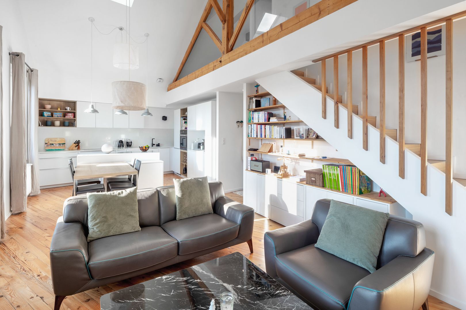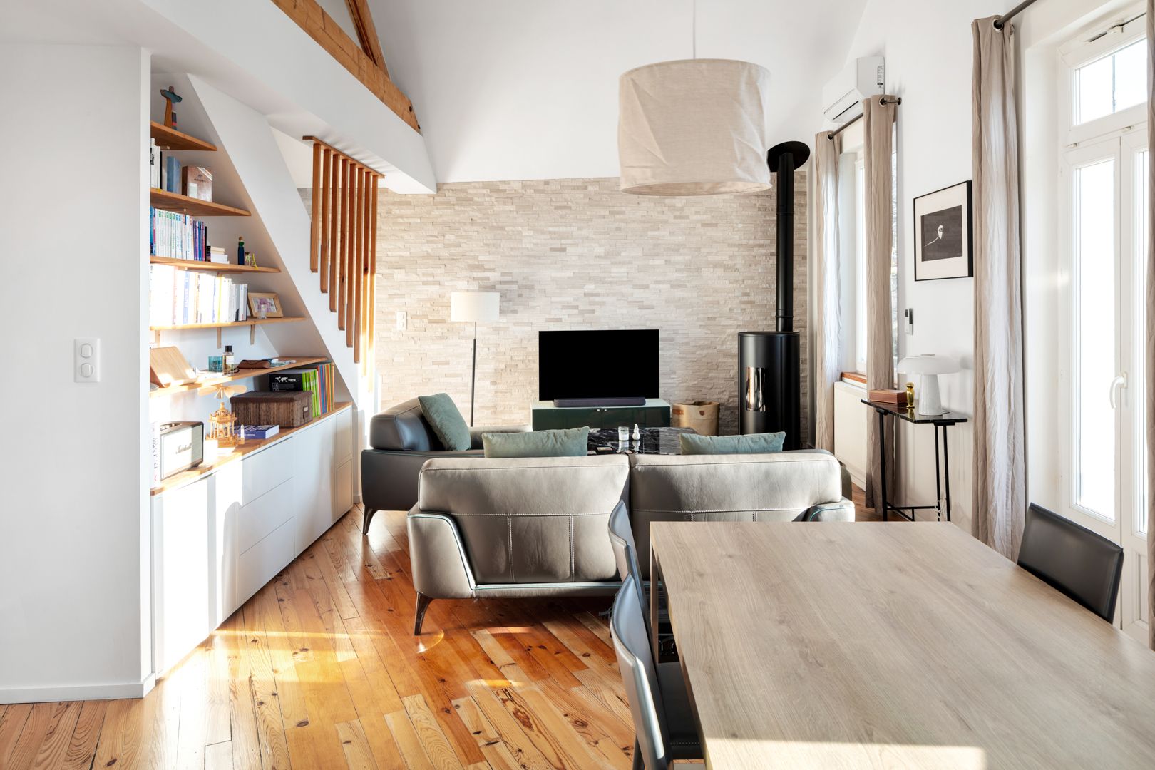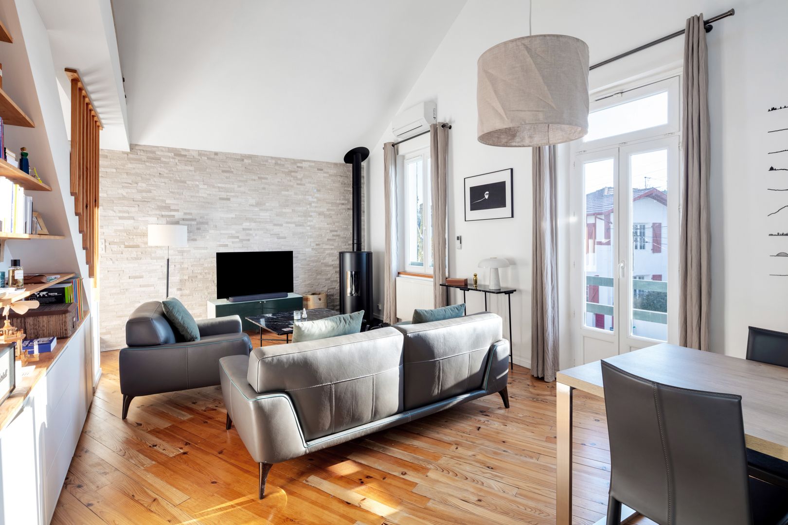 Biarritz, a stone's throw from the Connecteur, loft conversion of a former artist's studio offering 114.06 m² of living space (95.73 m² Carrez). The generous volume of the original floor plan enabled the architect to work on a duplex configuration. The entrance hall, fully equipped with storage space, leads to the 34 m² reception area, with its ceiling removed. A cosy living room with a wood-burning stove and a convivial, dinatory kitchen make up the living area, which benefits from plenty of light and access to a balcony. Two pleasant bedrooms with fitted closets, shower rooms and toilets complete this level. To complete the night space, a third bedroom with en-suite shower room and toilet is located upstairs, under a magnificent wooden roof structure.