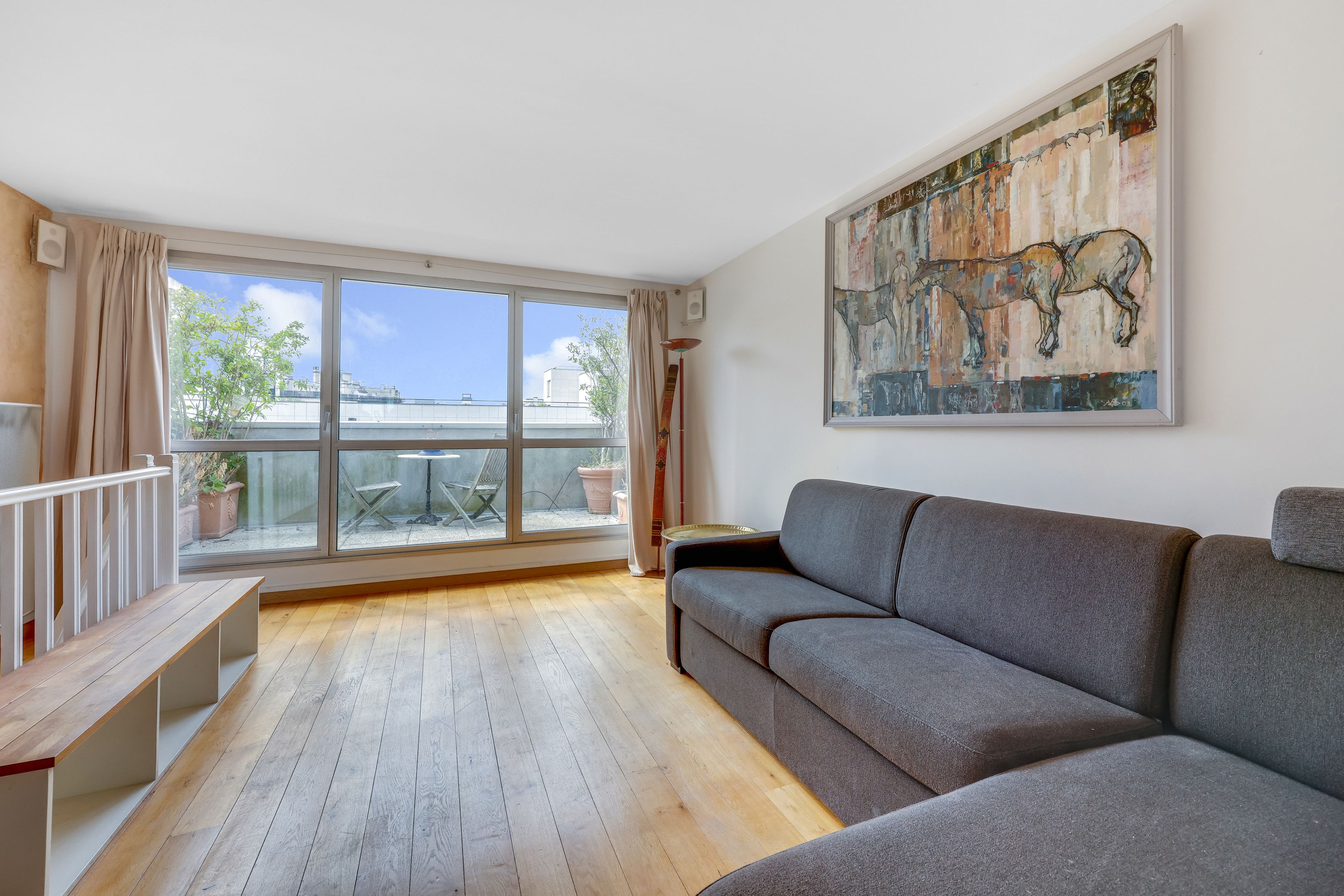 Ideally located, close to Passages and transport, in a recent building, a 87m² triplex on the top floors. On the 5th floor, it comprises an entrance hall, two bedrooms with their own bathrooms and toilets; on the 6th floor, an open-plan fitted kitchen, a living room with a terrace on the same level; on the 7th floor, a roof terrace. Entry phone.