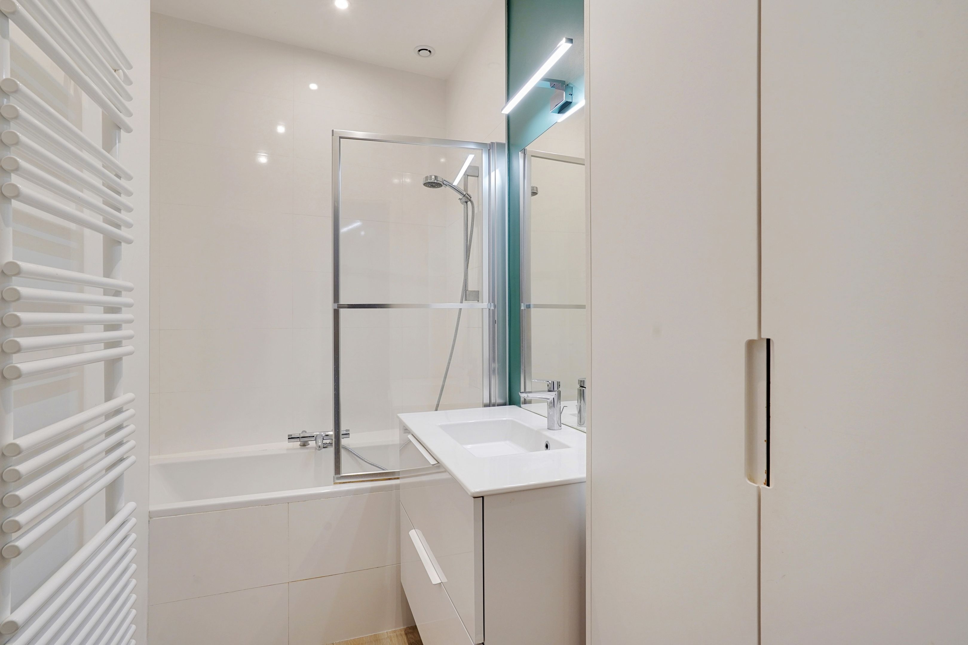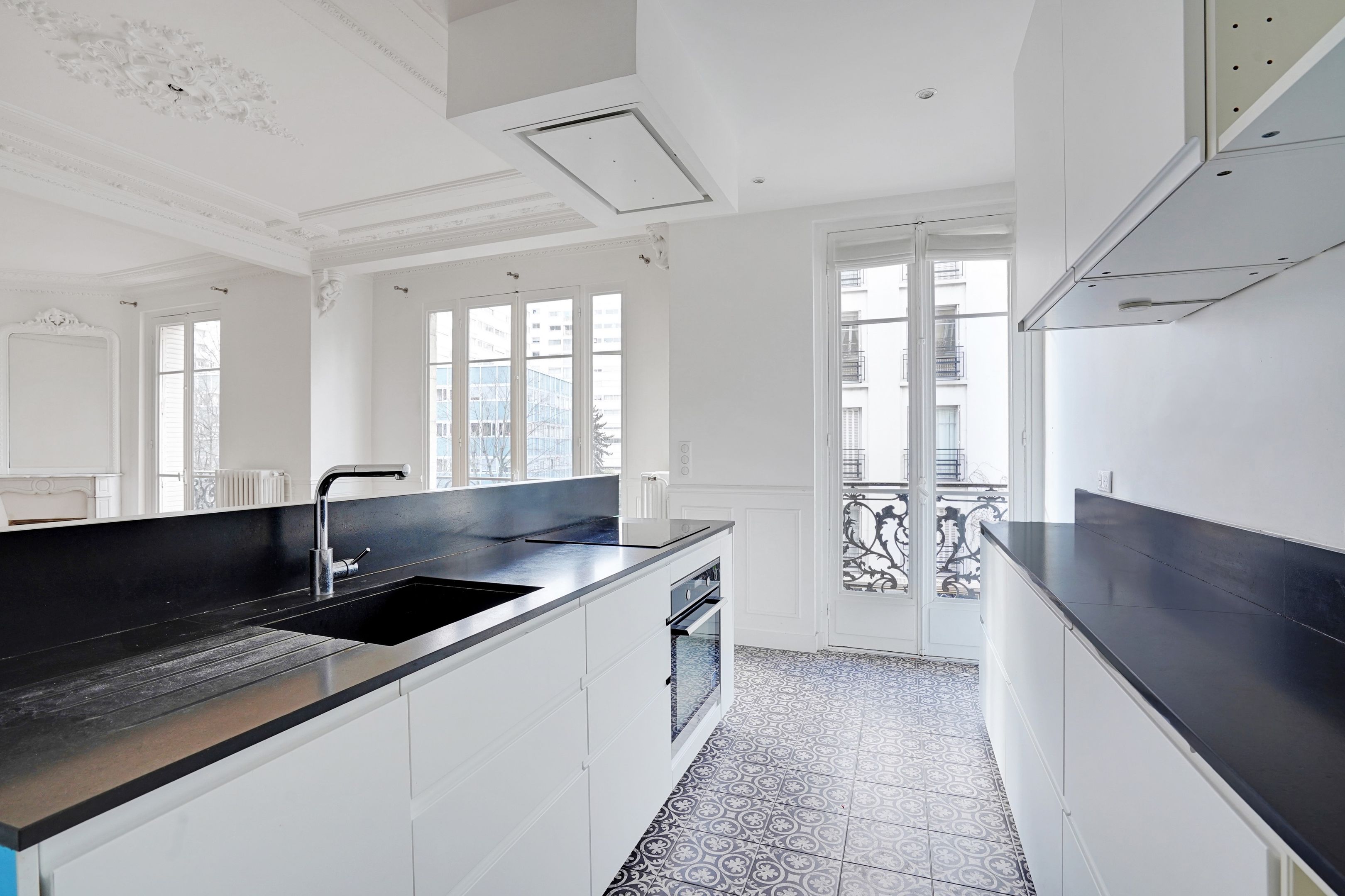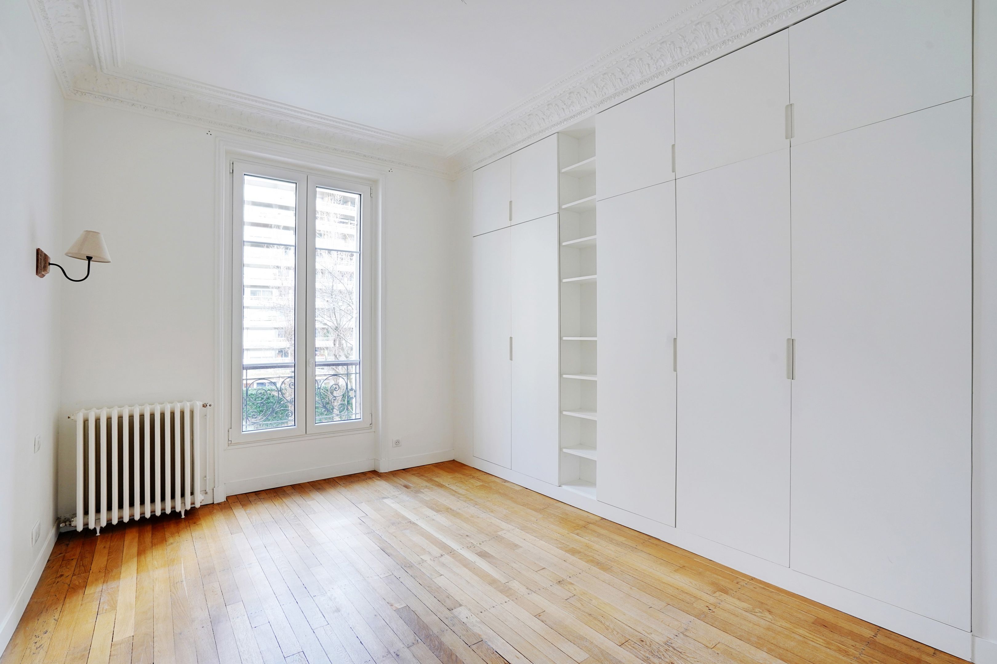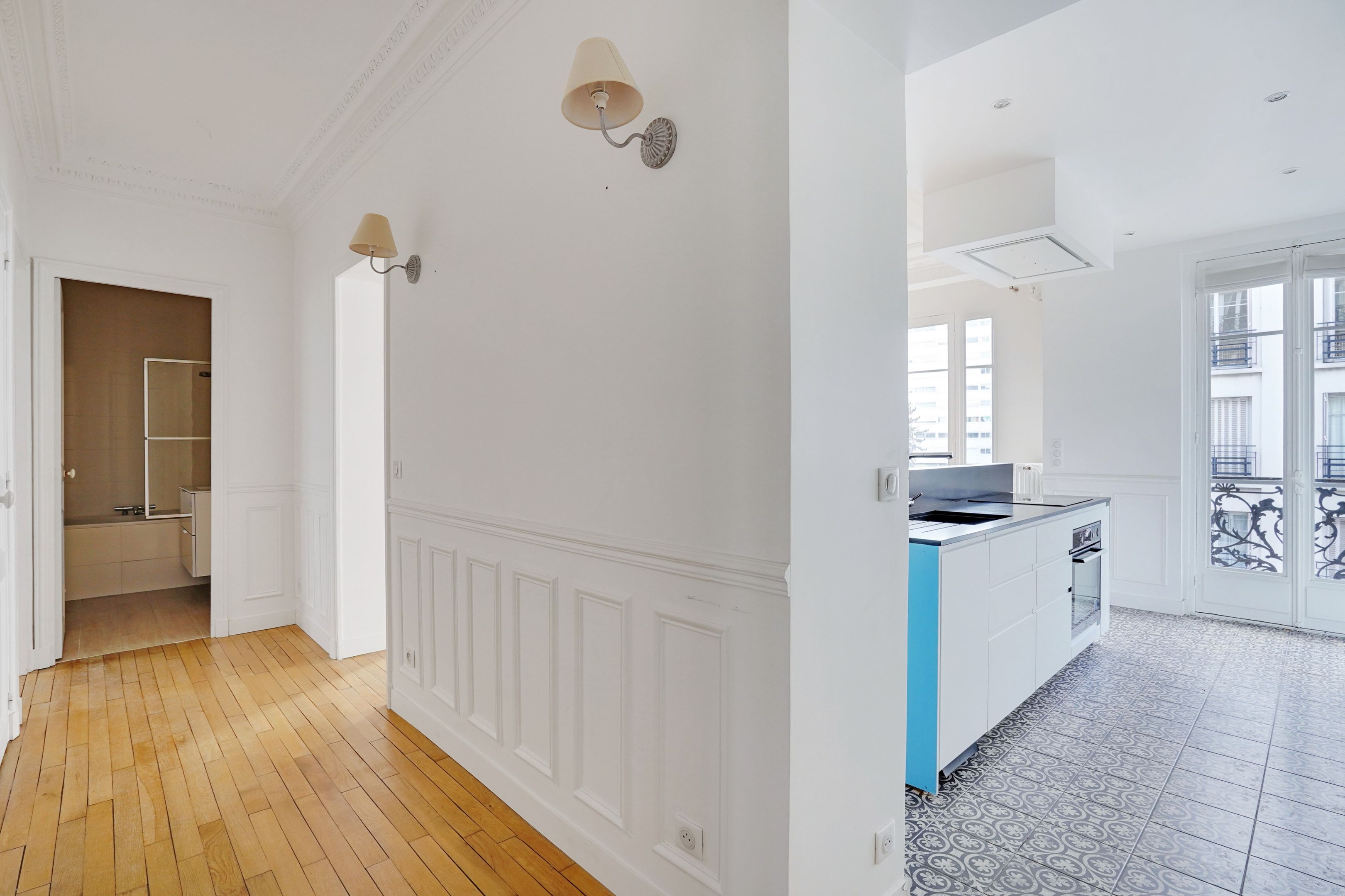 Excellent quality stone building with janitor service, very attractive 74m² through apartment on 2nd floor with elevator, balcony, bright (west-facing) and renovated with quality materials. Entrance hall, double reception room, open-plan fitted and equipped kitchen, two bedrooms opening onto garden, bathroom with bath, toilet. Old-style cachet. Plenty of storage space. Cellar.