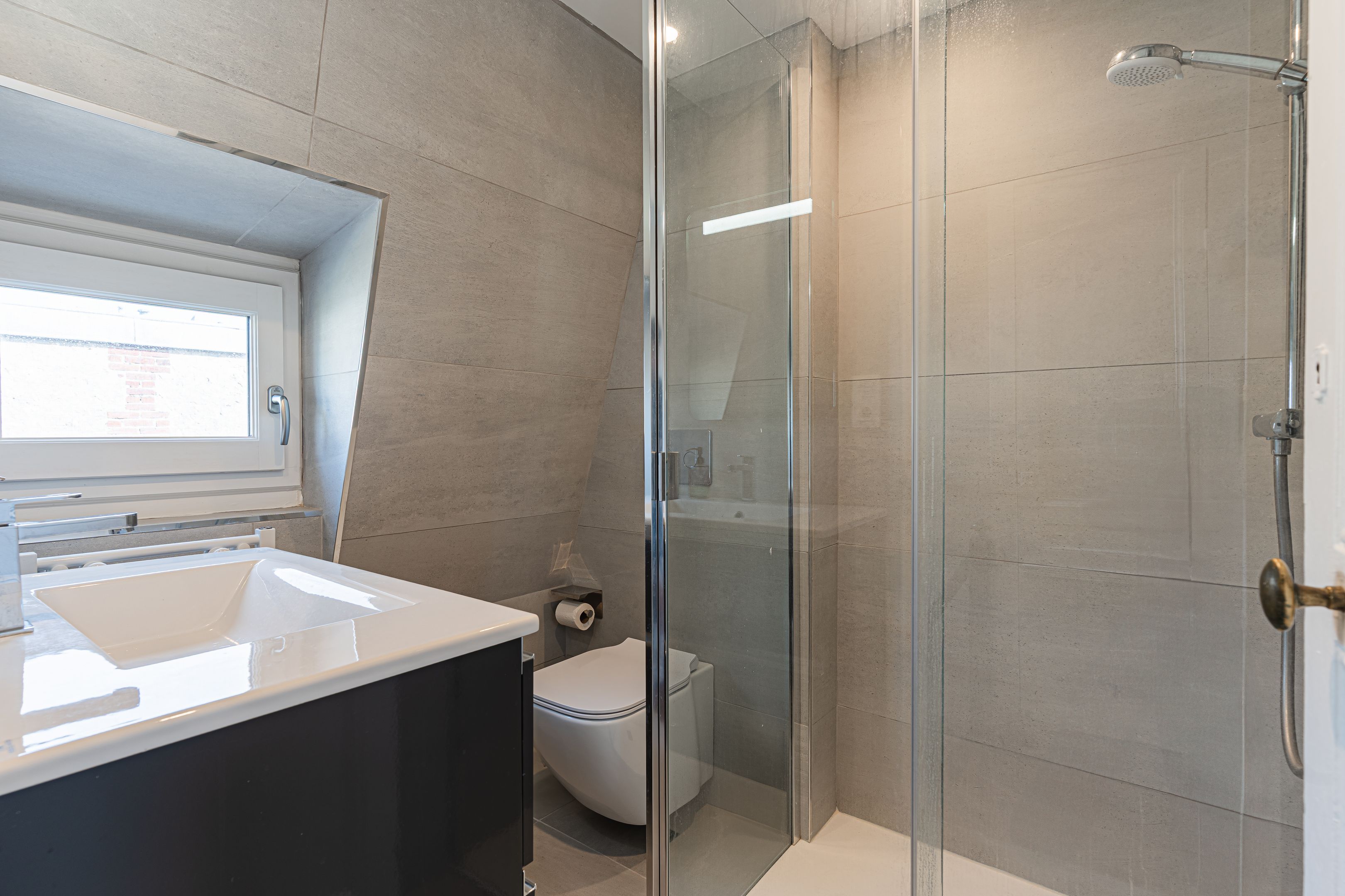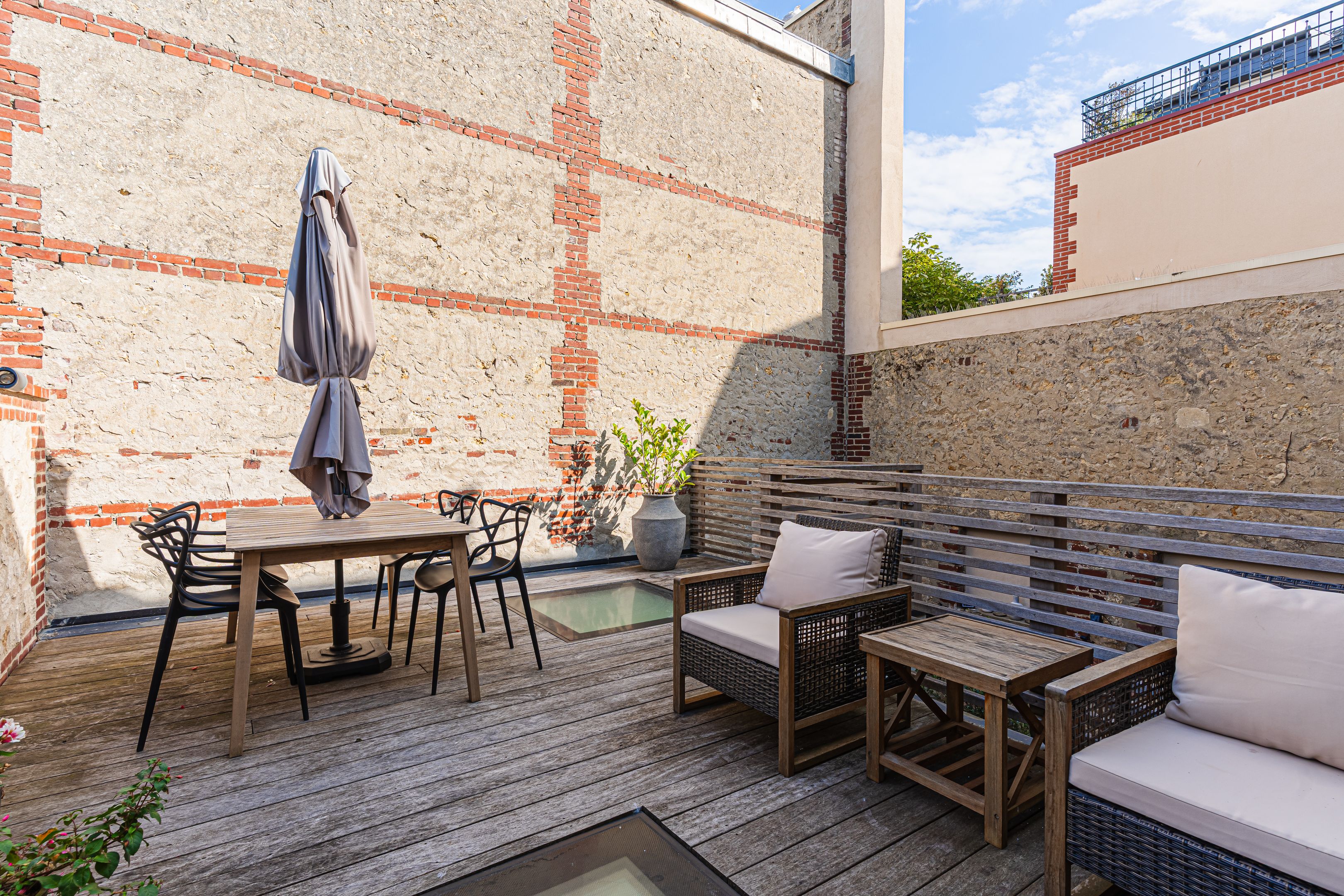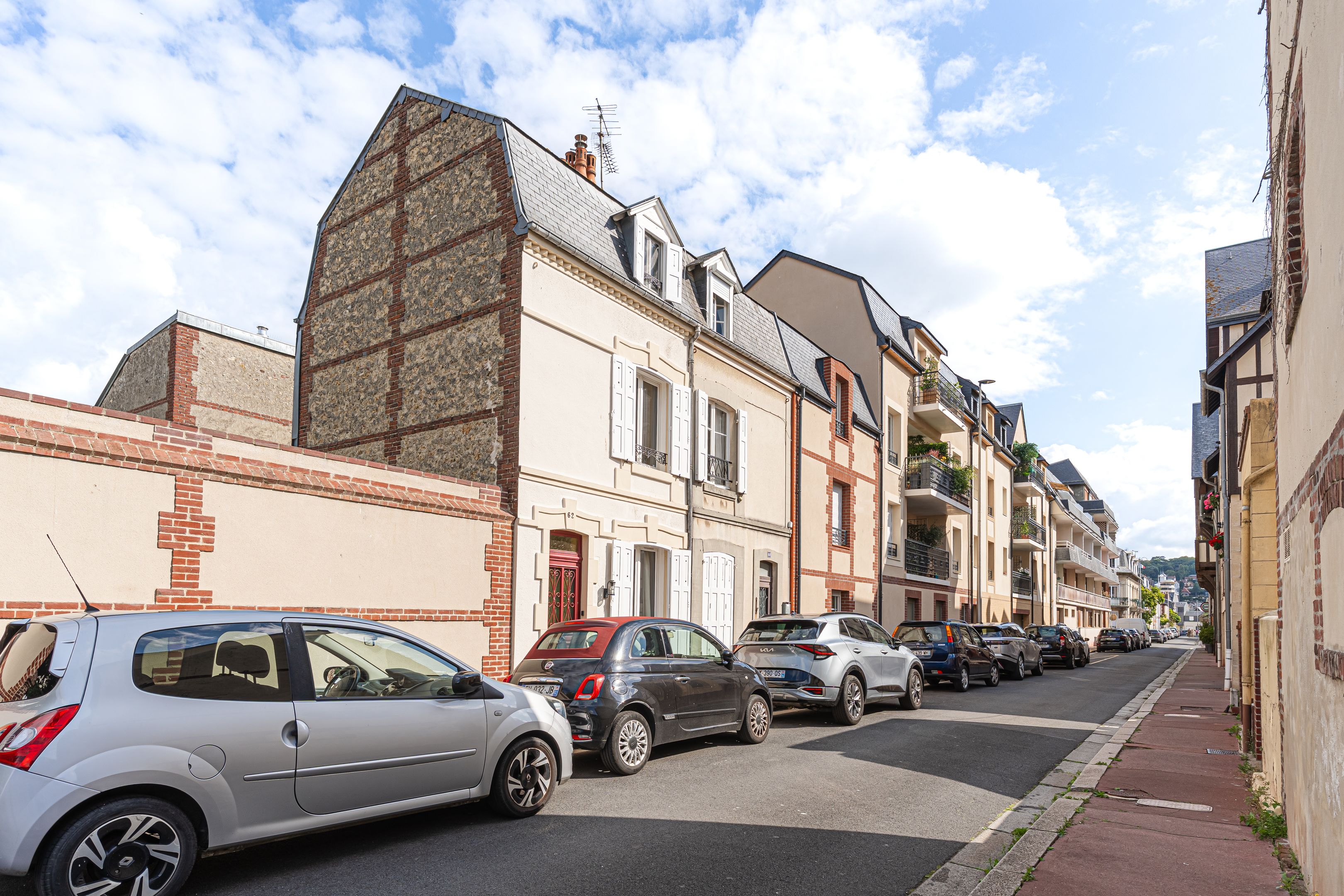 Exclusive Breteuil - Between Place Morny and the beach, charming renovated town house with terrace. First floor: living room, fitted and equipped kitchen, dining area, shower room, toilet. 1st floor: bedroom, shower room with toilet, access to north-west-facing terrace. 2nd floor: bedroom, shower room with toilet, cupboards. Basement: living room, laundry room.
