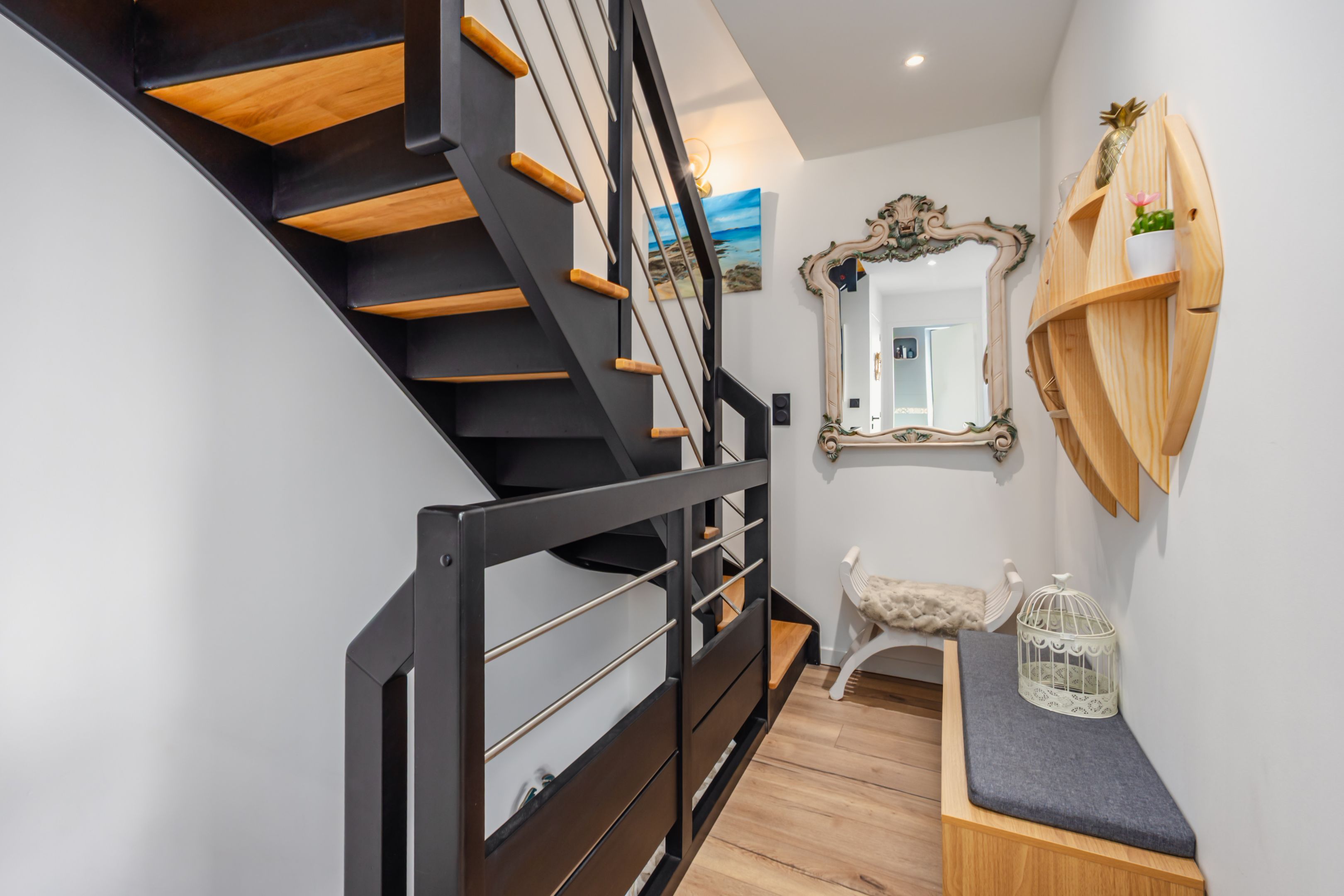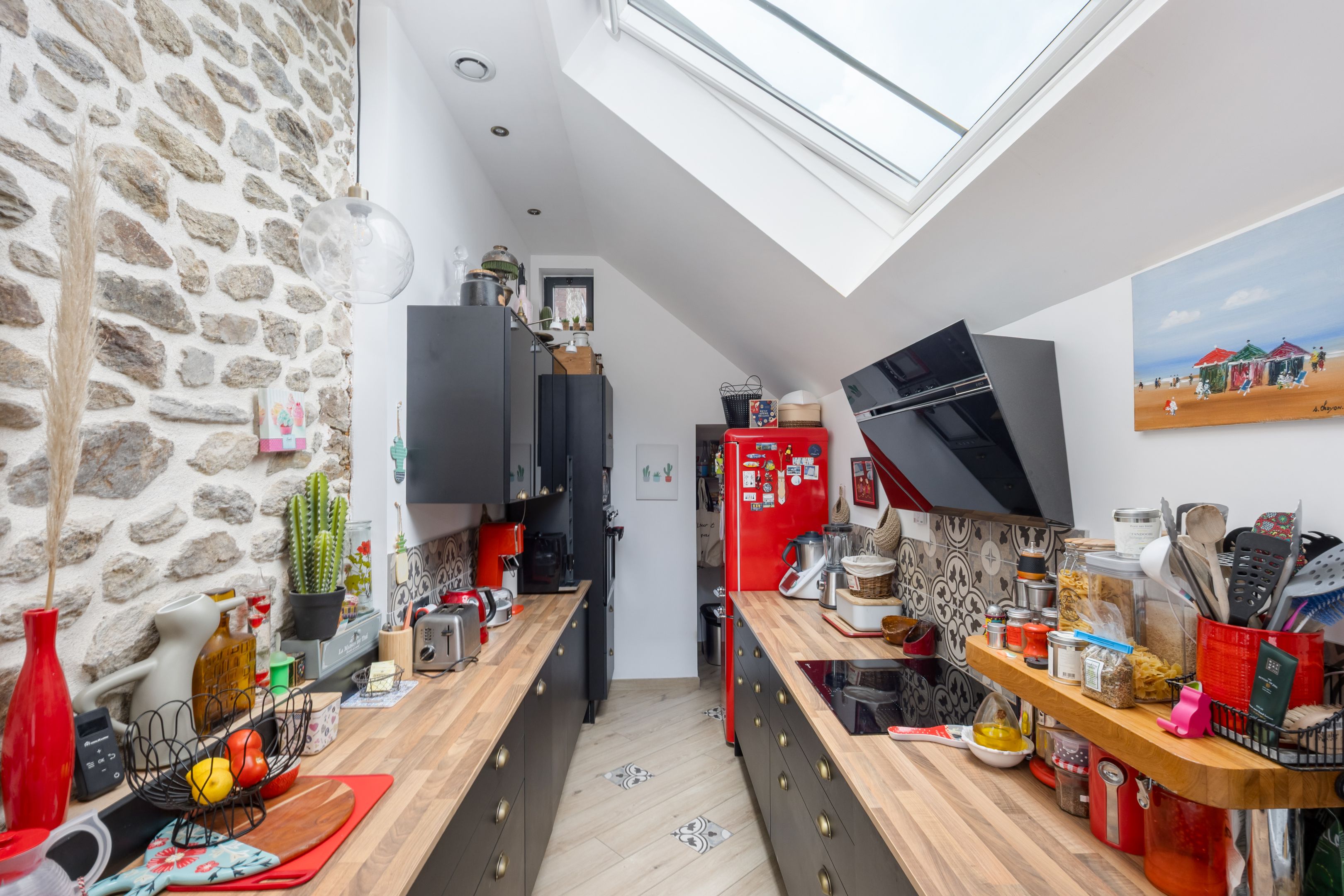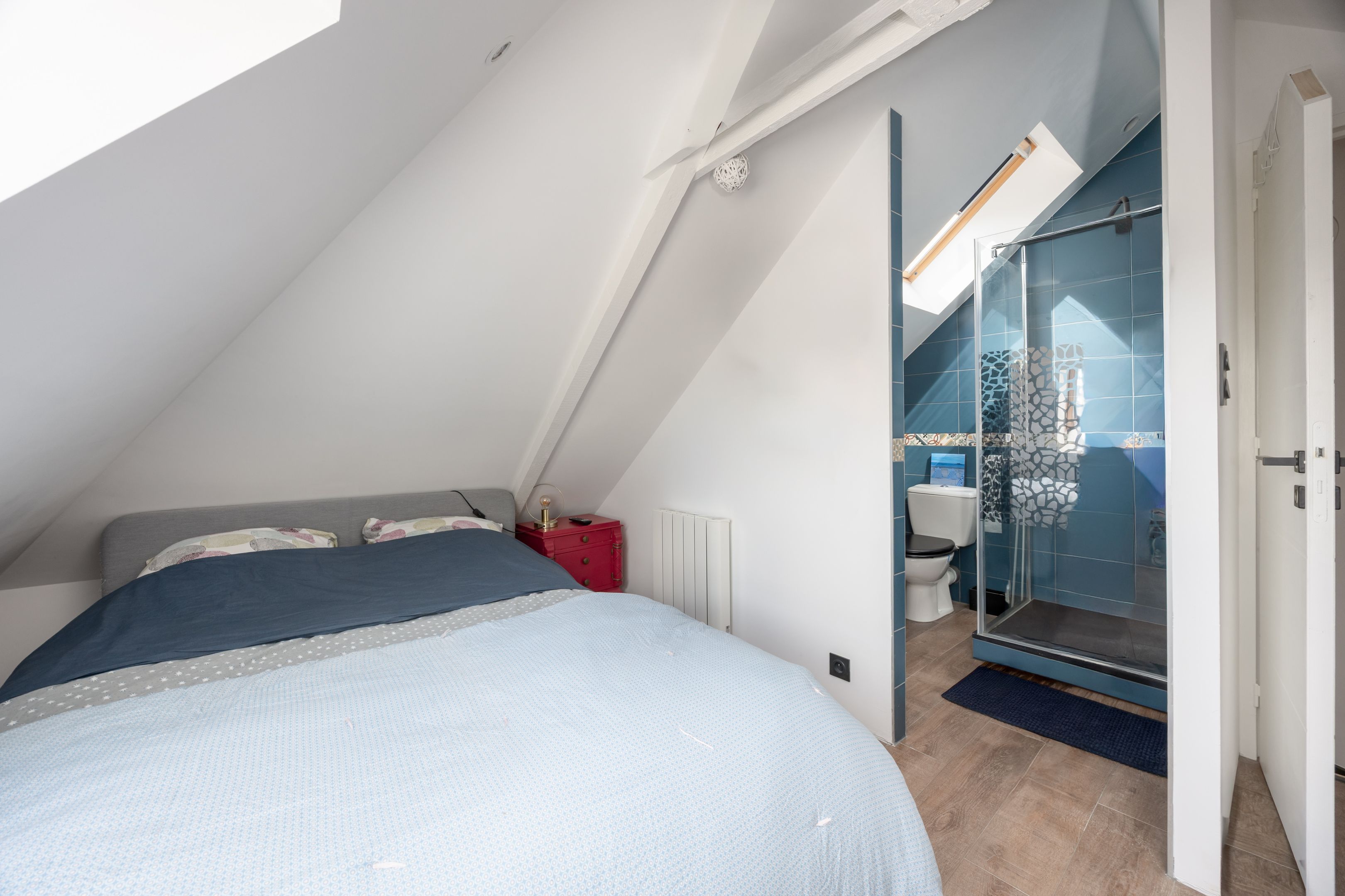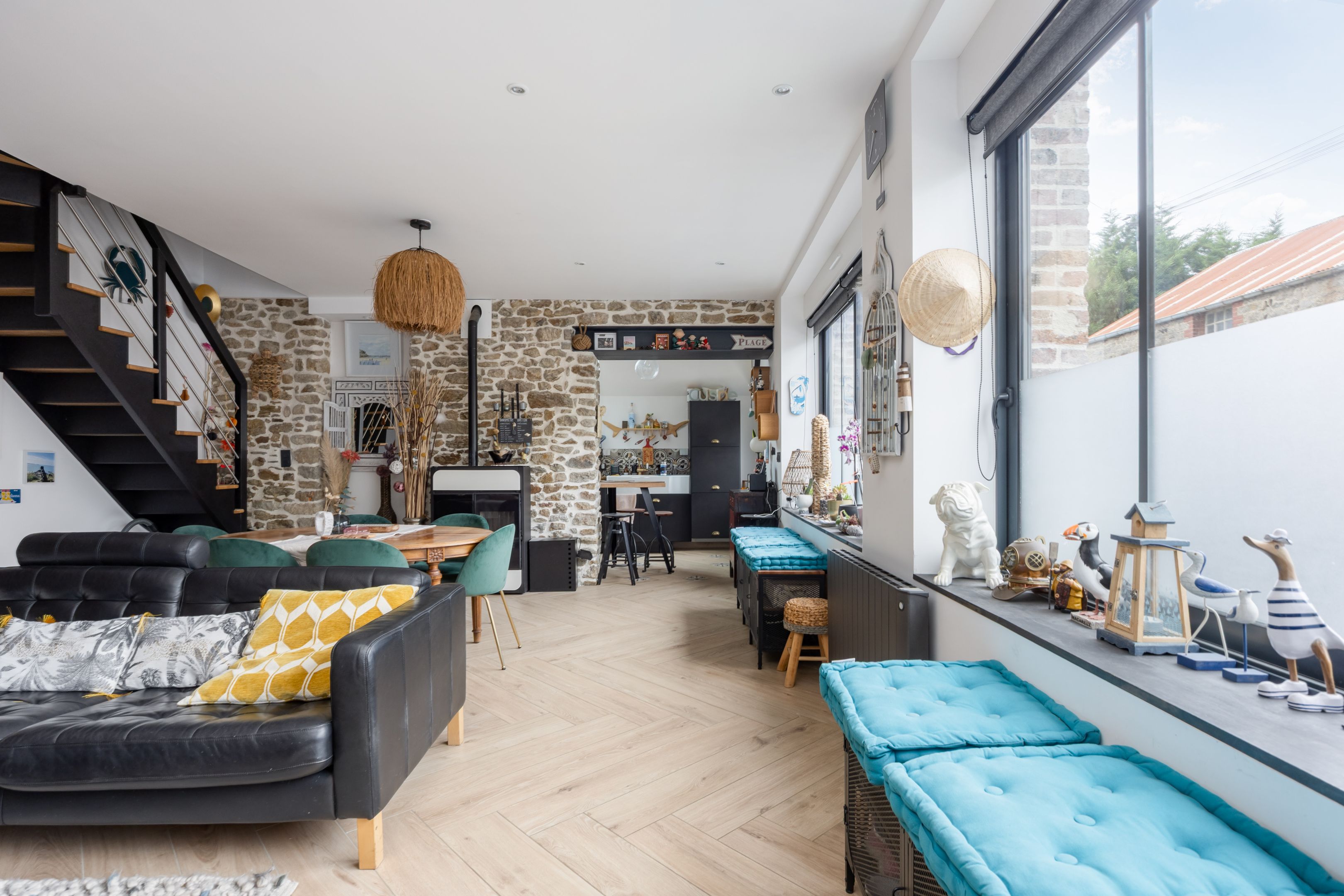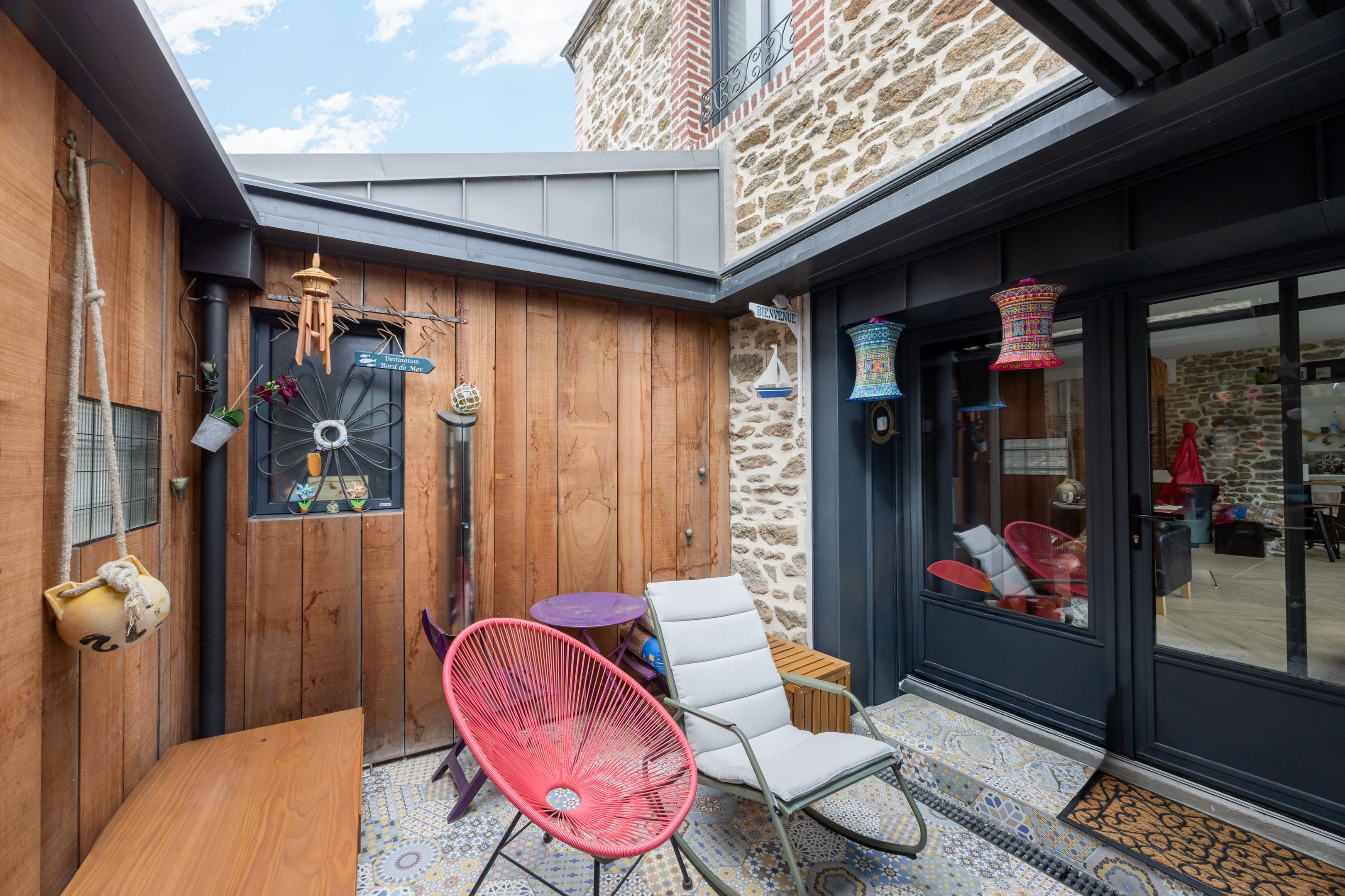 Dinard, near Saint-Énogat and the new Newquay district. Attractive stone house benefiting from complete renovation, optimized layout and good energy insulation. 33m² living-dining room with large windows and pellet stove, lovely fitted kitchen, laundry room, separate toilet. Upstairs, two bedrooms, bathroom. Attic bedroom with shower room. Inner courtyard under pergolas for parking bikes and sunbathing.