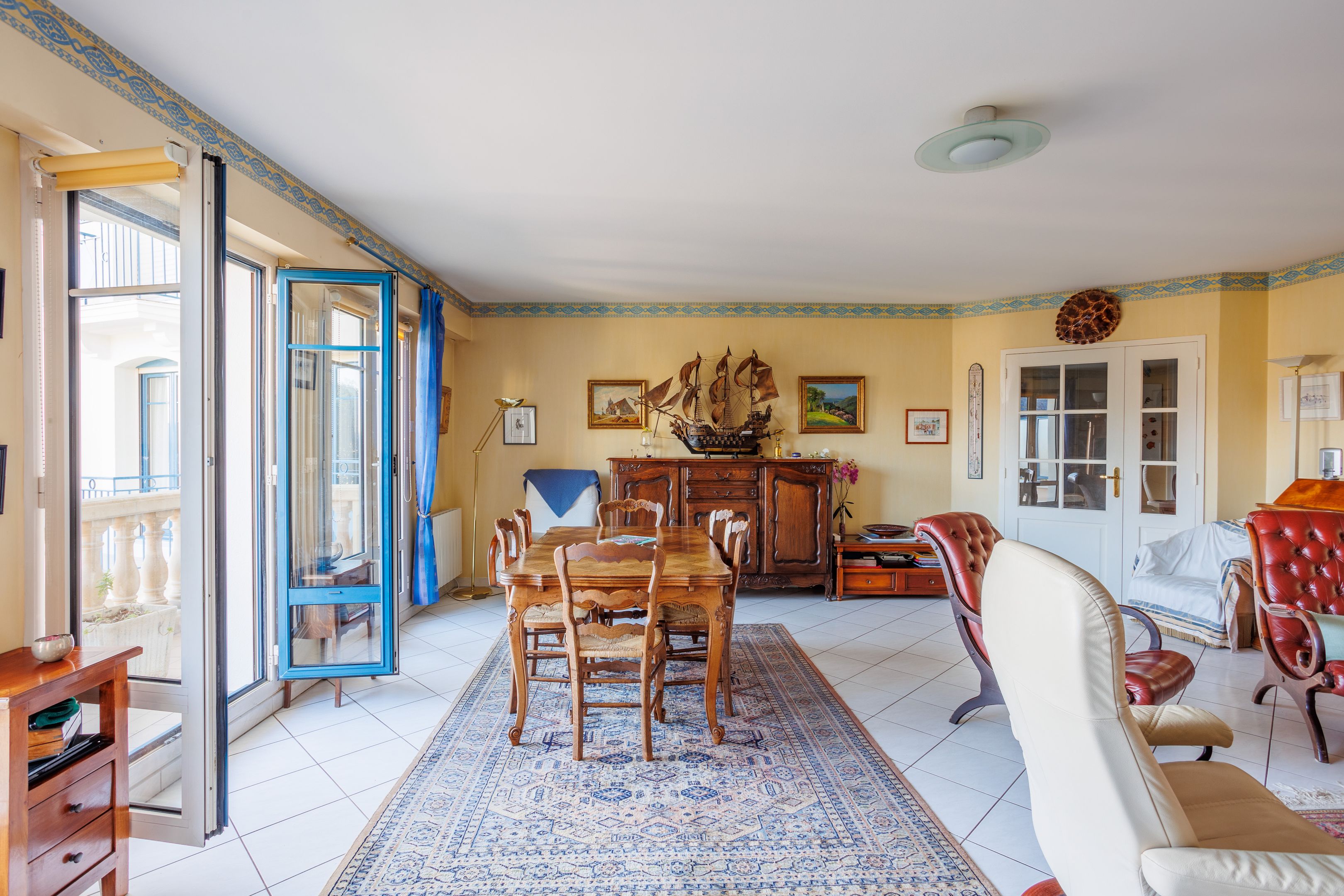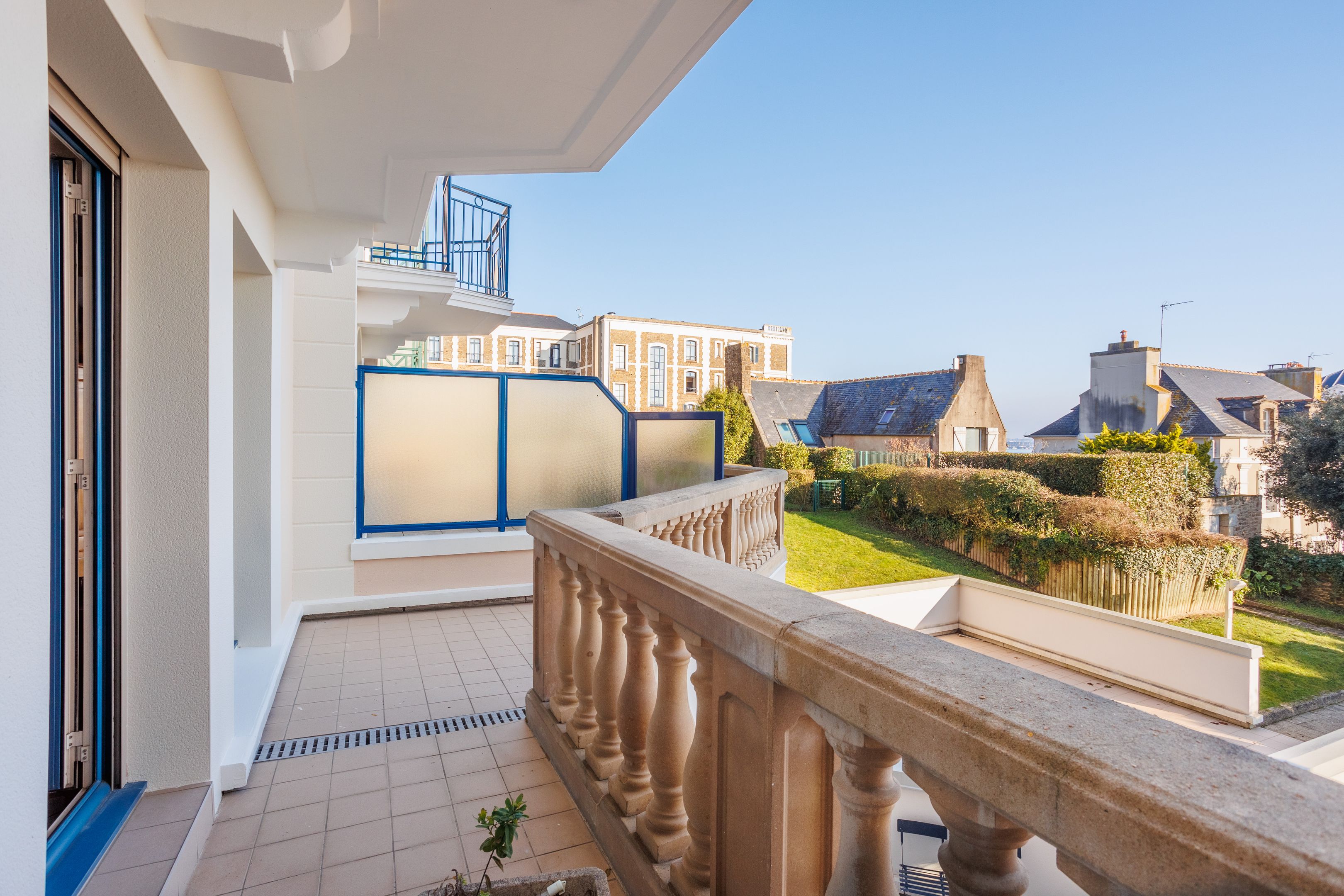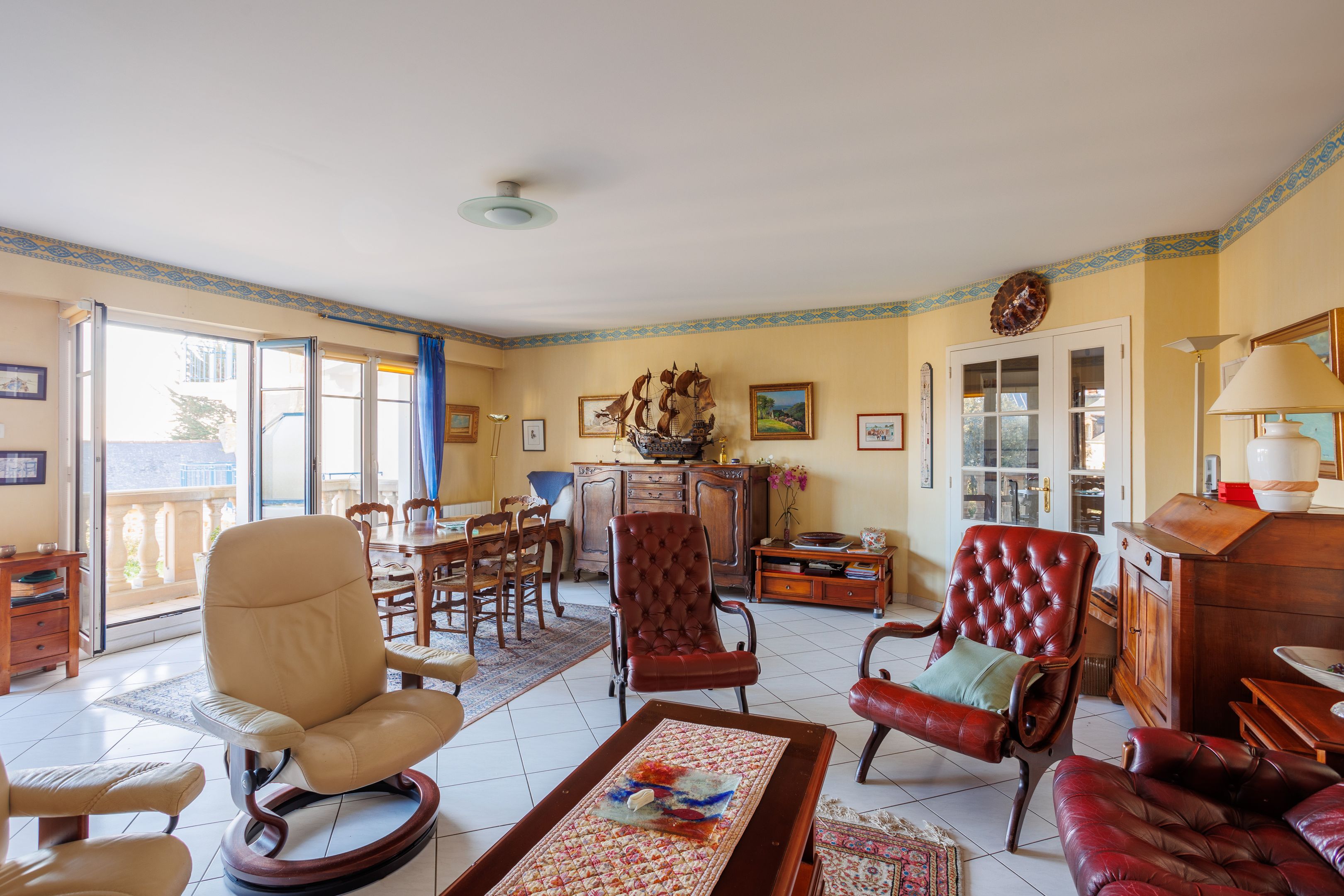 Résidence "Les Jardins du Tennis Club" - In the heart of Dinard, close to shops, beach and marina, in a quiet, well-kept residence. Very pleasant 115m² apartment benefiting from a sought-after location, excellent layout and pleasant exteriors. Entrance hall, large living room offering a sea view extended by a balcony, dining kitchen, large master suite, two other bedrooms, one of which opens onto a west-facing terrace, bathroom, separate toilet. 3㎥ cellar. Two indoor parking spaces. Bicycle garage and tennis court for shared use. Daily janitor services.