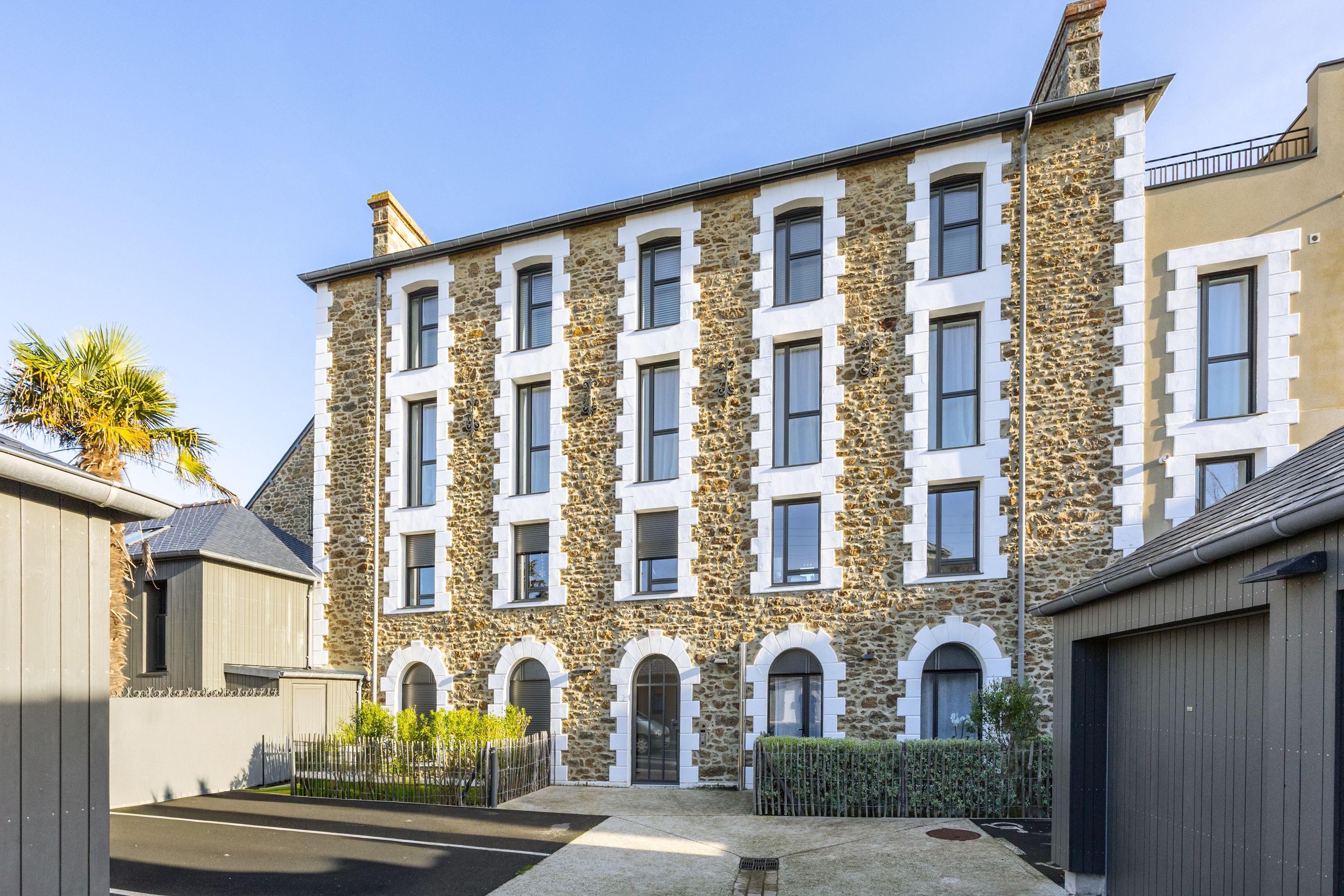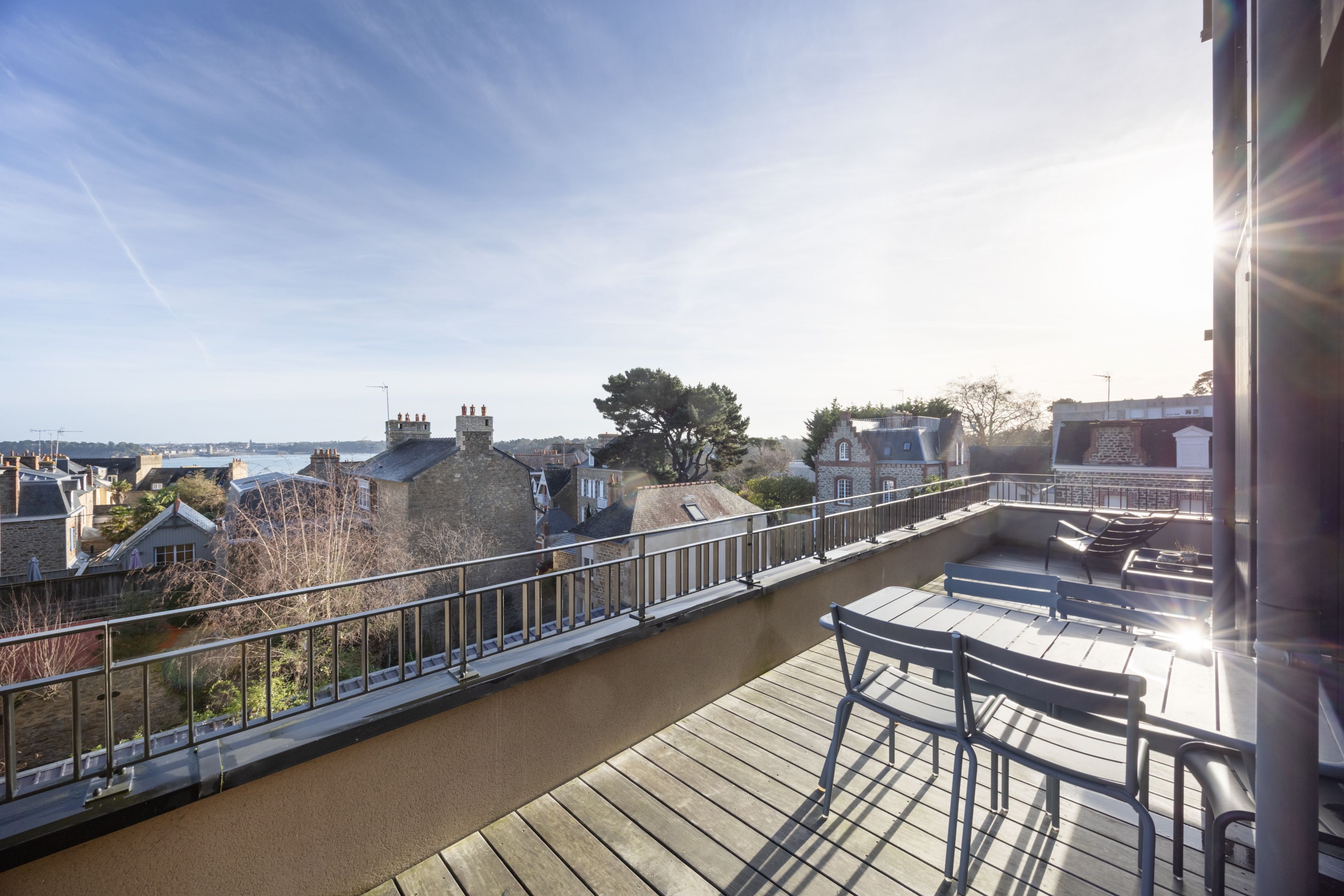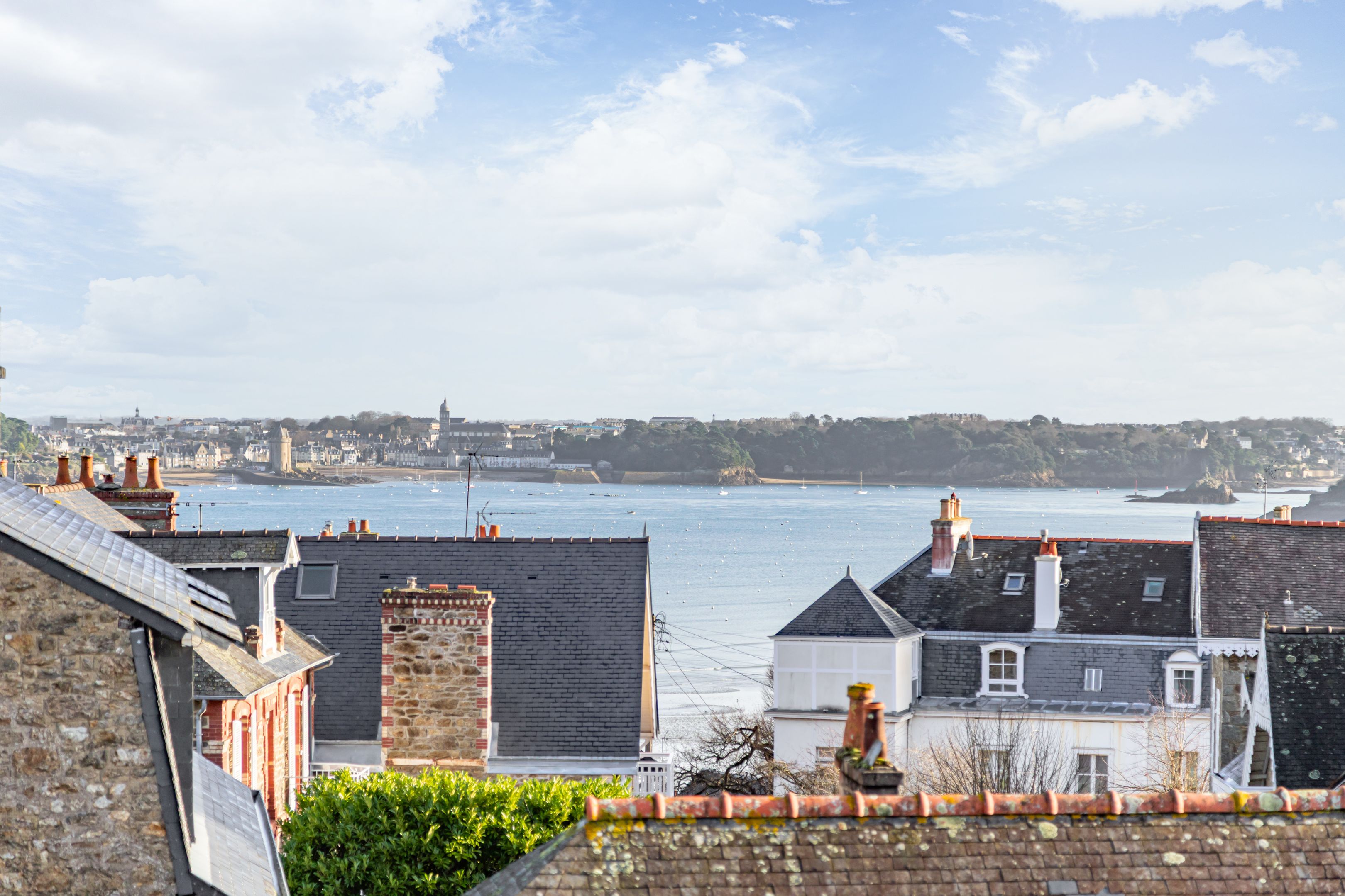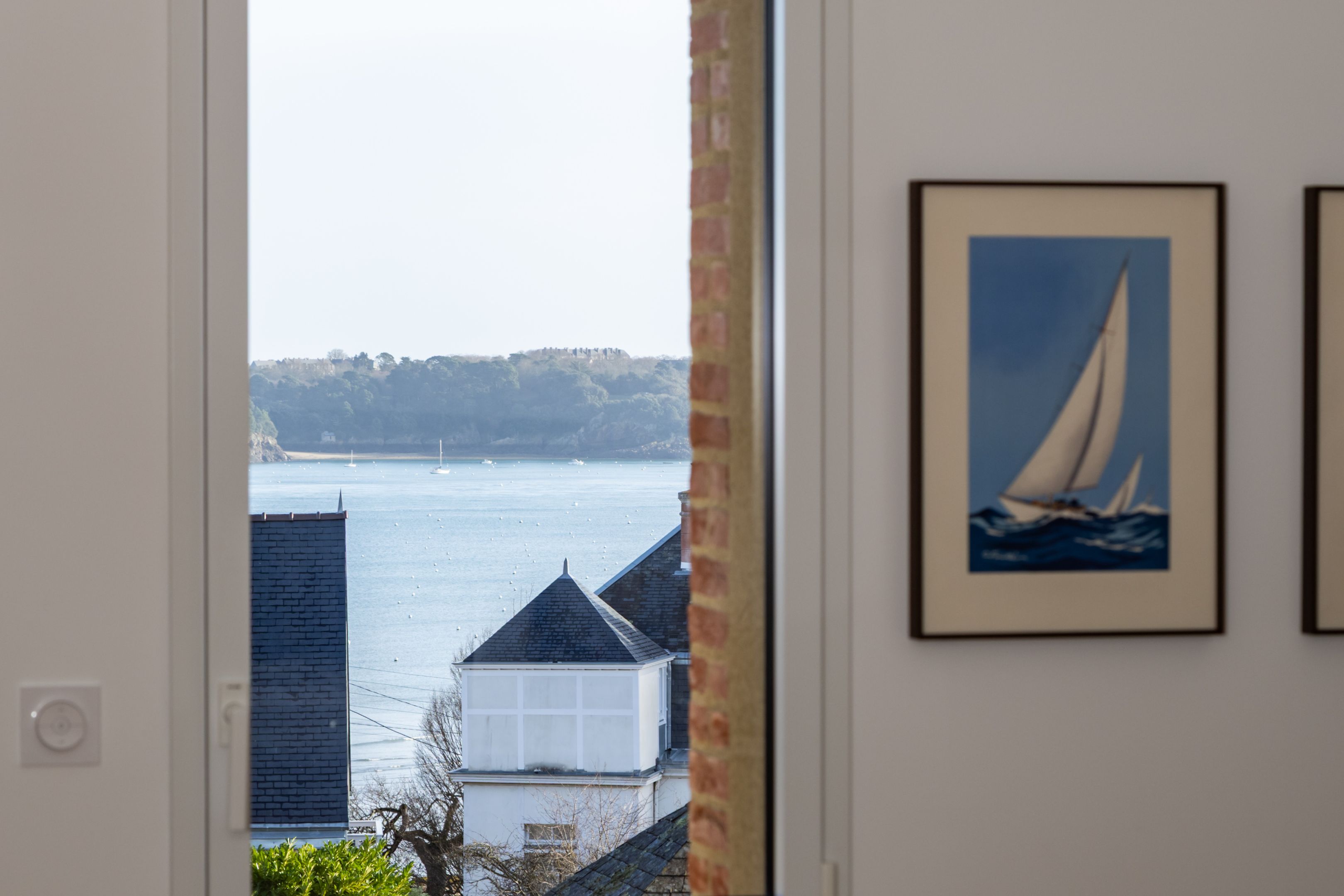 "Le Clair de Lune". Near the town center, close to the church, shops and Prieuré beach, on the penultimate floor of the former Dinard music school, fully renovated in 2022 by Bachmann architects. Prestigious apartment with wide sea view, elegant appointments and large exterior. Spacious entrance gallery leads on one side to a pleasant east-west through living room, beautifully appointed with views over the bay of Le Prieuré and Saint-Servan, fully equipped open kitchen and master suite. On the other side, two bedrooms with built-in closets, large shower room. Rare 30 m² balcony with sea view and south-facing terrace. Individual closed garage and bike room. Le Prieuré beach and pool just a few minutes' walk away.