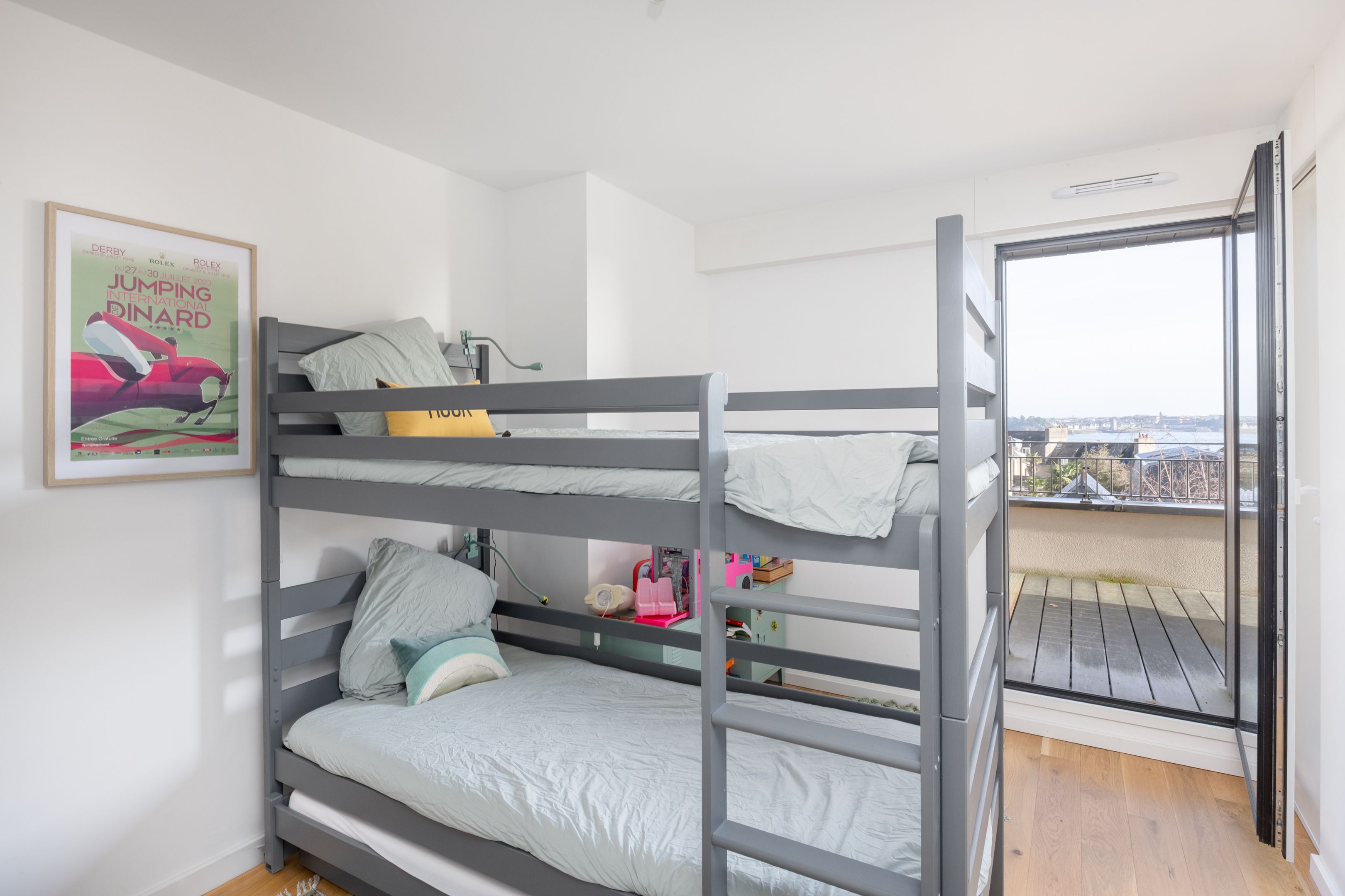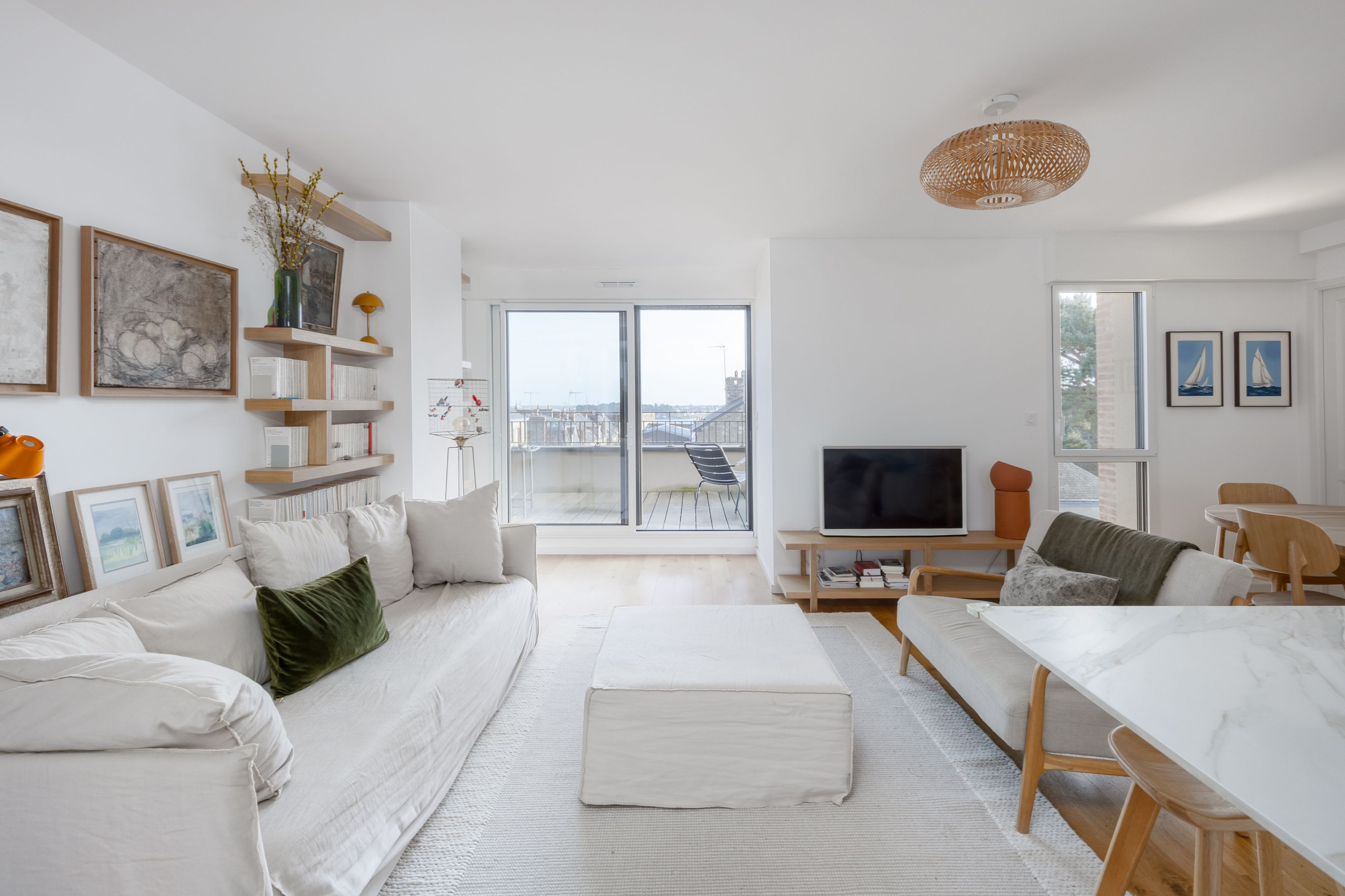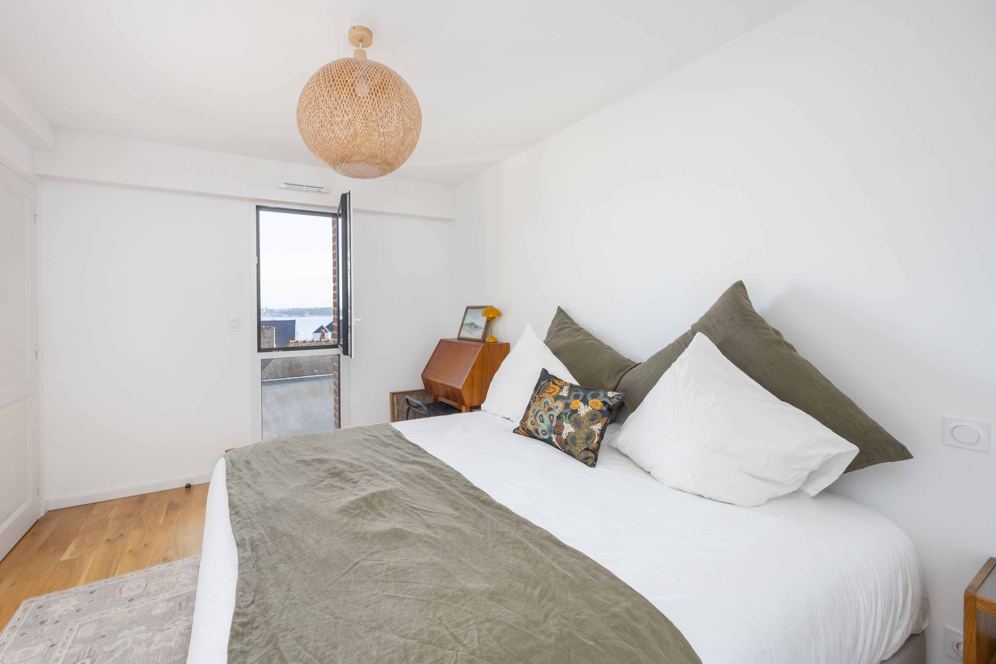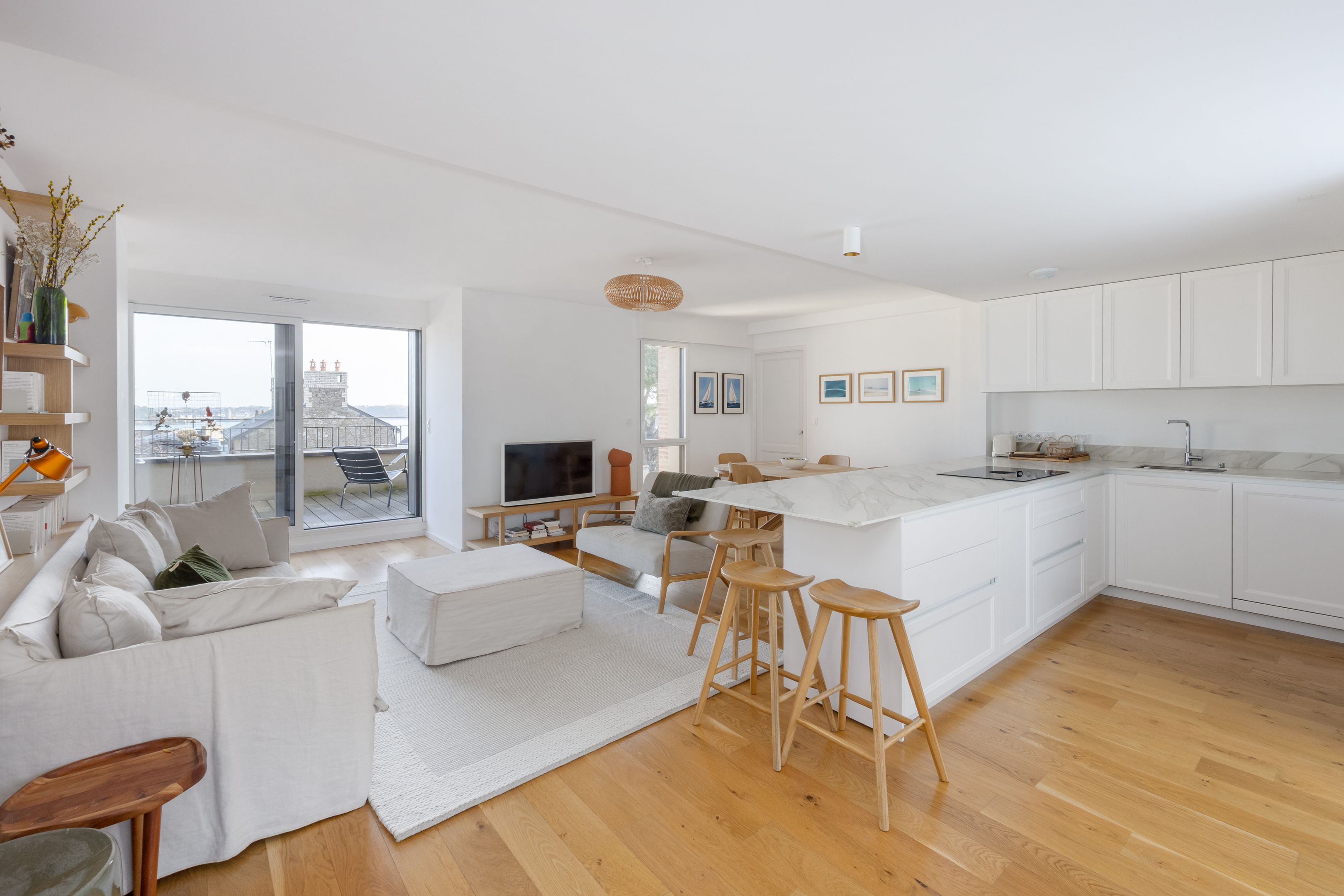 "Le Clair de Lune". Near the town center, close to the church, shops and Prieuré beach, on the penultimate floor of the former Dinard music school, fully renovated in 2022 by Bachmann architects. Prestigious apartment with wide sea view, elegant appointments and large exterior. Spacious entrance gallery leads on one side to a pleasant east-west through living room, beautifully appointed with views over the bay of Le Prieuré and Saint-Servan, fully equipped open kitchen and master suite. On the other side, two bedrooms with built-in closets, large shower room. Rare 30 m² balcony with sea view and south-facing terrace. Individual closed garage and bike room. Le Prieuré beach and pool just a few minutes' walk away.