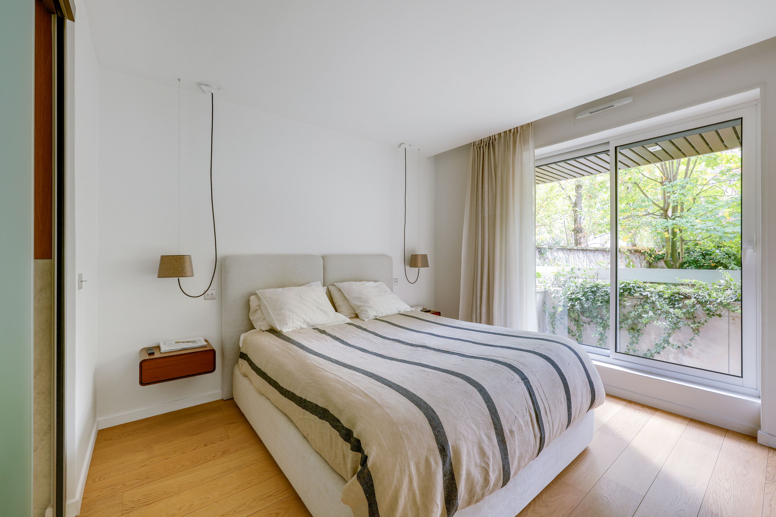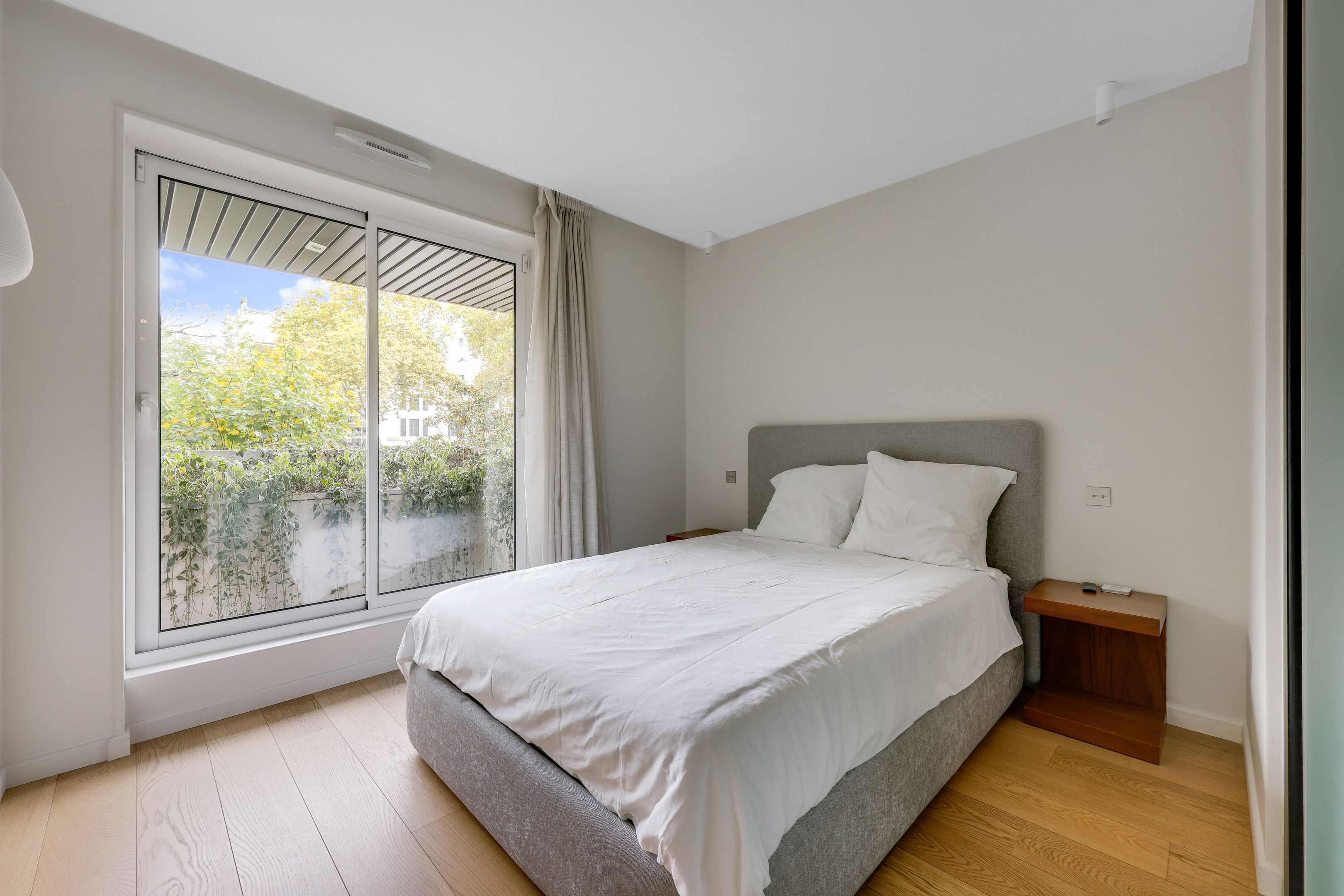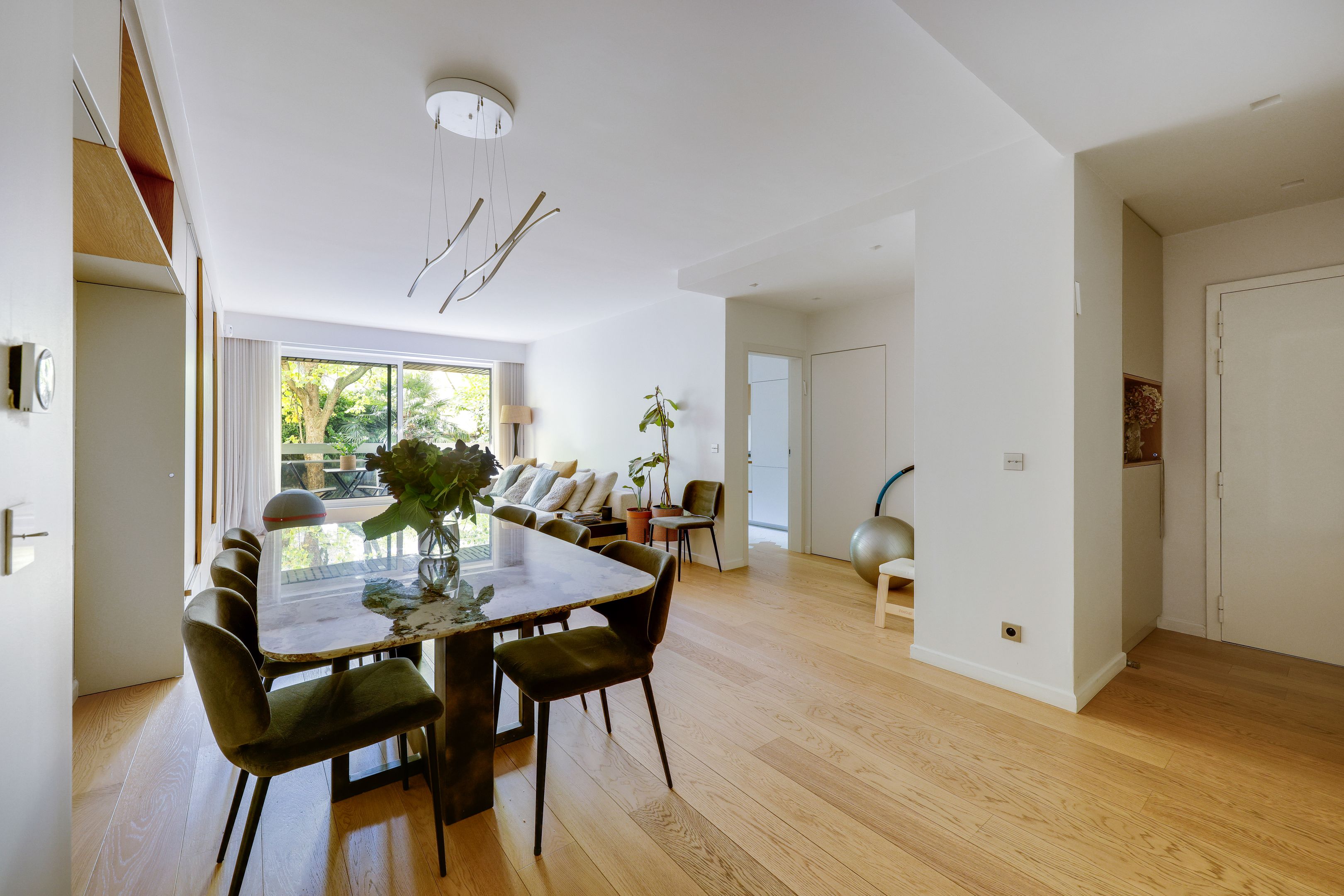 Entrance hall, south-facing living room opening onto a 10 m² balcony, beautiful independent fitted kitchen, garden-facing master bedroom with shower room, toilet and dressing room, second bedroom with bathroom, toilet and balcony, laundry area, numerous custom storage spaces and guest toilet. Air-conditioning and quality door and window frames. Tastefully renovated with quality materials. Cellar. Parking: €40,000.
