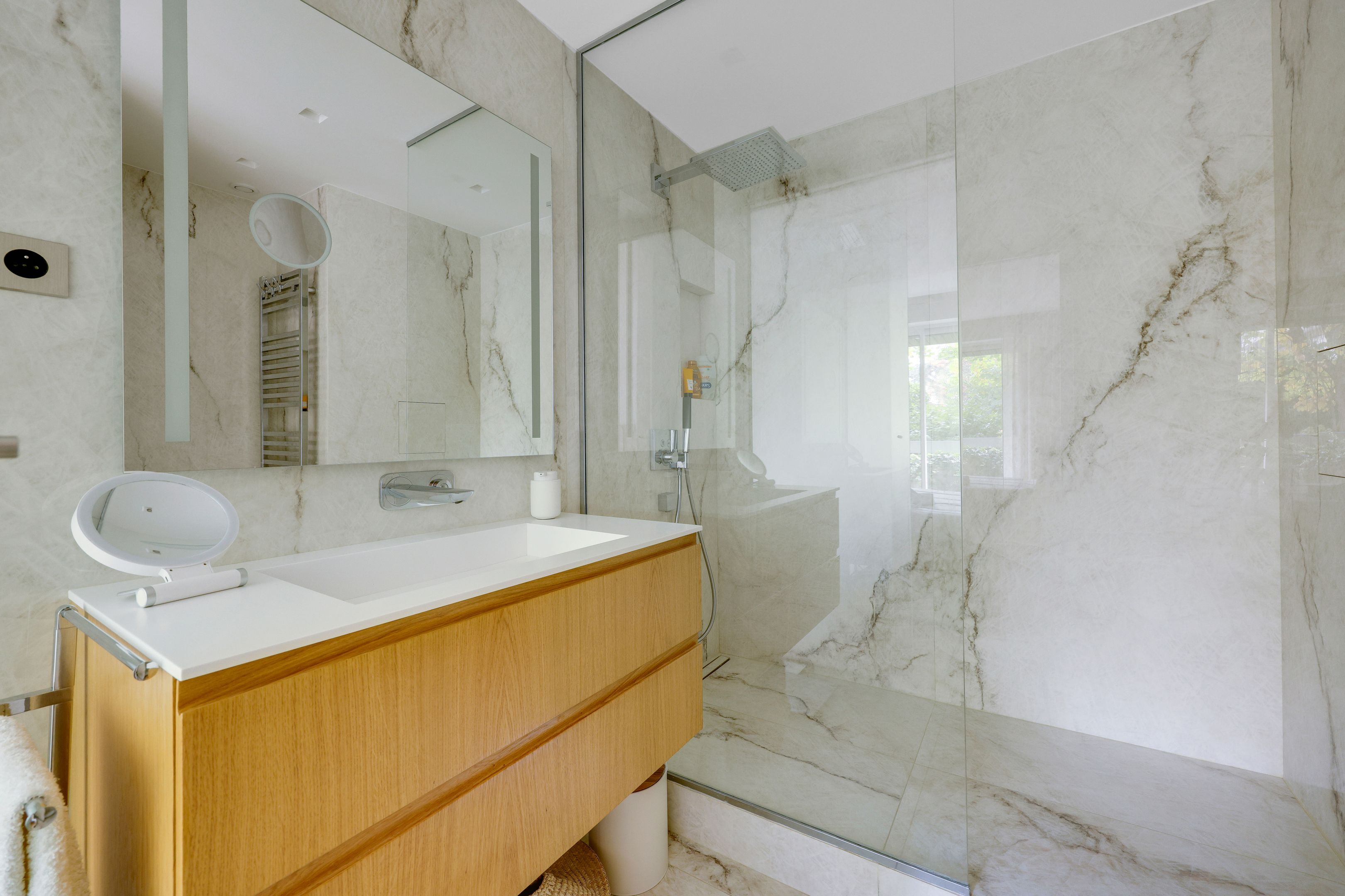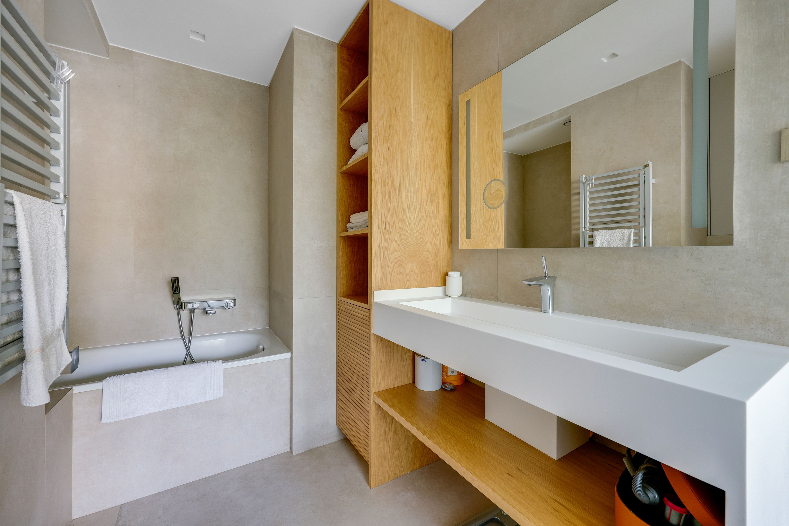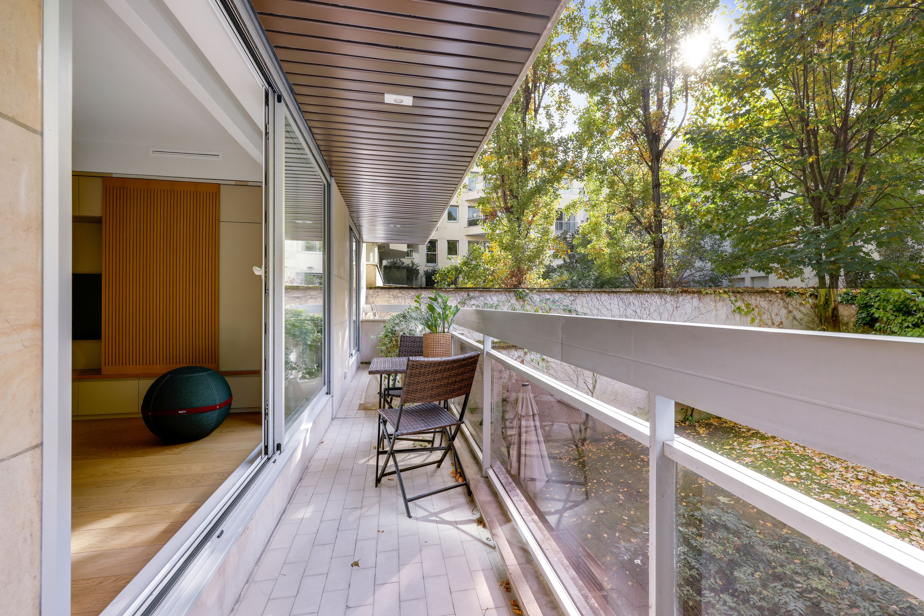 Entrance hall, south-facing living room opening onto a 10 m² balcony, beautiful independent fitted kitchen, garden-facing master bedroom with shower room, toilet and dressing room, second bedroom with bathroom, toilet and balcony, laundry area, numerous custom storage spaces and guest toilet. Air-conditioning and quality door and window frames. Tastefully renovated with quality materials. Cellar. Parking: €40,000.