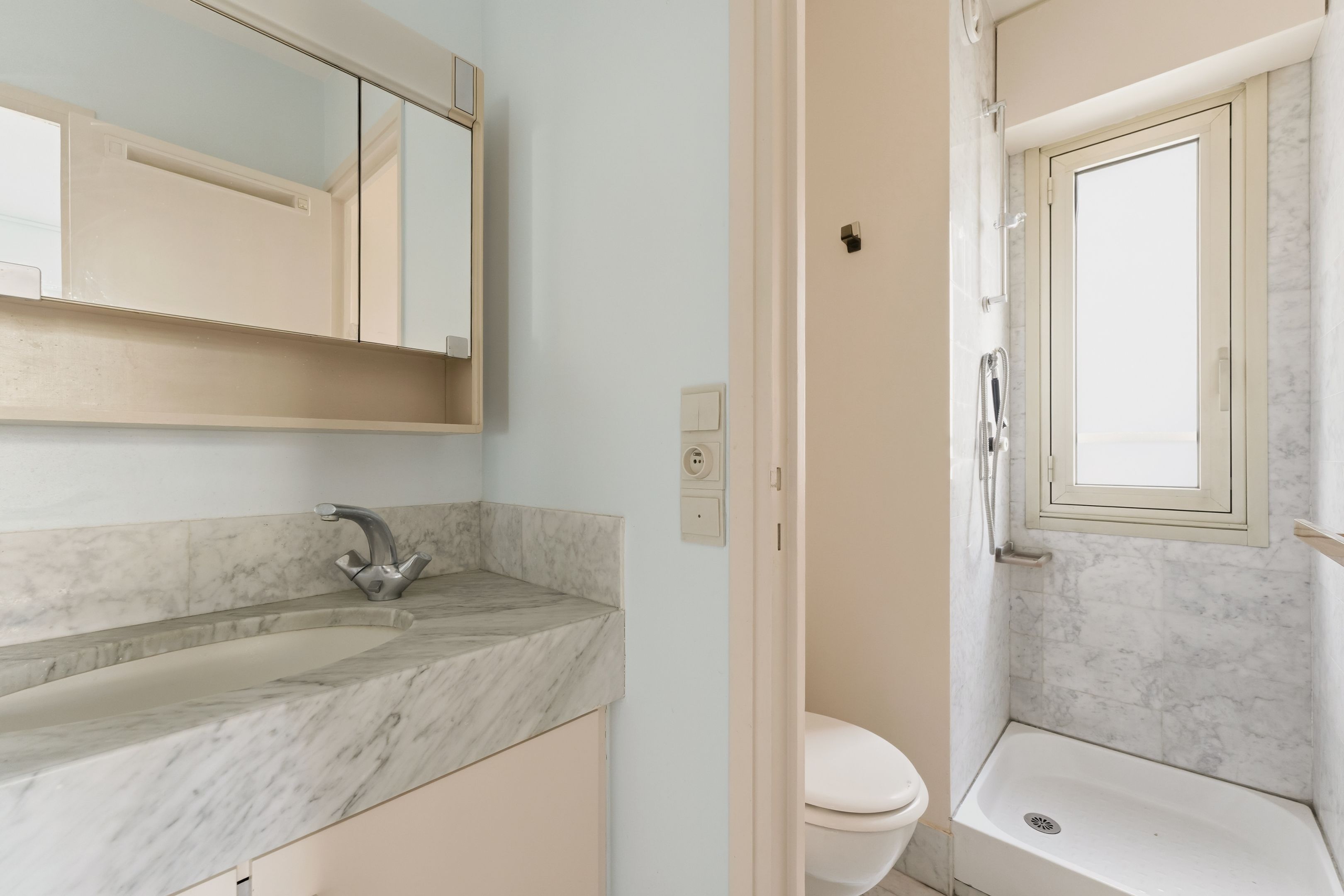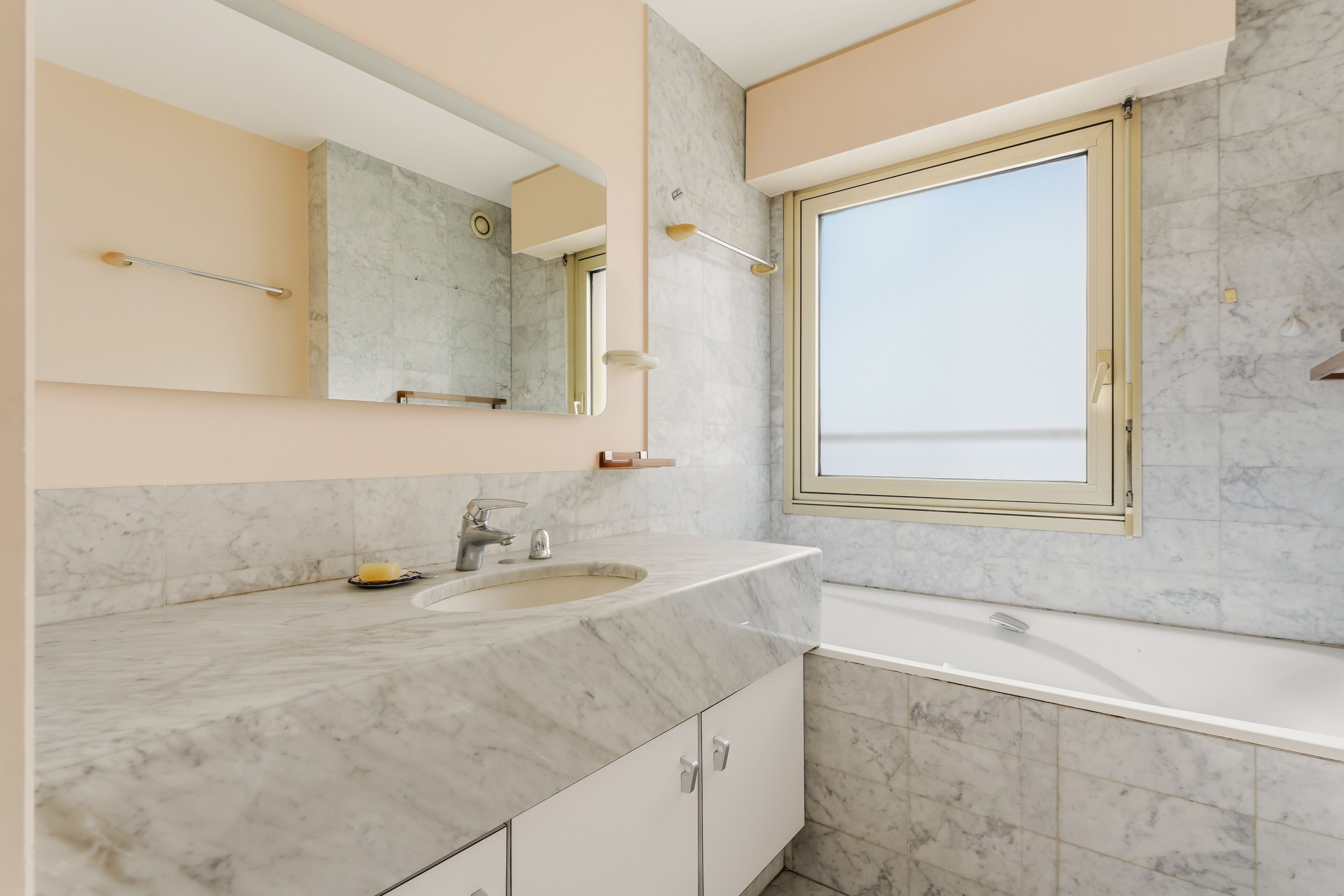 Ideally located close to shops, in a luxury condominium maintained by a janitor, high-floor walk-through apartment. Entrance hall, double reception room opening onto a balcony, independent kitchen, two bedrooms, each with its own shower room and toilet. Possibility of creating a third bedroom. Cellar. Garage available for €40,000. Currently linked to an apartment of equivalent composition and surface area, possibility of acquiring the whole. Quiet and bright. Lycée Pasteur sectorization. Liberal profession authorized.